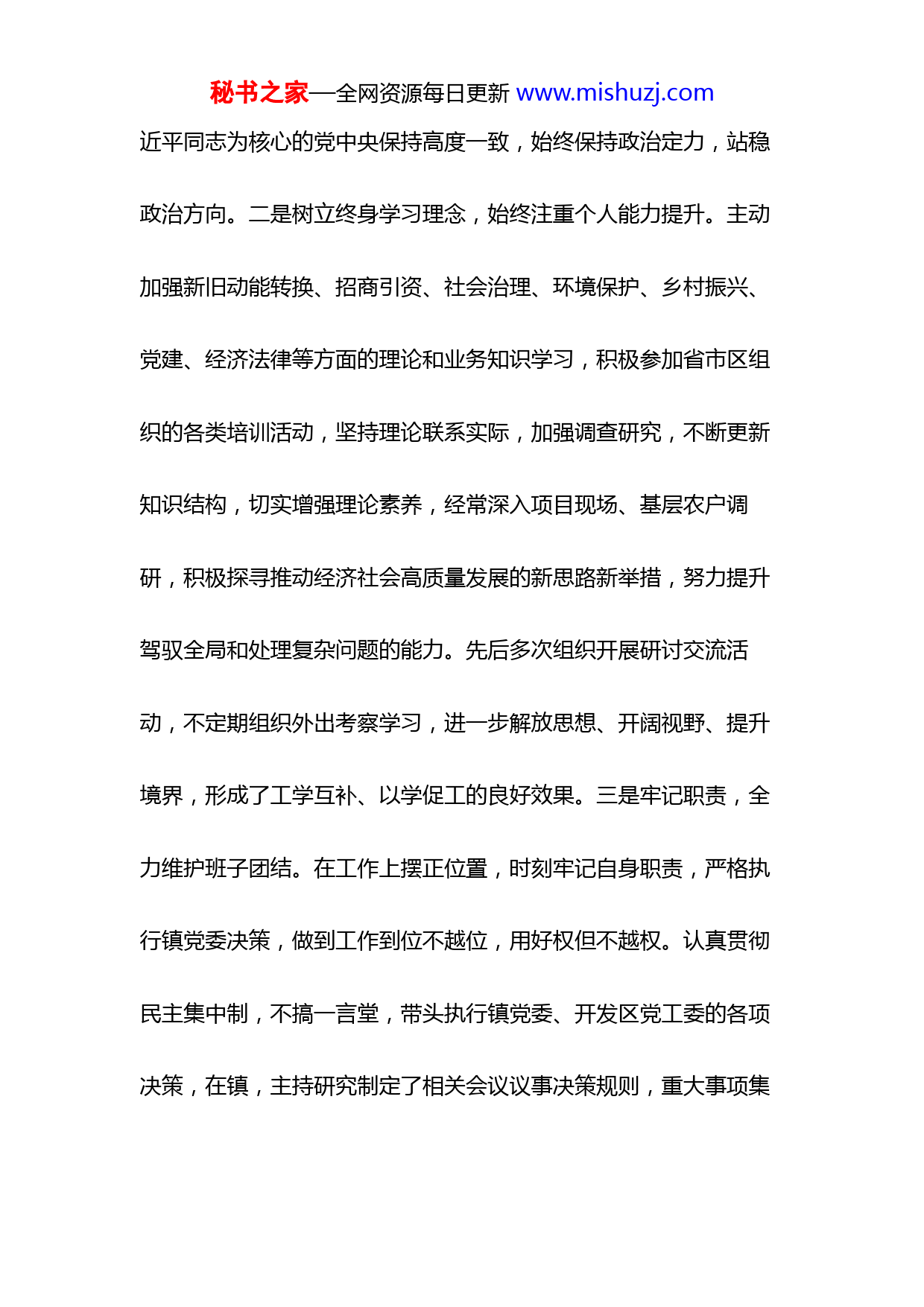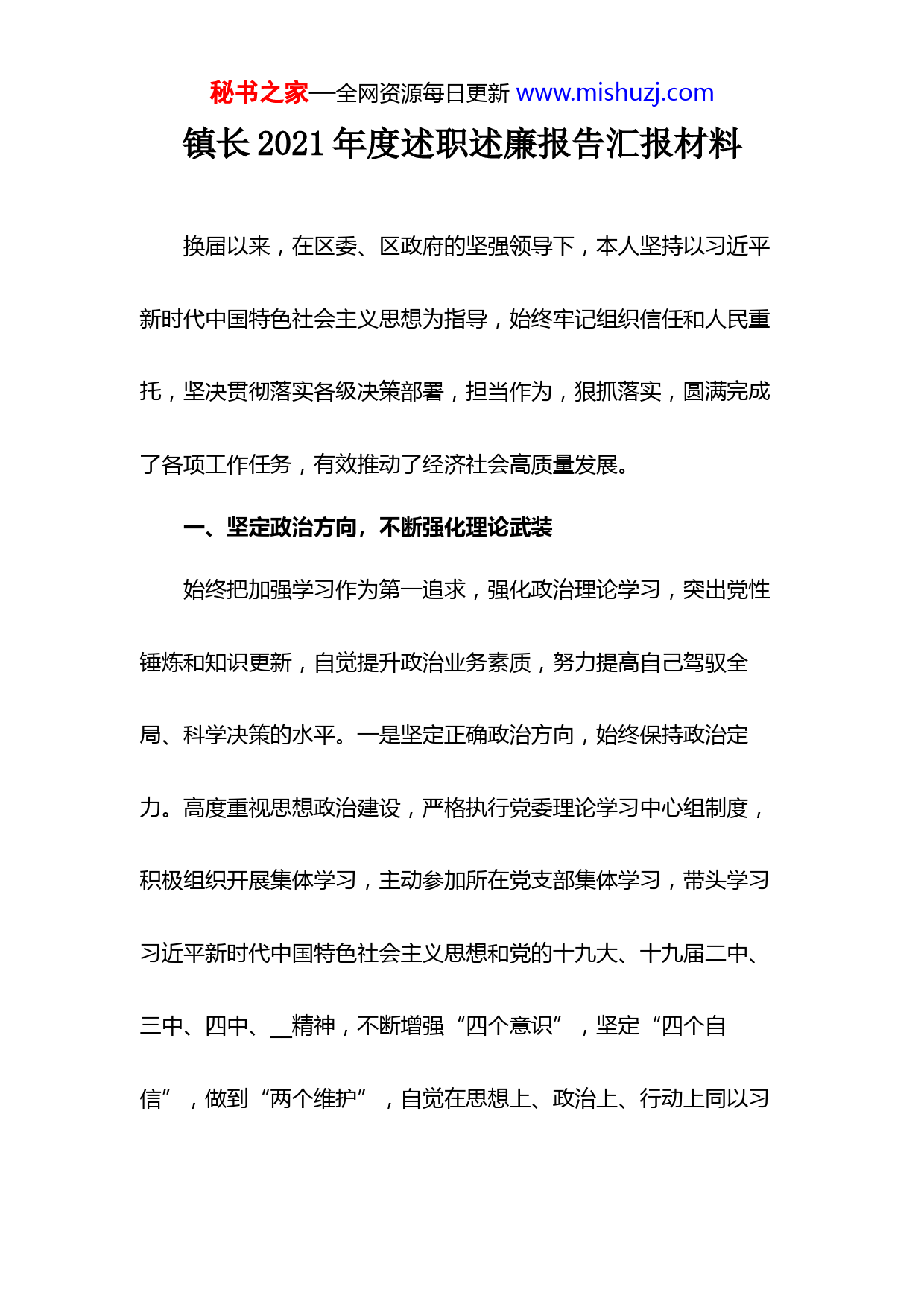 秘书之家—全网资源每日更新www.mishuzj.com镇长2021年度述职述廉报告汇报材料换届以来,在区委、区政府的坚强领导下,本人坚持以习近平新时代中国特色社会主义思想为指导,始终牢记组织信任和人民重托,坚决贯彻落实各级决策部署,担当作为,狠抓落实,圆满完成了各项工作任务,有效推动了经济社会高质量发展。一、坚定政治方向,不断强化理论武装始终把加强学习作为第一追求,强化政治理论学习,突出党性锤炼和知识更新,自觉提升政治业务素质,努力提高自己驾驭全局、科学决策的水平。一是坚定正确政治方向,始终保持政治定力。高度重视思想政治建设,严格执行党委理论学习中心组制度,积极组织开展集体学习,主动参加所在党支部集体学习,带头学习习近平新时代中国特色社会主义思想和党的十九大、十九届二中、三中、四中、__精神,不断增强“四个意识”,坚定“四个自信”,做到“两个维护”,自觉在思想上、政治上、行动上同以习秘书之家—全网资源每日更新www.mishuzj.com近平同志为核心的党中央保持高度一致,始终保持政治定力,站稳政治方向。二是树立终身学习理念,始终注重个人能力提升。主动加强新旧动能转换、招商引资、社会治理、环境保护、乡村振兴、党建、经济法律等方面的理论和业务知识学习,积极参加省市区组织的各类培训活动,坚持理论联系实际,加强调查研究,不断更新知识结构,切实增强理论素养,经常深入项目现场、基层农户调研,积极探寻推动经济社会高质量发展的新思路新举措,努力提升驾驭全局和处理复杂问题的能力。先后多次组织开展研讨交流活动,不定期组织外出考察学习,进一步解放思想、开阔视野、提升境界,形成了工学互补、以学促工的良好效果。三是牢记职责,全力维护班子团结。在工作上摆正位置,时刻牢记自身职责,严格执行镇党委决策,做到工作到位不越位,用好权但不越权。认真贯彻民主集中制,不搞一言堂,带头执行镇党委、开发区党工委的各项决策,在镇,主持研究制定了相关会议议事决策规则,重大事项集秘书之家—全网资源每日更新www.mishuzj.com体研究决策,形成了上下一心干工作、左右配合谋发展的强大合力。二、聚力高质量发展,不断强化担当作为立足新发展阶段,深入贯彻新发展理念,融入新发展格局,精准把握实际,凝神聚力,创新发展,推动经济社会高质量发展。一是坚持高点定位,创先争优成效明显。团结带领全镇干部群众先后成功争创全国文明镇、示范镇、全省森林乡镇、全省卫生乡镇、等称号。近年来经济社会发展综合考核连续位居全区前列。20年完成地区生产总值亿元,完成一般公共预算收入万元,完成社会固定资产投资亿元,规模以上工业完成总产值亿元。城乡居民可支配收入达到元,较“十三五”末均实现显著增长。二是狠抓“双招双引”项目建设成果显著。利用我镇靠近城区、融入开发区,产业特点突出、生态旅游资源富集等基础和优势,走出去、请进来,加强宣传推介,推进“双招双引”,先后招引了等一批大项目、好项目。完成MWp光伏发电项目建设,装机容量位居全前列。项目2021年秘书之家—全网资源每日更新www.mishuzj.com底可建成并网投运。强化骨干龙头企业培育,深入实施企业梯次培育计划,先后实施、、等技改项目个,规模以上工业企业发展至家,新增高新技术企业家。等家公司在交易中心成功挂牌。、等个僵尸企业清理进展顺利。三是聚焦现代农业,特色产业发展势头强劲。成立了“产业振兴研究院”,聘请名专家,常年进行技术指导和培训。同时引进国家“千人计划”专家名,指导产业发展。先后引进了、等名优品种余个,实施测土配方、病虫害生物防治、有机肥替代化肥等项目,建立质量可追溯体系,综合运用信息化远程监控等技术,打造了“智慧果园”余个。通过财政奖补,大力鼓励发展设施栽培,有效推动了特色林果产业标准化、规模化、品牌化发展。三、聚焦群众需求,不断强化民生保障聚焦“两不愁、三保障”及饮水安全,全力推进各项扶贫措施落实。累计投入资金万元,实施产业扶贫项目个,基础设施建设项目个。。全镇户、名贫困群众实现高质量脱贫,个省定重点村全部秘书之家—全网资源每日更新www.mishuzj.com退出。持续推进农村人居环境整治和镇域路域环境整治,建设等美丽乡村建设个。率先实施路长制、街长制,严格落实农户门前“三包”责任制,镇村面貌明显改善。建立定时巡查与随机检查、现场整改与联合执法等环境突出问题整治模式,取缔散乱污企业家,治理畜禽养殖场家。持续加大绿化造林力度,全镇林木覆盖率达%以上。在全率先实行绿化管护外包机制,进一步提升了绿化管护效果。实施等“四好农村路”建设公里,完成“户户通”建设万平方米。加快推进“雪亮工程”建设,累计安装高清摄像头个,公共安全点位处。实施农村电网提升工程,改造个台区,新建、改建线路公里。统筹实施了农村公厕、生活污水、美丽庭院等人居工程,创建“美丽庭院户,无害化卫生厕所改造户、新建农村公厕个。扎实开展安全生产大检查、扫黑除恶专项斗争,成立信访积案化解专班,信访积案全部成功化解,五年来未出现重大安全生产事故,社会大局和谐安定,群众幸福感、获得感、满意度持续提升。四、坚定聚力党的建设,营造良好政治生态秘书之家—全网