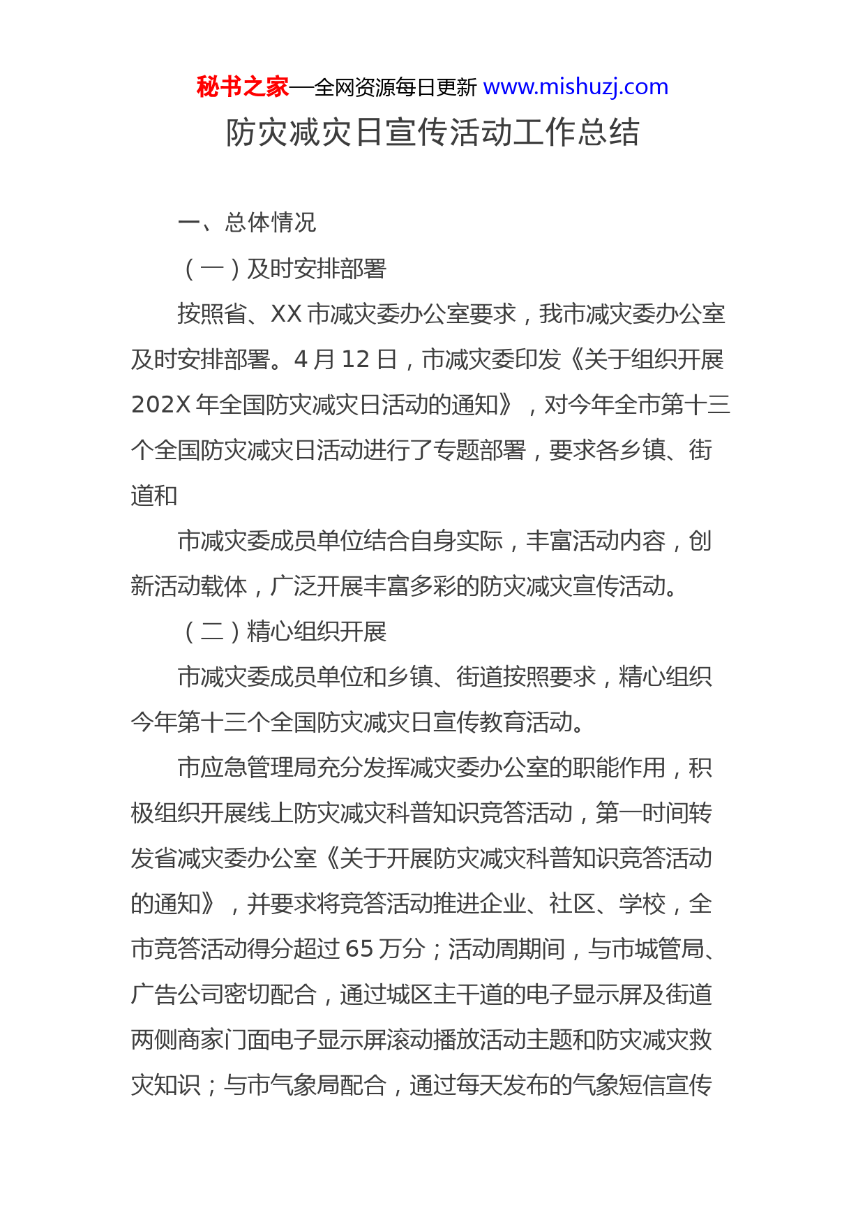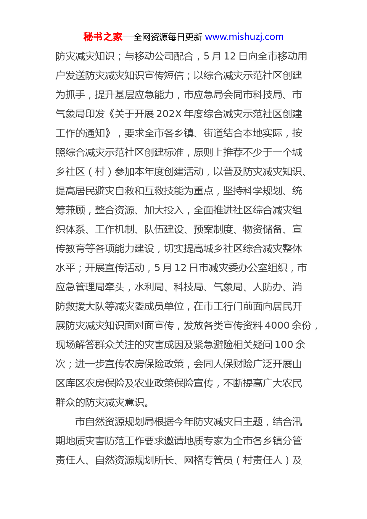 秘书之家—全网资源每日更新www.mishuzj.com防灾减灾日宣传活动工作总结一、总体情况(一)及时安排部署按照省、XX市减灾委办公室要求,我市减灾委办公室及时安排部署。4月12日,市减灾委印发《关于组织开展202X年全国防灾减灾日活动的通知》,对今年全市第十三个全国防灾减灾日活动进行了专题部署,要求各乡镇、街道和市减灾委成员单位结合自身实际,丰富活动内容,创新活动载体,广泛开展丰富多彩的防灾减灾宣传活动。(二)精心组织开展市减灾委成员单位和乡镇、街道按照要求,精心组织今年第十三个全国防灾减灾日宣传教育活动。市应急管理局充分发挥减灾委办公室的职能作用,积极组织开展线上防灾减灾科普知识竞答活动,第一时间转发省减灾委办公室《关于开展防灾减灾科普知识竞答活动的通知》,并要求将竞答活动推进企业、社区、学校,全市竞答活动得分超过65万分;活动周期间,与市城管局、广告公司密切配合,通过城区主干道的电子显示屏及街道两侧商家门面电子显示屏滚动播放活动主题和防灾减灾救灾知识;与市气象局配合,通过每天发布的气象短信宣传秘书之家—全网资源每日更新www.mishuzj.com防灾减灾知识;与移动公司配合,5月12日向全市移动用户发送防灾减灾知识宣传短信;以综合减灾示范社区创建为抓手,提升基层应急能力,市应急局会同市科技局、市气象局印发《关于开展202X年度综合减灾示范社区创建工作的通知》,要求全市各乡镇、街道结合本地实际,按照综合减灾示范社区创建标准,原则上推荐不少于一个城乡社区(村)参加本年度创建活动,以普及防灾减灾知识、提高居民避灾自救和互救技能为重点,坚持科学规划、统筹兼顾,整合资源、加大投入,全面推进社区综合减灾组织体系、工作机制、队伍建设、预案制度、物资储备、宣传教育等各项能力建设,切实提高城乡社区综合减灾整体水平;开展宣传活动,5月12日市减灾委办公室组织,市应急管理局牵头,水利局、科技局、气象局、人防办、消防救援大队等减灾委成员单位,在市工行门前面向居民开展防灾减灾知识面对面宣传,发放各类宣传资料4000余份,现场解答群众关注的灾害成因及紧急避险相关疑问100余次;进一步宣传农房保险政策,会同人保财险广泛开展山区库区农房保险及农业政策保险宣传,不断提高广大农民群众的防灾减灾意识。市自然资源规划局根据今年防灾减灾日主题,结合汛期地质灾害防范工作要求邀请地质专家为全市各乡镇分管责任人、自然资源规划所长、网格专管员(村责任人)及秘书之家—全网资源每日更新www.mishuzj.com地质灾害隐患点监测员举行地质灾害网格化管理和防治知识的培训,总结2020年地质灾害发生情况,分析研判地质灾害防治形势,提高了相关人员识灾、防灾、避灾能力。市公安局以防范地质灾害、汛情等为重点,通过在人流密集场所悬挂横幅、使用LED屏幕播放宣传标语、发放防灾减灾宣传资料等方式,现场讲解各类突发事件的种类、特点和危害等多种方式,向广大群众普及灾情险情的判别要领、防灾减灾的基本技能,以及应急逃生、自救互救的基本常识;走进校园,开展“防震减灾知识宣传进校园活动”,民警利用PPT课件介绍了地震的前兆及危害、紧急避险、疏散逃离等相关知识,讲解了紧急救护的相关知识,并现场指导学生正确开展自救、互救。市气象局结合自身工作特点,会同市应急局通过每天2次的气象服务短信推介防灾减灾知识;完善气象防灾减灾应急预案,进一步提高应急预案的科学性、针对性和可操作性,活动周期间,志愿者走上街头宣传防灾减灾科普,向社会公众发放气象科普宣传手册,并热情向社区居民解答气象疑问,共计发放气象科普手册600余份,极大的提高了居民防灾减灾防范和突发性气象灾害的自救意识和自救能力。市科技局组织工作人员进机关、进学校、进企业、进社区、进公共场所等人员密集场所,开展防灾减灾知识宣秘书之家—全网资源每日更新www.mishuzj.com传活动,通过讲解、播放防灾减灾片、发放防灾减灾科普读物等群众喜闻乐见的方式,普及防灾减灾专业知识和技能。并充分利用微信公众号、微博等新媒体,多方宣传,引导广大群众增强风险防范意识,提高应急避险和自救、互救能力,营造全民参与防灾减灾的良好氛围,进一步提升我市防灾减灾水平。市水利局将防灾减灾落实到基层,为普及山洪灾害防灾减灾知识,全面增强基层人民群众防灾减灾意识,提高避险自救能力,在今年第13个防灾减灾日活动周期间,组织局领导班子成员、各二级机构负责人、各联乡技术人员参加培训“港口湾水库防汛抢险队伍培训”、“水库管理和险情抢护知识”、“加强农村饮水安全工程运行管理,不断提高区域农村供水保障水平”、“新时期水利防灾减灾及山洪灾害防治”、“生态优先、绿色发展,用法治力量保护长江”。此次培训内容详实,为全市水利工作者开拓了视野,为下一步我市防汛工作顺利开展打下了坚实的基础。市发改委结合单位职能,以“5.12”防灾减灾日为契机,认真扎实地开展了防灾减灾各项工作,重点加强天然气长输管道、宣绩高铁等重大项目施工段防灾减灾检查工作,督促有关企业及时排查隐患并整改到位。秘书之家—全网资源每日更新www.mishuzj.com市卫健委利用微信公众号宣传防灾减灾、应急救助知识,并通