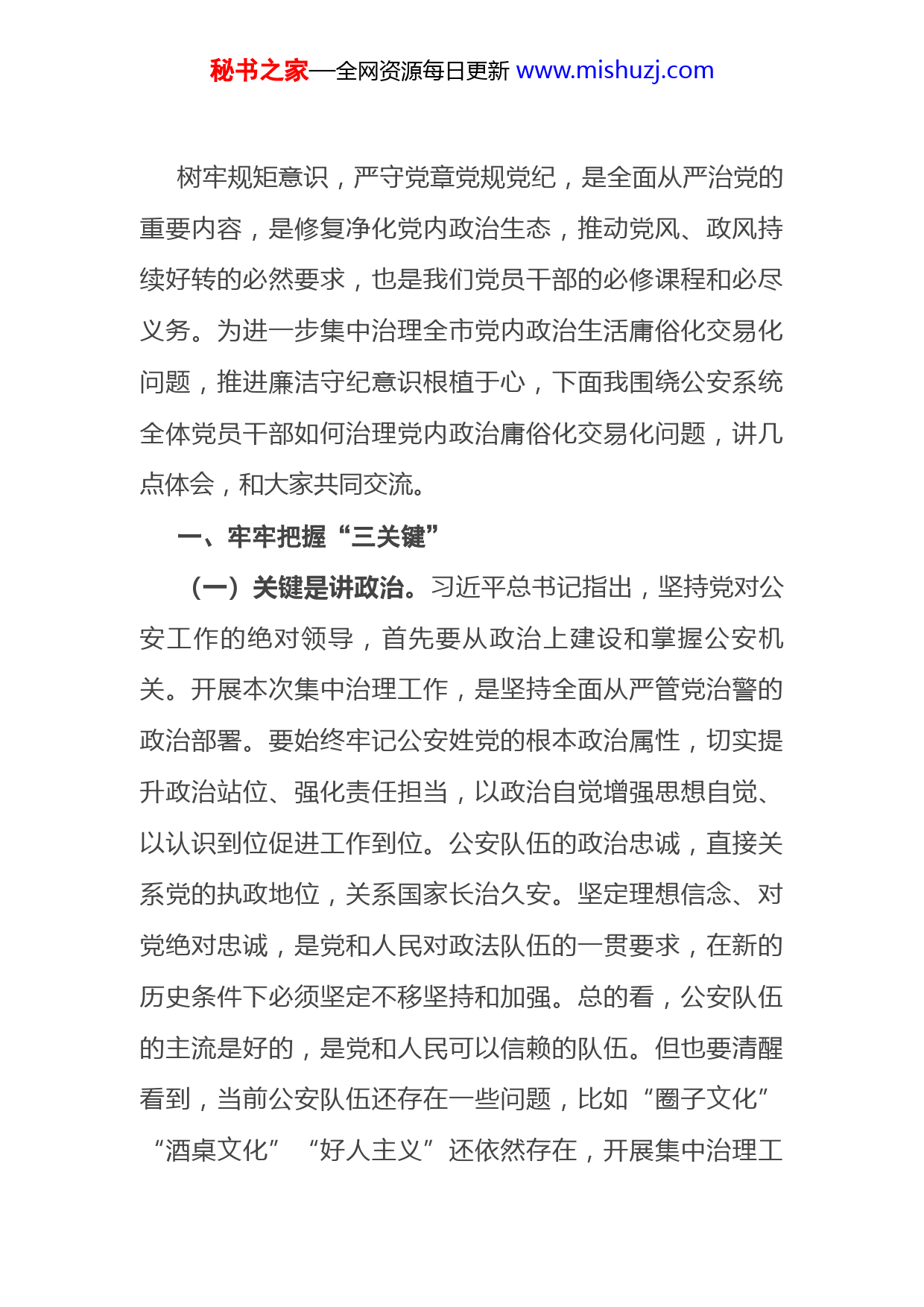 秘书之家—全网资源每日更新www.mishuzj.com树牢规矩意识,严守党章党规党纪,是全面从严治党的重要内容,是修复净化党内政治生态,推动党风、政风持续好转的必然要求,也是我们党员干部的必修课程和必尽义务。为进一步集中治理全市党内政治生活庸俗化交易化问题,推进廉洁守纪意识根植于心,下面我围绕公安系统全体党员干部如何治理党内政治庸俗化交易化问题,讲几点体会,和大家共同交流。一、牢牢把握“三关键”(一)关键是讲政治。习近平总书记指出,坚持党对公安工作的绝对领导,首先要从政治上建设和掌握公安机关。开展本次集中治理工作,是坚持全面从严管党治警的政治部署。要始终牢记公安姓党的根本政治属性,切实提升政治站位、强化责任担当,以政治自觉增强思想自觉、以认识到位促进工作到位。公安队伍的政治忠诚,直接关系党的执政地位,关系国家长治久安。坚定理想信念、对党绝对忠诚,是党和人民对政法队伍的一贯要求,在新的历史条件下必须坚定不移坚持和加强。总的看,公安队伍的主流是好的,是党和人民可以信赖的队伍。但也要清醒看到,当前公安队伍还存在一些问题,比如“圈子文化”“酒桌文化”“好人主义”还依然存在,开展集中治理工秘书之家—全网资源每日更新www.mishuzj.com作就是要在思想上、政治上、组织上、作风上进一步纯洁队伍,筑牢政治忠诚,教育引导广大干警增强“四个意识”、坚定“四个自信”、做到“两个维护”,确保始终听党指挥、忠诚使命。(二)关键是全面从严。坚持政治建警全面从严治警是公安工作的永恒主题。要牢牢把握纪律严明这一治警之要,严格教育、严格执纪、严格监督,弛而不息抓学习,一以贯之抓整顿,毫不动摇地把“严”的主基调长期坚持下去。既要理“旧账”,更要防“新账”,久久为功、标本兼治着力打造清正警队,建设清廉警营,弘扬清明警风。当今世界百年未有之大变局加速演变,在全面建设社会主义现代化国家新征程上,我国发展既面临前所未有的机遇,也面临前所未有的挑战,这对公安工作提出了新要求。要主动适应新形势、新任务的要求,着力补齐公安队伍依法履职中的短板弱项,针对11种现象进行查究整改,不断提升民警、辅警的廉洁意识,为迎接二十大提供有力保障、作出更大贡献。(三)关键是领导带头。群雁高飞头雁领、打铁必须自身硬。坚持从各级领导班子和领导干部严起,带头清理存在问题,带头为全警立标杆、做示范。既要充分发挥组织者、推进者作用,又要认真履行参与者、践行者职责,绝秘书之家—全网资源每日更新www.mishuzj.com不能拿着“手电筒”,只照别人、不照自己。作为党委书记,要旗帜鲜明的抵制“圈子文化”“码头文化”“酒桌文化”,不搞“小团伙”“小宗派”。杜绝权钱交易、运作干部、封官许愿现象的发生。要在工作中严格执行“三重一大”决策制度,从源头上防控廉政风险,规范权利运行,以清正廉洁的价值观念涵养风清气正的政治生态。二、问题导向“三突出”(一)突出解决政治规矩意识不牢问题。坚决抓好忠诚教育,切实用习近平总书记重要训词精神武装头脑、指导实践、推动工作。通过以案为鉴、以案明纪、以案说法,用身边事教育身边人、用“里面”的人警示“外面”的人,让广大民警吸取教训、受到警醒。公安队伍的政治忠诚,直接关系党的执政地位,关系国家长治久安。坚定理想信念、对党绝对忠诚,是党和人民对政法队伍的一贯要求,在新的历史条件下必须坚定不移坚持和加强。(二)突出解决队伍风气不正问题。深入开展集中治理全市党内政治生活庸俗化交易化问题,针对11种现象全面自查,对顶风违纪的一律从严查处,对典型案例一律公开通报曝光。坚决整治违纪违规多发问题,进一步规范民警职务行为、网络行为、交往行为,做好“社交减法”。秘书之家—全网资源每日更新www.mishuzj.com(三)突出解决组织建设不优问题。组织建设是党的建设的重要课题,也是深入贯彻落实习近平新时代中国特色社会主义思想的体现。进一步强化“用人要用好人能人,干事就要苦干实干,管人就要管坏人闲人”的理念,营造山清水秀的政治生态和风清气正的干事氛围。深入贯彻《关于新形势下党内政治生活的若干准则》,切实做到为担当者担当、为负责者负责,不断增强公安队伍的凝聚力向心力战斗力。三、攻坚克难“三着力”(一)着力加强干部交流。习近平总书记强调“要坚持党管干部原则,按照新时期好干部标准,选好配强各级公安机关领导班子和领导干部”。要加大机关与基层、单位内部、部门之间,以及专业警种与综合部门间的干部交流力度,实现干部能上能下,保持干部队伍的活力、向心力、凝聚力。(二)着力整治顽瘴痼疾。坚持刀刃向内、刮骨疗毒,集中整治“圈子文化”“码头文化”“酒桌文化”等现象。坚持严在日常、管在经常,奔着问题去、迎着问题上,真刀真枪攻克一批常发生、难根治、易反复的顽瘴痼疾。秘书之家—全网资源每日更新www.mishuzj.com(三)着力清除“害群之马”。始终把纪律和规矩挺在前面,用铁的纪律从严治警,坚持无禁区、全覆盖、零容忍,坚持减存量、遏增量、防变量,坚决清除公安队伍中权权交易、权钱交易、政治攀附、政治投机的“两面人”,营造风清气正的政治生态。四、实效标准“三提