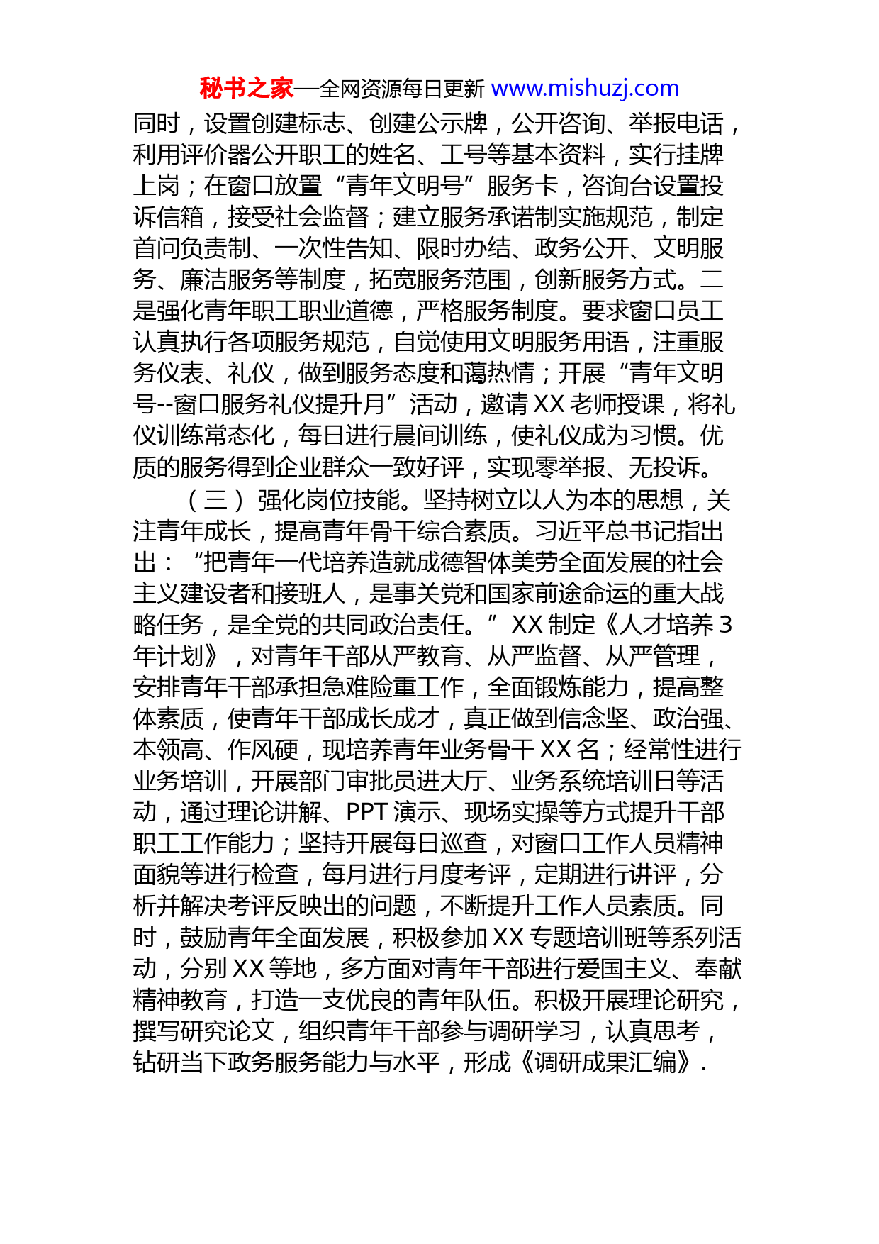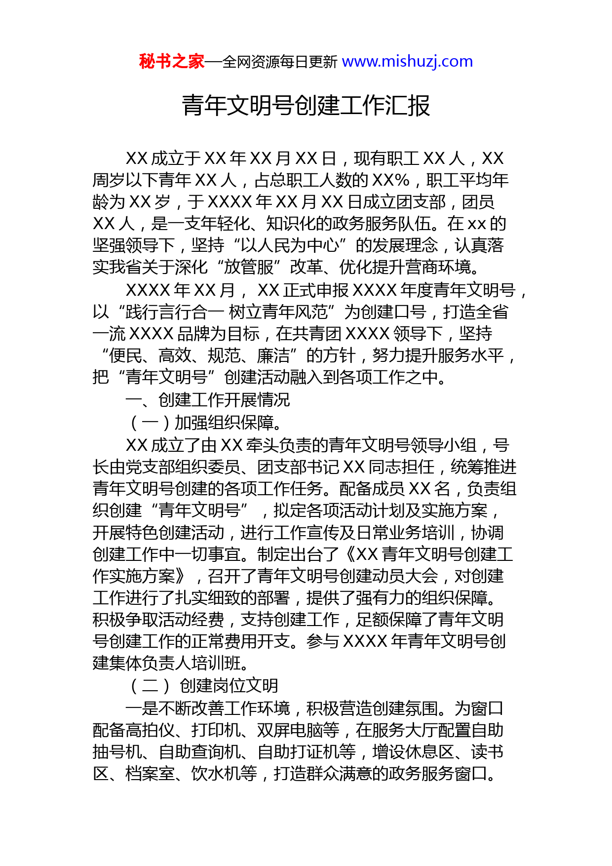 秘书之家—全网资源每日更新www.mishuzj.com青年文明号创建工作汇报XX成立于XX年XX月XX日,现有职工XX人,XX周岁以下青年XX人,占总职工人数的XX%,职工平均年龄为XX岁,于XXXX年XX月XX日成立团支部,团员XX人,是一支年轻化、知识化的政务服务队伍。在xx的坚强领导下,坚持“以人民为中心”的发展理念,认真落实我省关于深化“放管服”改革、优化提升营商环境。XXXX年XX月,XX正式申报XXXX年度青年文明号,以“践行言行合一树立青年风范”为创建口号,打造全省一流XXXX品牌为目标,在共青团XXXX领导下,坚持“便民、高效、规范、廉洁”的方针,努力提升服务水平,把“青年文明号”创建活动融入到各项工作之中。一、创建工作开展情况(一)加强组织保障。XX成立了由XX牵头负责的青年文明号领导小组,号长由党支部组织委员、团支部书记XX同志担任,统筹推进青年文明号创建的各项工作任务。配备成员XX名,负责组织创建“青年文明号”,拟定各项活动计划及实施方案,开展特色创建活动,进行工作宣传及日常业务培训,协调创建工作中一切事宜。制定出台了《XX青年文明号创建工作实施方案》,召开了青年文明号创建动员大会,对创建工作进行了扎实细致的部署,提供了强有力的组织保障。积极争取活动经费,支持创建工作,足额保障了青年文明号创建工作的正常费用开支。参与XXXX年青年文明号创建集体负责人培训班。(二)创建岗位文明一是不断改善工作环境,积极营造创建氛围。为窗口配备高拍仪、打印机、双屏电脑等,在服务大厅配置自助抽号机、自助查询机、自助打证机等,增设休息区、读书区、档案室、饮水机等,打造群众满意的政务服务窗口。秘书之家—全网资源每日更新www.mishuzj.com同时,设置创建标志、创建公示牌,公开咨询、举报电话,利用评价器公开职工的姓名、工号等基本资料,实行挂牌上岗;在窗口放置“青年文明号”服务卡,咨询台设置投诉信箱,接受社会监督;建立服务承诺制实施规范,制定首问负责制、一次性告知、限时办结、政务公开、文明服务、廉洁服务等制度,拓宽服务范围,创新服务方式。二是强化青年职工职业道德,严格服务制度。要求窗口员工认真执行各项服务规范,自觉使用文明服务用语,注重服务仪表、礼仪,做到服务态度和蔼热情;开展“青年文明号--窗口服务礼仪提升月”活动,邀请XX老师授课,将礼仪训练常态化,每日进行晨间训练,使礼仪成为习惯。优质的服务得到企业群众一致好评,实现零举报、无投诉。(三)强化岗位技能。坚持树立以人为本的思想,关注青年成长,提高青年骨干综合素质。习近平总书记指出出:“把青年一代培养造就成德智体美劳全面发展的社会主义建设者和接班人,是事关党和国家前途命运的重大战略任务,是全党的共同政治责任。”XX制定《人才培养3年计划》,对青年干部从严教育、从严监督、从严管理,安排青年干部承担急难险重工作,全面锻炼能力,提高整体素质,使青年干部成长成才,真正做到信念坚、政治强、本领高、作风硬,现培养青年业务骨干XX名;经常性进行业务培训,开展部门审批员进大厅、业务系统培训日等活动,通过理论讲解、PPT演示、现场实操等方式提升干部职工工作能力;坚持开展每日巡查,对窗口工作人员精神面貌等进行检查,每月进行月度考评,定期进行讲评,分析并解决考评反映出的问题,不断提升工作人员素质。同时,鼓励青年全面发展,积极参加XX专题培训班等系列活动,分别XX等地,多方面对青年干部进行爱国主义、奉献精神教育,打造一支优良的青年队伍。积极开展理论研究,撰写研究论文,组织青年干部参与调研学习,认真思考,钻研当下政务服务能力与水平,形成《调研成果汇编》.秘书之家—全网资源每日更新www.mishuzj.com(四)巩固团的建设。一是不断健全团组织建设。由于XX,XX结合工作实际情况,主动承担团委工作,预计于XX进行团委换届工作。二是加强团员教育。把重点放在提高团员的政治思想素质上,利用线上、线下两种形式开展理论学习,引导青年深刻领会习近平新时代中国特色社会主义思想,自觉用新思想武装头脑,指导实践,推动工作发展,在充分的理论培养下,推选XX优秀团员发展成为中共党员,XX名团员同志成为入党积极分子,为强化党员队伍奠定坚实基础。三是开展丰富活动。充分发挥青年团员多的优势,先后组织学雷锋、“祭拜革命先烈,追寻红色记忆”、“五四青年节”等活动,观看爱国教育影片XX次,通过唱红歌、诗歌朗诵、重温入团誓词等形式,回顾入团初心。二、创建工作成效(一)荣获表彰荣誉。创建过程中XX青年干部积极作为,全面推进各项工作,服务质量稳步提高,荣获XX奖、先后收到感谢信XX封,锦旗XX面,XX名青年同志因工作表现突出被评为先进个人。(二)疫情期间主动作为。XX坚持值班值守制度,热线电话咨询量大幅增长,解答群众各类咨询和投诉问题。发布《XX关于近期业务办理有关事宜的通告》,告知企业和群众疫情期间XX办事流程,倡导“网上办、邮寄办”,为企业复工复产稳步开展、有序推进提供保障,主动担当的工作态度受到陕西日报等多家媒体的报道与转发。(三)热心志愿服务。组建“巾帼志愿者”“岗位学雷锋”志愿服务队,积极开展扶贫济困,依托XX,认领一名贫困户,对其进行实地走访慰问,送去米、面、油等生活物资,通过面对面交流,详细掌握家庭成