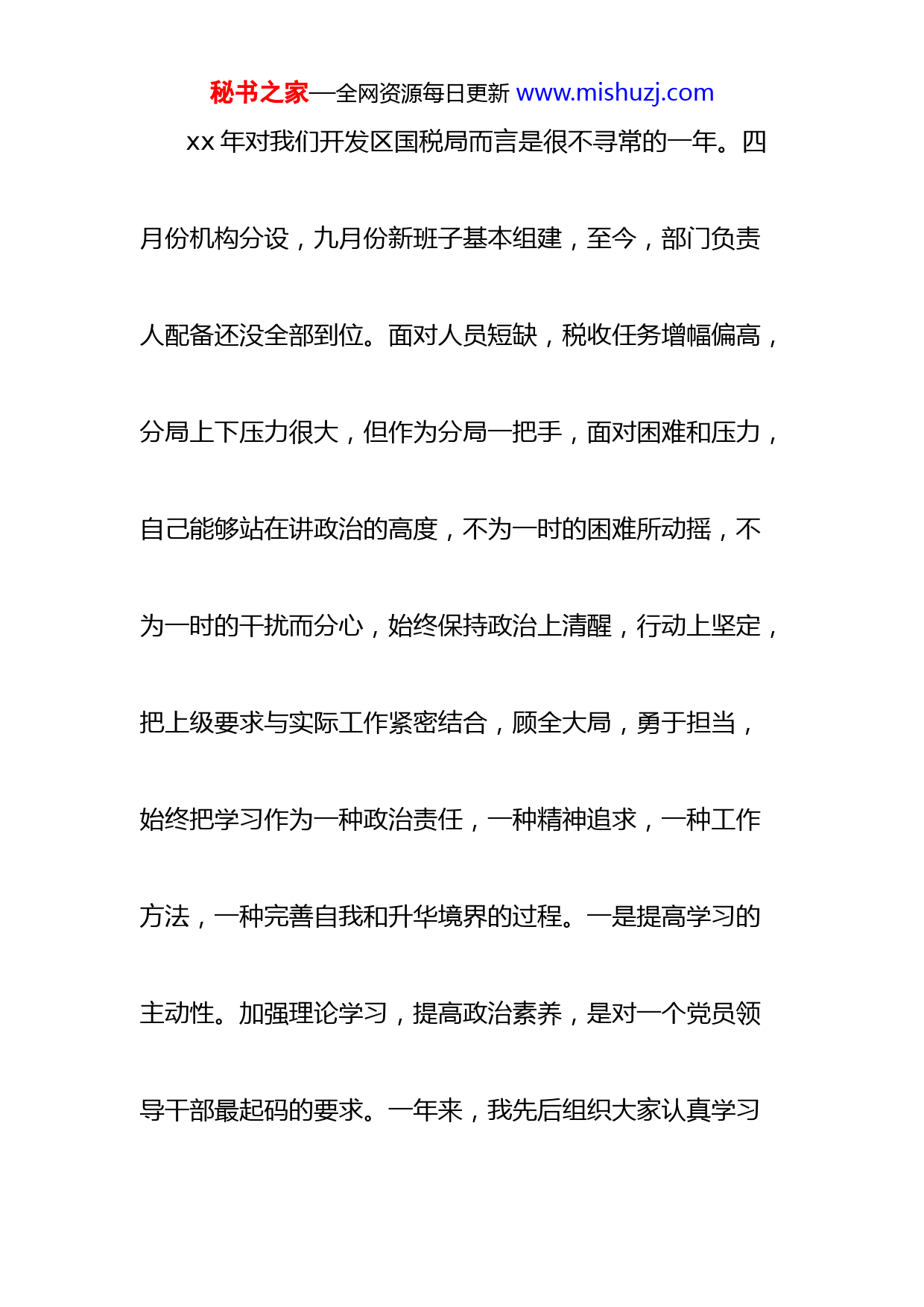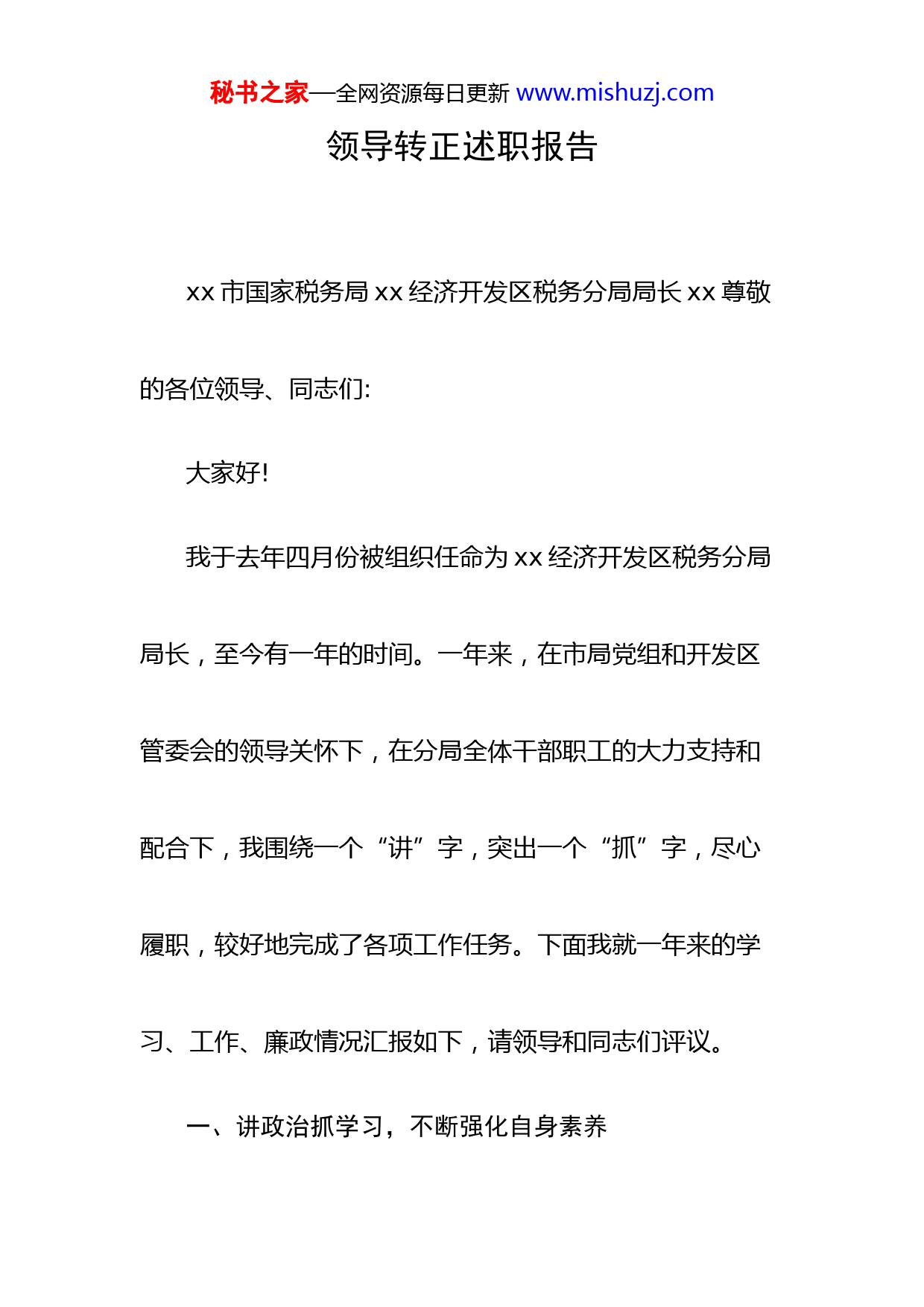 秘书之家—全网资源每日更新www.mishuzj.com领导转正述职报告xx市国家税务局xx经济开发区税务分局局长xx尊敬的各位领导、同志们:大家好!我于去年四月份被组织任命为xx经济开发区税务分局局长,至今有一年的时间。一年来,在市局党组和开发区管委会的领导关怀下,在分局全体干部职工的大力支持和配合下,我围绕一个“讲”字,突出一个“抓”字,尽心履职,较好地完成了各项工作任务。下面我就一年来的学习、工作、廉政情况汇报如下,请领导和同志们评议。一、讲政治抓学习,不断强化自身素养秘书之家—全网资源每日更新www.mishuzj.comxx年对我们开发区国税局而言是很不寻常的一年。四月份机构分设,九月份新班子基本组建,至今,部门负责人配备还没全部到位。面对人员短缺,税收任务增幅偏高,分局上下压力很大,但作为分局一把手,面对困难和压力,自己能够站在讲政治的高度,不为一时的困难所动摇,不为一时的干扰而分心,始终保持政治上清醒,行动上坚定,把上级要求与实际工作紧密结合,顾全大局,勇于担当,始终把学习作为一种政治责任,一种精神追求,一种工作方法,一种完善自我和升华境界的过程。一是提高学习的主动性。加强理论学习,提高政治素养,是对一个党员领导干部最起码的要求。一年来,我先后组织大家认真学习秘书之家—全网资源每日更新www.mishuzj.com了党的十七届四中、五中全会精神,《党员领导干部廉洁从政若干准则》。特别是学习了袁纯清书记在全省领导干部大会上的讲话后,加深了对党的执政理念的理解,增强了用政治理论指导工作实践的责任感和使命感,自身的素质和能力有了新的提高。二是增强学习的自觉性。为了更好地适应新时期税收工作的要求,我严格要求自己,坚持向书本学习,不断拓宽自己的视野;坚持向实践学习,不断丰富自己的管理经验;坚持向同志们学习,不断提高自己的管理能力,为实现税收事业的协调发展奠定坚实的素质基础。三是把握学习的针对性。目前,我国正处于前所未有的经济社会转型期,做好税收工作,要求我们不仅具备高秘书之家—全网资源每日更新www.mishuzj.com素质的政治理论水平,还需要我们熟悉与税收相关的经济、法律、管理等各领域知识。因此,从提高分局税干整体素质入手,我们把每周四作为雷打不动的政治、业务学习日,由局长、科长发挥各自强项轮流上台做讲座,使大家不断拓展学习领域,逐渐养成良好的学习习惯。二、讲原则抓制度,努力当好一班之长带好班子,抓好队伍,是一个单位负责人的重要职责。这方面我坚持做人讲原则,以诚相见,和谐共事;做事讲原则,要求别人做到的,自己首先做到,要求别人不做的,自己坚决不做;工作讲原则,坚持“三个带头”,做好“三个表率”。一是带头执行民主集中制,努力做维护团结的秘书之家—全网资源每日更新www.mishuzj.com表率。民主集中制是我党的一项重要制度,在关乎全局的重大事项和问题上,我事先都要征求每一位班子成员的意见,形成共识后,再召开局务会议,最终把大家的意见集中好,发挥好。在班子成员相处中,我自觉养成理解人,的习惯,互相关心,互相支持,做到不利于团结的话不说,尊重人不利于团结的事不做,努力营造友好和谐的共事氛围。二是带头深入一线,努力做调查研究的表率。多年的税收实践经验告诉我,只有深入一线,深入基层,才能牢牢把握税收工作主动权。工作中,我要求大家身体力行多深入基层,深入纳税户,了解我们管理的现状,掌握我们工作的进展情况。特别是今年以来面对严峻的组织收入形秘书之家—全网资源每日更新www.mishuzj.com势,我和大家先后多次深入亚新科、物资回收、化工等企业开展税源摸底大调查。4月份,9户重点企业缴纳税款464万元。三是带头执行制度,努力做好建章立制的表率。制度建设带有全局性、长久性。机构分设后,面对人员短缺经费不足,一人多岗的工作状况,我和大家一道进一步理顺各项运行机制,规范机构设路,带领大家认真梳理和完善了政务、财务、业务、人事教育、党风廉政等各项制度,进一步明确了岗位责任制等考核制度,努力形成用制度“管人、管权、管事”,着力构建教育、制度、监督并重的长效机制。三、讲方法抓管理,着力促进工作落实秘书之家—全网资源每日更新www.mishuzj.com不折不扣地完成好各项税收工作任务,是我们税务机关义不容辞的职责所在。讲求方法,狠抓管理,是促进工作落实的有效手段。一年来来,我们遇到矛盾不回避避,遇到困难不低头,砥砺奋进,攻坚克难,圆满完成了各项工作任务。xx年共完成税收收入7036万元,占年度任务的105.4%,同比增收1314万元。2011年市局分配给我局计划任务为7930万元,增长12.70%。针对年初严峻的税收形势,我们一是明确思路抓落实。结合实际,提出了“一个牢记,五项工作”的发展思路,即:认真贯彻落实党的十七届五中全会精神,牢记“为国聚财,为民收税”的神圣使命,加强组织收入工作,推进依法行政,提高纳税秘书之家—全网资源每日更新www.mishuzj.com服务水平,实施税源专业化管理,强化干部队伍建设,为xx开发区和xx经济社会发展做出新的更大贡献。事实证明,这一思路符合我局的税收工作实际,抓住了核心与关键,促进了各项工作的顺利完成。二是围绕中心抓落实。我们围绕组织收入这一中心工作,克服开发区经济增长基数高,税源严重