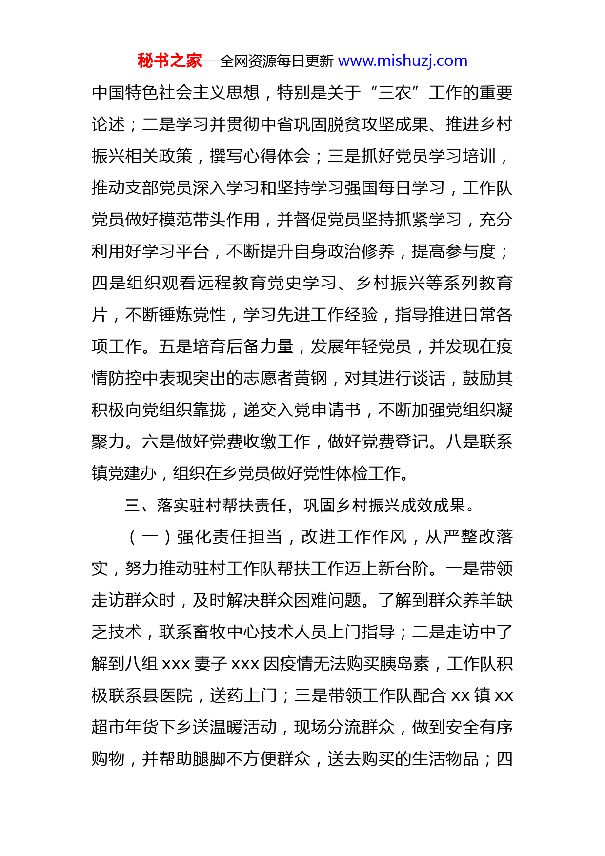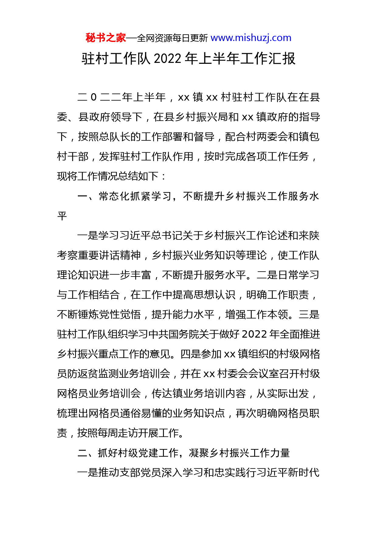 秘书之家—全网资源每日更新www.mishuzj.com驻村工作队2022年上半年工作汇报二0二二年上半年,xx镇xx村驻村工作队在在县委、县政府领导下,在县乡村振兴局和xx镇政府的指导下,按照总队长的工作部署和督导,配合村两委会和镇包村干部,发挥驻村工作队作用,按时完成各项工作任务,现将工作情况总结如下:一、常态化抓紧学习,不断提升乡村振兴工作服务水平一是学习习近平总书记关于乡村振兴工作论述和来陕考察重要讲话精神,乡村振兴业务知识等理论,使工作队理论知识进一步丰富,不断提升服务水平。二是日常学习与工作相结合,在工作中提高思想认识,明确工作职责,不断锤炼党性觉悟,提升能力水平,增强工作本领。三是驻村工作队组织学习中共国务院关于做好2022年全面推进乡村振兴重点工作的意见。四是参加xx镇组织的村级网格员防返贫监测业务培训会,并在xx村委会会议室召开村级网格员业务培训会,传达镇业务培训内容,从实际出发,梳理出网格员通俗易懂的业务知识点,再次明确网格员职责,按照每周走访开展工作。二、抓好村级党建工作,凝聚乡村振兴工作力量一是推动支部党员深入学习和忠实践行习近平新时代秘书之家—全网资源每日更新www.mishuzj.com中国特色社会主义思想,特别是关于“三农”工作的重要论述;二是学习并贯彻中省巩固脱贫攻坚成果、推进乡村振兴相关政策,撰写心得体会;三是抓好党员学习培训,推动支部党员深入学习和坚持学习强国每日学习,工作队党员做好模范带头作用,并督促党员坚持抓紧学习,充分利用好学习平台,不断提升自身政治修养,提高参与度;四是组织观看远程教育党史学习、乡村振兴等系列教育片,不断锤炼党性,学习先进工作经验,指导推进日常各项工作。五是培育后备力量,发展年轻党员,并发现在疫情防控中表现突出的志愿者黄钢,对其进行谈话,鼓励其积极向党组织靠拢,递交入党申请书,不断加强党组织凝聚力。六是做好党费收缴工作,做好党费登记。八是联系镇党建办,组织在乡党员做好党性体检工作。三、落实驻村帮扶责任,巩固乡村振兴成效成果。(一)强化责任担当,改进工作作风,从严整改落实,努力推动驻村工作队帮扶工作迈上新台阶。一是带领走访群众时,及时解决群众困难问题。了解到群众养羊缺乏技术,联系畜牧中心技术人员上门指导;二是走访中了解到八组xxx妻子xxx因疫情无法购买胰岛素,工作队积极联系县医院,送药上门;三是带领工作队配合xx镇xx超市年货下乡送温暖活动,现场分流群众,做到安全有序购物,并帮助腿脚不方便群众,送去购买的生活物品;四秘书之家—全网资源每日更新www.mishuzj.com是以五保户为重点户,定期走访三组xxx,四组xxx,五组xxx、xx,六组xx,七组xxx、xxx,九组xxx,关心他们的生活,帮助解决生活中的困难;五是带领工作队配合卫生院对65岁老人进行健康体检,引导帮助腿脚不便的群众,开车接送;六是配合做好全员检测各项工作,保障有序开展。按照总队长的工作部署,带领驻村工作队和委机关干部提前做好核酸检测现场的布置工作,设置警示锥形桶,严格按照两米线距离,现场专人维持秩序,专人进行消杀,保障核酸检测工作安全、有序开展,3次核酸检测共计3463人,为了方便扫码,第一书记带领工作队员耐心帮助年龄大的群众注册预约码,提高了检测效率;七是开展春节期间慰问活动,通过送春联、送慰问品等,让老党员和困难群众感受到温暖;八是开展留守儿童慰问活动。六一前夕,给2名小学生送去书包、文具、体育用品等,叮嘱其好好学习。(二)继续配合村两委会开展防返贫动态监测工作。一是按照县乡村振兴局防返贫动态监测工作要求,及时召开防返贫动态监测工作推进会;二是分组开展防返贫动态监测走访工作,认真落实饮水、住房等指标;三是组织召开防返贫动态监测研判会,与村、镇干部对边缘户进行认真研判。四是抓紧数据填报工作。每月在8号前完成录入165户建档立卡户信息核对和收入信息,数据上报工作。秘书之家—全网资源每日更新www.mishuzj.com(三)联动联防联控,保障有力,解决后顾之忧。一是为保障核酸检测工作测温工作有序开展,工作队捐赠手持式红外测温枪2个,手持扩音喇叭2个。二是捐赠84消毒液2桶,安排专人不定时对全村进行消杀。三是做好全员核酸检测各项工作,保障有序开展。按照总队长的工作部署,驻村工作队和委机关干部提前做好核酸检测现场的布置工作,设置警示锥形桶,严格按照两米线距离,现场专人维持秩序,专人进行消杀,保障核酸检测工作安全、有序开展,2022年以来3次核酸检测共计3463人。(四)开展春节期间慰问活动,让群众感受到温暖。一是1月7日,驻村工作队与纪委书记xx对五保户进行慰问,送去米、油等慰问品;二是1月8日工作队与村干部组织低保户在村委会领取xx镇政府发放的爱心蔬菜;三是1月26日驻村工作队与村干部一起开展送春联活动,共送出春联60余幅。(五)加强安全排查工作。驻村工作队与村干部、包村干部定期检查村乡村振兴工厂盒3个养殖合作社,对部分线路老化提出整改要求,要求按照标准配备灭火器。四、加强驻村工作纪律,按时到岗开展工作一是驻村工作队召开学习会,传达县委组织部关于规范驻村干部管理有关事项的通知,要求严格按照通报问题做好整改规范;二是严格按照《xx县驻村第一书记和工作秘书之家—全网资源