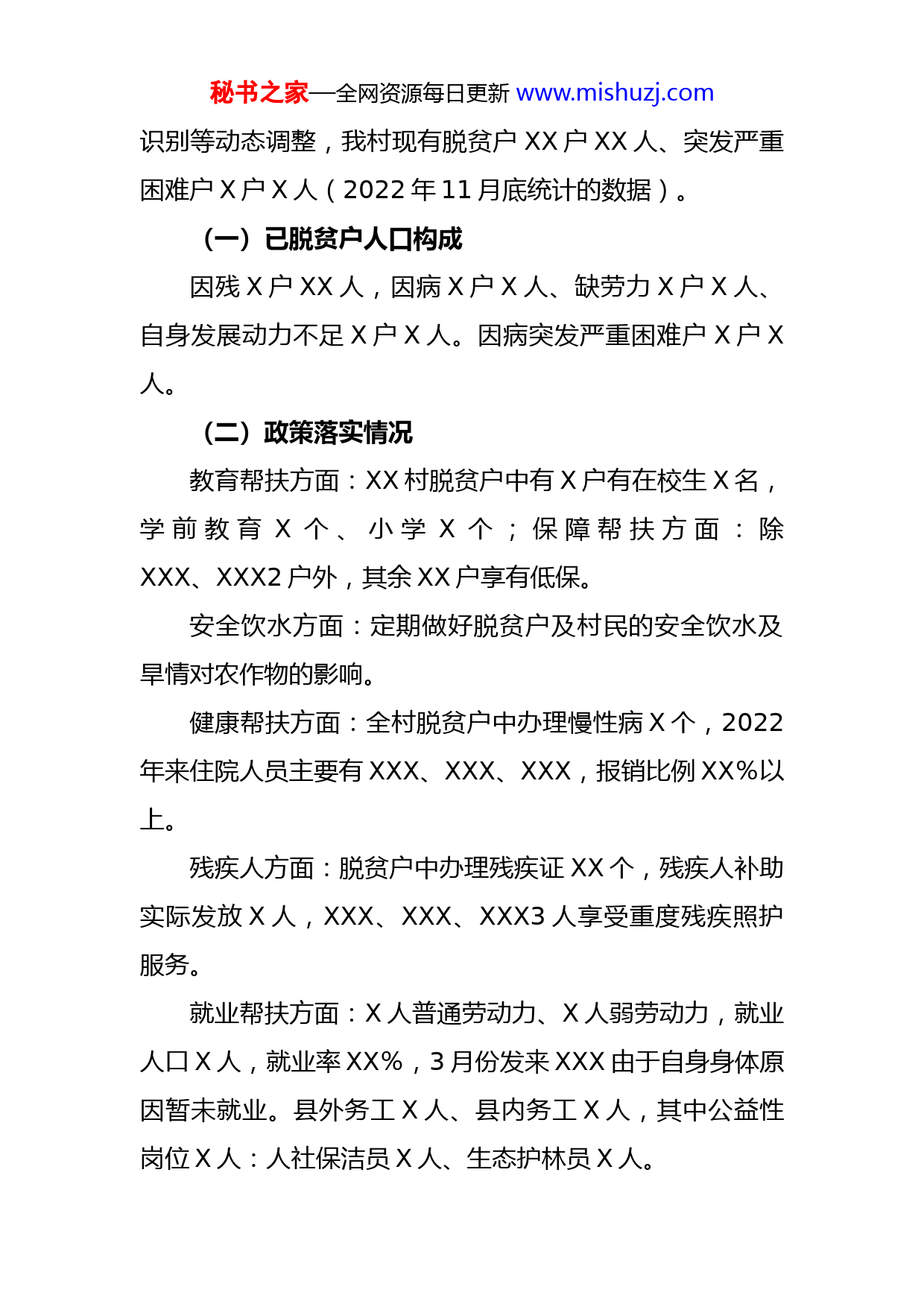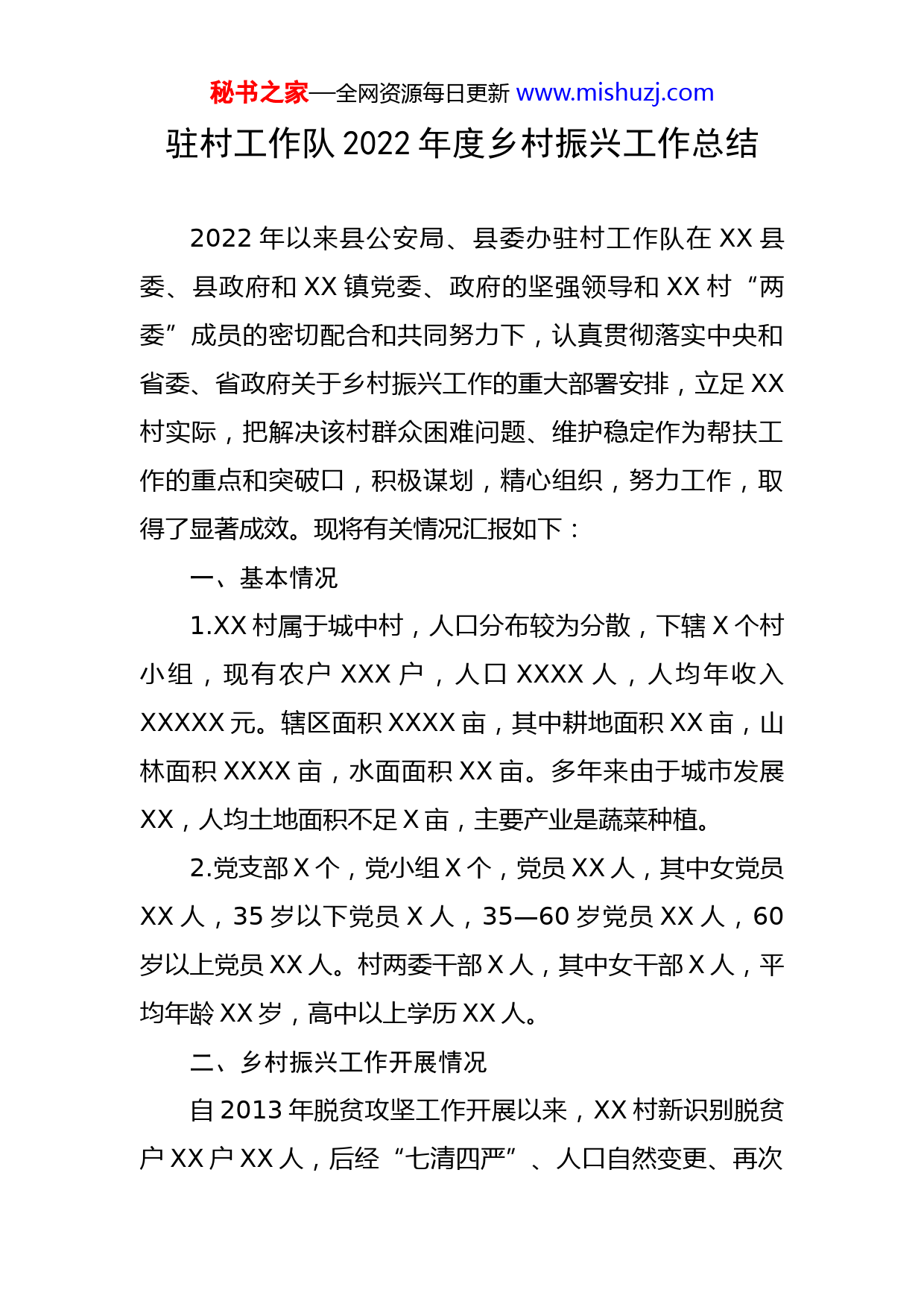 秘书之家—全网资源每日更新www.mishuzj.com驻村工作队2022年度乡村振兴工作总结2022年以来县公安局、县委办驻村工作队在XX县委、县政府和XX镇党委、政府的坚强领导和XX村“两委”成员的密切配合和共同努力下,认真贯彻落实中央和省委、省政府关于乡村振兴工作的重大部署安排,立足XX村实际,把解决该村群众困难问题、维护稳定作为帮扶工作的重点和突破口,积极谋划,精心组织,努力工作,取得了显著成效。现将有关情况汇报如下:一、基本情况1.XX村属于城中村,人口分布较为分散,下辖X个村小组,现有农户XXX户,人口XXXX人,人均年收入XXXXX元。辖区面积XXXX亩,其中耕地面积XX亩,山林面积XXXX亩,水面面积XX亩。多年来由于城市发展XX,人均土地面积不足X亩,主要产业是蔬菜种植。2.党支部X个,党小组X个,党员XX人,其中女党员XX人,35岁以下党员X人,35—60岁党员XX人,60岁以上党员XX人。村两委干部X人,其中女干部X人,平均年龄XX岁,高中以上学历XX人。二、乡村振兴工作开展情况自2013年脱贫攻坚工作开展以来,XX村新识别脱贫户XX户XX人,后经“七清四严”、人口自然变更、再次秘书之家—全网资源每日更新www.mishuzj.com识别等动态调整,我村现有脱贫户XX户XX人、突发严重困难户X户X人(2022年11月底统计的数据)。(一)已脱贫户人口构成因残X户XX人,因病X户X人、缺劳力X户X人、自身发展动力不足X户X人。因病突发严重困难户X户X人。(二)政策落实情况教育帮扶方面:XX村脱贫户中有X户有在校生X名,学前教育X个、小学X个;保障帮扶方面:除XXX、XXX2户外,其余XX户享有低保。安全饮水方面:定期做好脱贫户及村民的安全饮水及旱情对农作物的影响。健康帮扶方面:全村脱贫户中办理慢性病X个,2022年来住院人员主要有XXX、XXX、XXX,报销比例XX%以上。残疾人方面:脱贫户中办理残疾证XX个,残疾人补助实际发放X人,XXX、XXX、XXX3人享受重度残疾照护服务。就业帮扶方面:X人普通劳动力、X人弱劳动力,就业人口X人,就业率XX%,3月份发来XXX由于自身身体原因暂未就业。县外务工X人、县内务工X人,其中公益性岗位X人:人社保洁员X人、生态护林员X人。秘书之家—全网资源每日更新www.mishuzj.com产业帮扶方面:X户参加了XX惠民光伏合作社;与XXX产业扶贫项目签订了村集体利益联结机制,每年分红约X万元;全部享受XXX资产收益分红。安居帮扶方面:2016年以来累计为X户脱贫户实施了危房改造、异地搬迁工作(2018年度付任水享受、2019年XXX享受)。截止目前,XX村脱贫户已全面巩固了脱贫攻坚的成果,各项帮扶政策落实到位,脱贫户全年人均收入达到万余元。2022年11月,顺利完成了省市县巩固拓展脱贫攻坚成果与乡村振兴工作成效考核任务。三、主要工作(一)着力加强乡村振兴组织领导今年年初以来,县公安局、县委办党组高度重视挂点帮扶工作,坚持定期听取驻村工作队的工作汇报,多次召开党组会议专题研究帮扶工作,及时压实工作责任,加强宏观指导,并向上级争资金、引进近50万元扶贫项目资金用于支持XX村集体经济产业发展、并且向社会公开招租的形式把挖机向外进行出租,年增加了村集体经济十余万元;基层党建和走访慰问老党员、贫困群众等,确保帮扶经费到位,工作顺利开展。2022年2月、8月,县公安局局长、县委办主任先后多次到XX村走访慰问贫困群众,督导帮扶项目落实,并就如何做好帮扶工作、铆足发展后劲秘书之家—全网资源每日更新www.mishuzj.com开展调研座谈,提出明确具体的要求;分管扶贫工作的公安局尧委员,县委办吴主任也先后多次到村调研指导,了解帮扶产业发展、帮扶资金使用、帮扶政策落实情况,指导督促驻村工作队履职尽责,更好为村民服务,给工作队员和村两委成员极大激励。在县公安局、县委办领导的关心和支持下,以时不我待的紧迫感和只争朝夕的精气神,真抓实干,真帮实扶,与村两委成员团结共事,深入一线参与施工生产、应急维稳、纠纷调解,各项工作扎实有效,村两委干部和村民对驻村工作队的帮扶和驻村干部的作风均高度肯定,工作成效明显。(二)全力推动乡村振兴政策落实驻村帮扶工作关键的是要把上级的帮扶政策落实到位。工作队的同志始终坚持工作至上,与村两委干部密切配合协调,认真履行工作职责,积极开展为民服务全程代理、民事村办等工作,高标准完成了各项帮扶任务。一是抓实了村集体经济的发展与壮大、通过公开招租的方式,将村集体资产进行出租,定期收取一定的租金,增加村集体经济的来源。二是加强村里的基础设施,如为XX组新加宽了40余米的道路拓宽道路及路灯安装,并且今年已经申请的两条村级道路进行维修与拓宽。三是加强扶贫产业发展和收益分配,为1名贫困人员介绍就业或安排公益性岗位。四是对帮扶的困难户的房屋漏水的现象进行了必要的秘书之家—全网资源每日更新www.mishuzj.com维修。2022年XX村扶贫产业增收XX万余元,有力助推巩固拓展脱贫攻坚成果和乡村振兴工作,每个脱贫户实现收益分红1000-3000元。一年来,XX村的乡村振兴工作多次接受省、市、县三级相关部门检查和明察暗访,得到普遍肯定。此外,驻村工作队还先后为脱贫户及村民跑腿办理医保、社保、残疾证等,结合春节、端午、中秋等节日,动员社会组织、成功人士参与公益慈善事业,多次对脱贫户、边缘户和困难党员开展走访慰问,协调城管局路灯管理所调度资金,为村里架