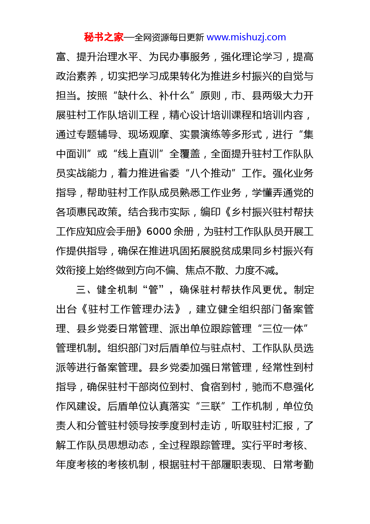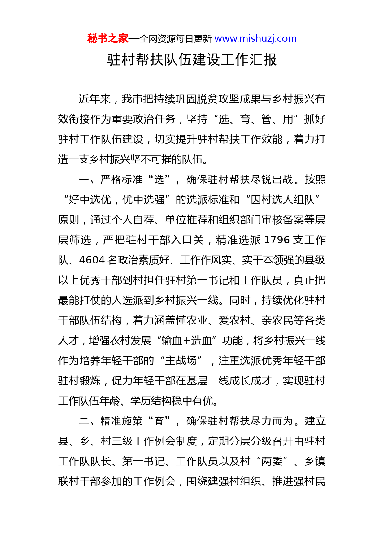 秘书之家—全网资源每日更新www.mishuzj.com驻村帮扶队伍建设工作汇报近年来,我市把持续巩固脱贫攻坚成果与乡村振兴有效衔接作为重要政治任务,坚持“选、育、管、用”抓好驻村工作队伍建设,切实提升驻村帮扶工作效能,着力打造一支乡村振兴坚不可摧的队伍。一、严格标准“选”,确保驻村帮扶尽锐出战。按照“好中选优,优中选强”的选派标准和“因村选人组队”原则,通过个人自荐、单位推荐和组织部门审核备案等层层筛选,严把驻村干部入口关,精准选派1796支工作队、4604名政治素质好、工作作风实、实干本领强的县级以上优秀干部到村担任驻村第一书记和工作队员,真正把最能打仗的人选派到乡村振兴一线。同时,持续优化驻村干部队伍结构,着力涵盖懂农业、爱农村、亲农民等各类人才,增强农村发展“输血+造血”功能,将乡村振兴一线作为培养年轻干部的“主战场”,注重选派优秀年轻干部驻村锻炼,促力年轻干部在基层一线成长成才,实现驻村工作队伍年龄、学历结构稳中有优。二、精准施策“育”,确保驻村帮扶尽力而为。建立县、乡、村三级工作例会制度,定期分层分级召开由驻村工作队队长、第一书记、工作队员以及村“两委”、乡镇联村干部参加的工作例会,围绕建强村组织、推进强村民秘书之家—全网资源每日更新www.mishuzj.com富、提升治理水平、为民办事服务,强化理论学习,提高政治素养,切实把学习成果转化为推进乡村振兴的自觉与担当。按照“缺什么、补什么”原则,市、县两级大力开展驻村工作队培训工程,精心设计培训课程和培训内容,通过专题辅导、现场观摩、实景演练等多形式,进行“集中面训”或“线上直训”全覆盖,全面提升驻村工作队队员实战能力,着力推进省委“八个推动”工作。强化业务指导,帮助驻村工作队成员熟悉工作业务,学懂弄通党的各项惠民政策。结合我市实际,编印《乡村振兴驻村帮扶工作应知应会手册》6000余册,为驻村工作队队员开展工作提供指导,确保在推进巩固拓展脱贫成果同乡村振兴有效衔接上始终做到方向不偏、焦点不散、力度不减。三、健全机制“管”,确保驻村帮扶作风更优。制定出台《驻村工作管理办法》,建立健全组织部门备案管理、县乡党委日常管理、派出单位跟踪管理“三位一体”管理机制。组织部门对后盾单位与驻点村、工作队队员选派等进行备案管理。县乡党委加强日常管理,经常性到村指导,确保驻村干部岗位到村、食宿到村,驰而不息强化作风建设。后盾单位认真落实“三联”工作机制,单位负责人和分管驻村领导按季度到村走访,听取驻村汇报,了解工作队员思想动态,全过程跟踪管理。实行平时考核、年度考核的考核机制,根据驻村干部履职表现、日常考勤秘书之家—全网资源每日更新www.mishuzj.com等情况进行定量、定性考评,督促驻村干部到岗履职。市县两级采取“四不两直”、电话抽查等方式,不定期对驻村干部到岗到位和履职情况进行督促检查,确保驻村干部用心驻村、认真干事。强化关怀激励,积极落实健康体检、人身意外险购买等保障措施,让驻村干部真正能够沉下去、待得住、干得好。四、大胆选拔“用”,确保驻村帮扶干劲十足。树立正向激励导向,坚持把乡村振兴一线工作锻炼作为培养干部的重要途径,对驻村期间表现优秀、作出突出贡献、群众公认的驻村干部予以重点培养、大胆提拔使用。在县乡换届中注重配强乡村振兴“骨干力量”,注重选拔脱贫攻坚中表现优秀的干部,新提拔进县级班子的扶贫干部占比84.8%,乡镇班子中有2年以上扶贫经历的占比96.3%,一大批优秀“85后”“90后”进入县乡班子。正确运用容错纠错机制,对在工作中非主观故意导致的失误偏差和负面影响,依法依规从轻处理或免于处理,对不胜任或造成不良后果的及时调整处理,倒逼驻村干部在乡村振兴生动实践中建功立业,勇当“闯将”“干将”。