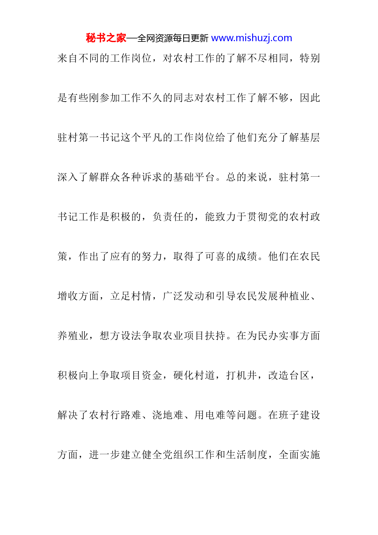 秘书之家—全网资源每日更新www.mishuzj.com驻村书记述职工作总结2021按照市委组织部《关于开展2018年度全市驻村第一书记向上级党(工)委集中述职活动的通知》(安组[2019]3号)要求,XX区高度重视,制定工作方案,精心组织实施,认真组织实施驻村第一书记向上级党委集中述职活动,确保工作落实到位。一、驻村第一书记工作开展情况XX区驻村第一书记共有17人,其中市派第四批驻村第一书记1人,第五批5人,区派第五批11人。驻村第一书记秘书之家—全网资源每日更新www.mishuzj.com来自不同的工作岗位,对农村工作的了解不尽相同,特别是有些刚参加工作不久的同志对农村工作了解不够,因此驻村第一书记这个平凡的工作岗位给了他们充分了解基层深入了解群众各种诉求的基础平台。总的来说,驻村第一书记工作是积极的,负责任的,能致力于贯彻党的农村政策,作出了应有的努力,取得了可喜的成绩。他们在农民增收方面,立足村情,广泛发动和引导农民发展种植业、养殖业,想方设法争取农业项目扶持。在为民办实事方面积极向上争取项目资金,硬化村道,打机井,改造台区,解决了农村行路难、浇地难、用电难等问题。在班子建设方面,进一步建立健全党组织工作和生活制度,全面实施秘书之家—全网资源每日更新www.mishuzj.com基层党建工作制度。虽然任职时间不长,但他们都能充分发挥自身特点和部门优势,找准工作突破口,创造性地开展工作,在较短的时间里,打开了工作局面,取得了初步成效。1、迅速熟悉基层,拉近了与群众之间的距离。XX区驻村第一书记将调查研究作为驻村以来重要工作任务,通过广泛深入走访群众、召开座谈会等形式,进一步掌握了各村的基本情况,为下一步有针对性的开展工作奠定了坚实的基础。如东邵科第一书记杨煊制作发放了便民联系卡,小卡片成为与群众之间联络的暖心卡,得到群众好评;西邵科秘书之家—全网资源每日更新www.mishuzj.com驻村第一书记张宇宁在了解到该村村民路丽芳家庭非常困难,充分发挥选派单位和自身优势,与路丽芳结成帮扶对子,协调统战部妇委会两次对路丽芳进行爱心帮扶,送去600元现金和米面油等生活必需品,为她解决生活实际困难,赢得了广大群众的好评和拥护。2、充分发挥自身优势,取得了选派部门大力支持。XX区驻村第一书记结合选派单位的职能优势,充分发挥后盾作用,切实推动驻村各项工作的顺利开展。如西邵科第一书记张宇宁向市委副书记、统战部部长李文斌专题汇报了到村驻村以来工作情况,取得了李书记认可和支持,李文斌秘书之家—全网资源每日更新www.mishuzj.com书记于2018年10月28日专程到西邵科视察工作,并走访慰问了老党员。区财政局派驻到杨贾村的第一书记岳圆同志多次找到财政局领导汇报驻村工作,通过与区直有关部门协调,为该村争取到25万元的道路建设资金,解决了群众出行难这个难题,受到了群众的。3、加强基层组织建设,抓住了引领发展的关键。驻村第一书记将加强班子和党员队伍建设作为首要任务,认真履行抓基层组织建设的第一职责,使支部班子战斗力不断增强。通过组织召开支委会、党员大会、组织生活会等灵活多样的形式,对广大党员干部在思想政治方面进行了再教育、再培训,使党员干部的思想认识得到进一步提高,党秘书之家—全网资源每日更新www.mishuzj.com组织的凝聚力和战斗力得到进一步增强。如区工委办下派到南务村第一书记李庆洲同志驻村以来,通过组织学习和个别谈心等方式,不断激发了村两委干事创业的热情,进一步统一了广大党员思想,为群众办实事,做好事,解难事,切实履行了第一书记职责,发挥了党员模范带头作用。4、理清发展思路,制定了科学发展规划。驻村第一书记任职以来,充分发挥了自身信息广、思路清的优势,通过召开村支两委会和党员、群众代表会,掌握村情,了解民意,根据各村实际情况,因地制宜,科学规划,理清发展思路。如市第三人民医院下派到常王贾村第一书记李玉多次到上级扶贫、财政、农业、民政等部门咨询了解相关政秘书之家—全网资源每日更新www.mishuzj.com策,并根据驻村调研情况,形成了乡村道路建设、环境卫生整治工作建议书,制定了可操作的发展规划。区产业集聚区下派到后白璧村第一书记孙爱斌通过两个多月的调研制定了村两年脱贫计划,在产业结构调整、生态农业建设基础设施改善等方面理清了发展思路,为带领群众致富奠定了坚实基础。5、加大基础设施建设力度,改变了村内落后面貌。XX区驻村第一书记注重农村基础设施建设工作,把为民修好一条路、建好一个广场等民生工程作为大事来抓,作为实事来办,作为好事来谋,掀起了干事创业新热潮。如市政法委下派到东邵科第一书记杨煊通过积极协调,争取39万元秘书之家—全网资源每日更新www.mishuzj.com扶贫资金用于修建村内道路,为村内安装架设高压线800米和变压器一台,解决了村民浇地难问题。下派到后白璧的孙爱斌争取扶贫资金39万元用于修建村内道路,于近期开始施工。杨贾村岳圆争取福利彩票资金5万元,用于村小学配套设施修缮。这一系列基础设施建设项目的实施,得到了广大群众的高度认可,也为第一书记在村内聚集了很高的人气。6、关心群众疾苦,开展了多样关爱慰问活动。到村任职以后,第一书记们始终把群众的冷暖放在心上,多次深入五保户、困难群