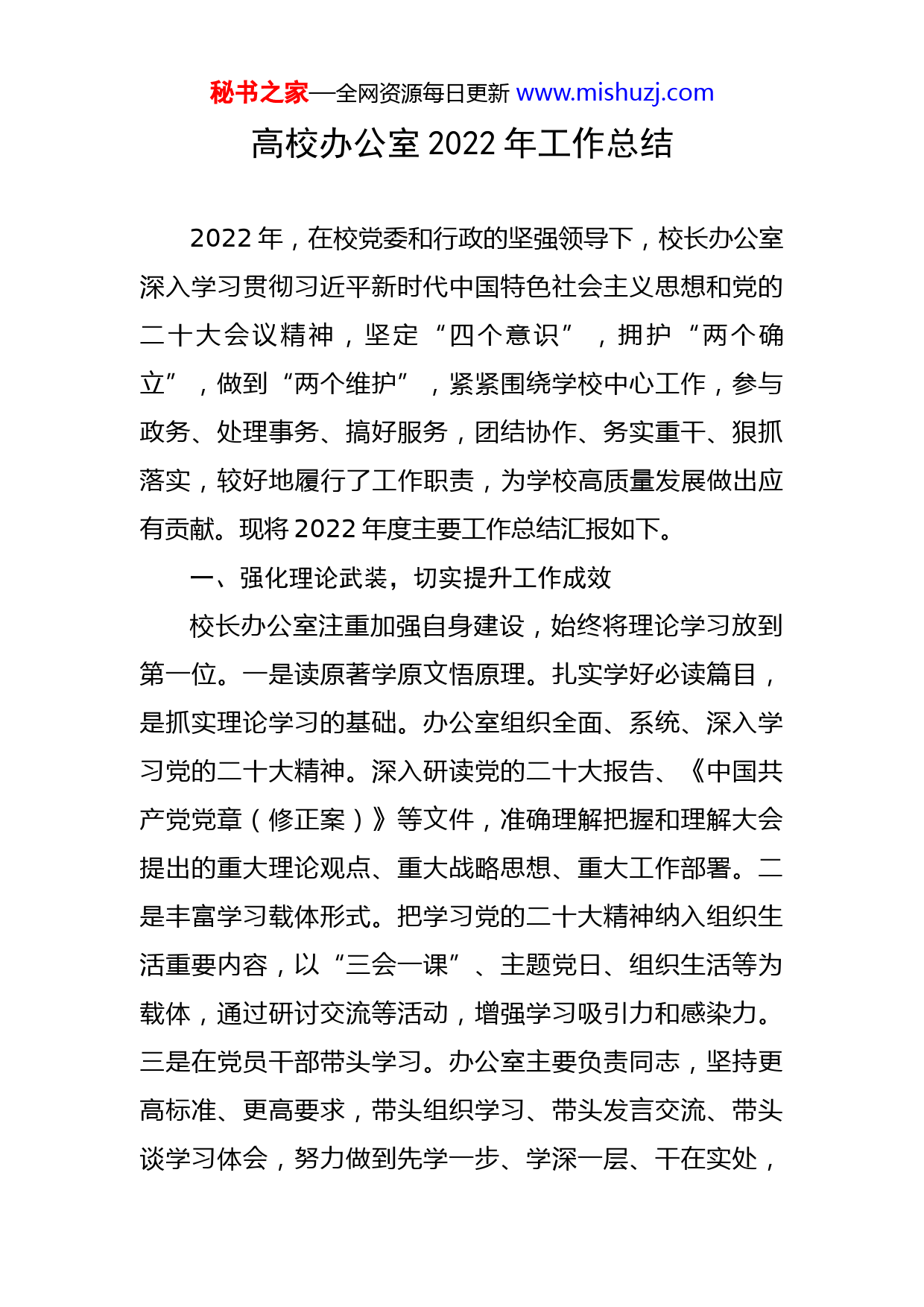 秘书之家—全网资源每日更新www.mishuzj.com高校办公室2022年工作总结2022年,在校党委和行政的坚强领导下,校长办公室深入学习贯彻习近平新时代中国特色社会主义思想和党的二十大会议精神,坚定“四个意识”,拥护“两个确立”,做到“两个维护”,紧紧围绕学校中心工作,参与政务、处理事务、搞好服务,团结协作、务实重干、狠抓落实,较好地履行了工作职责,为学校高质量发展做出应有贡献。现将2022年度主要工作总结汇报如下。一、强化理论武装,切实提升工作成效校长办公室注重加强自身建设,始终将理论学习放到第一位。一是读原著学原文悟原理。扎实学好必读篇目,是抓实理论学习的基础。办公室组织全面、系统、深入学习党的二十大精神。深入研读党的二十大报告、《中国共产党党章(修正案)》等文件,准确理解把握和理解大会提出的重大理论观点、重大战略思想、重大工作部署。二是丰富学习载体形式。把学习党的二十大精神纳入组织生活重要内容,以“三会一课”、主题党日、组织生活等为载体,通过研讨交流等活动,增强学习吸引力和感染力。三是在党员干部带头学习。办公室主要负责同志,坚持更高标准、更高要求,带头组织学习、带头发言交流、带头谈学习体会,努力做到先学一步、学深一层、干在实处,秘书之家—全网资源每日更新www.mishuzj.com引领真学风尚。四是坚持理论联系实际。发扬理论联系实际的优良学风,把理论学习同研究解决突出问题结合起来,同个人的思想实际和工作实际结合起来,使学习更加生动形象、推动办公室成员带着使命学、带着责任学、带着问题学,自觉对表对标、及时校正偏差,努力在武装头脑、指导实践、推动工作上取得新成效。二、加强统筹协调,牵头做好重点工作1.积极推动二十大精神入脑入心。一是坚持研细学“深”。按照学校党的XX大学习教育安排,办公室主任带头,认真学习了党的二十大精神,把办公室人员的思想和行动统一到党的二十大精神上来,推动学习走深走心走实。二是坚持学思悟“透”。办公室要求全体成员深入领会精神实质,从中不断汲取营养,紧密结合工作实际,勇于担当,积极作为,高标准高质量完成各项工作,牢记初心使命,坚定信仰信念。三是坚持“学用结合”。协同党办完成了“能力作风建设年”活动,针对公文写作、综合事务、会务服务、合同管理等业务进行工作流程优化,切实提升服务水平。2.扎实开展能力作风建设年活动。深入学习贯彻党的二十大精神,贯彻落实习近平总书记视察XX时的重要讲话、重要指示批示,扎实开展“能力作风建设年”活动。一是旗帜鲜明讲政治,坚决做到绝对忠诚。办公室将政治建设秘书之家—全网资源每日更新www.mishuzj.com放在首位,大兴学习之风,深刻领会“两个确立”的决定性意义,不断提高政治判断力、政治领悟力、政治执行力,服务学校聚集立德树人根本任务,确保培养合格的社会主义事业建设者和加班人。二是强化服务理念,提升服务师生能力。全面践行以师生为中心的发展理念,解决师生关切“急难愁盼”问题,不断提高师生获得感、幸福感、安全感。围绕科室具体业务,不断优化服务流程,提升服务质量。三是坚持求真务实,提升调查研究能力。在工作中坚持调查研究,深入一线,吃透情况、把准方向,做到工作有思路、有方法、有实效,切实服务学校筹建高水平XX大学建设目标。3.统筹疫情防控筑牢校园防线。一是强化统筹协调。组织协调学校疫情防控工作例会72次,严格落实“四早”要求,从严执行“九个到位”,落细“四个100%”举措,动态调整疫情防控工作方案,持续强化校园管理,落实联防联控、群防群治的工作机制,把各项疫情防控工作抓实抓细。二是实时调整疫情防控措施。根据疫情发展形势,结合学校工作实际,及时调整管控措施,在官网发布疫情防控相关通知19条,确保政令通畅。撰写疫情防控周报、日报初稿200余篇。统筹协调保障了大学英语四六级考试、研究生招生考试等大型考试。三是精准高效开展信息统计。完成全校学生、教职工和“三保”人员涉及16个部秘书之家—全网资源每日更新www.mishuzj.com门近35000人的日常疫情防控信息统计工作。保障疫情防控相关信息精准高效流转,为科学决策提供有力保障。4.有力保障省委第六巡视组巡视我校。一是做好服务保障工作。2022年上半年,在省委第六巡视组巡视学校党委工作期间,办公室派出专人参与巡视服务保障,统筹做好巡视组相关信息传达,妥善高效安排巡视组交办的临时事项,确保巡视组高效开展工作。二是切实履责做好整改落实。办公室以高度的政治责任感,切实抓整改任务落实,积极配合专项监督工作。针对公务车管理、三重一大事项,实事求是认真开展专项整改。三是边查边改确保实效。办公室坚持时刻对标省委部署和校党委工作要求,坚持边查边改、立行立改,确保整改任务取得扎实成效。三、增强责任担当,认真履行工作职责1.高效完成会务组织等综合事务。坚持“超前谋划、周密部署、综合运作、强化协调”,抓好方案的制定、人员安排、场地布置、车辆调度等各个关键环节。先后牵头组织“红色血脉代代传空天报国励后人”2022年新生开学第一课、“我与校长面对面”座谈会等大型线上线下活动,协调统筹副省长XXX、XX市副市长XXX、教育部发展规划