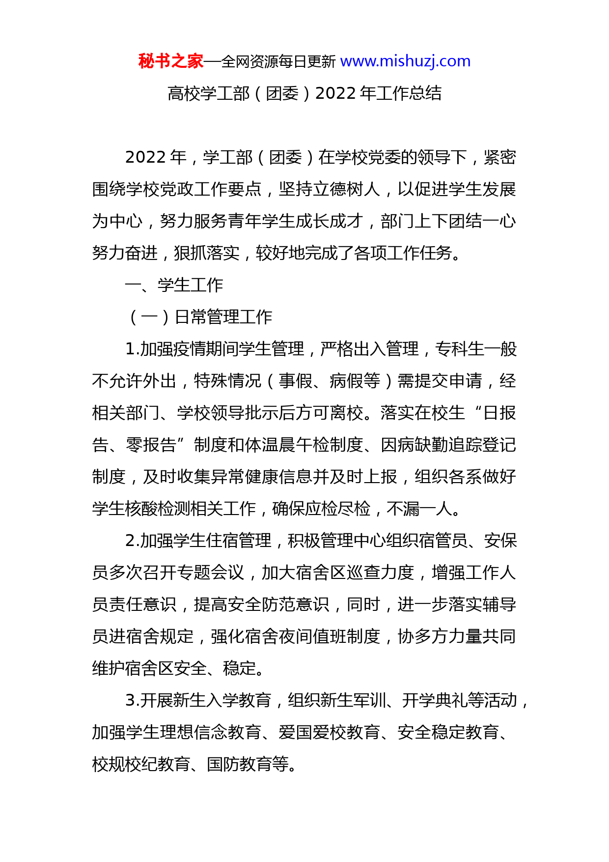 秘书之家—全网资源每日更新www.mishuzj.com高校学工部(团委)2022年工作总结2022年,学工部(团委)在学校党委的领导下,紧密围绕学校党政工作要点,坚持立德树人,以促进学生发展为中心,努力服务青年学生成长成才,部门上下团结一心努力奋进,狠抓落实,较好地完成了各项工作任务。一、学生工作(一)日常管理工作1.加强疫情期间学生管理,严格出入管理,专科生一般不允许外出,特殊情况(事假、病假等)需提交申请,经相关部门、学校领导批示后方可离校。落实在校生“日报告、零报告”制度和体温晨午检制度、因病缺勤追踪登记制度,及时收集异常健康信息并及时上报,组织各系做好学生核酸检测相关工作,确保应检尽检,不漏一人。2.加强学生住宿管理,积极管理中心组织宿管员、安保员多次召开专题会议,加大宿舍区巡查力度,增强工作人员责任意识,提高安全防范意识,同时,进一步落实辅导员进宿舍规定,强化宿舍夜间值班制度,协多方力量共同维护宿舍区安全、稳定。3.开展新生入学教育,组织新生军训、开学典礼等活动,加强学生理想信念教育、爱国爱校教育、安全稳定教育、校规校纪教育、国防教育等。秘书之家—全网资源每日更新www.mishuzj.com4.积极探索“网络新媒体+高校思想政治”工作新模式,扩展思政网络空间,学工部及团委微信公众号已覆盖全体在校生,其中,学工部微平台设立了“国奖人物”、迎新指南等板块,宣扬榜样力量,强化爱国教育、营造积极向上的校园氛围。团委微平台设立了团团快讯、青年之声等板块,立足宣传、发声的功能定位,着力提升网络舆论引导的影响力、引领力。5.提升全员育人意识,积极发挥班主任在学生教育管理中的作用,完成了2022级班主任选聘工作,优选出69名为人师表、爱岗敬业,热爱大学生思想政治教育工作的中青年骨干教师担任班主任。积极推动班主任工作室建设工作。6.加强学风建设,4月中下旬在全校范围内开展“正学风,齐奋进,促成长”知识竞赛活动,通过线上、线下相结合的比赛形式,丰富学生业余生活,扩大学生知识面,以赛促学,创造浓厚的学习氛围。开展了优良学风示范班评选工作。制定了优良学风师范班的申报和评选方案,按照创建实施细则和评选比例,最终全校评选出五星级示范班13个、四星级24个、三星级28个。(二)心理健康教育工作1.加强心理健康教育,继续为师生做好心理健康咨询与服务工作,心理健康服务中心及各辅导员现已完成学生咨秘书之家—全网资源每日更新www.mishuzj.com询400余人次,有针对性的开展了个性化心理咨询,防止学生心理危机事件的发生。2.开展心理健康教育活动,引导学生在疫情防控学校实行闭环管理期间关注自我、重视心理健康维护,组织开展了我校第16届心理健康教育月系列活动。活动期间,组织开展了“画解心情”心理绘画大赛、为“心”赋能团体心理辅导20余场。开展了“提升心理免疫力”心理健康教育主题班会、“小沙盘大世界”团体沙盘体验活动、以及“战役心故事”心理健康征文大赛、心理剧大赛等系列活动。3.利用网络、微信公众号等媒体,开展心理健康教育,在学工部微信公众号发布心理健康教育报道20篇;为引导同学们以积极心态面对疫情,心理健康服务中心为XX技术系全体在校学生线上开展了题为“守护心灵待疫散、不负韶华共奋进”的心理健康教育讲座,与学生们一同探讨封校期间应该如何进行自我心理调适;为促进新生尽快适应大学新生活,于9月26日晚上7:00通过腾讯会议平台在全校范围内开展新生心理适应专题讲座。4.建强预防干预体系,三月份、九月份对返校学生开展心理健康普查,在校生心理健康档案≥95%。为全面掌握2022级新生(含2022级专接本学生)心理健康状况,建立学生心理档案,于9月26日在全校范围内开展新生心理秘书之家—全网资源每日更新www.mishuzj.com健康筛查。为全面系统地掌握2022级新生的心理健康状况,进一步推进心理健康教育工作更好地开展,分批次对各系新生班辅导员开展新生心理测评说明会。充分发挥心理委员朋辈辅导作用,使各班心理委员进一步明确班级心理委员的工作内容,同时普及相关心理知识,以及如何去解决同学们的心理问题和面对不同心理隐患时应当采取的不同心理援助,开展心理委员系统培训3期。4月份组织全体在校班级心理委员观看“抗击疫情全国心理委员大讲堂”系列公益讲座;各班级心理委员分别组织召开了“共抗疫情调整心态,提升心理免疫力”“确立学习目标,提升学习效率”“疫情防控下的情绪管理”为主题的心理健康教育主题活动3次。(三)资助工作认真贯彻落实国家各项资助政策,做好资助政策宣传;规范资助对象认定程序,建立健全资助对象档案,积极开展资助文化品牌建设活动;坚持公平、公正、公开的工作原则,做好国家奖助学金的评定工作;积极拓展校内勤工助学岗位,通过“奖、贷、助、补、困”多元资助体系满足学生的基本经济保障需求,搭建涵盖物质帮助、道德浸润、能力拓展、精神激励的育人平台。1.完善资助工作体系(1)充分利用微信公众平台、宣传栏、宣传展板等线秘书之家—全网资源每日更新www.mishuzj.com上线下宣传途径,在新生开学前、新生入学报到现场、日常学生管理工作中广泛宣传各项学生资助政策,确保资助政策宣传解读全覆盖,构建广覆盖、高效率的资助信息