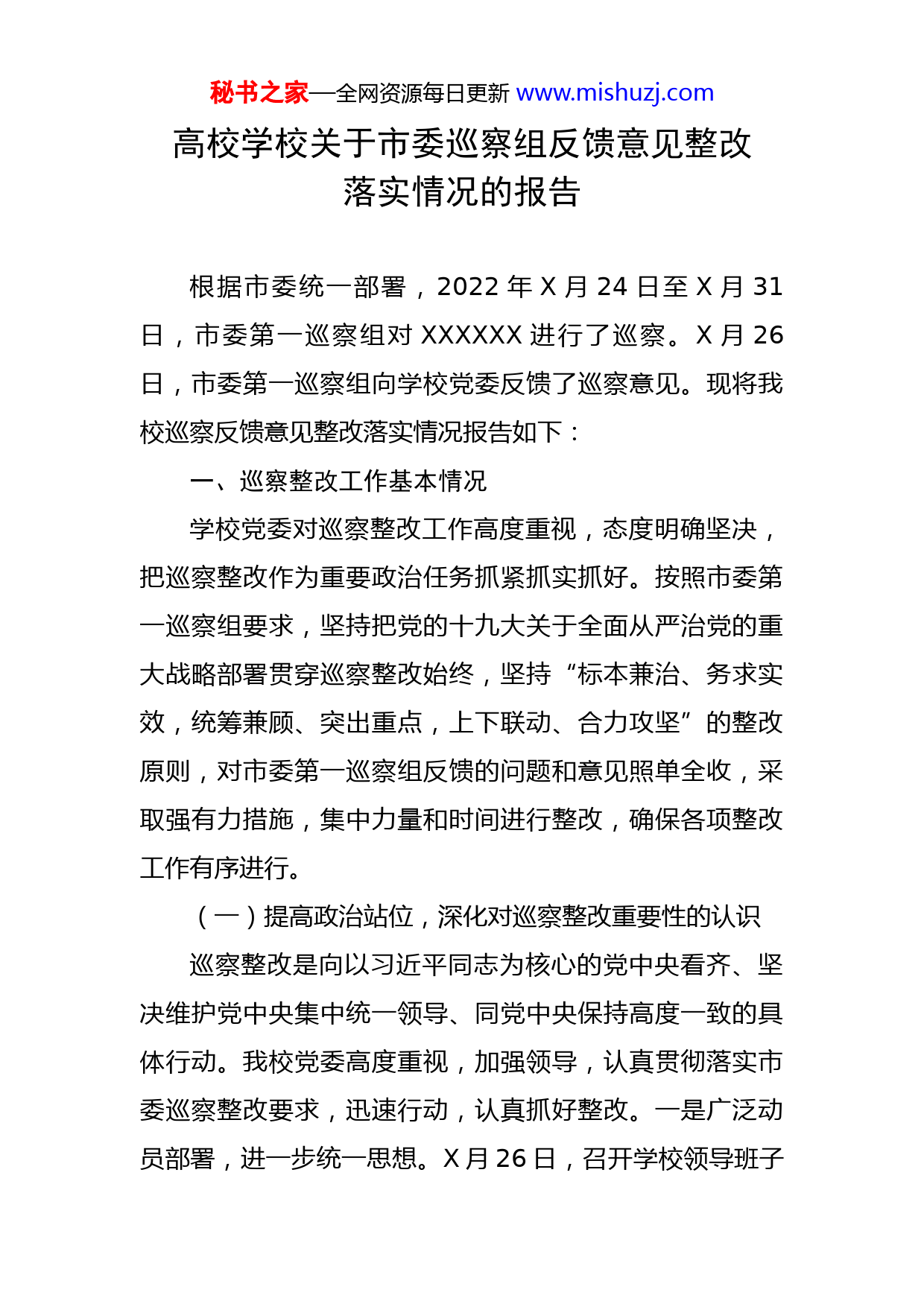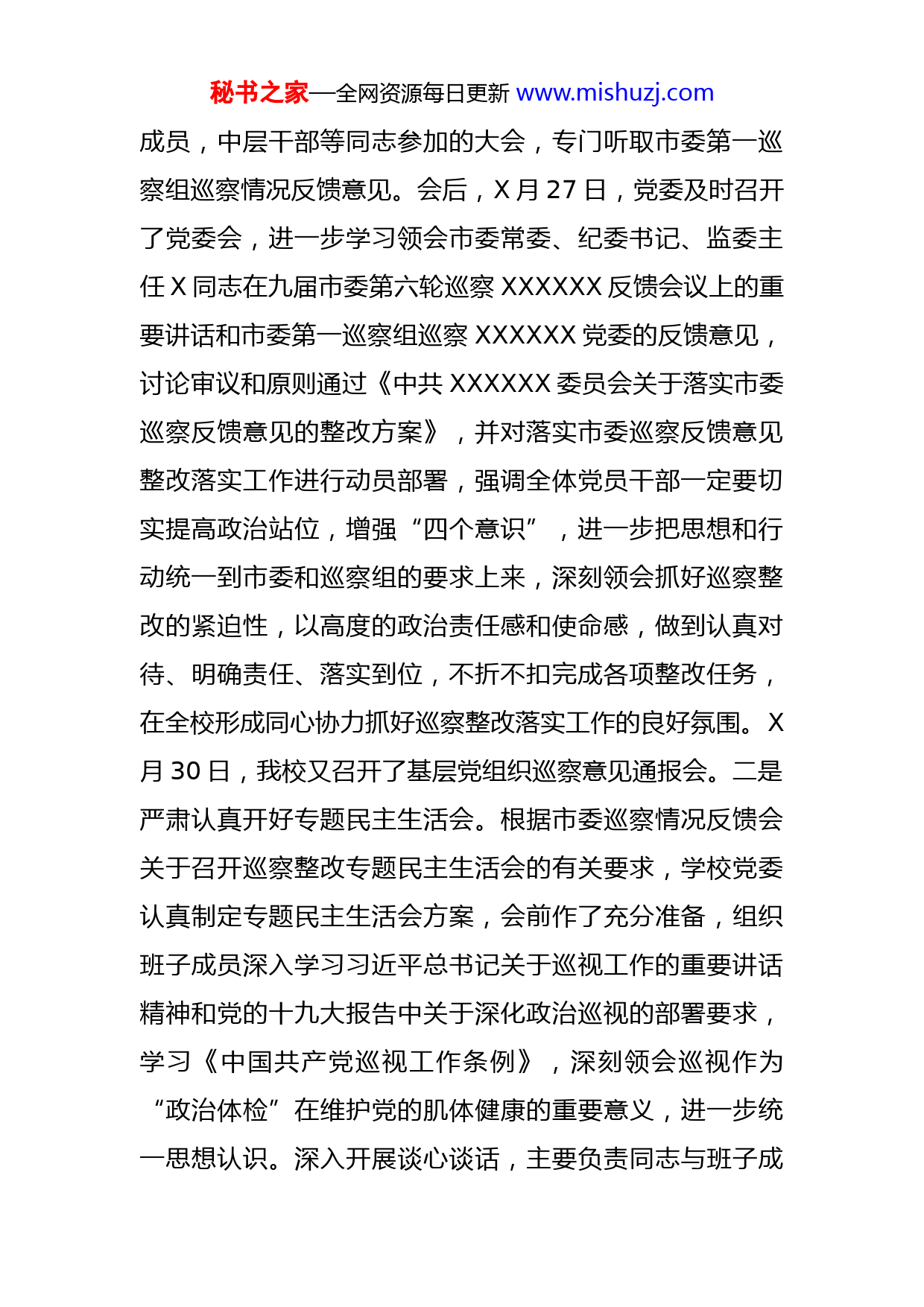 秘书之家—全网资源每日更新www.mishuzj.com高校学校关于市委巡察组反馈意见整改落实情况的报告根据市委统一部署,2022年X月24日至X月31日,市委第一巡察组对XXXXXX进行了巡察。X月26日,市委第一巡察组向学校党委反馈了巡察意见。现将我校巡察反馈意见整改落实情况报告如下:一、巡察整改工作基本情况学校党委对巡察整改工作高度重视,态度明确坚决,把巡察整改作为重要政治任务抓紧抓实抓好。按照市委第一巡察组要求,坚持把党的十九大关于全面从严治党的重大战略部署贯穿巡察整改始终,坚持“标本兼治、务求实效,统筹兼顾、突出重点,上下联动、合力攻坚”的整改原则,对市委第一巡察组反馈的问题和意见照单全收,采取强有力措施,集中力量和时间进行整改,确保各项整改工作有序进行。(一)提高政治站位,深化对巡察整改重要性的认识巡察整改是向以习近平同志为核心的党中央看齐、坚决维护党中央集中统一领导、同党中央保持高度一致的具体行动。我校党委高度重视,加强领导,认真贯彻落实市委巡察整改要求,迅速行动,认真抓好整改。一是广泛动员部署,进一步统一思想。X月26日,召开学校领导班子秘书之家—全网资源每日更新www.mishuzj.com成员,中层干部等同志参加的大会,专门听取市委第一巡察组巡察情况反馈意见。会后,X月27日,党委及时召开了党委会,进一步学习领会市委常委、纪委书记、监委主任X同志在九届市委第六轮巡察XXXXXX反馈会议上的重要讲话和市委第一巡察组巡察XXXXXX党委的反馈意见,讨论审议和原则通过《中共XXXXXX委员会关于落实市委巡察反馈意见的整改方案》,并对落实市委巡察反馈意见整改落实工作进行动员部署,强调全体党员干部一定要切实提高政治站位,增强“四个意识”,进一步把思想和行动统一到市委和巡察组的要求上来,深刻领会抓好巡察整改的紧迫性,以高度的政治责任感和使命感,做到认真对待、明确责任、落实到位,不折不扣完成各项整改任务,在全校形成同心协力抓好巡察整改落实工作的良好氛围。X月30日,我校又召开了基层党组织巡察意见通报会。二是严肃认真开好专题民主生活会。根据市委巡察情况反馈会关于召开巡察整改专题民主生活会的有关要求,学校党委认真制定专题民主生活会方案,会前作了充分准备,组织班子成员深入学习习近平总书记关于巡视工作的重要讲话精神和党的十九大报告中关于深化政治巡视的部署要求,学习《中国共产党巡视工作条例》,深刻领会巡视作为“政治体检”在维护党的肌体健康的重要意义,进一步统一思想认识。深入开展谈心谈话,主要负责同志与班子成秘书之家—全网资源每日更新www.mishuzj.com员,班子成员相互之间通过互相谈心谈话征求意见,交流思想,交换建议。X月9日,召开班子巡察整改专题民主生活会,班子和成员认真对照市委第一巡察组反馈的意见,结合思想和工作实际,进行深刻剖析,开展批评与自我批评,明确整改方向和整改措施。会上,党委书记刘健同志带头把自己摆进去,主动认领责任,同其他领导班子成员一道严肃认真开展批评和自我批评,打牢了深入整改的思想基础。(二)加强组织领导,有力有序有效推进巡察整改学校党委全面履行巡察整改主体责任,自始至终加强组织领导。一是健全领导机构、集中整改力量。成立学校巡察整改落实工作领导小组,由党委书记XX任组长,党委副书记、校长(时任)XX、党委副书记(时任)XX任副组长,成员由其他校领导班子成员组成。领导小组下设办公室,主要承担日常协调、督促、检查等事务性工作,并及时向学校巡察整改落实工作领导小组汇报工作进展情况。巡察整改期间,多次召开整改工作推进会,对巡察整改工作及时作出安排部署,定期听取整改进度汇报,研究整改措施,强力推动整改落实工作。二是制定整改方案、细化整改措施。对照市委巡察反馈的在贯彻落实党的路线方针政策和中央重大决策部署、贯彻落实全面从严治党战略部署、贯彻落实新时代党的组织路线以及巡视、巡察、审计秘书之家—全网资源每日更新www.mishuzj.com等监督发现问题和主题教育整改落实四个方面存在的主要问题,照单全收、认真梳理,将巡察反馈的4个方面29个突出问题及具体表现专题研究,认真“对号入座”,逐项分类汇总、逐项梳理归类,由领导班子成员分别牵头,组织相关责任部门认真制定整改措施,领导小组办公室汇总拟定《中共XXXXXX委员会落实市委巡察反馈意见的整改方案》报党委会反复讨论研究,并报送市委第一巡察组、市委巡察工作办公室审核后正式印发实施。工作方案明确了整改措施、责任领导、责任部门、责任人和整改时限,做到问题一项不漏、任务细化到岗、措施分解到位、责任落实到人。三是实行开门整改、销号管理。坚持开门搞整改,就整改工作方案和整改清单广泛征求各基层组织和部门的意见建议,主动向市委第一巡察组汇报整改落实情况,积极接受群众监督。实行整改销号制度,建立整改工作台账,实施动态管理,对难点问题一项一项盯紧抓实,一件一件对账销号,确保巡察反馈意见全部整改落到实处,取得实效。(三)层层压实责任,务求实效抓好推进落实学校党委全面承担落实整改的政治责任,不管是历史遗留问题还是现行问题,做到新老问题一起改。一是以上率下,形成合力。党委书记刘健同志作为整改