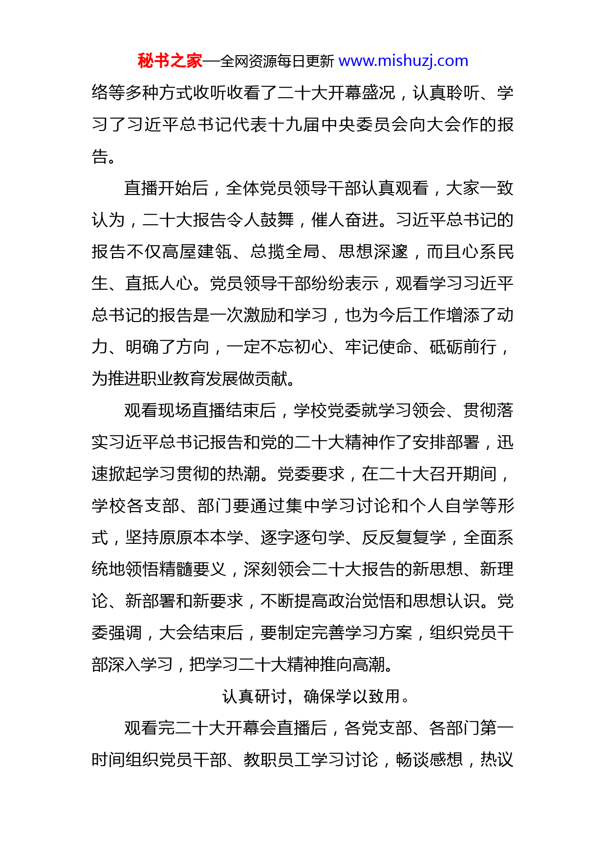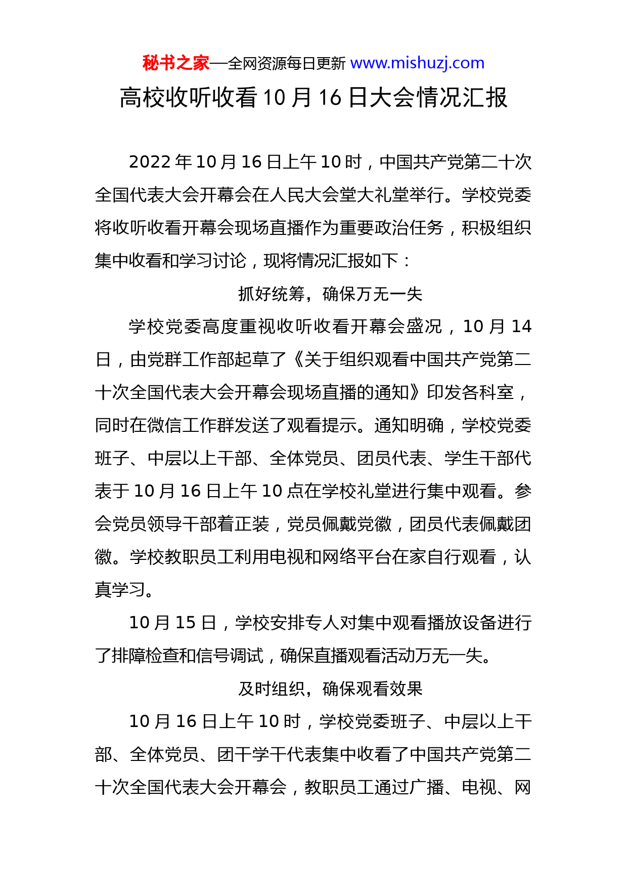 秘书之家—全网资源每日更新www.mishuzj.com高校收听收看10月16日大会情况汇报2022年10月16日上午10时,中国共产党第二十次全国代表大会开幕会在人民大会堂大礼堂举行。学校党委将收听收看开幕会现场直播作为重要政治任务,积极组织集中收看和学习讨论,现将情况汇报如下:抓好统筹,确保万无一失学校党委高度重视收听收看开幕会盛况,10月14日,由党群工作部起草了《关于组织观看中国共产党第二十次全国代表大会开幕会现场直播的通知》印发各科室,同时在微信工作群发送了观看提示。通知明确,学校党委班子、中层以上干部、全体党员、团员代表、学生干部代表于10月16日上午10点在学校礼堂进行集中观看。参会党员领导干部着正装,党员佩戴党徽,团员代表佩戴团徽。学校教职员工利用电视和网络平台在家自行观看,认真学习。10月15日,学校安排专人对集中观看播放设备进行了排障检查和信号调试,确保直播观看活动万无一失。及时组织,确保观看效果10月16日上午10时,学校党委班子、中层以上干部、全体党员、团干学干代表集中收看了中国共产党第二十次全国代表大会开幕会,教职员工通过广播、电视、网秘书之家—全网资源每日更新www.mishuzj.com络等多种方式收听收看了二十大开幕盛况,认真聆听、学习了习近平总书记代表十九届中央委员会向大会作的报告。直播开始后,全体党员领导干部认真观看,大家一致认为,二十大报告令人鼓舞,催人奋进。习近平总书记的报告不仅高屋建瓴、总揽全局、思想深邃,而且心系民生、直抵人心。党员领导干部纷纷表示,观看学习习近平总书记的报告是一次激励和学习,也为今后工作增添了动力、明确了方向,一定不忘初心、牢记使命、砥砺前行,为推进职业教育发展做贡献。观看现场直播结束后,学校党委就学习领会、贯彻落实习近平总书记报告和党的二十大精神作了安排部署,迅速掀起学习贯彻的热潮。党委要求,在二十大召开期间,学校各支部、部门要通过集中学习讨论和个人自学等形式,坚持原原本本学、逐字逐句学、反反复复学,全面系统地领悟精髓要义,深刻领会二十大报告的新思想、新理论、新部署和新要求,不断提高政治觉悟和思想认识。党委强调,大会结束后,要制定完善学习方案,组织党员干部深入学习,把学习二十大精神推向高潮。认真研讨,确保学以致用。观看完二十大开幕会直播后,各党支部、各部门第一时间组织党员干部、教职员工学习讨论,畅谈感想,热议秘书之家—全网资源每日更新www.mishuzj.com重点。学校党员干部、教职员工通过微信工作群、邮件及时分享了学习二十大报告的“微体会”。党员干部们纷纷表示,党的二十大报告继往开来、承前启后,反映了全党意志,体现了人民意愿,是夺取新时代中国特色社会主义伟大胜利的政治纲领和行动指南,要在自身岗位上勤勉工作、积极奉献,用自身的拼搏奋斗,向党的二十大献礼!学校xxx主任、民盟xx市委xxxx支部主委XX表示,民盟章程中把拥护中国共产党的执政地位作为立盟的重要基石,一代人有一代人的使命和担当,先贤们用青春和热血谋太平,吾辈必须坚定心中的一抹“中国红”,保持同中国共产党同心同德、团结奋斗的政治本色,积极出主意、想办法、做好事、做实事,切实担负起中国特色社会主义参政党的政治责任和时代使命,在新的历史征程中同心同向同行,汇识汇智汇力。“我为伟大的党、伟大的祖国感到自豪和骄傲,我将继续努力工作,报答党对我的培养,祝我们党青春永驻,祝祖国山河无恙,繁荣昌盛。”学校xxx支部党员xxx同志表示,将牢记党的光荣历史,恪守党的纪律,勇于担当,主动作为,做好本职工作,起到先锋带头作用,用实际行动践行使命和担当。青年团员代表xxx表示,新世纪祖国的建设离不开党的领导,也离不开青年一代的创造和奋斗,作为成长中的秘书之家—全网资源每日更新www.mishuzj.com新时代青年,将满怀对党感恩之心,不忘初心,牢记使命,把生命和青春奉献给党,努力成为开创未来的一代,以实际行动向党的二十大献礼。下一步,学校党委将通过座谈交流、专题辅导、演讲征文等丰富多样的形式认真组织党员干部开展深入学习党的二十大精神系列活动,引导党员干部、教职员工自觉运用习近平新时代中国特色社会主义思想武装自己,坚决捍卫“两个确立”、增强“四个意识”、坚定“四个自信”、做到两个维护,紧密联系教育教学实际,自觉用新时代中国特色社会主义思想武装头脑、指导实践、推动工作。学校将充分利用主题班会、思政课、文艺汇演、知识竞赛、书画竞赛等师生喜闻乐见的方式积极开展对青年学生学习贯彻二十大精神的宣传引导,保持学习热度,注重学习实效,持续营造浓厚的学习氛围。