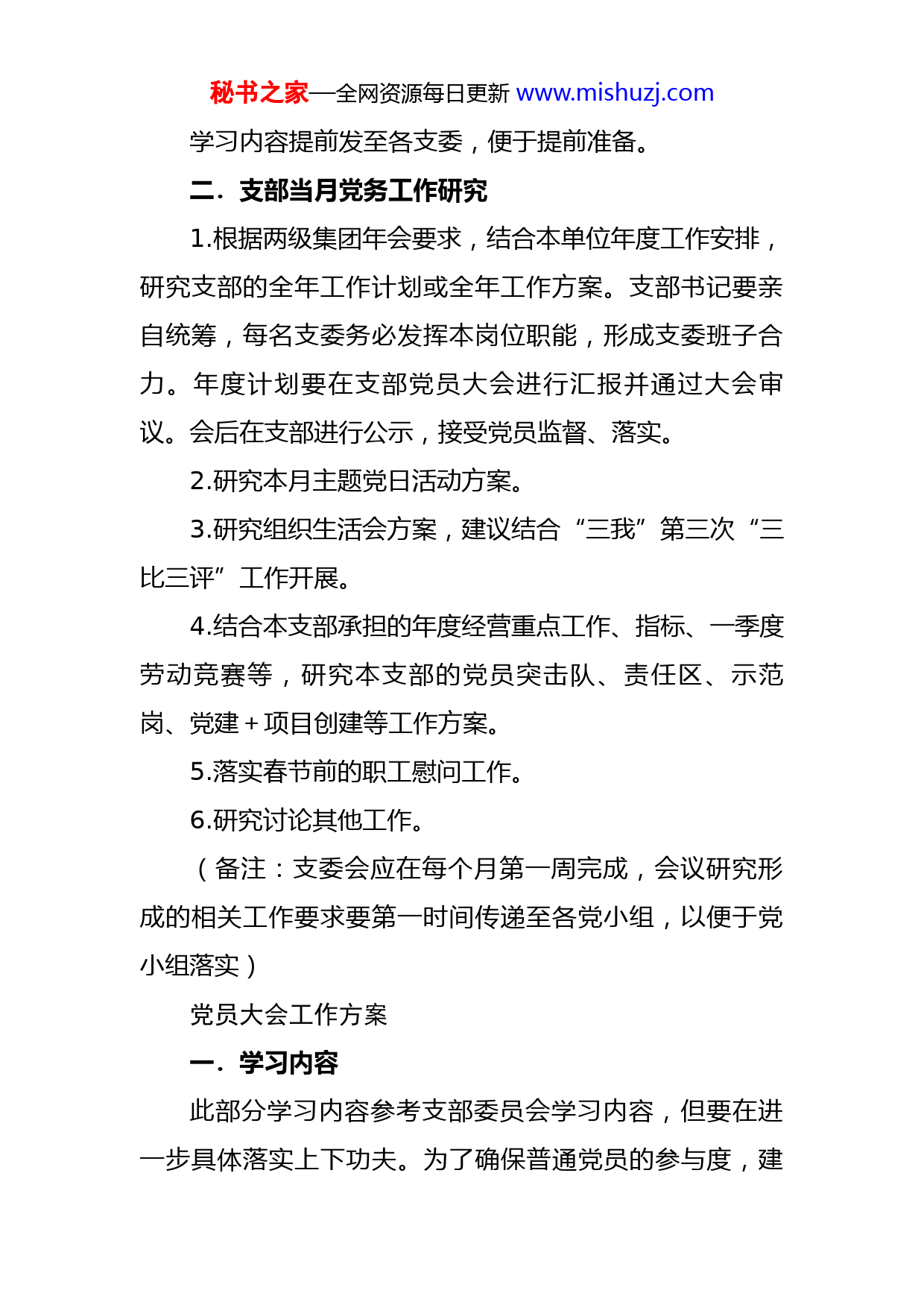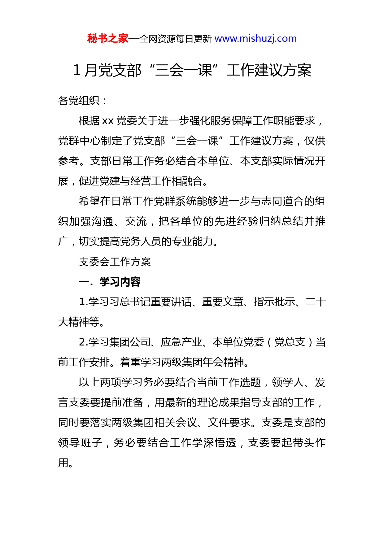 秘书之家—全网资源每日更新www.mishuzj.com1月党支部“三会一课”工作建议方案各党组织:根据xx党委关于进一步强化服务保障工作职能要求,党群中心制定了党支部“三会一课”工作建议方案,仅供参考。支部日常工作务必结合本单位、本支部实际情况开展,促进党建与经营工作相融合。希望在日常工作党群系统能够进一步与志同道合的组织加强沟通、交流,把各单位的先进经验归纳总结并推广,切实提高党务人员的专业能力。支委会工作方案一.学习内容1.学习习总书记重要讲话、重要文章、指示批示、二十大精神等。2.学习集团公司、应急产业、本单位党委(党总支)当前工作安排。着重学习两级集团年会精神。以上两项学习务必要结合当前工作选题,领学人、发言支委要提前准备,用最新的理论成果指导支部的工作,同时要落实两级集团相关会议、文件要求。支委是支部的领导班子,务必要结合工作学深悟透,支委要起带头作用。秘书之家—全网资源每日更新www.mishuzj.com学习内容提前发至各支委,便于提前准备。二.支部当月党务工作研究1.根据两级集团年会要求,结合本单位年度工作安排,研究支部的全年工作计划或全年工作方案。支部书记要亲自统筹,每名支委务必发挥本岗位职能,形成支委班子合力。年度计划要在支部党员大会进行汇报并通过大会审议。会后在支部进行公示,接受党员监督、落实。2.研究本月主题党日活动方案。3.研究组织生活会方案,建议结合“三我”第三次“三比三评”工作开展。4.结合本支部承担的年度经营重点工作、指标、一季度劳动竞赛等,研究本支部的党员突击队、责任区、示范岗、党建+项目创建等工作方案。5.落实春节前的职工慰问工作。6.研究讨论其他工作。(备注:支委会应在每个月第一周完成,会议研究形成的相关工作要求要第一时间传递至各党小组,以便于党小组落实)党员大会工作方案一.学习内容此部分学习内容参考支部委员会学习内容,但要在进一步具体落实上下功夫。为了确保普通党员的参与度,建秘书之家—全网资源每日更新www.mishuzj.com议每次选取3-5名党员结合学习与本职工作谈个人认识、体会,同时要谈落实工作的措施,措施要具有可执行性,定量为主,避免学习与指导实践工作空对空。学习内容提前发至各党员,建议以会前自学为主,发言的党员提前准备要充分。形成党员责任明确、压力传导的工作氛围。二.审议内容1.审议支部2023年度工作计划或方案。2.审议支部年度发展计划、入党积极分子发展计划。3.其他审议内容。三.其他内容1.组织年度组织生活会。2.公布支部党员突击队、责任区、示范岗、党建+项目创建等具体内容。(备注,换个角度理解“主题党日”,主题党日是落实支部规定工作内容的“某个时间点”,这个时间点是便于集中开展党支部、党小组的日常工作,在这个时间点上可以开展多种工作)党小组会方案党小组是党组织最小单元,也是具体工作执行单元,以贯彻落实为主。一.学习内容秘书之家—全网资源每日更新www.mishuzj.com落实支委会确定的当月学习计划。二.研究制定阶段工作1.制定党小组年度工作计划,建议以清单体制定,简明扼要,以量化可执行为主。2.制定具体党业融合措施以党支部支委会确定的党员突击队、责任区、示范岗、党建+项目创建等具体项目为准,制定具体的落实内容。三.其他工作1.协助支部落实春节前职工慰问工作。2.通过工作群、班前班后会等平台分享学习材料、先进经验、工作体会、劳动技能提升培训等内容。(备注:换个角度理解党小组工作,普通党员每个月至少要通过党小组会议参加党组织活动,这也是在时间和活动载体上对普通党员参加组织生活的一种最底限制度保障。)一月党课建议方案一.党课主题结合两级集团年会精神、一季度开门红要求等工作,以形势任务教育宣讲为主,讲清楚两级集团以及本单位当前形势,坚定广大干部职工发展的信心,确保实现首季开门红。秘书之家—全网资源每日更新www.mishuzj.com二.讲课方式本单位党员领导到联系点讲党课,建议增加党员互动环节。