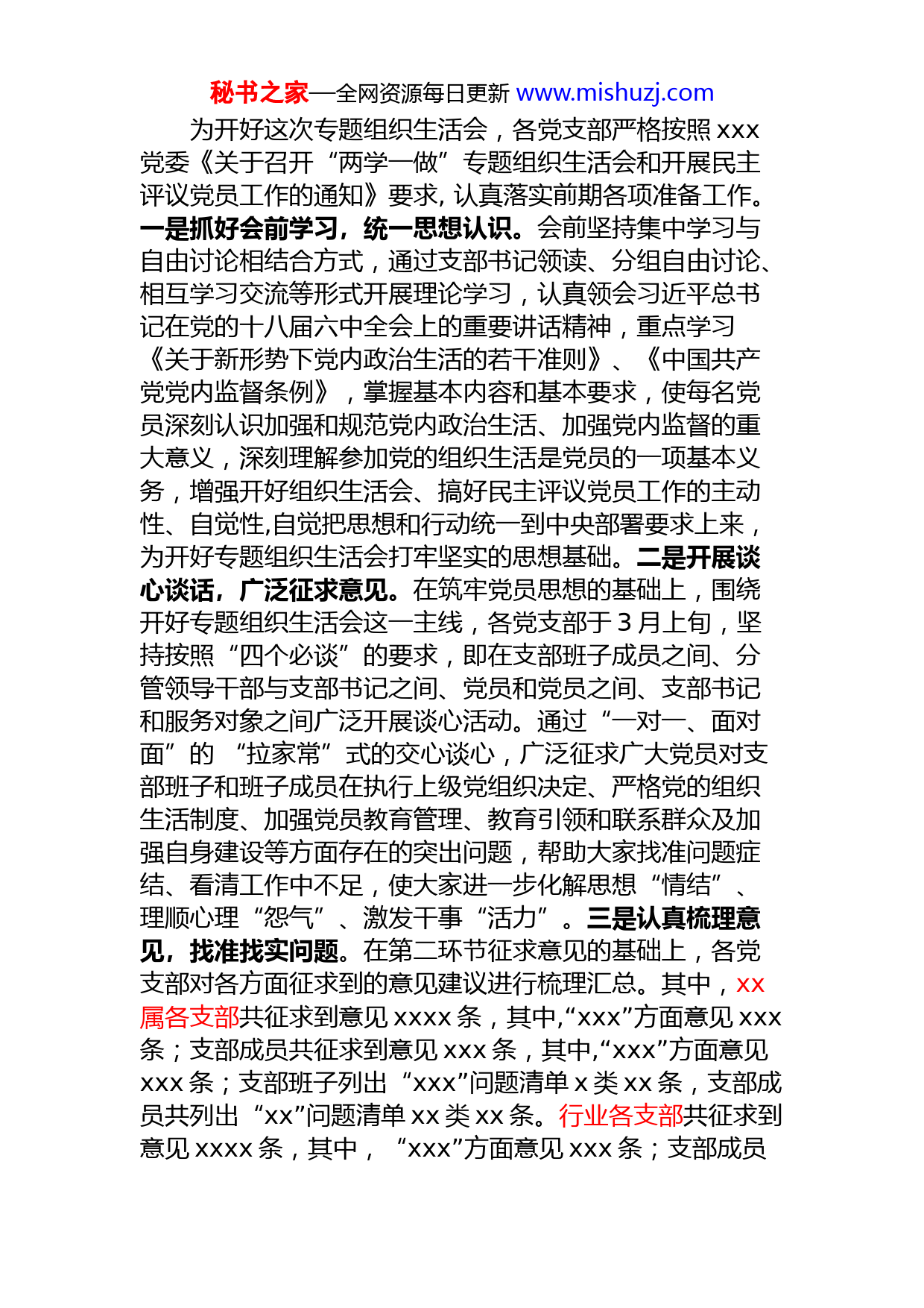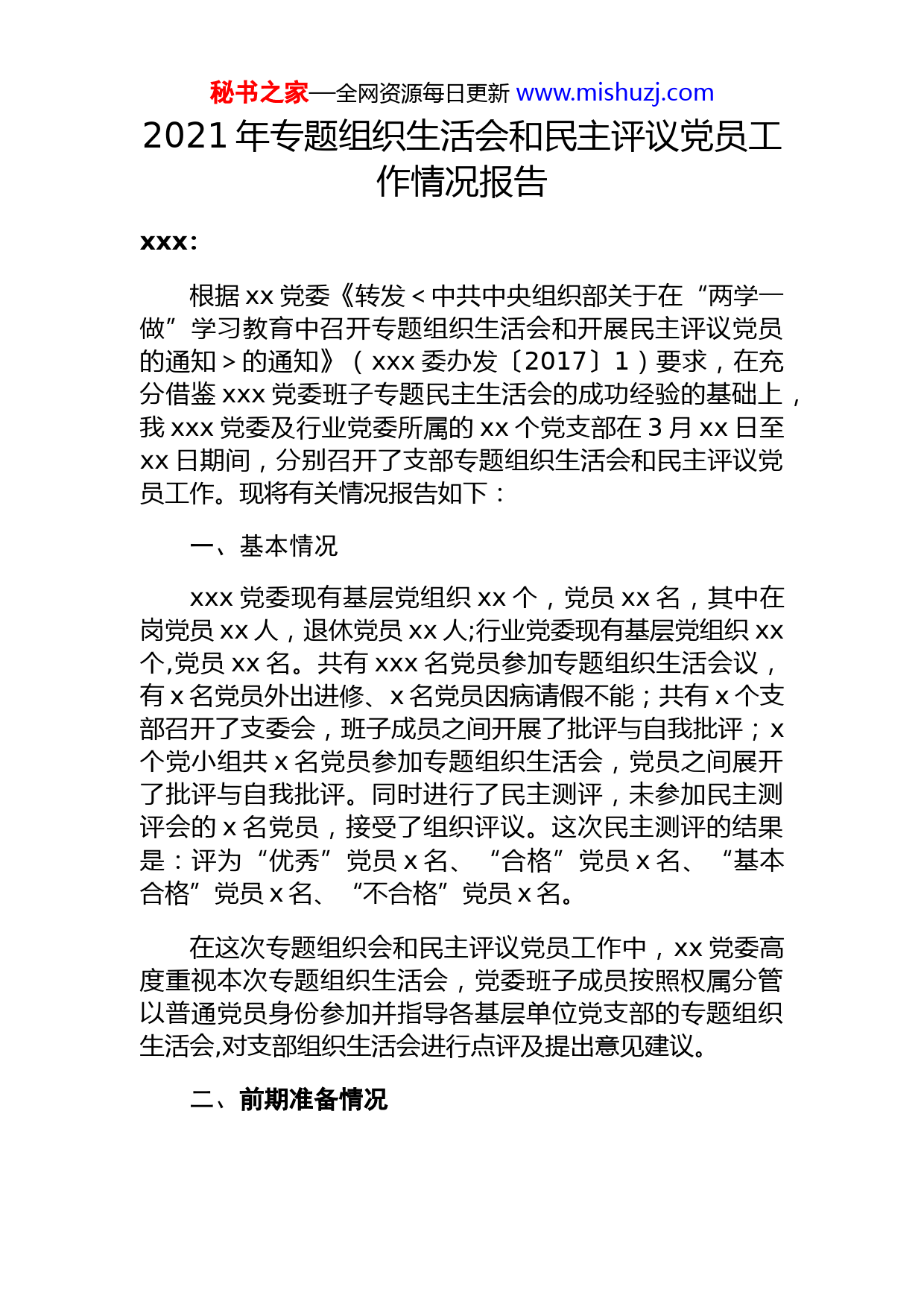 秘书之家—全网资源每日更新www.mishuzj.com2021年专题组织生活会和民主评议党员工作情况报告xxx:根据xx党委《转发<中共中央组织部关于在“两学一做”学习教育中召开专题组织生活会和开展民主评议党员的通知>的通知》(xxx委办发〔2017〕1)要求,在充分借鉴xxx党委班子专题民主生活会的成功经验的基础上,我xxx党委及行业党委所属的xx个党支部在3月xx日至xx日期间,分别召开了支部专题组织生活会和民主评议党员工作。现将有关情况报告如下:一、基本情况xxx党委现有基层党组织xx个,党员xx名,其中在岗党员xx人,退休党员xx人;行业党委现有基层党组织xx个,党员xx名。共有xxx名党员参加专题组织生活会议,有x名党员外出进修、x名党员因病请假不能;共有x个支部召开了支委会,班子成员之间开展了批评与自我批评;x个党小组共x名党员参加专题组织生活会,党员之间展开了批评与自我批评。同时进行了民主测评,未参加民主测评会的x名党员,接受了组织评议。这次民主测评的结果是:评为“优秀”党员x名、“合格”党员x名、“基本合格”党员x名、“不合格”党员x名。在这次专题组织会和民主评议党员工作中,xx党委高度重视本次专题组织生活会,党委班子成员按照权属分管以普通党员身份参加并指导各基层单位党支部的专题组织生活会,对支部组织生活会进行点评及提出意见建议。二、前期准备情况秘书之家—全网资源每日更新www.mishuzj.com为开好这次专题组织生活会,各党支部严格按照xxx党委《关于召开“两学一做”专题组织生活会和开展民主评议党员工作的通知》要求,认真落实前期各项准备工作。一是抓好会前学习,统一思想认识。会前坚持集中学习与自由讨论相结合方式,通过支部书记领读、分组自由讨论、相互学习交流等形式开展理论学习,认真领会习近平总书记在党的十八届六中全会上的重要讲话精神,重点学习《关于新形势下党内政治生活的若干准则》、《中国共产党党内监督条例》,掌握基本内容和基本要求,使每名党员深刻认识加强和规范党内政治生活、加强党内监督的重大意义,深刻理解参加党的组织生活是党员的一项基本义务,增强开好组织生活会、搞好民主评议党员工作的主动性、自觉性,自觉把思想和行动统一到中央部署要求上来,为开好专题组织生活会打牢坚实的思想基础。二是开展谈心谈话,广泛征求意见。在筑牢党员思想的基础上,围绕开好专题组织生活会这一主线,各党支部于3月上旬,坚持按照“四个必谈”的要求,即在支部班子成员之间、分管领导干部与支部书记之间、党员和党员之间、支部书记和服务对象之间广泛开展谈心活动。通过“一对一、面对面”的“拉家常”式的交心谈心,广泛征求广大党员对支部班子和班子成员在执行上级党组织决定、严格党的组织生活制度、加强党员教育管理、教育引领和联系群众及加强自身建设等方面存在的突出问题,帮助大家找准问题症结、看清工作中不足,使大家进一步化解思想“情结”、理顺心理“怨气”、激发干事“活力”。三是认真梳理意见,找准找实问题。在第二环节征求意见的基础上,各党支部对各方面征求到的意见建议进行梳理汇总。其中,xx属各支部共征求到意见xxxx条,其中,“xxx”方面意见xxx条;支部成员共征求到意见xxx条,其中,“xxx”方面意见xxx条;支部班子列出“xxx”问题清单x类xx条,支部成员共列出“xx”问题清单xx类xx条。行业各支部共征求到意见xxxx条,其中,“xxx”方面意见xxx条;支部成员秘书之家—全网资源每日更新www.mishuzj.com共征求到意见xxx条,其中,“xxx”方面意见xxx条;支部班子列出“xxx”问题清单x类xx条,支部成员共列出“xx”问题清单xx类xx条。对照梳理汇总情况,各支部书记认真查摆自身存在的问题,召开支部会议集体把脉会诊,一项一项讨论分析,找准找实存在的突出问题,重点对是否存在理想信念模糊动摇、大是大非问题上态度不鲜明、组织观念淡薄、道德品行失范、不履职尽责、不担当作为等问题进行了查找分析。四是撰写检查材料,深刻剖析根源。各支部党员以“四讲四有”为标尺,对照征求意见和谈心情况,结合思想和工作实际,深入查找自身在政治合格、执行纪律严格、品德合格、发挥作用合格等方面存在的主要问题、产生问题的原因分析、改进措施及努力方向,从严从实撰写个人对照检查材料。三、专题组织生活会召开情况3月xx日至xx日,xxx属及行业各党支部分别召开了专题组织生活会。xx党委书记、xx长xx到会指导了xx属xx个党支部及行业非公xx个党支部;xx党委委员、副xxx长xxx到会指导了xx属xx个党支部及行业非公xx个党支部;xx党委委员、副xx长xxx到会指导了xx属xx个党支部及行业非公xx个党支部;xx党委委员、副xx长xx到会指导了xx属xx个党支部及行业非公xx个党支部。各支部组织生活会共完成了五项议程:一是由由支部书记代表党支部作对照检查,党员对支部班子提出意见建议;二是支部班子其他成员分别作对照检查、开展批评和自我批评;三是党支部书记结合党员开展批评和自我批评情况对每名党员进行讲评;四是与会负责指导的xx党委班子成员对会议情况做点评;五是支部书记根据与会领导点评情况和党员提出的意见建议作表态发言。会议自始至终贯穿认真和整风精神,既有红脸出汗的紧张严肃,又有加油鼓劲的宽松和谐,达到了
