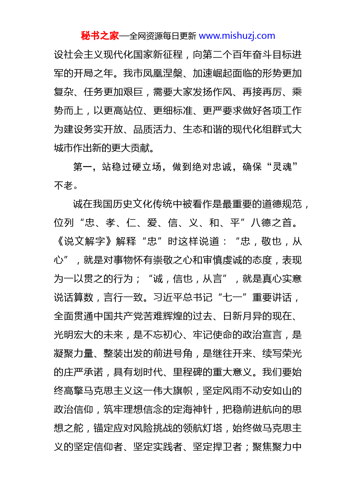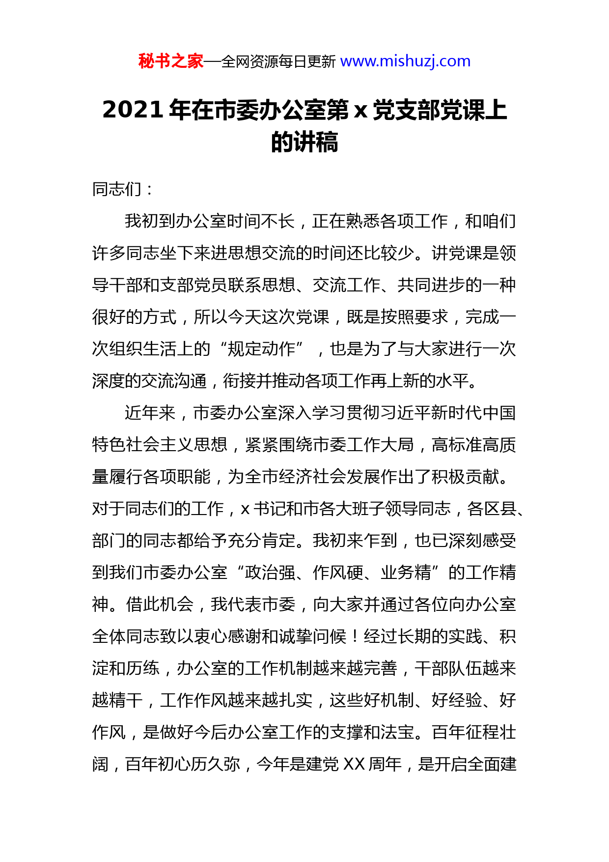 秘书之家—全网资源每日更新www.mishuzj.com2021年在市委办公室第x党支部党课上的讲稿同志们:我初到办公室时间不长,正在熟悉各项工作,和咱们许多同志坐下来进思想交流的时间还比较少。讲党课是领导干部和支部党员联系思想、交流工作、共同进步的一种很好的方式,所以今天这次党课,既是按照要求,完成一次组织生活上的“规定动作”,也是为了与大家进行一次深度的交流沟通,衔接并推动各项工作再上新的水平。近年来,市委办公室深入学习贯彻习近平新时代中国特色社会主义思想,紧紧围绕市委工作大局,高标准高质量履行各项职能,为全市经济社会发展作出了积极贡献。对于同志们的工作,x书记和市各大班子领导同志,各区县、部门的同志都给予充分肯定。我初来乍到,也已深刻感受到我们市委办公室“政治强、作风硬、业务精”的工作精神。借此机会,我代表市委,向大家并通过各位向办公室全体同志致以衷心感谢和诚挚问候!经过长期的实践、积淀和历练,办公室的工作机制越来越完善,干部队伍越来越精干,工作作风越来越扎实,这些好机制、好经验、好作风,是做好今后办公室工作的支撑和法宝。百年征程壮阔,百年初心历久弥,今年是建党XX周年,是开启全面建秘书之家—全网资源每日更新www.mishuzj.com设社会主义现代化国家新征程,向第二个百年奋斗目标进军的开局之年。我市凤凰涅槃、加速崛起面临的形势更加复杂、任务更加艰巨,需要大家发扬作风、再接再厉、乘势而上,以更高站位、更细标准、更严要求做好各项工作为建设务实开放、品质活力、生态和谐的现代化组群式大城市作出新的更大贡献。第一,站稳过硬立场,做到绝对忠诚,确保“灵魂”不老。诚在我国历史文化传统中被看作是最重要的道德规范,位列“忠、孝、仁、爱、信、义、和、平”八德之首。《说文解字》解释“忠”时这样说道:“忠,敬也,从心”,就是对事物怀有崇敬之心和审慎虔诚的态度,表现为一以贯之的行为;“诚,信也,从言”,就是真心实意说话算数,言行一致。习近平总书记“七一”重要讲话,全面贯通中国共产党苦难辉煌的过去、日新月异的现在、光明宏大的未来,是不忘初心、牢记使命的政治宣言,是凝聚力量、整装出发的前进号角,是继往开来、续写荣光的庄严承诺,具有划时代、里程碑的重大意义。我们要始终高擎马克思主义这一伟大旗帜,坚定风雨不动安如山的政治信仰,筑牢理想信念的定海神针,把稳前进航向的思想之舵,锚定应对风险挑战的领航灯塔,始终做马克思主义的坚定信仰者、坚定实践者、坚定捍卫者;聚焦聚力中秘书之家—全网资源每日更新www.mishuzj.com华民族伟大复兴这一恢弘主题,发扬旗帜鲜明讲政治的优良传统,始终坚持党的领导,坚定做到“两个维护”,坚决维护核心、跟随核心、捍卫核心,让讲政治、讲忠诚成为鲜明底色;紧紧围绕伟大建党精神这一鲜明主线,赓续红色基因守护精神之源,推动弘扬伟大建党精神走心、走实、走深,始终保持饱满昂扬的精神状态,以一往无前、永不懈怠的姿态奋力奔跑。党办为党委服务最直接,联系各方面最广泛,保障党委工作最关键,在各机构运转中最核心,对党办同志来讲,仅有一般性的忠诚是不够的,必须做到绝对忠诚。习近平总书记指出,“对党绝对忠诚是中办的生命线,是做好中办工作的根本点”,“要把绝对忠诚作为做好中办工作的首要政治原则,作为中办队伍的首要政治本色,作为中办干部的首要政治品质”。习近平总书记高屋建瓴地提出“生命线”“根本点”并一连用了三个“首要”,强调绝对忠诚的极端重要性,把绝对忠诚提到了前所未有的高度。“绝对”一词重千钧,绝对忠诚是忠诚的最高境界,是全心全意的忠诚,是言行一致的忠诚,是始终如一的忠诚,是无怨无悔的忠诚。立场坚定、对党忠诚体现在哪里?不是口头上,也不是书面上,关键是体现在工作上、学习上。比如,习总书记特别强调讲政治、讲规矩,你是否领会了讲政治的内涵是什么,中央、省里决策部署,我们是否真正领会、贯彻秘书之家—全网资源每日更新www.mishuzj.com到我们的工作岗位上,这就是忠诚的表现。比如,对经手的会议、文件、报告,所安排的一切事项,是否做到坚决落实,这也是讲政治的体现。要学好习总书记的讲话,习总书记的讲话真学明白了、学到位了,就容易做到忠诚,容易政治站位站得高、站得远。我们要有规矩意识,在中国除了上有法,下有德,中间还有规矩。法律你不能违反道德是个行为底线,规矩是约定俗成的。比如,推动高质量发展,完整、准确、全面贯彻新发展理念,建设高能级城市,聚焦打造多彩活力的青年创业友好型城市、全域公园城市、区域性科创产业金融高地等战略构想,优化布局完善功能、创新业态,不断推出营商环境“升级版”,持续增强核心竞争力等,这些都是全市的工作大局,我们的各项工作有没有紧紧围绕这些大局来思考谋划?第二,锤炼过硬肩膀,做到敢打善成,提升“核心”力量。作为市委的综合性办事机构,办公室既是服务市委决策的“参谋部”、社情民意的“信息部”、工作落实的“督查部”,又是联络沟通的“统筹部”、服务保障的“后勤部”、行政接待的“礼宾部”,几乎涵盖了全市各个领域,既有关系国计民生的大事,也有油盐酱醋的小事虽不直接抓经济,但却服务经济、促进整体