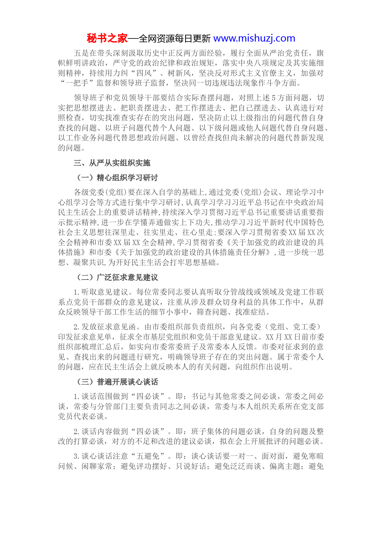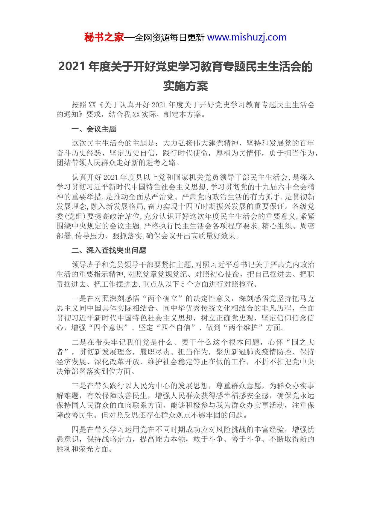 秘书之家—全网资源每日更新www.mishuzj.com2021年度关于开好党史学习教育专题民主生活会的实施方案按照XX《关于认真开好2021年度关于开好党史学习教育专题民主生活会的通知》要求,结合我XX实际,制定本方案。一、会议主题这次民主生活会的主题是:大力弘扬伟大建党精神,坚持和发展党的百年奋斗历史经验,坚定历史自信,践行时代使命,厚植为民情怀,勇于担当作为,团结带领人民群众走好新的赶考之路。认真开好2021年度县以上党和国家机关党员领导干部民主生活会,是深入学习贯彻习近平新时代中国特色社会主义思想,学习贯彻党的十九届六中全会精神的重要举措,是推动全面从严治党、严肃党内政治生活的有力抓手,是贯彻新发展理念,融入新发展格局,奋力实现十四五时期振兴发展的重要保证。各级党委(党组)要提高政治站位,充分认识开好这次年度民主生活会的重要意义,紧紧围绕中央规定的会议主题,严格执行民主生活会各项程序要求,精心组织、周密部署,传导压力、狠抓落实,确保会议开出高质量好效果。二、深入查找突出问题领导班子和党员领导干部要紧扣主题,对照习近平总书记关于严肃党内政治生活的重要指示精神,对照党章党规党纪、对照初心使命,把自己摆进去、把职责摆进去、把工作摆进去,重点从以下5个方面进行对照检查。一是在对照深刻感悟“两个确立”的决定性意义,深刻感悟党坚持把马克思主义同中国具体实际相结合、同中华优秀传统文化相结合的非凡历程,全面贯彻习近平新时代中国特色社会主义思想,树立正确党史观,坚定信仰信念信心,增强“四个意识”、坚定“四个自信”、做到“两个维护”方面。二是在带头牢记我们党是什么、要干什么这个根本问题,心怀“国之大者”,贯彻新发展理念,履职尽责、担当作为,聚焦新冠肺炎疫情防控、保持经济发展、深化改革开放、维护社会稳定等正在做的工作,不折不扣把党中央决策部署落实到位方面。三是在带头践行以人民为中心的发展思想,尊重群众意愿,为群众办实事解难题,有效保障改善民生,增强人民群众获得感幸福感安全感,确保党永远保持同人民群众的血肉联系方面。能够积极参与我为群众办实事活动,注重保障改善民生。但对照反思还存在群众观点不够牢固的问题。四是在带头学习运用党在不同时期成功应对风险挑战的丰富经验,增强忧患意识,保持战略定力,提高能力本领,敢于斗争、善于斗争、不断取得新的胜利和荣光方面。秘书之家—全网资源每日更新www.mishuzj.com五是在带头深刻汲取历史中正反两方面经验,履行全面从严治党责任,旗帜鲜明讲政治,严守党的政治纪律和政治规矩,落实中央八项规定及其实施细则精神,持续用力纠“四风”、树新风,坚决反对形式主义官僚主义,加强对“一把手”监督和领导班子监督,坚决同一切违规违法现象作斗争方面。领导班子和党员领导干部要结合实际查摆问题,对照上述5方面问题,切实把思想摆进去、把职责摆进去、把工作摆进去、把自己摆进去、认真进行对照检查,切实找准查实存在的突出问题,坚决防止以上级指出的问题代替自身查找的问题、以班子问题代替个人问题、以下级问题或他人问题代替自身问题、以工作业务问题代替思想政治问题、以曾经查找但尚未解决的问题代替新发现的问题。三、从严从实组织实施(一)精心组织学习研讨各级党委(党组)要在深入自学的基础上,通过党委(党组)会议、理论学习中心组学习会等方式进行集中学习研讨,认真学习学习习近平总书记在中央政治局民主生活会上的重要讲话精神,持续深入学习贯彻习近平总书记重要讲话重要指示批示精神,进一步在学懂弄通做实上下功夫,推动学习习近平新时代中国特色社会主义思想往深里走、往实里走、往心里走;要深入学习贯彻省委XX届XX次全会精神和市委XX届XX全会精神,学习贯彻省委《关于加强党的政治建设的具体措施》和市委《关于加强党的政治建设的具体措施责任分解》,进一步统一思想、凝聚共识,为开好民主生活会打牢思想基础。(二)广泛征求意见建议1.听取意见建议。每位常委同志要认真听取分管战线或领域及党建工作联系点党员干部群众的意见建议,注重从涉及群众切身利益的具体工作中,从群众反映领导干部工作生活的细节小事中,筛查问题、找准症结。2.发放征求意见函。由市委组织部负责组织,向各党委(党组、党工委)印发征求意见单,征求全市基层党组织和党员干部意见建议。XX月XX日前市委组织部梳理汇总后,如实向市委常委班子及常委本人反馈。市委对征求到的意见、查找出来的问题进行研究,明确领导班子存在的突出问题。属于常委个人的问题,应在民主生活会上就反映本人的有关问题,向组织作出说明。(三)普遍开展谈心谈话1.谈话范围做到“四必谈”。即:书记与其他常委之间必谈,常委之间必谈,常委与分管部门主要负责同志之间必谈,常委与本人组织关系所在党支部党员代表必谈。2.谈话内容做到“四必谈”。即:班子集体的问题必谈,自身的问题及整改的打算必谈,对方的不足和改进的建议必谈,拟在会上开展批评的问题必谈。3.谈心谈话注意“五避免”。即:谈心谈话要一对一、面对面,避免寒暄问候、闲聊家常;避免评功摆好、只说好话;避免泛泛而谈、偏离主题;避免秘书之家—全网资源每日更新ww