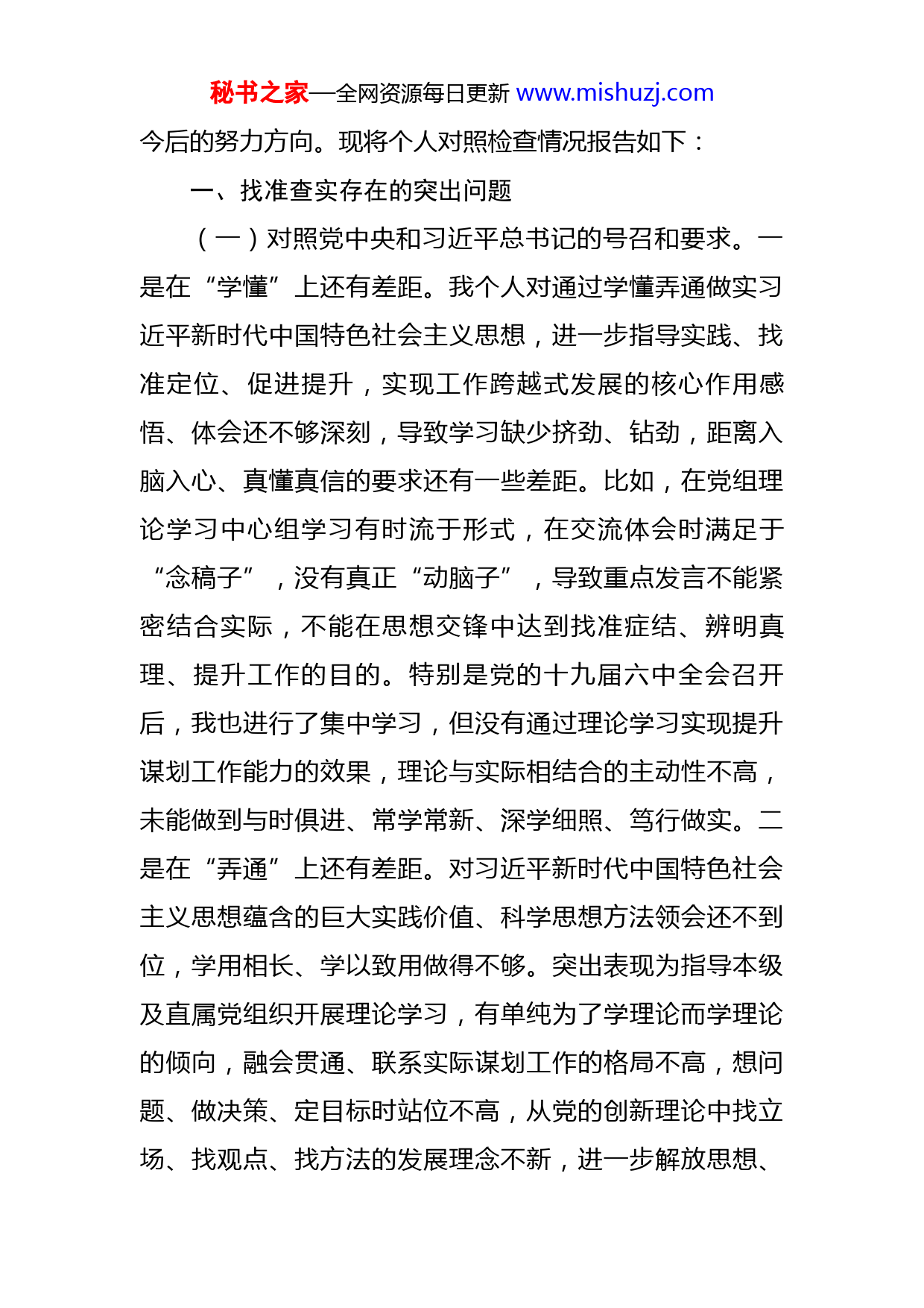 秘书之家—全网资源每日更新www.mishuzj.com2021年度市体育局四个对照组织生活会个人对照检查材料按照局市委《中共市委组织部关于转发<中共中央组织部关于召开2021年度基层党组织组织生活会和民主评议党员的通知>的通知》(明电[2021]号)要求,我积极参加集体学习,并强化个人自学,系统学习习近平总书记“七一”重要讲话及总书记来XX考察重要讲话重要指示精神,学习党的十九届六中全会精神特别是《中共中央关于党的百年奋斗重大成就和历史经验的决议》、党章和《中国共产党组织工作条例》《中国共产党党支部工作条例(试行)》等文件法规,深刻把握和领会党的百年奋斗的重大成就、历史意义、历史经验,深化对新时代党的创新理论的理解和掌握。通过学习,提高了政治站位,打牢了本次专题组织生活会的思想基础。根据支部安排,和党员进行了谈心谈话,,深刻领会和把握讲话的重大意义、丰富内涵、核心要义、实践要求,切实把思想和行动统一到讲话精神上来,切实打牢开好组织生活会的思想基础。在此基础上,紧紧围绕这次组织生活会主题,深入开展谈心谈话,广泛征求意见建议,从严从实盘点和检视自身存在的突出问题,结合工作实际,对照4个方面的具体表现,我深刻查摆了自身的不足、深入剖析了原因,明确了秘书之家—全网资源每日更新www.mishuzj.com今后的努力方向。现将个人对照检查情况报告如下:一、找准查实存在的突出问题(一)对照党中央和习近平总书记的号召和要求。一是在“学懂”上还有差距。我个人对通过学懂弄通做实习近平新时代中国特色社会主义思想,进一步指导实践、找准定位、促进提升,实现工作跨越式发展的核心作用感悟、体会还不够深刻,导致学习缺少挤劲、钻劲,距离入脑入心、真懂真信的要求还有一些差距。比如,在党组理论学习中心组学习有时流于形式,在交流体会时满足于“念稿子”,没有真正“动脑子”,导致重点发言不能紧密结合实际,不能在思想交锋中达到找准症结、辨明真理、提升工作的目的。特别是党的十九届六中全会召开后,我也进行了集中学习,但没有通过理论学习实现提升谋划工作能力的效果,理论与实际相结合的主动性不高,未能做到与时俱进、常学常新、深学细照、笃行做实。二是在“弄通”上还有差距。对习近平新时代中国特色社会主义思想蕴含的巨大实践价值、科学思想方法领会还不到位,学用相长、学以致用做得不够。突出表现为指导本级及直属党组织开展理论学习,有单纯为了学理论而学理论的倾向,融会贯通、联系实际谋划工作的格局不高,想问题、做决策、定目标时站位不高,从党的创新理论中找立场、找观点、找方法的发展理念不新,进一步解放思想、秘书之家—全网资源每日更新www.mishuzj.com创造性推动工作的思维不活,在学习中思考少、钻研少;在实践中转换不够、应用不够的问题依旧突出。比如,学习过程中,没有较好地区分教育对象分层分级组织学习,创新和丰富教育载体的努力成效不足;个别我存在重学习数量不重学习质量,发言材料与岗位职责结合不够紧密,缺乏深入研讨和思想碰撞。三是在“做实”上还有差距。在运用习近平新时代中国特色社会主义思想指导工作、推动实践方面,与体育强市实际结合不够紧密。学习过程前期,把工作重点放在了方案制定、计划推进、内容落实上,着眼体育系统实际实际,弘扬中华体育精神、奥运精神不足,与向奥运健儿学习结合不够;有的党员意识不强,精神状态不好,作风不过硬,先锋模范作用不突出;有的基层党组织,开展党务工作的能力不强,创新开展学习过程的招法不多、实效不明显。(二)对照新时代合格党员标准。一是推进中央决策部署有时还不够迅速。在具体工作中,有时考虑的客观因素过多,抓落实的时效性不够。比如,对群众接受程度高、推行阻力小的就执行得快一些,反之就执行得相对慢一些;有时中央决策出来了,还保持观望态度,等省市出台贯彻意见了,才制定具体贯彻落实方案。二是贯彻上级党委决议决定有时不够全面。落实上级党委的要求方面,精力主要集中到贯彻落实对体育方面的决议决定上面。对秘书之家—全网资源每日更新www.mishuzj.com其他方面落实的不够迅速。比如,环境保护、扫黑除恶等方面突出问题,觉得与体育业务工作关系不大,落实相对缓慢,宣传的不够,说明我们的贯彻执行力还有差距。三是在服务大局上站位有时还不够高。谋划工作,思想意识上经常首先考虑如何从本部门本领域角度推动落实,完成任务指标,缺乏从战略的高度,用辩证的思维,围绕全市中心工作、发展大局去统筹推进。比如,对如何推动体育产业发展,促进体育消费,与其他产业结合度不高。四是报喜不报忧的现象偶有发生。向上级单位和领导汇报工作时,说成绩、说亮点多一些,讲问题、讲不足少一些,希望得到上级认可心思要重一些,敢于揭短、亮丑的勇气还不够。比如,有时出于保护干部职工干事创业的信心和激情的考虑,在一些公共场合向上级汇报工作时,对存在的一些问题和不足,做了一定程度的回避。(三)对照入党誓词。一是系统思维运用还不到位。部分我在工作中突出抓亮点创特色,突出抓好分管的单项工作,但统筹推进工作、协调推动发展、补短板强弱项的意识还不够强,不平衡不充分的矛盾还比较突出。比如,在全