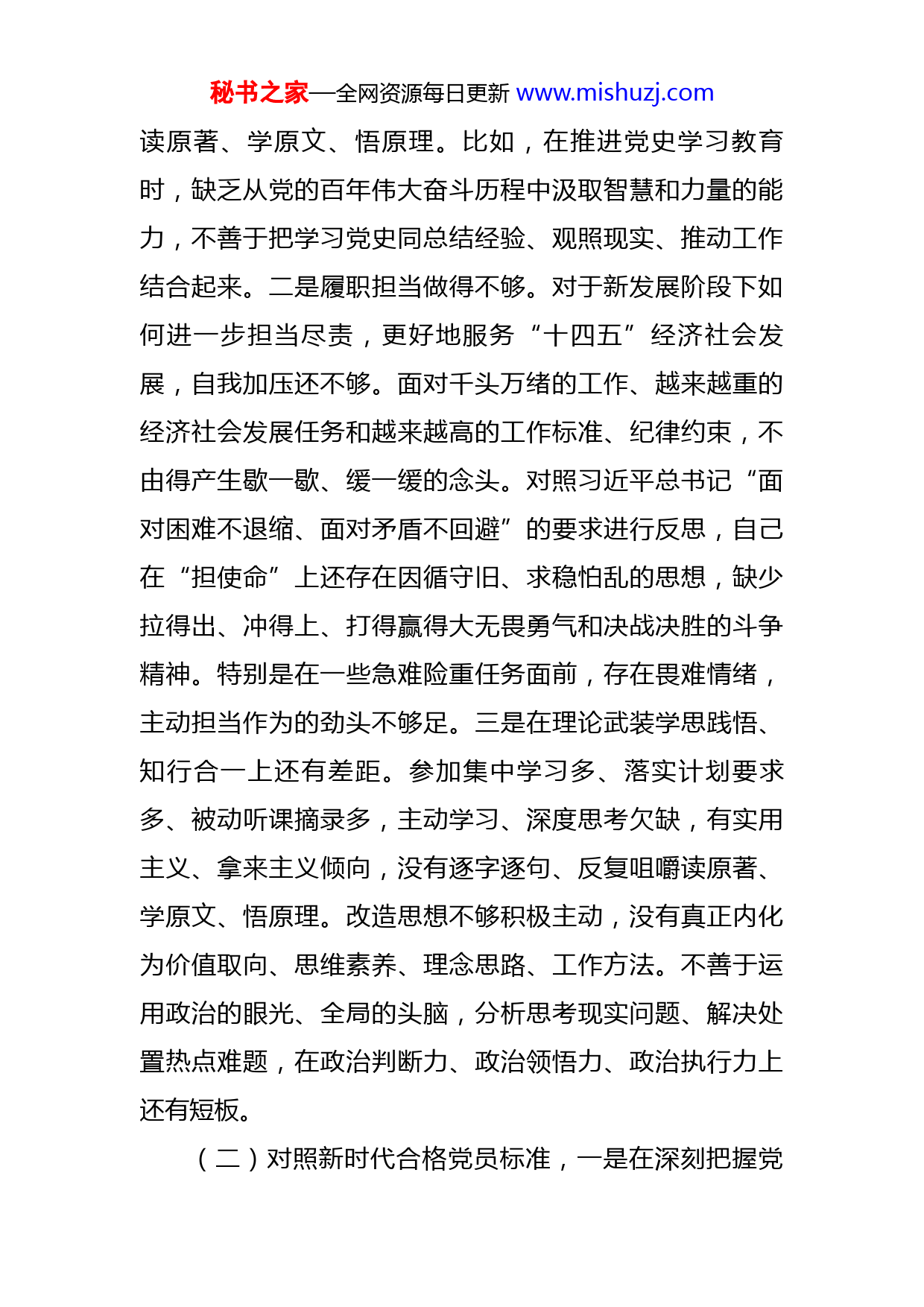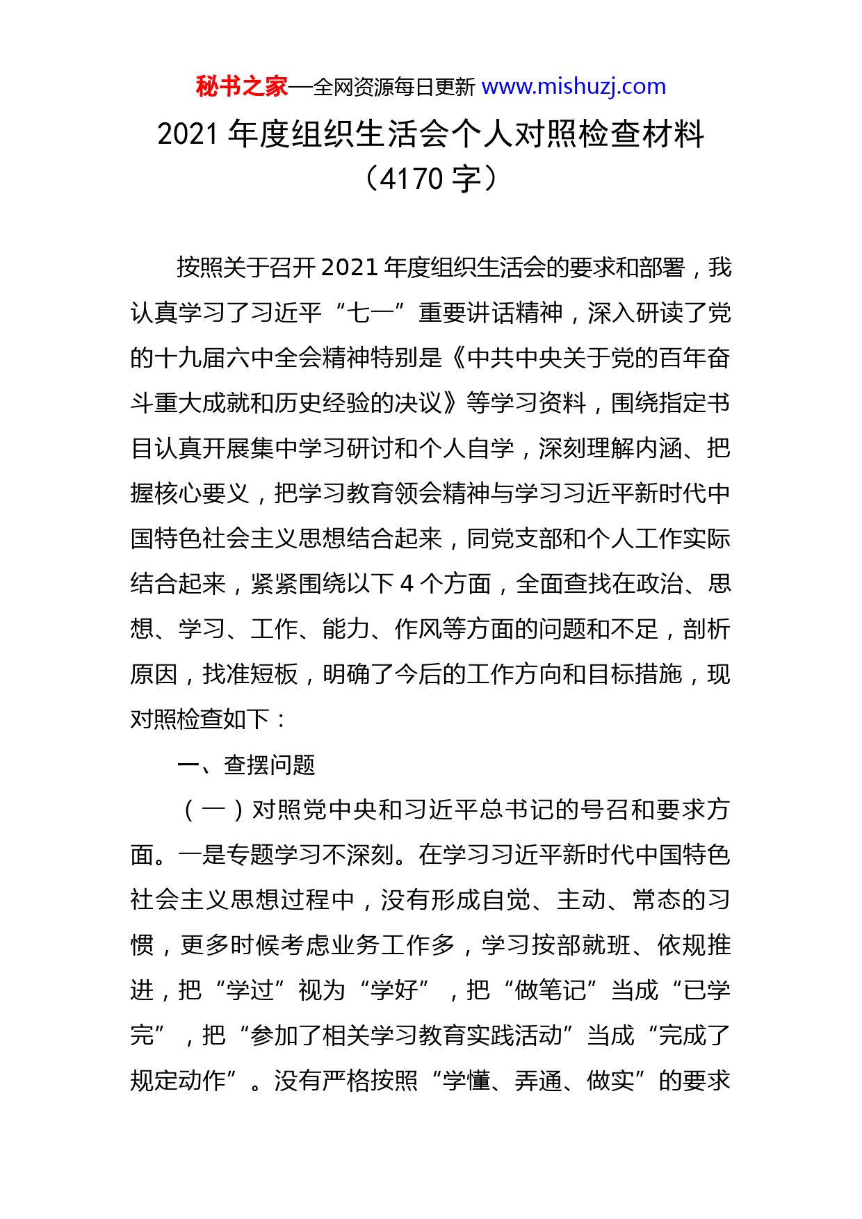 秘书之家—全网资源每日更新www.mishuzj.com2021年度组织生活会个人对照检查材料(4170字)按照关于召开2021年度组织生活会的要求和部署,我认真学习了习近平“七一”重要讲话精神,深入研读了党的十九届六中全会精神特别是《中共中央关于党的百年奋斗重大成就和历史经验的决议》等学习资料,围绕指定书目认真开展集中学习研讨和个人自学,深刻理解内涵、把握核心要义,把学习教育领会精神与学习习近平新时代中国特色社会主义思想结合起来,同党支部和个人工作实际结合起来,紧紧围绕以下4个方面,全面查找在政治、思想、学习、工作、能力、作风等方面的问题和不足,剖析原因,找准短板,明确了今后的工作方向和目标措施,现对照检查如下:一、查摆问题(一)对照党中央和习近平总书记的号召和要求方面。一是专题学习不深刻。在学习习近平新时代中国特色社会主义思想过程中,没有形成自觉、主动、常态的习惯,更多时候考虑业务工作多,学习按部就班、依规推进,把“学过”视为“学好”,把“做笔记”当成“已学完”,把“参加了相关学习教育实践活动”当成“完成了规定动作”。没有严格按照“学懂、弄通、做实”的要求秘书之家—全网资源每日更新www.mishuzj.com读原著、学原文、悟原理。比如,在推进党史学习教育时,缺乏从党的百年伟大奋斗历程中汲取智慧和力量的能力,不善于把学习党史同总结经验、观照现实、推动工作结合起来。二是履职担当做得不够。对于新发展阶段下如何进一步担当尽责,更好地服务“十四五”经济社会发展,自我加压还不够。面对千头万绪的工作、越来越重的经济社会发展任务和越来越高的工作标准、纪律约束,不由得产生歇一歇、缓一缓的念头。对照习近平总书记“面对困难不退缩、面对矛盾不回避”的要求进行反思,自己在“担使命”上还存在因循守旧、求稳怕乱的思想,缺少拉得出、冲得上、打得赢得大无畏勇气和决战决胜的斗争精神。特别是在一些急难险重任务面前,存在畏难情绪,主动担当作为的劲头不够足。三是在理论武装学思践悟、知行合一上还有差距。参加集中学习多、落实计划要求多、被动听课摘录多,主动学习、深度思考欠缺,有实用主义、拿来主义倾向,没有逐字逐句、反复咀嚼读原著、学原文、悟原理。改造思想不够积极主动,没有真正内化为价值取向、思维素养、理念思路、工作方法。不善于运用政治的眼光、全局的头脑,分析思考现实问题、解决处置热点难题,在政治判断力、政治领悟力、政治执行力上还有短板。(二)对照新时代合格党员标准,一是在深刻把握党秘书之家—全网资源每日更新www.mishuzj.com的创新理论学习方面思想认识有偏差。习惯性地认为党的创新理论更多是管方向、管大局的指导性的国家领导人讲话、简单地理解为在常规工作推进中抓好落实即是,没有深刻认识到党的理论在推动社会发展中的重要指导、指引作用。二是纪律教育还需加强。有时认为党内法规是给那些“视规矩纪律而不见”的人制定的,一定程度上放松了自己对党章党纪党规的学习。比如:自己学习《党章》,习惯性地择其重点学党员义务,没有深刻认识党章要常学常新提醒自己是共产党人的重要意义。三是工作干劲、冲劲不足。虽然在工作中比较细心,但在应对难题和复杂局面时,处理不够果断,有“不求有功,但求无过”的念头,缺乏敢为人先的勇气,担当精神不足。虽然能按部就班地完成常规性工作,但在工作中有时思想会出现松懈,开拓创新和与时俱进的动力和激情稍显不足。有时还会有自满心理作祟,结合实际突破和创新少,缺乏持续高昂的工作热情和进取精神。(三)对照入党誓词方面。一是宗旨观念有所弱化。作为党员干部,全心全意为人民服务是自己的入党誓言,不只应记在心上,更应落实到行动上。但在遇到具体工作时,虽然站稳了为人民服务的立场,但碰到困难不主动向基层干部群众请教学习,不注意吸取群众首创的新鲜经验,没能全面了解和掌握群众的所思、所想所盼所需,到秘书之家—全网资源每日更新www.mishuzj.com基层体察民情接触群众少了,与群众同吃同住同劳动少了,沉下去解决具体信访问题少了,有时工作没有做到人民群众的心坎里和关键处。二是抓工作落实不够耐心细致。在面对一些时间紧、要求高的工作任务时,总想着尽快收齐材料、尽快写完文稿、尽快落实到位,没有留给部门创造性开展工作的空间;有时存在经验主义和急躁心理,与同志们沟通较少,工作中提任务、提要求多,交流思想、关注具体情况少,有时自己认为材料“应该这样、应该那样”写,就会直言不讳地提出来,没有充分考虑同志们对具体工作的实际看法和认识程度,或多或少影响到工作质量和效率的提升。三是自觉爱党护党的政治敏锐性还不强。从政治上观察分析问题,见微知著、快速反应意识还不强,对意识形态领域的复杂斗争警觉不够,对一些苗头性、倾向性问题,对一些损害党的形象和威信的言行,对于身边一些社会谣言、不当言论,有时候也存在从众心理,还不能身体力行、态度鲜明地及时认真抵制和批评,立即展开斗争,缺乏维护我党形象和威信的政治责任和历史担当。(四)对照革命先辈和先进典型方面。一是深入调查研究不够。有时由于工作的原因,还存在浮在机关多,走进基层少;忙于事务