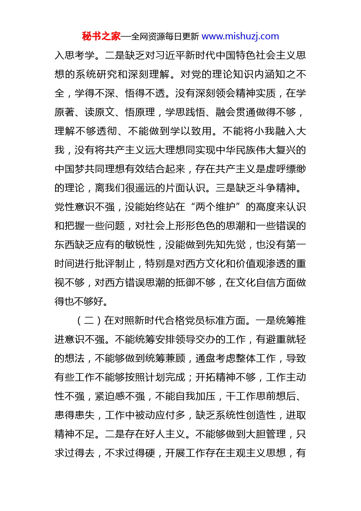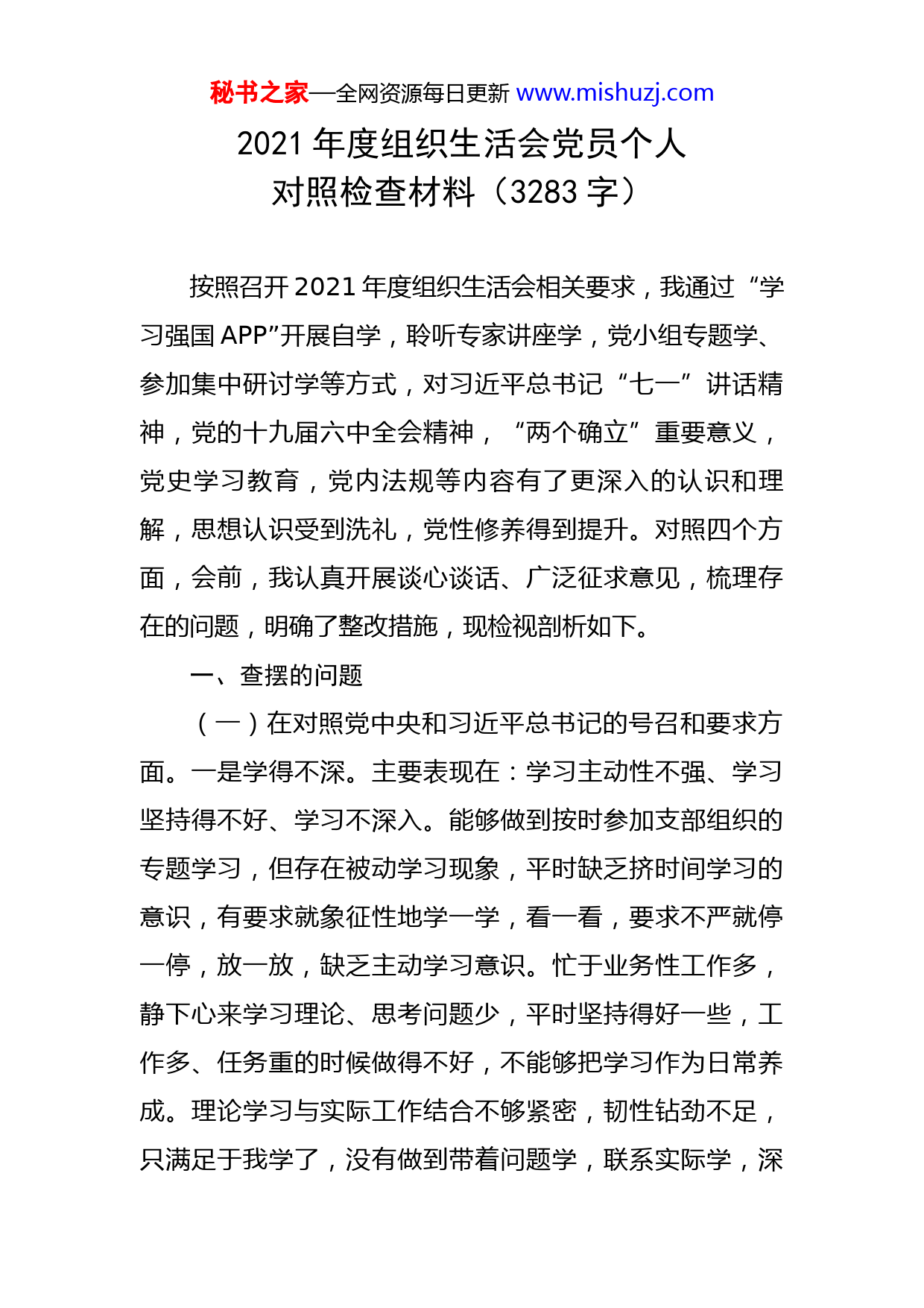 秘书之家—全网资源每日更新www.mishuzj.com2021年度组织生活会党员个人对照检查材料(3283字)按照召开2021年度组织生活会相关要求,我通过“学习强国APP”开展自学,聆听专家讲座学,党小组专题学、参加集中研讨学等方式,对习近平总书记“七一”讲话精神,党的十九届六中全会精神,“两个确立”重要意义,党史学习教育,党内法规等内容有了更深入的认识和理解,思想认识受到洗礼,党性修养得到提升。对照四个方面,会前,我认真开展谈心谈话、广泛征求意见,梳理存在的问题,明确了整改措施,现检视剖析如下。一、查摆的问题(一)在对照党中央和习近平总书记的号召和要求方面。一是学得不深。主要表现在:学习主动性不强、学习坚持得不好、学习不深入。能够做到按时参加支部组织的专题学习,但存在被动学习现象,平时缺乏挤时间学习的意识,有要求就象征性地学一学,看一看,要求不严就停一停,放一放,缺乏主动学习意识。忙于业务性工作多,静下心来学习理论、思考问题少,平时坚持得好一些,工作多、任务重的时候做得不好,不能够把学习作为日常养成。理论学习与实际工作结合不够紧密,韧性钻劲不足,只满足于我学了,没有做到带着问题学,联系实际学,深秘书之家—全网资源每日更新www.mishuzj.com入思考学。二是缺乏对习近平新时代中国特色社会主义思想的系统研究和深刻理解。对党的理论知识内涵知之不全,学得不深、悟得不透。没有深刻领会精神实质,在学原著、读原文、悟原理,学思践悟、融会贯通做得不够,理解不够透彻、不能做到学以致用。不能将小我融入大我,没有将共产主义远大理想同实现中华民族伟大复兴的中国梦共同理想有效结合起来,存在共产主义是虚呼缥缈的理论,离我们很遥远的片面认识。三是缺乏斗争精神。党性意识不强,没能始终站在“两个维护”的高度来认识和把握一些问题,对社会上形形色色的思潮和一些错误的东西缺乏应有的敏锐性,没能做到先知先觉,也没有第一时间进行批评制止,特别是对西方文化和价值观渗透的重视不够,对西方错误思潮的抵御不够,在文化自信方面做得也不够好。(二)在对照新时代合格党员标准方面。一是统筹推进意识不强。不能统筹安排领导交办的工作,有避重就轻的想法,不能够做到统筹兼顾,通盘考虑整体工作,导致有些工作不能够按照计划完成;开拓精神不够,工作主动性不强,紧迫感不强,不能自我加压,干工作思前想后、患得患失,工作中被动应付多,缺乏系统性创造性,进取精神不足。二是存在好人主义。不能够做到大胆管理,只求过得去,不求过得硬,开展工作存在主观主义思想,有秘书之家—全网资源每日更新www.mishuzj.com些工作不能够与部门同志进行及时沟通,凭个人经验干工作,有的工作重形式轻内容,一些工作有布置没检查,存在虎头蛇尾现象。三是业务工作不扎实,学习主动性不强。对于业务不能够往深处研究,有时忙于事务性工作,往往“坐不下来,钻不进去”,对工作实践进行理性思考、理性总结不够,存在重干轻学的现象不善于把理论学习的成果转化为工作的思路、办法和措施只是满足于我知道,我了解的肤浅层次,业务知识老化,不能做到自我提升。(三)在对照入党誓词方面。一是联系服务群众不够经常主动。对项目建设、县域经济发展等重点工作关注得多,对群众的生产生活、冷暖疾苦关注程度有所降低,开展“我为群众办实事”实践活动和“走流程”主动性不高,帮助群众解决实际问题较少,践行群众路线不到位。服务能力不强,百姓的语言未全掌握,联系群众、沟通群众的素质不高,化解矛盾、解决诉求的招法不多,为民谋利、与民实惠的本领不足。二是担当意识与奋勇争先的意识淡化。有时会给自己的思想“开小差”,认为只要学习计划与内容不出现问题就行,只求工作平淡如水不出错就好,不求学习教育工作开展成为优秀、成为典型;上有领导统筹引领,下有宣传委员等具体人员负责落实,自己可以稍微少思考、少谋划,勇上一线、勇当攻坚克难“过河秘书之家—全网资源每日更新www.mishuzj.com卒”的思想弱化,党员的示范作用发挥不明显。三是抓落实的措施不够有力。虽然下基层调研,研判工作推进的问题,但在开展工作中满足于四平八稳、按部就班,习惯于按惯例办事,缺乏探索创新精神,对工作的态度和精神尚可,但安于现状,思维不活,满足于工作任务顺利完成,争创一流的激情有所不足,总结历史经验,创新工作方法上用力不足,有时会出现有想法、没办法,有思路、无举措的情况。(四)在对照革命先辈和先进典型方面。一是宗旨意识树得不牢。自己之所以出现联系服务群众不够经常、工作作风有待加强等问题,根源在于全心全意为人民服务的宗旨树得不牢,没有从根本上解决“为了谁、依靠谁、我是谁”的问题,总认为很多事是普遍问题,不是自己能解决的,没有尽全力去争取和努力。对标焦裕禄、孔繁森、黄文秀等党的先进模范,自己的为民情怀、奉献精神还有差距,为群众服务做得不好,为群众办实事少,没有真正把维护好人民群众的根本利益作为一切工作的出发点和落脚点。二是工作作风有待加强。对标党的光荣传统和优良作风,深感自己的工作作风还存在较大差距,比如缺乏创新精神,起草材料主动研究、深入思考不够,很多时候是在翻新别人的思路、跟在先进后面