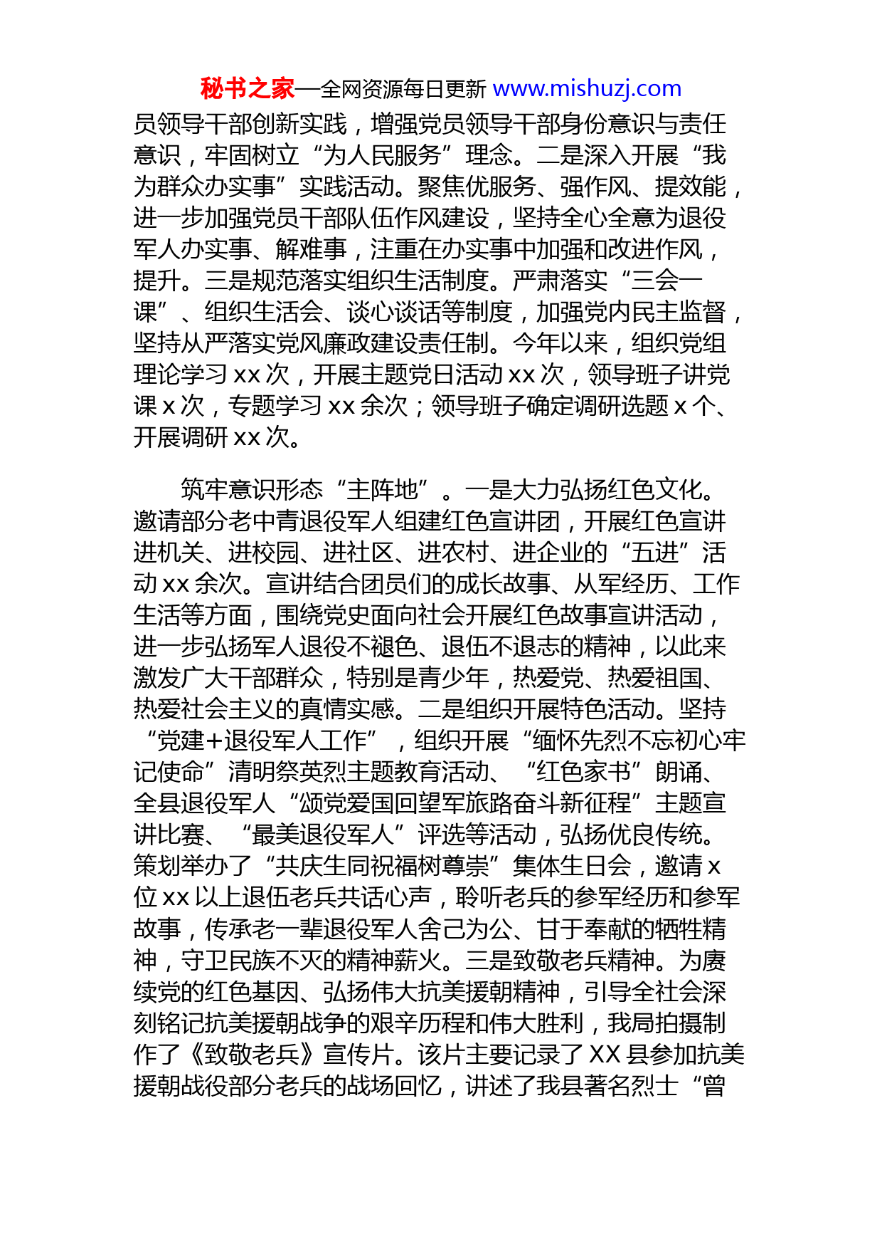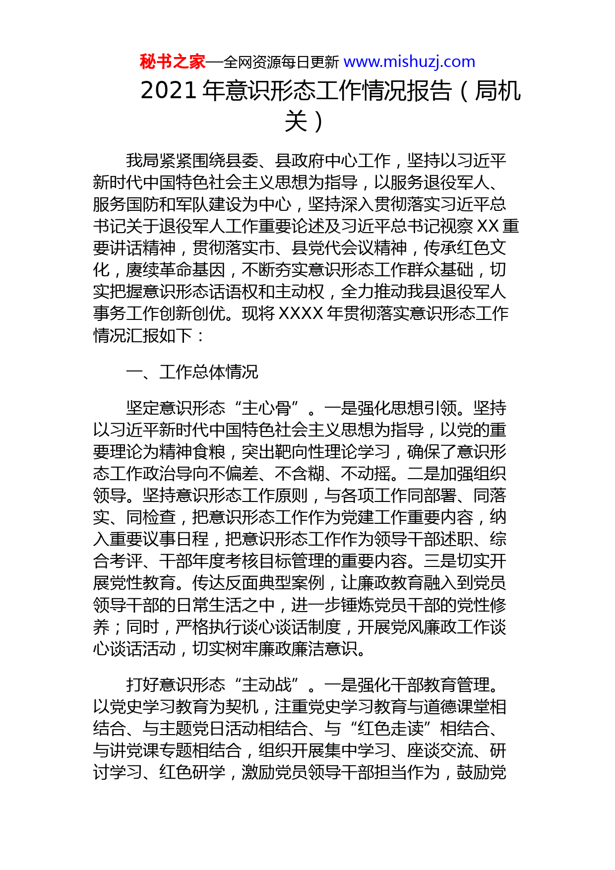秘书之家—全网资源每日更新www.mishuzj.com2021年意识形态工作情况报告(局机关)我局紧紧围绕县委、县政府中心工作,坚持以习近平新时代中国特色社会主义思想为指导,以服务退役军人、服务国防和军队建设为中心,坚持深入贯彻落实习近平总书记关于退役军人工作重要论述及习近平总书记视察XX重要讲话精神,贯彻落实市、县党代会议精神,传承红色文化,赓续革命基因,不断夯实意识形态工作群众基础,切实把握意识形态话语权和主动权,全力推动我县退役军人事务工作创新创优。现将XXXX年贯彻落实意识形态工作情况汇报如下:一、工作总体情况坚定意识形态“主心骨”。一是强化思想引领。坚持以习近平新时代中国特色社会主义思想为指导,以党的重要理论为精神食粮,突出靶向性理论学习,确保了意识形态工作政治导向不偏差、不含糊、不动摇。二是加强组织领导。坚持意识形态工作原则,与各项工作同部署、同落实、同检查,把意识形态工作作为党建工作重要内容,纳入重要议事日程,把意识形态工作作为领导干部述职、综合考评、干部年度考核目标管理的重要内容。三是切实开展党性教育。传达反面典型案例,让廉政教育融入到党员领导干部的日常生活之中,进一步锤炼党员干部的党性修养;同时,严格执行谈心谈话制度,开展党风廉政工作谈心谈话活动,切实树牢廉政廉洁意识。打好意识形态“主动战”。一是强化干部教育管理。以党史学习教育为契机,注重党史学习教育与道德课堂相结合、与主题党日活动相结合、与“红色走读”相结合、与讲党课专题相结合,组织开展集中学习、座谈交流、研讨学习、红色研学,激励党员领导干部担当作为,鼓励党秘书之家—全网资源每日更新www.mishuzj.com员领导干部创新实践,增强党员领导干部身份意识与责任意识,牢固树立“为人民服务”理念。二是深入开展“我为群众办实事”实践活动。聚焦优服务、强作风、提效能,进一步加强党员干部队伍作风建设,坚持全心全意为退役军人办实事、解难事,注重在办实事中加强和改进作风,提升。三是规范落实组织生活制度。严肃落实“三会一课”、组织生活会、谈心谈话等制度,加强党内民主监督,坚持从严落实党风廉政建设责任制。今年以来,组织党组理论学习xx次,开展主题党日活动xx次,领导班子讲党课x次,专题学习xx余次;领导班子确定调研选题x个、开展调研xx次。筑牢意识形态“主阵地”。一是大力弘扬红色文化。邀请部分老中青退役军人组建红色宣讲团,开展红色宣讲进机关、进校园、进社区、进农村、进企业的“五进”活动xx余次。宣讲结合团员们的成长故事、从军经历、工作生活等方面,围绕党史面向社会开展红色故事宣讲活动,进一步弘扬军人退役不褪色、退伍不退志的精神,以此来激发广大干部群众,特别是青少年,热爱党、热爱祖国、热爱社会主义的真情实感。二是组织开展特色活动。坚持“党建+退役军人工作”,组织开展“缅怀先烈不忘初心牢记使命”清明祭英烈主题教育活动、“红色家书”朗诵、全县退役军人“颂党爱国回望军旅路奋斗新征程”主题宣讲比赛、“最美退役军人”评选等活动,弘扬优良传统。策划举办了“共庆生同祝福树尊崇”集体生日会,邀请x位xx以上退伍老兵共话心声,聆听老兵的参军经历和参军故事,传承老一辈退役军人舍己为公、甘于奉献的牺牲精神,守卫民族不灭的精神薪火。三是致敬老兵精神。为赓续党的红色基因、弘扬伟大抗美援朝精神,引导全社会深刻铭记抗美援朝战争的艰辛历程和伟大胜利,我局拍摄制作了《致敬老兵》宣传片。该片主要记录了XX县参加抗美援朝战役部分老兵的战场回忆,讲述了我县著名烈士“曾秘书之家—全网资源每日更新www.mishuzj.com妈妈”曾XX的事迹,以及我县退役军人扎根德安红色沃土、服务基层的初心。二、亮点成效一是拍摄制作了《致敬老兵》宣传片。为赓续党的红色基因、传承老兵精神,弘扬伟大抗美援朝精神,引导全社会深刻铭记抗美援朝战争的艰辛历程和伟大胜利,使用可视化影像留住老兵事迹,具有时代教育意义。二是深入开展“我为群众办实事”实践活动。除正常业务工作外,积极实施“关爱行动”,及时开展优抚对象帮扶解困工作,为xx人次申请信访救助资金x万余元,缓解退役军人家庭应对突发情况及重大变故压力,保障生活质量。三是营造浓厚拥军氛围。为进一步提升全县营造浓厚的拥军优属氛围,与中国xx等合作,为现役军人、退役军人及其家属提供金融、邮政、通信、住宿等方面的更优服务。三、不足之处及改进方向在落实意识形态责任制方面虽然我们做了一些工作,也取得了一定成效,但也还存在一些不足。一是对新媒体创新应用思路有待继续加强,二是对宣传人员的培训不够,宣传能力有待提升等问题。为切实抓牢抓实抓细意识形态工作,我们将坚持问题导向,进一步理清工作思路,牢握意识形态工作的话语权和主动权。一是进一步落实意识形态工作责任制。继续将落实意识形态工作责任制作为一项重要工作,同其他工作同部署、同安排、同落实、同考核。党组书记作为第一责任人对重要意识形态工作亲自部署、重要意识形态问题亲自过问、秘书之家—全网资源每日更新www.mishuzj.com重大意识形态事件亲自处理,坚持把意识形态工作与干部考核紧密结