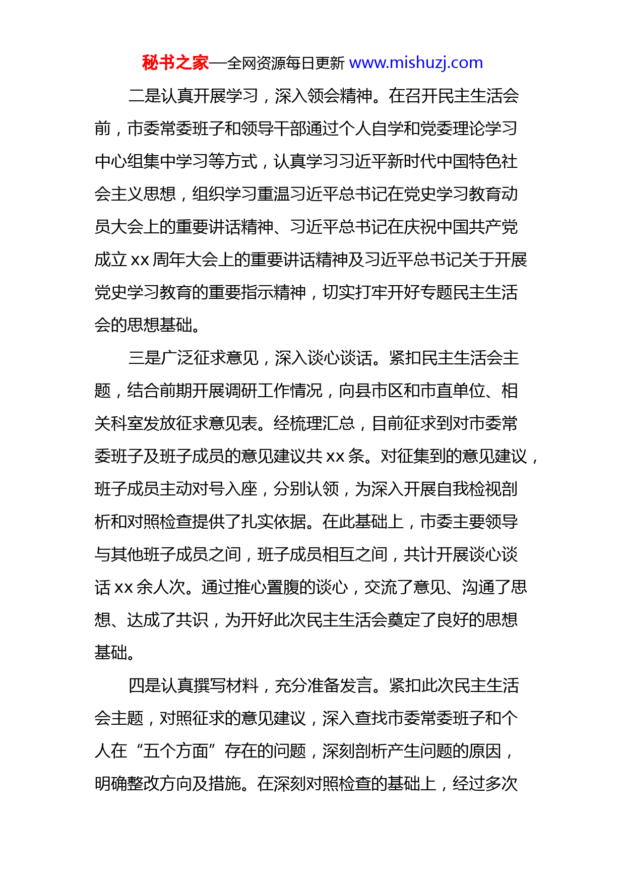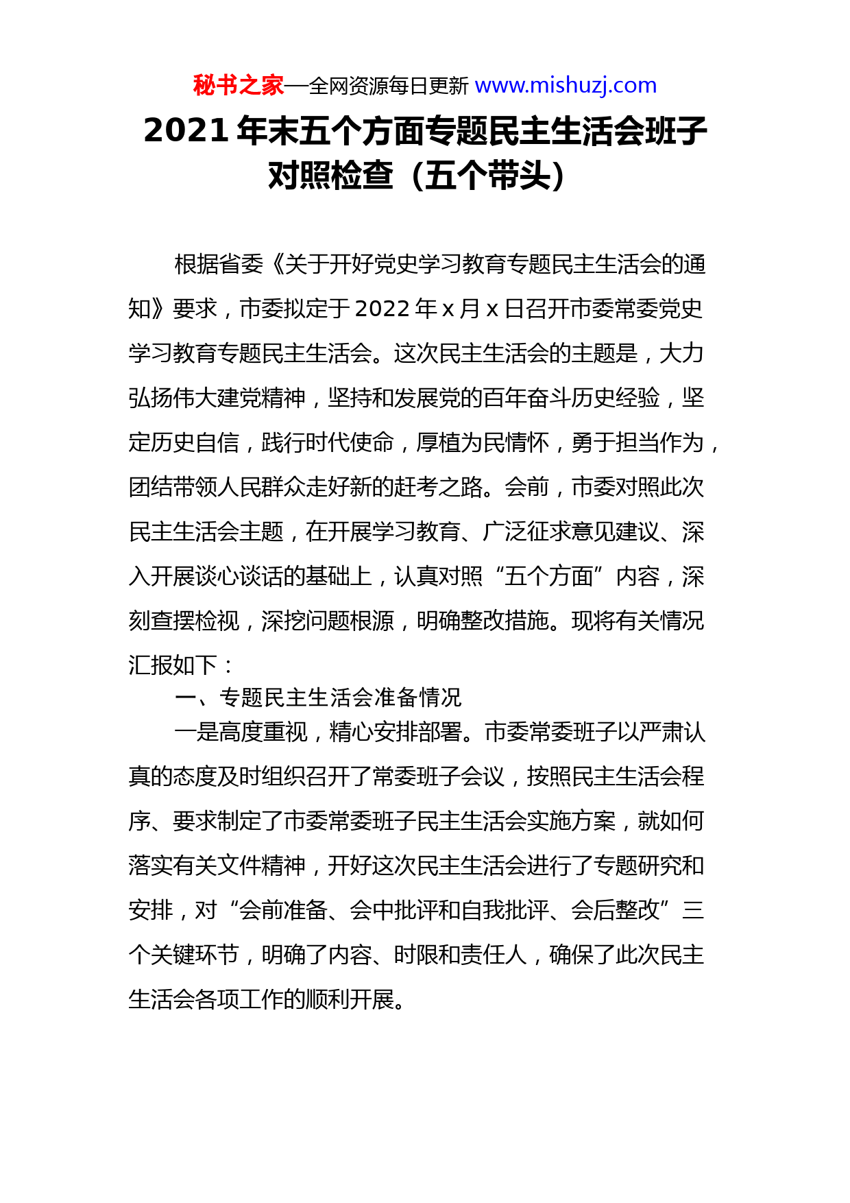 秘书之家—全网资源每日更新www.mishuzj.com2021年末五个方面专题民主生活会班子对照检查(五个带头)根据省委《关于开好党史学习教育专题民主生活会的通知》要求,市委拟定于2022年x月x日召开市委常委党史学习教育专题民主生活会。这次民主生活会的主题是,大力弘扬伟大建党精神,坚持和发展党的百年奋斗历史经验,坚定历史自信,践行时代使命,厚植为民情怀,勇于担当作为,团结带领人民群众走好新的赶考之路。会前,市委对照此次民主生活会主题,在开展学习教育、广泛征求意见建议、深入开展谈心谈话的基础上,认真对照“五个方面”内容,深刻查摆检视,深挖问题根源,明确整改措施。现将有关情况汇报如下:一、专题民主生活会准备情况一是高度重视,精心安排部署。市委常委班子以严肃认真的态度及时组织召开了常委班子会议,按照民主生活会程序、要求制定了市委常委班子民主生活会实施方案,就如何落实有关文件精神,开好这次民主生活会进行了专题研究和安排,对“会前准备、会中批评和自我批评、会后整改”三个关键环节,明确了内容、时限和责任人,确保了此次民主生活会各项工作的顺利开展。秘书之家—全网资源每日更新www.mishuzj.com二是认真开展学习,深入领会精神。在召开民主生活会前,市委常委班子和领导干部通过个人自学和党委理论学习中心组集中学习等方式,认真学习习近平新时代中国特色社会主义思想,组织学习重温习近平总书记在党史学习教育动员大会上的重要讲话精神、习近平总书记在庆祝中国共产党成立xx周年大会上的重要讲话精神及习近平总书记关于开展党史学习教育的重要指示精神,切实打牢开好专题民主生活会的思想基础。三是广泛征求意见,深入谈心谈话。紧扣民主生活会主题,结合前期开展调研工作情况,向县市区和市直单位、相关科室发放征求意见表。经梳理汇总,目前征求到对市委常委班子及班子成员的意见建议共xx条。对征集到的意见建议,班子成员主动对号入座,分别认领,为深入开展自我检视剖析和对照检查提供了扎实依据。在此基础上,市委主要领导与其他班子成员之间,班子成员相互之间,共计开展谈心谈话xx余人次。通过推心置腹的谈心,交流了意见、沟通了思想、达成了共识,为开好此次民主生活会奠定了良好的思想基础。四是认真撰写材料,充分准备发言。紧扣此次民主生活会主题,对照征求的意见建议,深入查找市委常委班子和个人在“五个方面”存在的问题,深刻剖析产生问题的原因,明确整改方向及措施。在深刻对照检查的基础上,经过多次秘书之家—全网资源每日更新www.mishuzj.com修改,最终形成市委常委班子和领导干部对照检查材料,为顺利组织召开专题民主生活会做好了充分的准备。此外,市委常委班子坚持“准备工作不充分、条件不成熟,不召开民主生活会”的原则而,认真对照省委文件要求,逐一抓好落实。总之,通过前期扎实有效的工作,为高质量、高标准开好此次专题民主生活会提供了保证。二、上年度民主生活会查摆问题整改落实情况20xx年度民主生活会召开以来,我们按照省委、省政府的要求,不断加强领导班子自身建设,努力成为坚定贯彻党的理论和路线方针政策,坚定落实省委、省政府各项决策部署、善于统领发展改革工作全局的有力领导班子。一是加强政治理论学习,夯实统筹发展的基础。强化市委理论学习活动,加强对党的十九大、十九届X中X会、中央、省重大方针政策的学习;重视对宏观经济业务知识、市场经济、法律、法规和现代管理知识的学习,尤其是继续深入巩固学习习近平新时代中国特色社会主义思想成果,强化学习调研工作,组织广大党员干部,认真的学习了党的十九大、十九届X中X会精神;学习了习近平总书记“七一”讲话报告;结合党史学习教育,学习《党政领导干部廉洁从政若干准则》等重要的理论著作,进一步摆正人民公仆的角色,树立“情为民所系、权位民所用、利为民所谋”的意识,更秘书之家—全网资源每日更新www.mishuzj.com好的为老百姓做实事、作好事。努力实现理论学习深层化、业务学习系统化、学习内容多元化。每月市委集中理论学习x天,每年集中学习时间不少于xx次。大力弘扬理论联系实际的学风,注重学以致用,用工作实绩检验学习效果,努力在武装思想和指导实践两个方面都有新的成效。班子成员每年至少撰写x-x篇有深度、有分析、有见解的理论文章或调研报告。二是加强民主集中制建设,提高发展的决策水平。坚持集体领导和分工负责相结合,发挥班子的整体合力;凡属贯彻上级重大决策和部署、全局重大问题、重要项目安排等,领导班子集体研究决定。严格按照省委的要求,每半年至少召开一次班子民主生活会。班子成员要顾全大局、珍视团结、相互尊重,相互信任,相互支持,讲党性、讲政治、讲大局,正确处理个人与组织的关系,班子成员之间要经常开展谈心,营造团结协作、共谋大事的良好氛围。三是加强作风建设,切实提高服务质量。领导班子决心从强化窗口服务意识、简化项目审批程序做起,进一步加大一系列规章制度落实力度,充分发挥工作宏观经济调控职能作用,切实优化经济社会发展环境,推动全市经济社会全面协调可持续发展提供有力支持。总之,市委对存在的问题,通过一年来认真的整改,取得了一些实效,解决