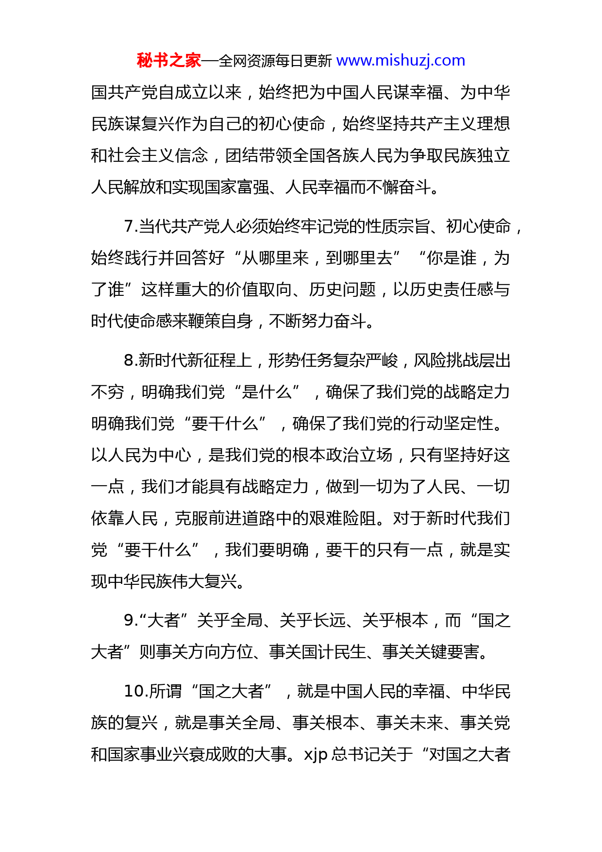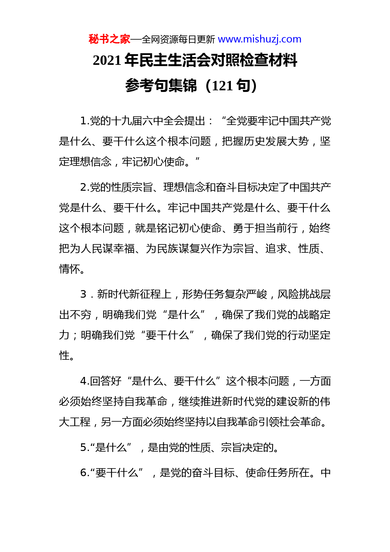 秘书之家—全网资源每日更新www.mishuzj.com2021年民主生活会对照检查材料参考句集锦(121句)1.党的十九届六中全会提出:“全党要牢记中国共产党是什么、要干什么这个根本问题,把握历史发展大势,坚定理想信念,牢记初心使命。”2.党的性质宗旨、理想信念和奋斗目标决定了中国共产党是什么、要干什么。牢记中国共产党是什么、要干什么这个根本问题,就是铭记初心使命、勇于担当前行,始终把为人民谋幸福、为民族谋复兴作为宗旨、追求、性质、情怀。3.新时代新征程上,形势任务复杂严峻,风险挑战层出不穷,明确我们党“是什么”,确保了我们党的战略定力;明确我们党“要干什么”,确保了我们党的行动坚定性。4.回答好“是什么、要干什么”这个根本问题,一方面必须始终坚持自我革命,继续推进新时代党的建设新的伟大工程,另一方面必须始终坚持以自我革命引领社会革命。5.“是什么”,是由党的性质、宗旨决定的。6.“要干什么”,是党的奋斗目标、使命任务所在。中秘书之家—全网资源每日更新www.mishuzj.com国共产党自成立以来,始终把为中国人民谋幸福、为中华民族谋复兴作为自己的初心使命,始终坚持共产主义理想和社会主义信念,团结带领全国各族人民为争取民族独立人民解放和实现国家富强、人民幸福而不懈奋斗。7.当代共产党人必须始终牢记党的性质宗旨、初心使命,始终践行并回答好“从哪里来,到哪里去”“你是谁,为了谁”这样重大的价值取向、历史问题,以历史责任感与时代使命感来鞭策自身,不断努力奋斗。8.新时代新征程上,形势任务复杂严峻,风险挑战层出不穷,明确我们党“是什么”,确保了我们党的战略定力明确我们党“要干什么”,确保了我们党的行动坚定性。以人民为中心,是我们党的根本政治立场,只有坚持好这一点,我们才能具有战略定力,做到一切为了人民、一切依靠人民,克服前进道路中的艰难险阻。对于新时代我们党“要干什么”,我们要明确,要干的只有一点,就是实现中华民族伟大复兴。9.“大者”关乎全局、关乎长远、关乎根本,而“国之大者”则事关方向方位、事关国计民生、事关关键要害。10.所谓“国之大者”,就是中国人民的幸福、中华民族的复兴,就是事关全局、事关根本、事关未来、事关党和国家事业兴衰成败的大事。xjp总书记关于“对国之大者秘书之家—全网资源每日更新www.mishuzj.com要心中有数”的重要论述,蕴含着坚决做到“两个维护”的政治要求,蕴含着观大势系大局谋大事的时代要求,蕴含着不折不扣落实中央精神的实践要求,蕴含着立足岗位担当作为的能力要求。11.有的同志认为,“国之大者”是党和国家的大事,是高级领导干部的事,与自己的工作生活很遥远。这种想法是极其错误的。做工作如果不知道“国之大者”是什么就辨不明方向、找不到方位、掌握不好方寸。得其大者,方能兼其小。12.现实中,我们有的干部看问题缺乏战略性、前瞻性、敏锐性,对“时”与“势”的发展变化反应迟钝,对党和国家关心的事一问三不知,对人民群众期盼的事置若罔闻对问题的处理视野狭窄、思路不宽、事务主义、经验主义或不知所措、或躲绕推搡,等等。究其原因,很重要的一条就是对“国之大者”心中无数或假装糊涂,这对党和人民事业的发展是极其危害的。13.领导干部要做到对“国之大者”了然于胸,首先要提高政治站位,善于从政治上思考问题,善于从一般事务中发现政治问题,善于从倾向性、苗头性问题中发现政治端倪,善于从错综复杂的矛盾关系中把握政治逻辑,深入透彻地去解决问题。秘书之家—全网资源每日更新www.mishuzj.com14.要不断提高政治意识,做到观察分析形势考虑政治因素、出台政策措施重视政治影响、部署推进工作把握政治要求、处置敏感问题防范政治风险。15.胸怀好“国之大者”就要观大势谋大局。xjp总书记强调,“领导干部想问题、作决策,一定要对国之大者心中有数,多打大算盘、算大账,少打小算盘、算小账,善于把地区和部门的工作融入党和国家事业大棋局,做到既为一域争光、更为全局添彩”。作为领导干部必须具备知大局、懂大局、为大局的眼界胸怀和能力本领。只有始终心怀“国之大者”,方可有大格局、大作为,方可因势而谋、因势而动、因势而进。16.领导干部要在学深悟透xjp新时代中国特色社会主义思想上下功夫,经常同党的基本理论、基本路线、基本方略,同党中央重大决策部署,同xjp总书记重要指示批示精神对标对表,自觉站在党和国家的战略全局、政治大局上想问题、作决策、办事情,防止工作片面化、简单化。17.要把中华民族伟大复兴的战略全局和世界百年未有之大变局“两个大局”,作为我们谋划工作的基本出发点加强工作战略性、系统性、前瞻性研究谋划,看得清辨得明大势、大事和大局。18.要牢固树立全国一盘棋思想,坚持局部服从整体,秘书之家—全网资源每日更新www.mishuzj.com善于从战略全局谋划推动工作,坚定维护党和国家重大原则、重大立场和重大利益,防止和克服只见树木不见森林只看当下不顾长远、只重局部忽视全局的“短视症”。19.国家大事体现在一个个重大部署上、一项项重大任务上,不仅要认识清楚、目标清晰,更要落实责任、落实到底、抓出成效。国之大者、气象万千,国之大者、为国为民。20.要强化执行力,