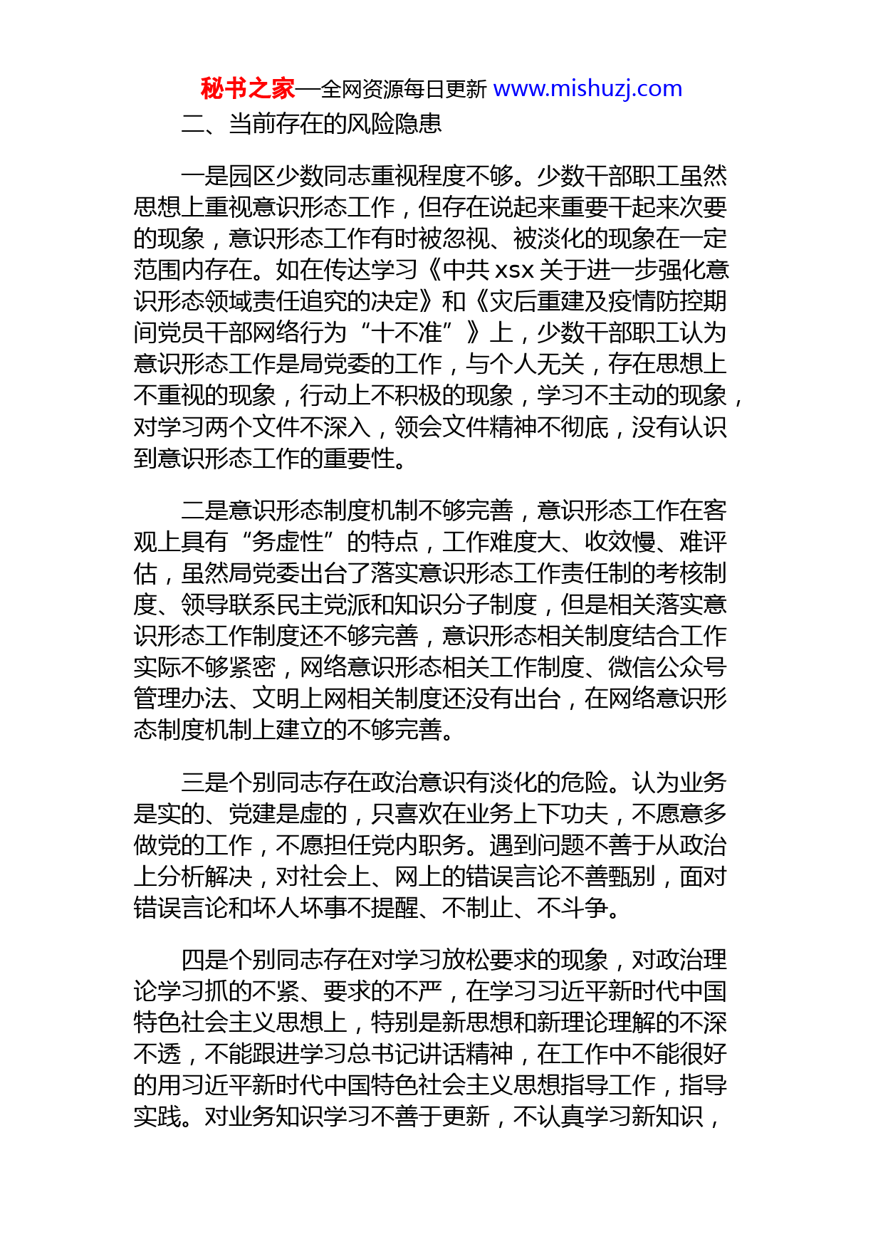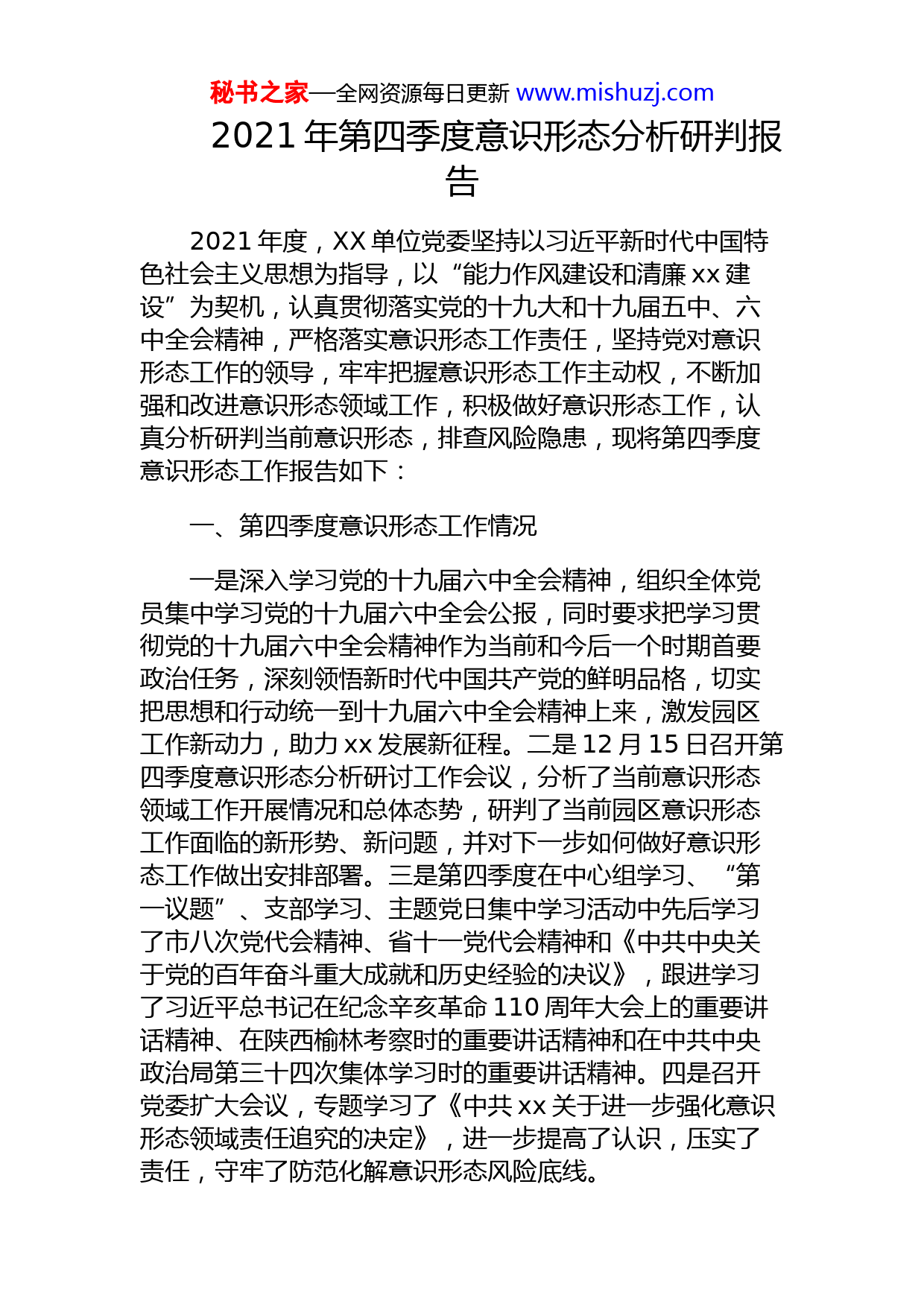 秘书之家—全网资源每日更新www.mishuzj.com2021年第四季度意识形态分析研判报告2021年度,XX单位党委坚持以习近平新时代中国特色社会主义思想为指导,以“能力作风建设和清廉xx建设”为契机,认真贯彻落实党的十九大和十九届五中、六中全会精神,严格落实意识形态工作责任,坚持党对意识形态工作的领导,牢牢把握意识形态工作主动权,不断加强和改进意识形态领域工作,积极做好意识形态工作,认真分析研判当前意识形态,排查风险隐患,现将第四季度意识形态工作报告如下:一、第四季度意识形态工作情况一是深入学习党的十九届六中全会精神,组织全体党员集中学习党的十九届六中全会公报,同时要求把学习贯彻党的十九届六中全会精神作为当前和今后一个时期首要政治任务,深刻领悟新时代中国共产党的鲜明品格,切实把思想和行动统一到十九届六中全会精神上来,激发园区工作新动力,助力xx发展新征程。二是12月15日召开第四季度意识形态分析研讨工作会议,分析了当前意识形态领域工作开展情况和总体态势,研判了当前园区意识形态工作面临的新形势、新问题,并对下一步如何做好意识形态工作做出安排部署。三是第四季度在中心组学习、“第一议题”、支部学习、主题党日集中学习活动中先后学习了市八次党代会精神、省十一党代会精神和《中共中央关于党的百年奋斗重大成就和历史经验的决议》,跟进学习了习近平总书记在纪念辛亥革命110周年大会上的重要讲话精神、在陕西榆林考察时的重要讲话精神和在中共中央政治局第三十四次集体学习时的重要讲话精神。四是召开党委扩大会议,专题学习了《中共xx关于进一步强化意识形态领域责任追究的决定》,进一步提高了认识,压实了责任,守牢了防范化解意识形态风险底线。秘书之家—全网资源每日更新www.mishuzj.com二、当前存在的风险隐患一是园区少数同志重视程度不够。少数干部职工虽然思想上重视意识形态工作,但存在说起来重要干起来次要的现象,意识形态工作有时被忽视、被淡化的现象在一定范围内存在。如在传达学习《中共xsx关于进一步强化意识形态领域责任追究的决定》和《灾后重建及疫情防控期间党员干部网络行为“十不准”》上,少数干部职工认为意识形态工作是局党委的工作,与个人无关,存在思想上不重视的现象,行动上不积极的现象,学习不主动的现象,对学习两个文件不深入,领会文件精神不彻底,没有认识到意识形态工作的重要性。二是意识形态制度机制不够完善,意识形态工作在客观上具有“务虚性”的特点,工作难度大、收效慢、难评估,虽然局党委出台了落实意识形态工作责任制的考核制度、领导联系民主党派和知识分子制度,但是相关落实意识形态工作制度还不够完善,意识形态相关制度结合工作实际不够紧密,网络意识形态相关工作制度、微信公众号管理办法、文明上网相关制度还没有出台,在网络意识形态制度机制上建立的不够完善。三是个别同志存在政治意识有淡化的危险。认为业务是实的、党建是虚的,只喜欢在业务上下功夫,不愿意多做党的工作,不愿担任党内职务。遇到问题不善于从政治上分析解决,对社会上、网上的错误言论不善甄别,面对错误言论和坏人坏事不提醒、不制止、不斗争。四是个别同志存在对学习放松要求的现象,对政治理论学习抓的不紧、要求的不严,在学习习近平新时代中国特色社会主义思想上,特别是新思想和新理论理解的不深不透,不能跟进学习总书记讲话精神,在工作中不能很好的用习近平新时代中国特色社会主义思想指导工作,指导实践。对业务知识学习不善于更新,不认真学习新知识,秘书之家—全网资源每日更新www.mishuzj.com不认真钻研新业务,习惯于用老思维、老办法解决问题,存在能力不足的危险。三、下步措施一是加强意识形态工作常态化建设,丰富学习的方式方法。把意识形态学习纳入干部培训计划,结合党务工作培训、干部集中轮训,加强对党员领导干部的意识形态学习和宣传,增强做好意识形态工作的思想自觉、行动自觉,提高意识形态工作队伍的能力和水平,创新意识形态工作方式方法,营造良好的意识形态工作氛围,筑牢意识形态工作基础。二是加强党对意识形态工作的全面领导,进一步建立健全意识形态工作机制,落实意识形态工作责任制,压实工作责任,明确意识形态工作责任和要求,完善意识形态工作制度和机制,健全意识形态监督考核机制和分析研判机制,建立加强和改进网络意识形态工作的意见、微信公众号管理办法、文明上网管理办法,完善意识形态制度机制。三是加强思想阵地建设,进一步坚定理想信念,坚持把学习贯彻习近平新时代中国特色社会主义思想贯穿全部工作始终,把学习习近平新时代中国特色社会主义思想和习近平总书记讲话精神作为一门经常性课程常抓不懈,坚持读原著、学原文、悟原理,牢固树立“四个意识”,坚定“四个自信”,坚决做到“两个维护”,不断提高政治站位、政治敏锐性和政治鉴别力,并将学习成果融入到指导和推进工作中,确保学思用贯通、知信行统一。同时加强业务理论知识的学习,提高学习能力,提升业务水平,推动工作向前迈进。