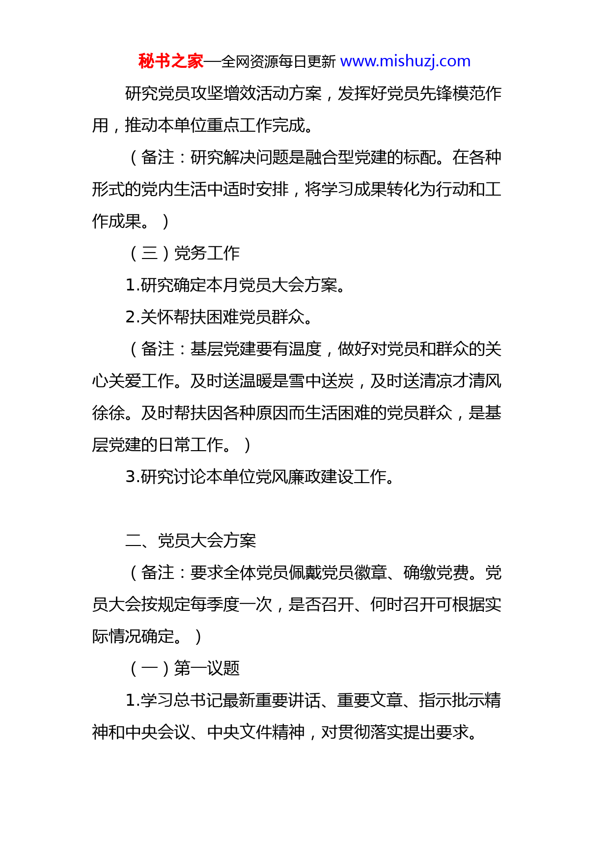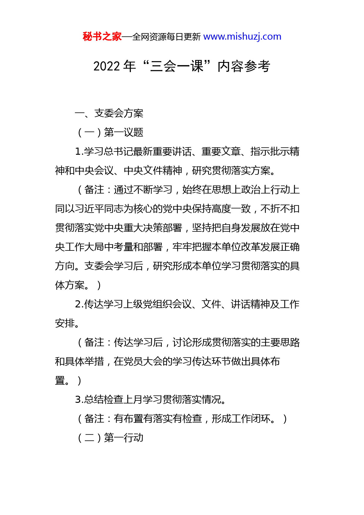 秘书之家—全网资源每日更新www.mishuzj.com2022年“三会一课”内容参考一、支委会方案(一)第一议题1.学习总书记最新重要讲话、重要文章、指示批示精神和中央会议、中央文件精神,研究贯彻落实方案。(备注:通过不断学习,始终在思想上政治上行动上同以习近平同志为核心的党中央保持高度一致,不折不扣贯彻落实党中央重大决策部署,坚持把自身发展放在党中央工作大局中考量和部署,牢牢把握本单位改革发展正确方向。支委会学习后,研究形成本单位学习贯彻落实的具体方案。)2.传达学习上级党组织会议、文件、讲话精神及工作安排。(备注:传达学习后,讨论形成贯彻落实的主要思路和具体举措,在党员大会的学习传达环节做出具体布置。)3.总结检查上月学习贯彻落实情况。(备注:有布置有落实有检查,形成工作闭环。)(二)第一行动秘书之家—全网资源每日更新www.mishuzj.com研究党员攻坚增效活动方案,发挥好党员先锋模范作用,推动本单位重点工作完成。(备注:研究解决问题是融合型党建的标配。在各种形式的党内生活中适时安排,将学习成果转化为行动和工作成果。)(三)党务工作1.研究确定本月党员大会方案。2.关怀帮扶困难党员群众。(备注:基层党建要有温度,做好对党员和群众的关心关爱工作。及时送温暖是雪中送炭,及时送清凉才清风徐徐。及时帮扶因各种原因而生活困难的党员群众,是基层党建的日常工作。)3.研究讨论本单位党风廉政建设工作。二、党员大会方案(备注:要求全体党员佩戴党员徽章、确缴党费。党员大会按规定每季度一次,是否召开、何时召开可根据实际情况确定。)(一)第一议题1.学习总书记最新重要讲话、重要文章、指示批示精神和中央会议、中央文件精神,对贯彻落实提出要求。秘书之家—全网资源每日更新www.mishuzj.com(备注:建立“第一议题”制度,就是在各类会议上,都将学习习近平新时代中国特色社会主义思想作为第一项议题,体现的是学习的及时性。党员大会的学习,更加注重学习“最新最近”的内容。同时,与本行业、本单位相关的内容,也要重点学,做到“联系实际学”。)2.传达学习上级党组织重要会议、重要文件和重要工作。(二)党员行动1.开展“攻坚克难我先行”活动。(备注:将本单位中心工作中的难点或重点工作列出来,以项目管理的形式,组织党员勇挑重担、攻坚克难。更多开展党员行动的方法,见《新时代国企基层党建50讲》)2.讨论决定或者参与决定本部门本单位重要事项。(三)党务工作1.完成上级党组织布置的党务工作;2.组织党员代表,开展送温暖/送清凉活动;3.开展党务(政务)公开等日常工作。三、党小组会方案(一)第一议题学习上级党组织安排的内容。秘书之家—全网资源每日更新www.mishuzj.com按照既定方案,开展专题学习。(备注:党小组会的学习内容,与党员大会的学习内容,要明确区分开来。党员大会的第一议题,学习总书记的重要讲话、指示批示等重要内容,而将主题/系列理论学习的内容,安排到党小组会的第一议题中,体现“系统学”的特点。可以每年列出若干个学习专题,比如《共和国荣光》《最美奋斗者》《马克思主义基本原理》等,对专题内容全面系统地学透学懂。)(二)第一行动开展“每周/每月分享”活动。(备注:每次安排两三位党员或优秀员工,围绕工作中的难点或热点,分享自己的“小体会、小技巧、小方法、小工具、小绝招”,促使大家加强交流、取长补短、提高工作水平。)(三)党务工作完成上级党组织布置的工作和党内事务。四、党课方案(备注:党课每季度一次,何时召开根据实际情况确定。(一)主题:廉洁从业当先锋。(二)方式:秘书之家—全网资源每日更新www.mishuzj.com邀请上级纪检监察部门有关同志,上廉洁从业专题党课,对全体员工开展廉洁从业教育。(三)内容:学习总书记关于纪律检查工作、廉洁从业、作风建设等重要论述,结合本单位实际,梳理存在的问题,讨论进一步加强廉洁从业的举措。(备注:纪律建设常抓不懈,利用上专题党课的形式,及时传达上级要求,及时开展警示教育,及时查找制度和流程缺漏,不断提高廉洁从业能力。专题党课结合本单位实际,邀请关键岗位的党员群众代表参加,对标上级要求,查找本岗位或自己在廉洁从业、作风纪律、担当作为等方面的不足或差距。党支部牵头,列出本单位廉洁从业负面清单,为党员群众划出行为红线,促进党员守纪律、转作风,用一流作风不断做出新贡献。)