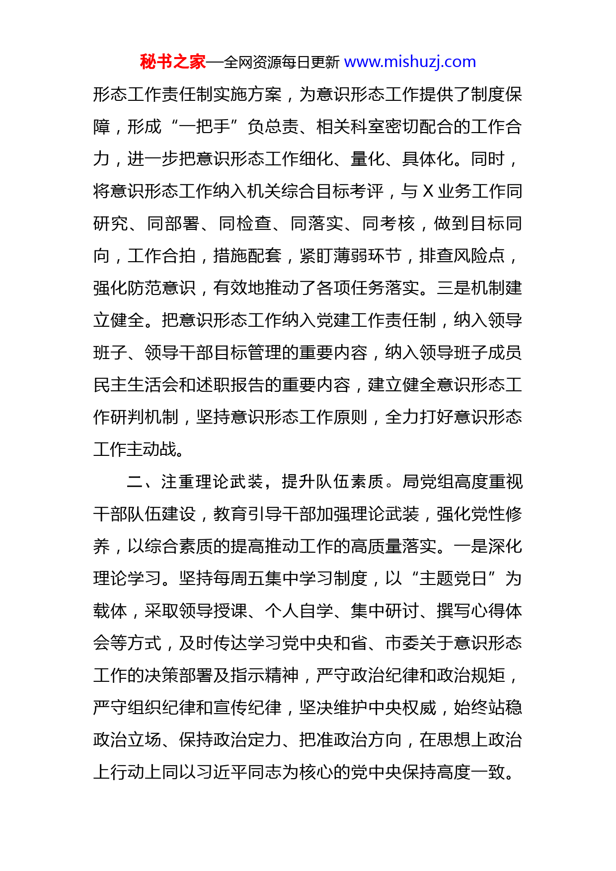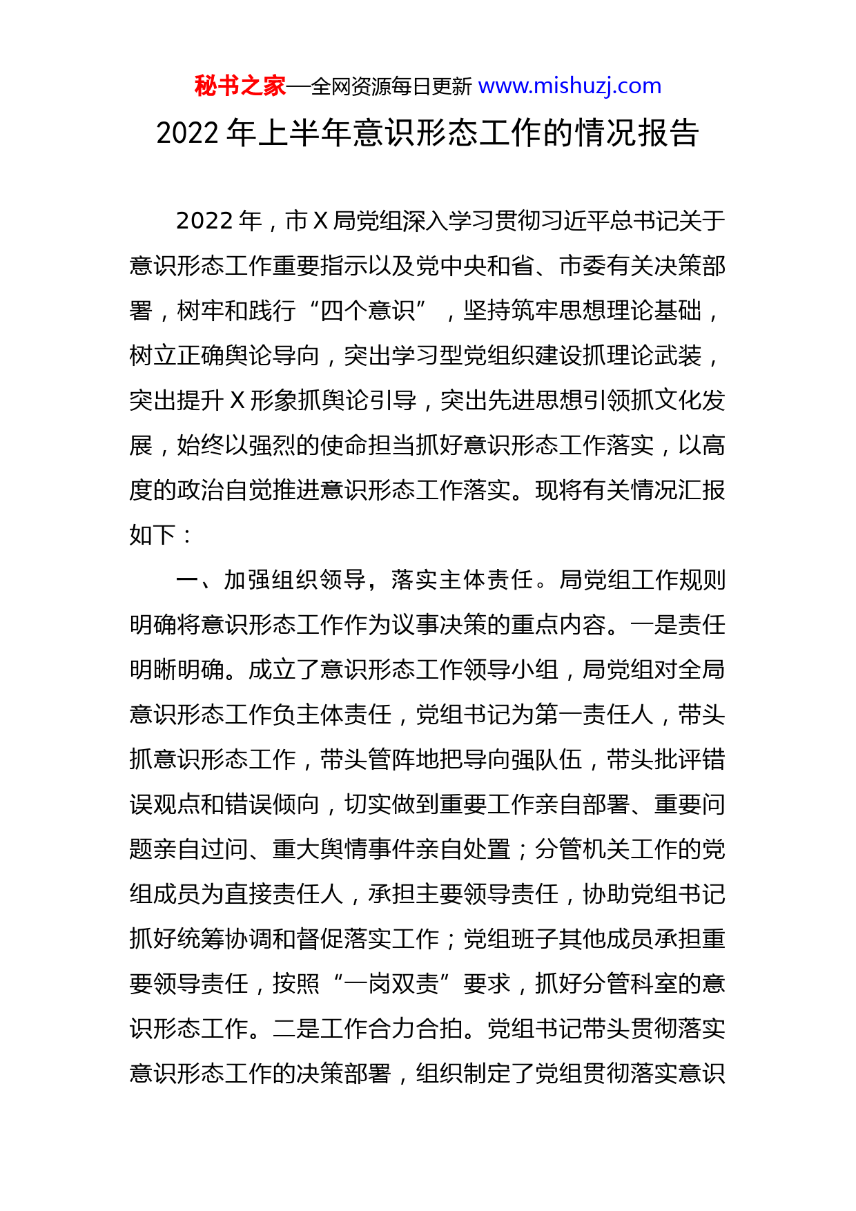 秘书之家—全网资源每日更新www.mishuzj.com2022年上半年意识形态工作的情况报告2022年,市X局党组深入学习贯彻习近平总书记关于意识形态工作重要指示以及党中央和省、市委有关决策部署,树牢和践行“四个意识”,坚持筑牢思想理论基础,树立正确舆论导向,突出学习型党组织建设抓理论武装,突出提升X形象抓舆论引导,突出先进思想引领抓文化发展,始终以强烈的使命担当抓好意识形态工作落实,以高度的政治自觉推进意识形态工作落实。现将有关情况汇报如下:一、加强组织领导,落实主体责任。局党组工作规则明确将意识形态工作作为议事决策的重点内容。一是责任明晰明确。成立了意识形态工作领导小组,局党组对全局意识形态工作负主体责任,党组书记为第一责任人,带头抓意识形态工作,带头管阵地把导向强队伍,带头批评错误观点和错误倾向,切实做到重要工作亲自部署、重要问题亲自过问、重大舆情事件亲自处置;分管机关工作的党组成员为直接责任人,承担主要领导责任,协助党组书记抓好统筹协调和督促落实工作;党组班子其他成员承担重要领导责任,按照“一岗双责”要求,抓好分管科室的意识形态工作。二是工作合力合拍。党组书记带头贯彻落实意识形态工作的决策部署,组织制定了党组贯彻落实意识秘书之家—全网资源每日更新www.mishuzj.com形态工作责任制实施方案,为意识形态工作提供了制度保障,形成“一把手”负总责、相关科室密切配合的工作合力,进一步把意识形态工作细化、量化、具体化。同时,将意识形态工作纳入机关综合目标考评,与X业务工作同研究、同部署、同检查、同落实、同考核,做到目标同向,工作合拍,措施配套,紧盯薄弱环节,排查风险点,强化防范意识,有效地推动了各项任务落实。三是机制建立健全。把意识形态工作纳入党建工作责任制,纳入领导班子、领导干部目标管理的重要内容,纳入领导班子成员民主生活会和述职报告的重要内容,建立健全意识形态工作研判机制,坚持意识形态工作原则,全力打好意识形态工作主动战。二、注重理论武装,提升队伍素质。局党组高度重视干部队伍建设,教育引导干部加强理论武装,强化党性修养,以综合素质的提高推动工作的高质量落实。一是深化理论学习。坚持每周五集中学习制度,以“主题党日”为载体,采取领导授课、个人自学、集中研讨、撰写心得体会等方式,及时传达学习党中央和省、市委关于意识形态工作的决策部署及指示精神,严守政治纪律和政治规矩,严守组织纪律和宣传纪律,坚决维护中央权威,始终站稳政治立场、保持政治定力、把准政治方向,在思想上政治上行动上同以习近平同志为核心的党中央保持高度一致。秘书之家—全网资源每日更新www.mishuzj.com二是优化培训组织。局党组始终把培训学习作为提高干部能力素质的重要途径,建立了学习制度、考核制度、考勤制度、培训制度等学习型党组织建设制度,对学习时间、内容、人员、质量、交流、检查等作了具体明确,形成了用制度管学习、促学习的良好格局。积极参加市委举办的十九届六中全会精神轮训,班子成员先后讲党课X次,党组中心组学习X次,专题研讨X次。三是强化党性修养。局党组高度重视干部党性修养提高,注重在理论学习中塑造,在实践活动中锤炼。今年以来,组织开展“我在基层做X”系列宣传活动,以先进典型的模范事迹和道德感召,培育和践行社会主义核心价值观。同时,举办了全市X系统“党旗下的X干部”知识竞赛,重温党的光辉历程,有效推进了全市X系统党的建设和业务工作双促进双提升,达到了“以比鼓劲、以赛促学”的目的,营造了干事创业、比学赶超的良好氛围,有效提高了X干部素质、促进了X工作文化建设,弘扬了X工作主旋律、传播了X工作正能量。三、抓好舆论引导,凝聚思想共识。在舆论引导与对外宣传中,始终坚持团结稳定鼓劲,正面宣传为主,尊重舆论宣传规律,讲究舆论宣传艺术,提高舆论引导效果,为X工作的改革发展提供了强有力的舆论支持。一是加大正面宣传,传播“正能量”。结合门户网站、微信公众号秘书之家—全网资源每日更新www.mishuzj.com等媒体持续加大X正面宣传力度,由过去“不愿说、不会说、说不好”向“主动说、高调做”转变,通过多渠道、全方位的宣传,讲好人民X故事,传递好人民X声音,为做好X工作集聚了强大的正能量。同时,结合“八五”普法工作,加大法制宣传教育力度,通过在主要街道或广场设置宣传点,悬挂宣传标语,摆放宣传展板,组织现场咨询,以及发送手机短信,在电视台播放宣传片,在报纸、网络刊发X宣传文章,在接待场所张贴宣传资料、发放宣传册等方式,广泛开展X法规制度宣传活动,引导群众依法维权,在全市营造了浓厚的法治X氛围。二是妥善应对舆情,消除“负因子”。针对X工作涉及群众切身利益多的实际,自觉站在维护意识形态安全的高度,牢牢把握正确的舆论导向,在全市X系统建立网宣队伍,完善X网络舆情应急处置机制,加强网络舆情引导和应对工作,特别是在敏感节点和重要时段,专题研究网络热点和舆论风向,及时搜集、研判、处置可能引发不良社会影响的X舆情,加强苗头性、倾向性X信息的分析研判,做到了早发现、早预防。坚持以问题为导向,强化底线思维和风险意识,充分发挥X大数据的优势,加强专题调研和分析研判,及