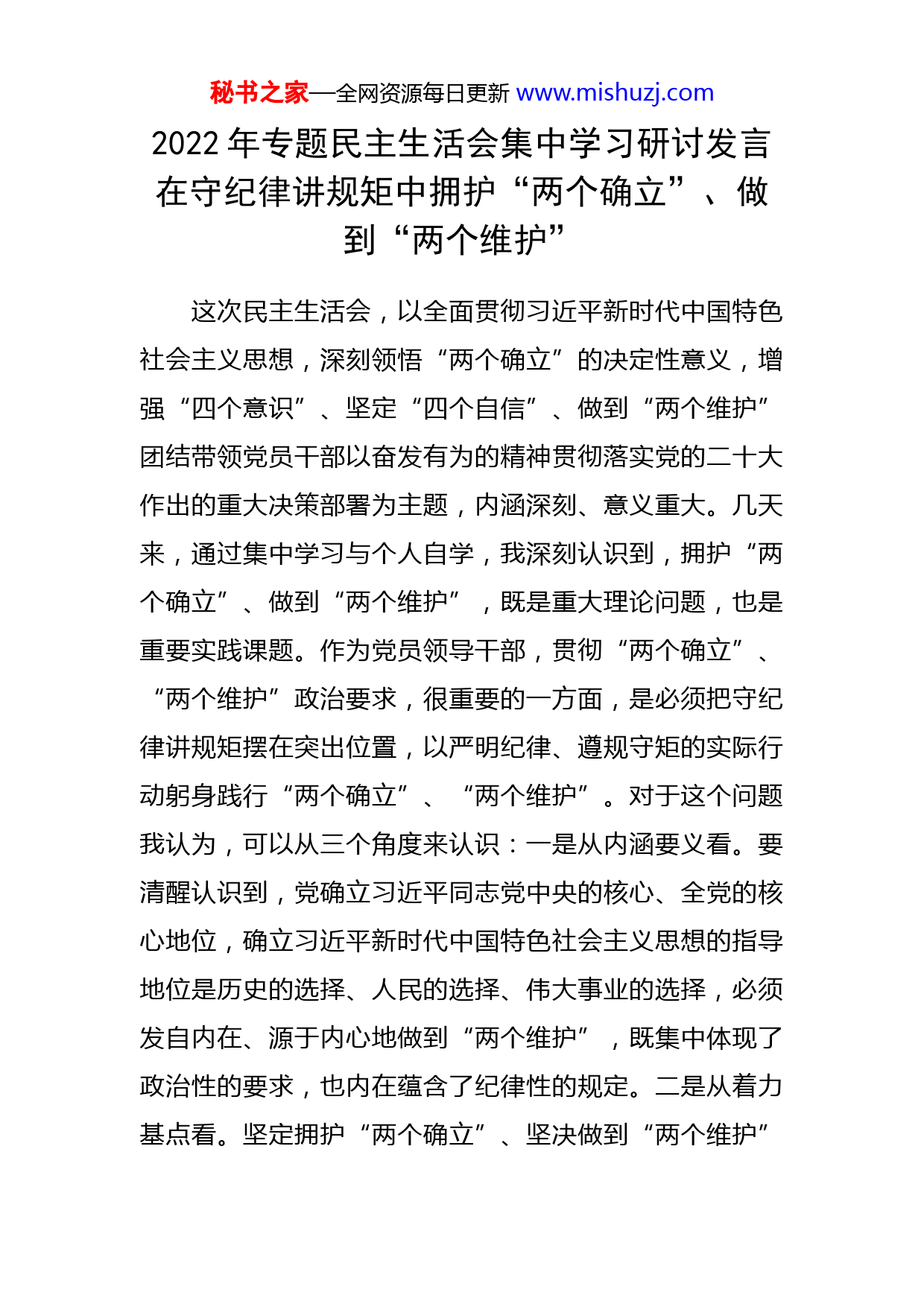 秘书之家—全网资源每日更新www.mishuzj.com2022年专题民主生活会集中学习研讨发言在守纪律讲规矩中拥护“两个确立”、做到“两个维护”这次民主生活会,以全面贯彻习近平新时代中国特色社会主义思想,深刻领悟“两个确立”的决定性意义,增强“四个意识”、坚定“四个自信”、做到“两个维护”团结带领党员干部以奋发有为的精神贯彻落实党的二十大作出的重大决策部署为主题,内涵深刻、意义重大。几天来,通过集中学习与个人自学,我深刻认识到,拥护“两个确立”、做到“两个维护”,既是重大理论问题,也是重要实践课题。作为党员领导干部,贯彻“两个确立”、“两个维护”政治要求,很重要的一方面,是必须把守纪律讲规矩摆在突出位置,以严明纪律、遵规守矩的实际行动躬身践行“两个确立”、“两个维护”。对于这个问题我认为,可以从三个角度来认识:一是从内涵要义看。要清醒认识到,党确立习近平同志党中央的核心、全党的核心地位,确立习近平新时代中国特色社会主义思想的指导地位是历史的选择、人民的选择、伟大事业的选择,必须发自内在、源于内心地做到“两个维护”,既集中体现了政治性的要求,也内在蕴含了纪律性的规定。二是从着力基点看。坚定拥护“两个确立”、坚决做到“两个维护”秘书之家—全网资源每日更新www.mishuzj.com是最严的政治纪律、最硬的政治规矩,根本出发点是锻造领导中国特色社会主义事业的坚强领导核心,这与党的纪律着力于党内团结和集中统一领导的基点是一致的。三是从实践要求看。“两个确立”、“两个维护”必须在严守政治纪律政治规矩、刚性执行组织纪律中立起来、落下去必须坚决做到任何时候都讲“普通话”、都对表“北京时间”,任何情况下都在思想上、政治上、行动上同党中央保持高度一致,坚决做到党叫干啥就干啥,党不叫干啥就坚决不干。对于党员领导干部来讲,如何以自觉严格的纪律推动“两个确立”、“两个维护”践行落地。我认为,需要把握好四个方面:一是思想上铸“魂”,强化自觉性。着眼打牢纪律建设的思想基础,增进践行“两个确立”“两个维护”的敬畏感、认同感、使命感,抓实四个方面学习教育:加强理想信念教育,引导校正“三观”,补足精神上的“钙”,解决好源动力不足的问题;加强党的光荣传统和优良作风教育,引导认清提出“两个确立”“两个维护”的理论本源、历史依据、现实考量和实践要求,解决认知实践有偏差的问题;加强警示案例教育,引导认清破坏纪律规矩的危害影响,解决对“两个确立”“两个维护”敬畏不够的问题。二是作风上塑“形”,保持经常性。抓住作风和风气秘书之家—全网资源每日更新www.mishuzj.com问题影响面最广、渗透性最强的特点,努力把“两个确立”“两个维护”转化为党员干部遵规守纪的言行规范、行为准则和具体行动。注重抓常,就是要从反对“四风”回归党的光荣传统和优良作风中破题,把“两个确立”“两个维护”有机融入作风和风气建设方方面面,提供看得见、摸得着的有力抓手;注重抓细,就是从解决作风和风气建设的具体问题切入,统筹推进作风建设和纪律建设以改进作风的成效促进纪律建设,以纪律建设的成果保证“两个确立”“两个维护”;注重抓长,就是要反复抓、持续抓,在坚持中深化、在深化中坚持,为践行“两个确立”“两个维护”营造风清气正、纪律严明的良好环境。三是组织上立“根”,立起导向性。严明的组织纪律和组织规矩,既是维护党的团结统一的重要保证,也是坚定“两个确立”“两个维护”鲜明立场的力量源泉。实践中,应着力抓好三个方面:贯彻民主集中制根本原则,依据民主集中制细化梳理组织观念、组织程序、组织纪律方面的问题清单,运用体系化治理、工程化推进思想方法抓问题整改归零,让党员干部好对照、纪律规矩能落实;抓实组织生活制度基本依托,在刚性落实组织生活制度中严格党内生活和党性修炼,使党员干部感受到组织的严密性纪律的严格性,营造敬畏组织、遵守纪律的浓厚氛围;落实党管党员、党管干部重要责任,党组织要以敢抓敢管的秘书之家—全网资源每日更新www.mishuzj.com担当精神,抓好党员干部教育管理各项措施落实,不断强化党员干部党的意识、党员意识和服从意识,依靠坚强党性提升践行“两个确立”“两个维护”的实效性。四是制度上固“本”,增强强制性。重点是抓住三个字着力:维护法规制度之“威”,引导党员干部充分认清维护制度权威和“两个确立”“两个维护”的内在一致性和关联性,以身作则遵守规定、落实制度,坚决破除规定之外搞规定、细则之外搞细则,切实维护制度权威;强化刚性执行之“力”,强化制度落实的过程管理,跟踪掌握制度执行结果,坚持抓早抓小、防微杜渐,坚持挺纪在前违纪必纠,确保制度管得住、用得好;织密党内监督之“网”,主体上着力推动组织监督、民主监督互为补充、有机统一,对象上突出党员领导干部和“个别人”,时段上突出“八小时以外”,内容上突出政治纪律政治规矩、调整改革纪律和新规禁令执行,以严密健全的监督体系为“两个确立”“两个维护”提供纪律保证。