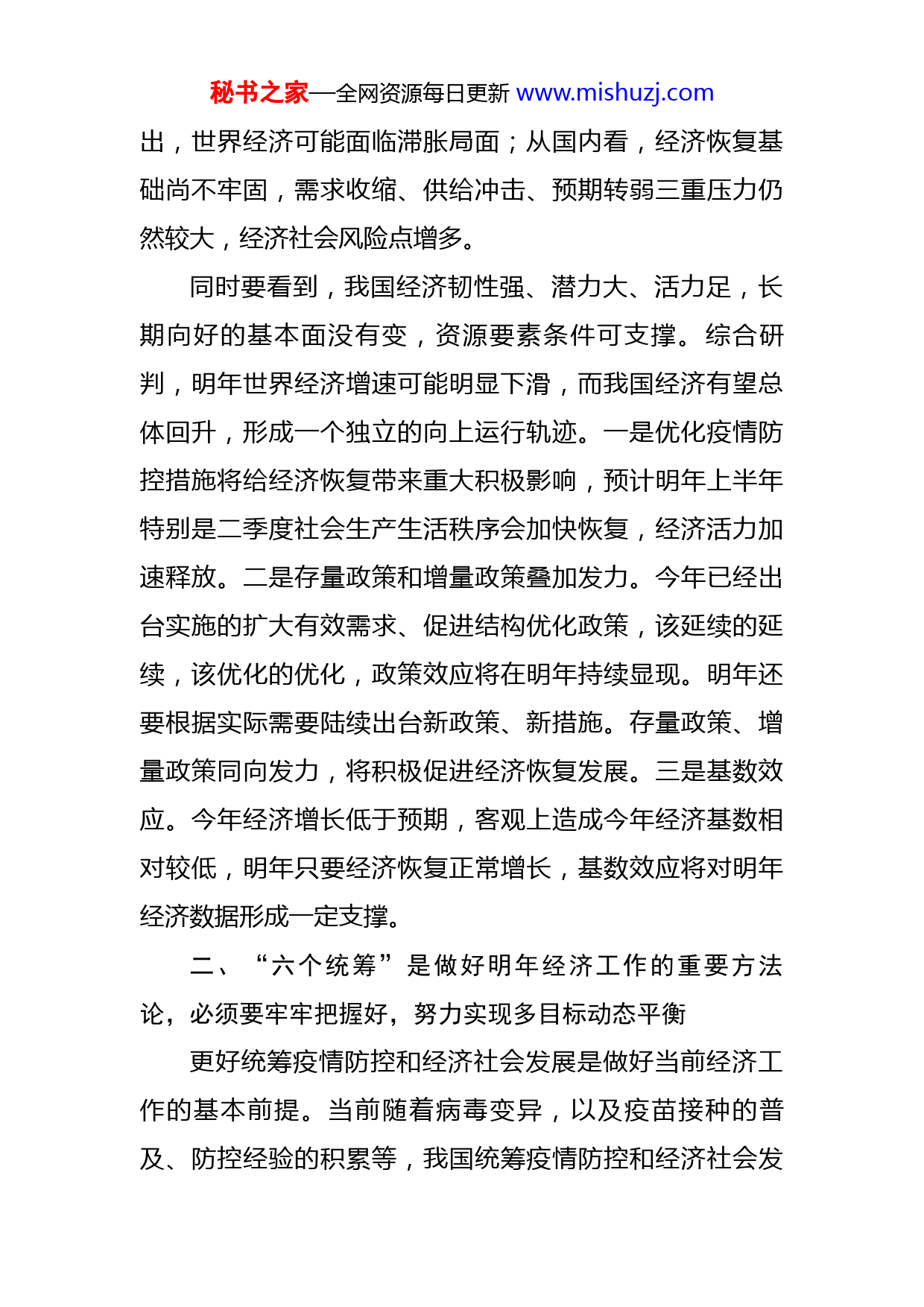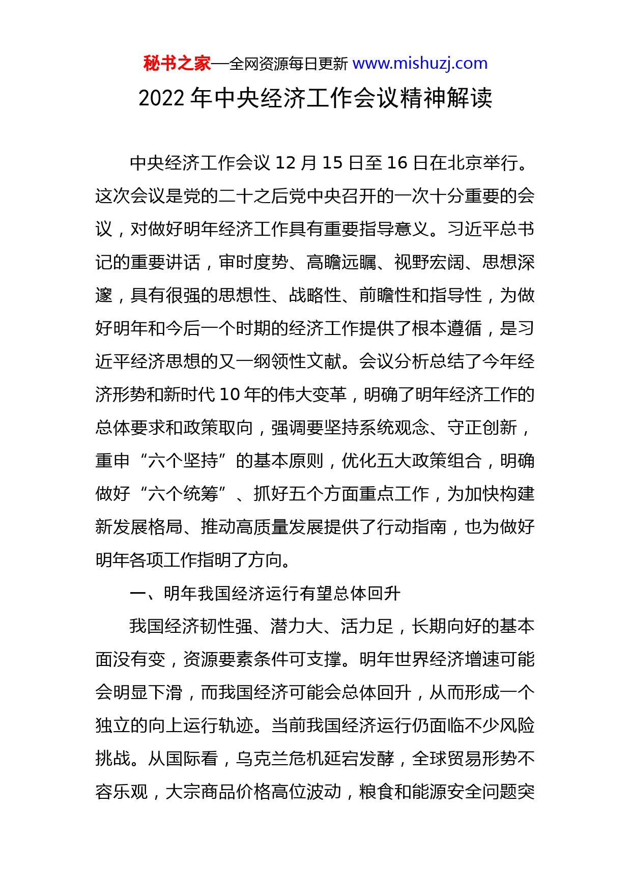 秘书之家—全网资源每日更新www.mishuzj.com2022年中央经济工作会议精神解读中央经济工作会议12月15日至16日在北京举行。这次会议是党的二十之后党中央召开的一次十分重要的会议,对做好明年经济工作具有重要指导意义。习近平总书记的重要讲话,审时度势、高瞻远瞩、视野宏阔、思想深邃,具有很强的思想性、战略性、前瞻性和指导性,为做好明年和今后一个时期的经济工作提供了根本遵循,是习近平经济思想的又一纲领性文献。会议分析总结了今年经济形势和新时代10年的伟大变革,明确了明年经济工作的总体要求和政策取向,强调要坚持系统观念、守正创新,重申“六个坚持”的基本原则,优化五大政策组合,明确做好“六个统筹”、抓好五个方面重点工作,为加快构建新发展格局、推动高质量发展提供了行动指南,也为做好明年各项工作指明了方向。一、明年我国经济运行有望总体回升我国经济韧性强、潜力大、活力足,长期向好的基本面没有变,资源要素条件可支撑。明年世界经济增速可能会明显下滑,而我国经济可能会总体回升,从而形成一个独立的向上运行轨迹。当前我国经济运行仍面临不少风险挑战。从国际看,乌克兰危机延宕发酵,全球贸易形势不容乐观,大宗商品价格高位波动,粮食和能源安全问题突秘书之家—全网资源每日更新www.mishuzj.com出,世界经济可能面临滞胀局面;从国内看,经济恢复基础尚不牢固,需求收缩、供给冲击、预期转弱三重压力仍然较大,经济社会风险点增多。同时要看到,我国经济韧性强、潜力大、活力足,长期向好的基本面没有变,资源要素条件可支撑。综合研判,明年世界经济增速可能明显下滑,而我国经济有望总体回升,形成一个独立的向上运行轨迹。一是优化疫情防控措施将给经济恢复带来重大积极影响,预计明年上半年特别是二季度社会生产生活秩序会加快恢复,经济活力加速释放。二是存量政策和增量政策叠加发力。今年已经出台实施的扩大有效需求、促进结构优化政策,该延续的延续,该优化的优化,政策效应将在明年持续显现。明年还要根据实际需要陆续出台新政策、新措施。存量政策、增量政策同向发力,将积极促进经济恢复发展。三是基数效应。今年经济增长低于预期,客观上造成今年经济基数相对较低,明年只要经济恢复正常增长,基数效应将对明年经济数据形成一定支撑。二、“六个统筹”是做好明年经济工作的重要方法论,必须要牢牢把握好,努力实现多目标动态平衡更好统筹疫情防控和经济社会发展是做好当前经济工作的基本前提。当前随着病毒变异,以及疫苗接种的普及、防控经验的积累等,我国统筹疫情防控和经济社会发秘书之家—全网资源每日更新www.mishuzj.com展面临新形势新任务。我们要抓住这一重要时间窗口,一方面,因时因势不断优化调整疫情防控措施,认真落实新阶段疫情防控各项举措,切实抓好群众的就医用药,集中医疗资源,重点抓好老年人和患基础性疾病群体的防控,着力保健康、防重症。另一方面,就是要不遗余力坚持在常态化疫情防控中加快推进生产生活秩序稳步恢复,为明年经济运行整体好转做好充分准备。更好统筹经济质的有效提升和量的合理增长是推动经济韧性发展的关键所在。我们必须从战略高度充分认识保持经济发展质和量的有机统一是推动我国经济韧性发展的关键所在。一是要继续坚持稳中求进工作总基调,突出做好稳增长、稳就业、稳物价工作,加快推动经济运行整体好转。二是要完整准确全面贯彻新发展理念,推动实现创新成为第一动力、协调成为内生特点、绿色成为普遍形态、开放成为必由之路、共享成为根本目的的高质量发展,加快推动经济发展质量变革、效率变革、动力变革。三是要把推动经济质的有效提升和量的合理增长贯穿全面建设社会主义现代化国家整个过程,持续激发经济发展内生动力,形成全国上下竞相推动高质量发展的浓厚社会氛围和强大合力。更好统筹供给侧结构性改革和扩大内需是实现经济运行好转的重要抓手。更好统筹供给侧结构性改革和扩大内需,就是要从总供给和总需求两端协同发力、共同配合,形成两者有机结秘书之家—全网资源每日更新www.mishuzj.com合新的战略导向,推动有效需求和有效供给、消费和投资、内需和外需、自立自强和开放合作的高水平动态平衡,从而释放总供给和总需求相互促进的巨大发展潜能。做好明年经济工作,就是以供求两端为重要抓手,推动后疫情时代我国经济运行整体好转。更好统筹经济政策和其他政策是促进经济回稳向上的有力保证。宏观政策是推进经济尽快复苏的重要激励工具,也是促进经济回稳向上的政策保障。中央经济工作会议不仅关注财政货币政策之间传导和协同的有效性,也着重提出了产业政策要发展和安全并举,优化产业政策实施方式,推动“科技—产业—金融”良性循环;科技政策聚焦自立自强,有力统筹教育、科技、人才战略实施;社会政策要兜牢民生底线,尤其要落实落细就业优先政策,切实建牢民生保障的“防护网”“安全网”。更好统筹国内循环和国际循环是重塑经济竞争新优势的基础支撑。构建新发展格局的关键在于经济循环的畅通无阻。其核心要义就是:对于实现国内大循环更为顺畅,就要切实打通经济循环堵点,加快构建高标准市场体系,促进各类生产