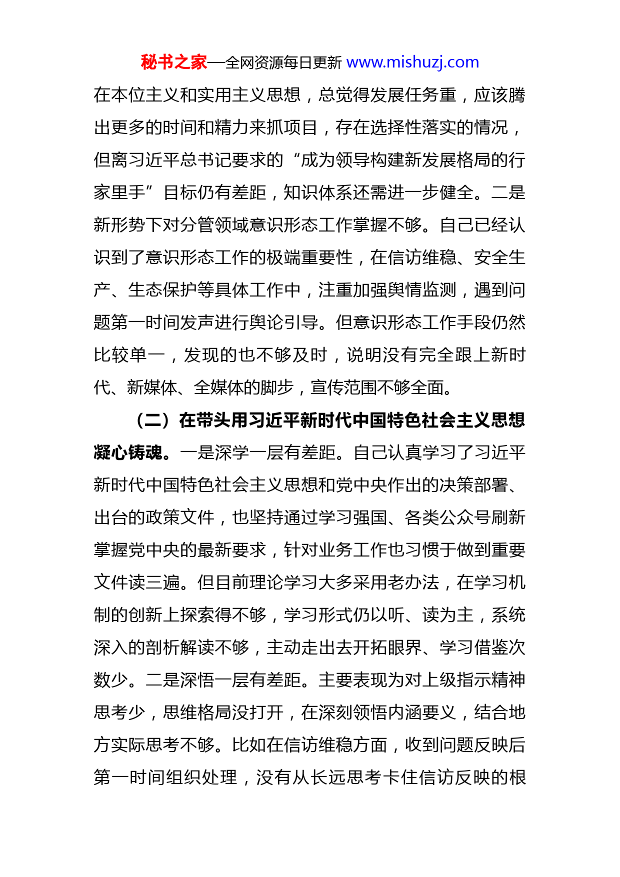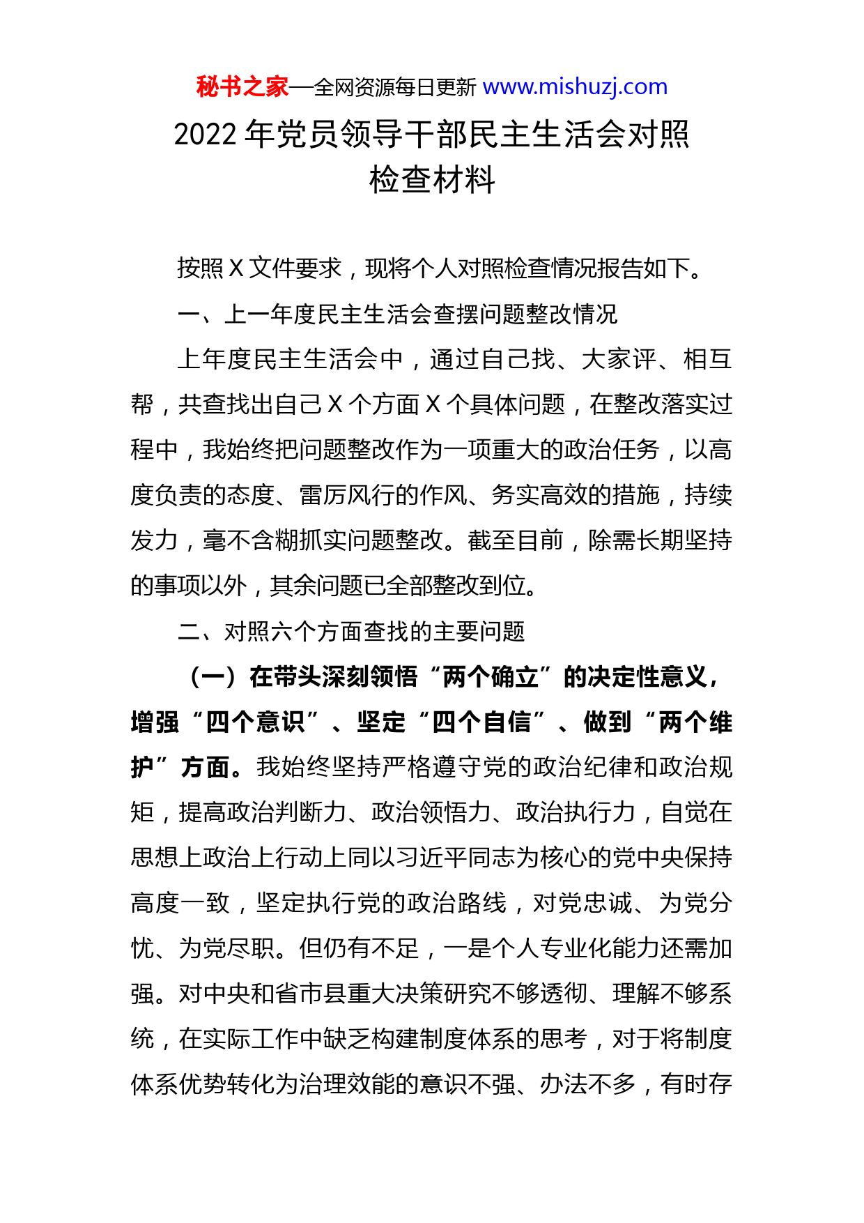 秘书之家—全网资源每日更新www.mishuzj.com2022年党员领导干部民主生活会对照检查材料按照X文件要求,现将个人对照检查情况报告如下。一、上一年度民主生活会查摆问题整改情况上年度民主生活会中,通过自己找、大家评、相互帮,共查找出自己X个方面X个具体问题,在整改落实过程中,我始终把问题整改作为一项重大的政治任务,以高度负责的态度、雷厉风行的作风、务实高效的措施,持续发力,毫不含糊抓实问题整改。截至目前,除需长期坚持的事项以外,其余问题已全部整改到位。二、对照六个方面查找的主要问题(一)在带头深刻领悟“两个确立”的决定性意义,增强“四个意识”、坚定“四个自信”、做到“两个维护”方面。我始终坚持严格遵守党的政治纪律和政治规矩,提高政治判断力、政治领悟力、政治执行力,自觉在思想上政治上行动上同以习近平同志为核心的党中央保持高度一致,坚定执行党的政治路线,对党忠诚、为党分忧、为党尽职。但仍有不足,一是个人专业化能力还需加强。对中央和省市县重大决策研究不够透彻、理解不够系统,在实际工作中缺乏构建制度体系的思考,对于将制度体系优势转化为治理效能的意识不强、办法不多,有时存秘书之家—全网资源每日更新www.mishuzj.com在本位主义和实用主义思想,总觉得发展任务重,应该腾出更多的时间和精力来抓项目,存在选择性落实的情况,但离习近平总书记要求的“成为领导构建新发展格局的行家里手”目标仍有差距,知识体系还需进一步健全。二是新形势下对分管领域意识形态工作掌握不够。自己已经认识到了意识形态工作的极端重要性,在信访维稳、安全生产、生态保护等具体工作中,注重加强舆情监测,遇到问题第一时间发声进行舆论引导。但意识形态工作手段仍然比较单一,发现的也不够及时,说明没有完全跟上新时代、新媒体、全媒体的脚步,宣传范围不够全面。(二)在带头用习近平新时代中国特色社会主义思想凝心铸魂。一是深学一层有差距。自己认真学习了习近平新时代中国特色社会主义思想和党中央作出的决策部署、出台的政策文件,也坚持通过学习强国、各类公众号刷新掌握党中央的最新要求,针对业务工作也习惯于做到重要文件读三遍。但目前理论学习大多采用老办法,在学习机制的创新上探索得不够,学习形式仍以听、读为主,系统深入的剖析解读不够,主动走出去开拓眼界、学习借鉴次数少。二是深悟一层有差距。主要表现为对上级指示精神思考少,思维格局没打开,在深刻领悟内涵要义,结合地方实际思考不够。比如在信访维稳方面,收到问题反映后第一时间组织处理,没有从长远思考卡住信访反映的根秘书之家—全网资源每日更新www.mishuzj.com源,“疏堵结合”做的不好。三是深用一层有差距。主要表现为学用结合、学以致用做得不够,对“六个必须坚持”不能全面掌握,把主要精力放在了落实任务、完成年度目标、推进重点工作中。比如,对习近平新时代中国特色社会主义思想深刻内涵、核心要义等理解把握不够透彻,往深里走、往心里走、往实里走上还有明确差距,对亮点工作提炼不够。(三)在带头坚持和加强党的全面领导方面。一是一抓到底的韧劲有所减退。自己在坚决贯彻落实中央、省委、市委、县委各项决策部署方面,能够坚持“问题工作法”,不回避矛盾、不遮掩问题,敢于动真碰硬,以问题解决有效推动工作落实。但对个别问题的艰巨性和复杂性认识不足,放松了警惕,没有盯紧盯牢、一抓到底。二是开拓创新意识不够。有时认为只要工作中坚持原则,遵照上级部署要求,不出差错,按部就班完成上级安排的任务就可以,锐意进取、永不懈怠的精神状态和敢闯敢干、一往无前的奋斗姿态发挥的不够充分。(四)在带头坚持以人民为中心的发展思想,推动改革发展稳定方面。一是联系群众不够密切。对分管部门人员联系较多,但与群众沟通交流少,主动深入挂联帮扶群众调查研究的时间少,了解群众心声的次数还不够。二是抓落实措施办法还不够有力。在面对实际工作中出现的新秘书之家—全网资源每日更新www.mishuzj.com情况、新问题,个别时候沿用老思路、老办法、旧经验推进,新思路、新办法、新政策、新趋势研究不透彻,所提解决办法与上级高质量工作要求不匹配。(五)在带头发扬斗争精神,防范化解风险挑战方面。一是工作思路不够开阔、创新不够,满足于现状的现象还偶尔存在。二是有些工作停留在文件、会议层面,针对性和操作性不强,缺乏一抓到底的劲头,督促落实不够,导致一些突出问题得不到有效解决。三是在落实八项规定精神、省委省政府十项规定精神和市县有关规定要求上,以上率下的作用没有充分发挥,对干部的监督管理开展的不深入、不到位。(六)在带头落实全面从严治党政治责任方面。主要表现在对分管领域党员干部的提醒、批评、教育、警示、关心不够,个别党员干部纪律规矩意识不强,缺乏敬畏党纪党规、敬畏法律法规、敬畏岗位之心,踩“底线”、越“红线”。三、产生问题的原因分析(一)理想信念有所淡化,“总开关”拧得不紧。把更多的精力放在了具体工作专业知识学习上,没有持续不断地加强政治理论、思想文化等修养,放松了对党性锻炼的要求。究其根本,主要是把政治理论学习当成了“软指标”,急用现学多,静