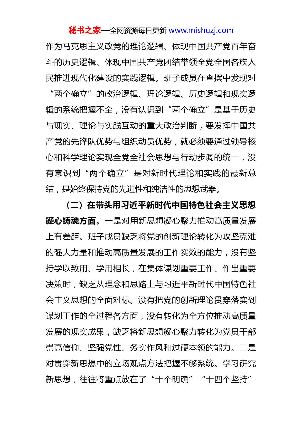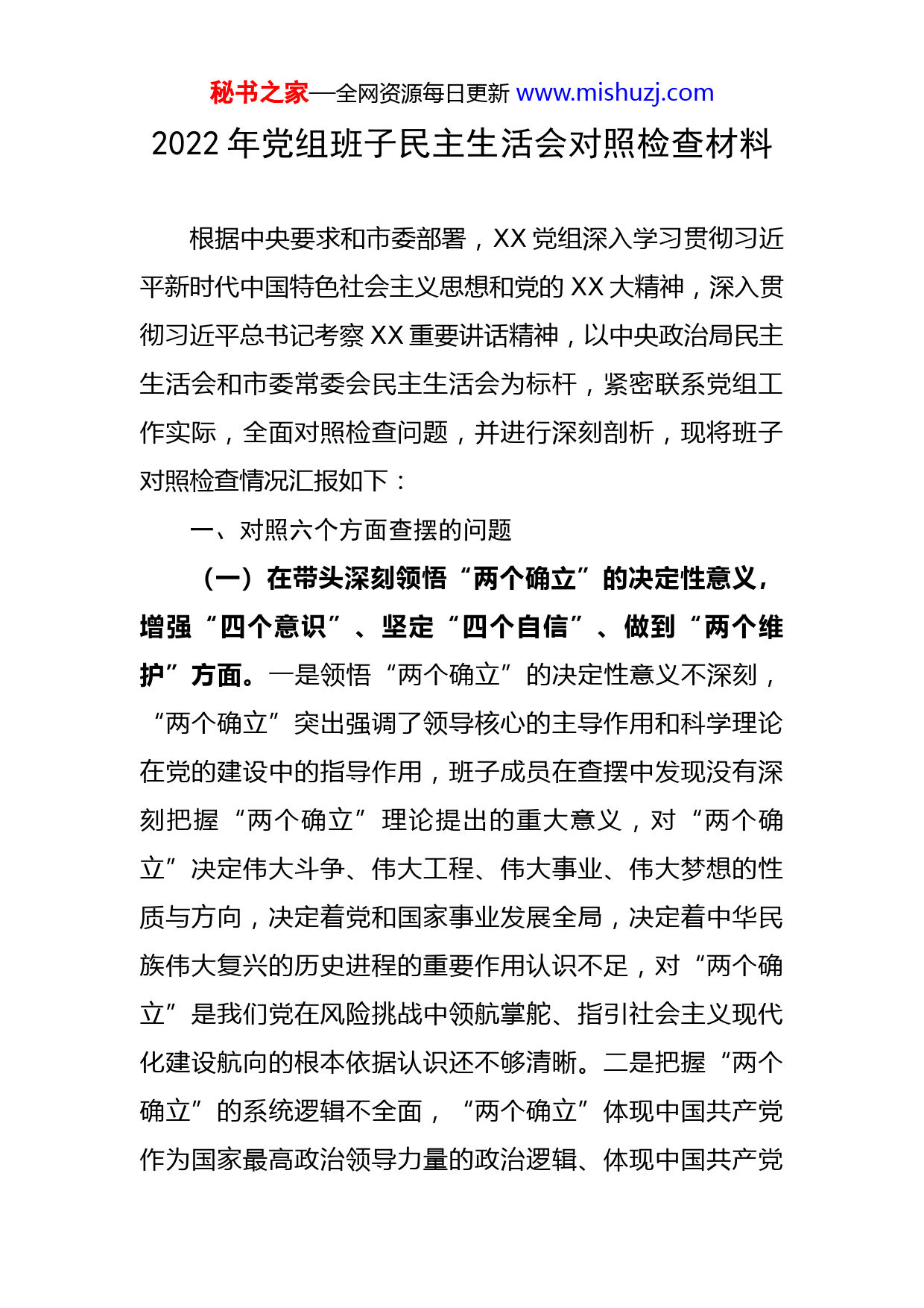 秘书之家—全网资源每日更新www.mishuzj.com2022年党组班子民主生活会对照检查材料根据中央要求和市委部署,XX党组深入学习贯彻习近平新时代中国特色社会主义思想和党的XX大精神,深入贯彻习近平总书记考察XX重要讲话精神,以中央政治局民主生活会和市委常委会民主生活会为标杆,紧密联系党组工作实际,全面对照检查问题,并进行深刻剖析,现将班子对照检查情况汇报如下:一、对照六个方面查摆的问题(一)在带头深刻领悟“两个确立”的决定性意义,增强“四个意识”、坚定“四个自信”、做到“两个维护”方面。一是领悟“两个确立”的决定性意义不深刻,“两个确立”突出强调了领导核心的主导作用和科学理论在党的建设中的指导作用,班子成员在查摆中发现没有深刻把握“两个确立”理论提出的重大意义,对“两个确立”决定伟大斗争、伟大工程、伟大事业、伟大梦想的性质与方向,决定着党和国家事业发展全局,决定着中华民族伟大复兴的历史进程的重要作用认识不足,对“两个确立”是我们党在风险挑战中领航掌舵、指引社会主义现代化建设航向的根本依据认识还不够清晰。二是把握“两个确立”的系统逻辑不全面,“两个确立”体现中国共产党作为国家最高政治领导力量的政治逻辑、体现中国共产党秘书之家—全网资源每日更新www.mishuzj.com作为马克思主义政党的理论逻辑、体现中国共产党百年奋斗的历史逻辑、体现中国共产党团结带领全党全国各族人民推进现代化建设的实践逻辑。班子成员在查摆中发现对“两个确立”的政治逻辑、理论逻辑、历史逻辑和现实逻辑的系统把握不全,没有认识到“两个确立”是基于历史与现实、理论与实践互动的重大政治判断,要发挥中国共产党的先锋队优势与组织动员优势,就必须要通过领导核心和科学理论实现全党全社会思想与行动步调的统一,没有意识到“两个确立”是对新时代理论和实践的最新总结,是始终保持党的先进性和纯洁性的思想武器。(二)在带头用习近平新时代中国特色社会主义思想凝心铸魂方面。一是对用新思想凝心聚力推动高质量发展上有差距。班子成员缺乏将党的创新理论转化为攻坚克难的强大力量和推动高质量发展的工作实效的能力,没有坚持学以致用、学用相长,在集体谋划重要工作、作出重要决策时,缺乏从理念和思路上与习近平新时代中国特色社会主义思想的全面对标。没有把党的创新理论贯穿落实到谋划工作的全过程各方面,没有转化为全方位推动高质量发展的现实成果,缺乏将新思想凝心聚力转化为党员干部崇高信仰、坚强党性、务实作风和过硬本领的能力。二是对贯穿新思想中的立场观点方法把握不够系统。学习研究新思想,往往将重点放在了“十个明确”“十四个坚持”秘书之家—全网资源每日更新www.mishuzj.com“十三个方面成就”等具体内容上,主观上认为只要把这些关键性的内容学深悟透,就可以实现学思用贯通、知信行统一。因此,将主要精力放在了用心体悟其中的具体内容上,但缺乏系统思维,未在头脑中搭建完整的新思想理论体系,对三者之间的辩证统一关系,以及形成、发展历程,缺乏系统性思考研究,使自己缺少统筹兼顾、科学把握的理论底蕴和政治能力,不能及时有效地理解、把握和消化贯穿其中的立场观点方法。(三)在带头坚持和加强党的全面领导方面。一是在贯彻落实民主集中制上不彻底,部分班子成员发表意见往往是“没意见”、“同意”等所谓意见,在具体原则问题上规避矛盾,正确的不据理力争,错误的放弃斗争,有意在妥协上寻求结果,部分班子成员甘当老好人,在班子研究和决定问题时看主要领导的脸色行事,偏注于各种关系的左右逢源,害怕得罪人,部分班子成员甚至不掩饰“明知不对,少说为佳,明哲保身,但求无过”的思想或行为,等等。这些表现实际上虚化和扰乱了民主集中制的贯彻执行。二是党对重大工作的领导体制发挥不充分,班子成员在查摆中发现请示报告制度执行不严密,有的同志习惯于把分管工作当成自己的禁脔,觉得既然分管就没有必要报告了,也不希望其他人来过问,有的甚至不愿意党委过问,削弱了党把方向、谋大局、定政策、促改革的能力秘书之家—全网资源每日更新www.mishuzj.com和定力。(四)在带头坚持以人民为中心的发展思想,推动改革发展稳定方面。一是聚焦中心工作引领改革发展作用不强,表现在部分班子成员的业务素质与履行职责要求有差距,在中心工作的改革攻坚中举措不够用力,在抓经济发展、平安建设、精神文明、教育医疗、综合治理、城市管理、环境卫生等方面存在工作短板,区位优势发挥不明显,在经济结构优化、转型提质增效上用力不足,在落实“放管服”改革、优化营商环境、服务经济综合体上创新举措不够,推进乡村振兴站位不够高,推动特色产业发展招法不多,推动机关机构改革力度不大,成效不显著,改了跟没改一个样。二是聚焦职能职责担当进取意识不强。部分班子成员在遇到复杂情况时偶有不敢担当、不愿负责、畏首畏尾的情况,被动等上级部署,推一推动一动,往往错失战机。对有些工作,存在拖拉疲沓的情况,没能及时摸清楚工作情况,反应不够迅速,工作效率不够高。层层抓责任落实的决心不够坚定,举措不够得力。部分班子成员面对中心工作所面临的风险挑战,韧劲、