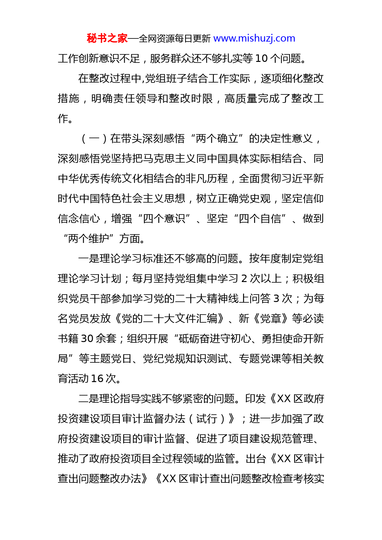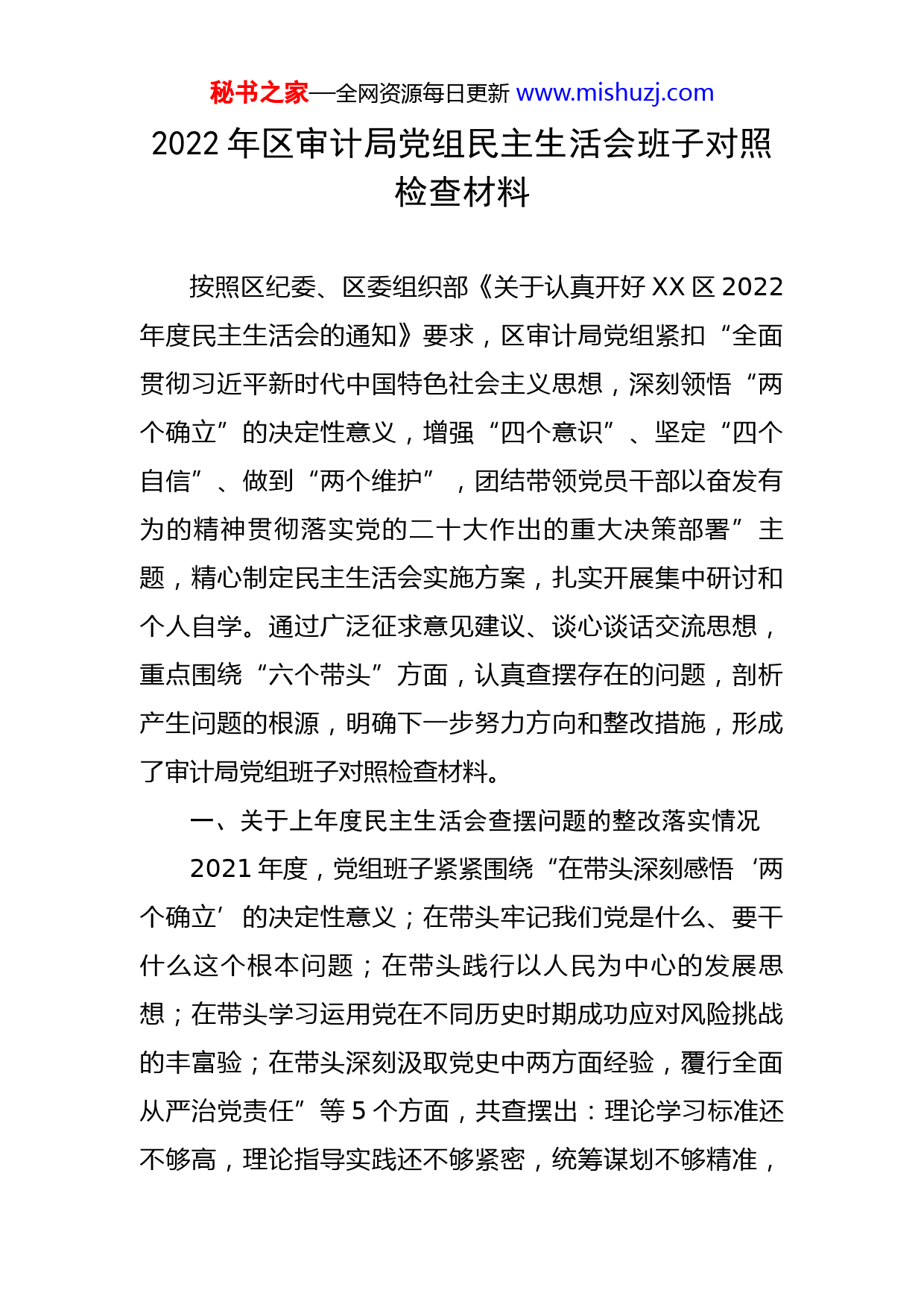 秘书之家—全网资源每日更新www.mishuzj.com2022年区审计局党组民主生活会班子对照检查材料按照区纪委、区委组织部《关于认真开好XX区2022年度民主生活会的通知》要求,区审计局党组紧扣“全面贯彻习近平新时代中国特色社会主义思想,深刻领悟“两个确立”的决定性意义,增强“四个意识”、坚定“四个自信”、做到“两个维护”,团结带领党员干部以奋发有为的精神贯彻落实党的二十大作出的重大决策部署”主题,精心制定民主生活会实施方案,扎实开展集中研讨和个人自学。通过广泛征求意见建议、谈心谈话交流思想,重点围绕“六个带头”方面,认真查摆存在的问题,剖析产生问题的根源,明确下一步努力方向和整改措施,形成了审计局党组班子对照检查材料。一、关于上年度民主生活会查摆问题的整改落实情况2021年度,党组班子紧紧围绕“在带头深刻感悟‘两个确立’的决定性意义;在带头牢记我们党是什么、要干什么这个根本问题;在带头践行以人民为中心的发展思想;在带头学习运用党在不同历史时期成功应对风险挑战的丰富验;在带头深刻汲取党史中两方面经验,覆行全面从严治党责任”等5个方面,共查摆出:理论学习标准还不够高,理论指导实践还不够紧密,统筹谋划不够精准,秘书之家—全网资源每日更新www.mishuzj.com工作创新意识不足,服务群众还不够扎实等10个问题。在整改过程中,党组班子结合工作实际,逐项细化整改措施,明确责任领导和整改时限,高质量完成了整改工作。(一)在带头深刻感悟“两个确立”的决定性意义,深刻感悟党坚持把马克思主义同中国具体实际相结合、同中华优秀传统文化相结合的非凡历程,全面贯彻习近平新时代中国特色社会主义思想,树立正确党史观,坚定信仰信念信心,增强“四个意识”、坚定“四个自信”、做到“两个维护”方面。一是理论学习标准还不够高的问题。按年度制定党组理论学习计划;每月坚持党组集中学习2次以上;积极组织党员干部参加学习党的二十大精神线上问答3次;为每名党员发放《党的二十大文件汇编》、新《党章》等必读书籍30余套;组织开展“砥砺奋进守初心、勇担使命开新局”等主题党日、党纪党规知识测试、专题党课等相关教育活动16次。二是理论指导实践不够紧密的问题。印发《XX区政府投资建设项目审计监督办法(试行)》;进一步加强了政府投资建设项目的审计监督、促进了项目建设规范管理、推动了政府投资项目全过程领域的监管。出台《XX区审计查出问题整改办法》《XX区审计查出问题整改检查考核实秘书之家—全网资源每日更新www.mishuzj.com施细则》,从制度层面对审计整改工作进行规范。(二)在带头牢记我们党是什么、要干什么这个根本问题,心怀“国之大者”,贯彻新发展理念,覆职尽责、担当作为,聚焦新冠肺炎疫情防控、保持经济发展、深化改革开放、维护社会稳定等正在做的工作,不折不扣把党中央决策部署落实到位方面。一是统筹谋划不够精准的问题。全年向区委审计委员会报告全国和省市审计工作会议精神、年度审计项目计划、《XX区“十四五”审计工作发展规划》、经济责任审计结果等重要事项、请示、报告、信息12篇/次。二是工作创新意识不足的问题。结合审计对象及其所属行业相关政策法规、发展现状、业务运行、内部管理等情况,绘制审计“作战图”,做足审前准备。灵活运用“大兵团”组织方式,打破原有科室界限,抽调各业务骨干组建审计组,构建审计工作“一盘棋”。(三)在带头践行以人民为中心的发展思想,尊重群众意愿,为群众办实事解难题,有效保障改善民生,增强人民群众获得感幸福感安全感,确保党永远保持同人民群众的血肉联系方面。一是调研走访还不够深的问题。认真开展“践行服务初心、审计与你同行”“党员示范亮身份、担当作为树形象”服务活动;20名党员干部积极参与疫情防控值守、乡秘书之家—全网资源每日更新www.mishuzj.com村振兴环境治理、文明城市创建;确定“切口小、可落实”的承诺事项19条,目前已践诺14条,服务群众85人次,解决实际问题3个。在2022年下半年群众满意度测评中,位列全区第一名。二是服务群众还不够扎实的问题。认真做好群众最关心最现实利益问题的审计,组织开展清理拖欠中小企业账款、医疗保险基金及“三医联动”改革、应对新冠肺炎疫情防控资金和捐赠款物、粮食购销领域腐败等民生审计项目4个。(四)在带头学习运用党在不同历史时期成功应对风险挑战的丰富验,增强忧患意识,保持战略定力,提高能力本领,敢于斗争、善于斗争,不断取得新的胜利和荣光方面。一是敢打善拼的锐气有所消退的问题。针对2021年度审计查出的XX个各类问题,局党组通过科室认领、制定整改清单等方式,紧盯问题不放松;整改率达XX%。促进拨付、盘活、追回资金总额XX万元。二是意识形态领域的斗争还有短板的问题。认真贯彻落实《党委(党组)意识形态工作责任制实施办法》,积极开展审计宣传,宣传稿件被《XXX报》、省市审计部门门户网站采用20多篇。(五)在带头深刻汲取党史中两方面经验,覆行全面秘书之家—全网资源每日更新www.mishuzj.com从严治党责任,旗帜鲜明讲政治,严守党的政治纪律和政治规矩,落实中央八项规定及其实施精神,持续用力纠“四风”、树新风,坚决反对形贰主义官僚主义,