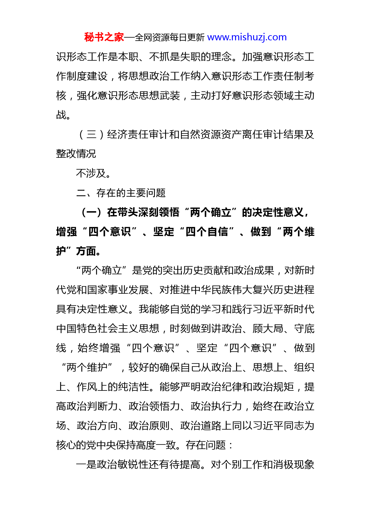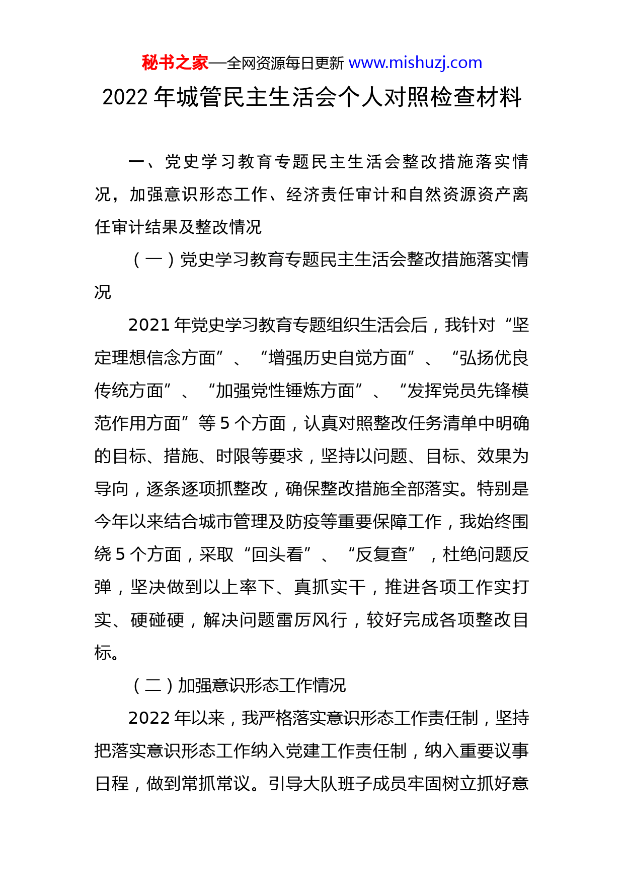 秘书之家—全网资源每日更新www.mishuzj.com2022年城管民主生活会个人对照检查材料一、党史学习教育专题民主生活会整改措施落实情况,加强意识形态工作、经济责任审计和自然资源资产离任审计结果及整改情况(一)党史学习教育专题民主生活会整改措施落实情况2021年党史学习教育专题组织生活会后,我针对“坚定理想信念方面”、“增强历史自觉方面”、“弘扬优良传统方面”、“加强党性锤炼方面”、“发挥党员先锋模范作用方面”等5个方面,认真对照整改任务清单中明确的目标、措施、时限等要求,坚持以问题、目标、效果为导向,逐条逐项抓整改,确保整改措施全部落实。特别是今年以来结合城市管理及防疫等重要保障工作,我始终围绕5个方面,采取“回头看”、“反复查”,杜绝问题反弹,坚决做到以上率下、真抓实干,推进各项工作实打实、硬碰硬,解决问题雷厉风行,较好完成各项整改目标。(二)加强意识形态工作情况2022年以来,我严格落实意识形态工作责任制,坚持把落实意识形态工作纳入党建工作责任制,纳入重要议事日程,做到常抓常议。引导大队班子成员牢固树立抓好意秘书之家—全网资源每日更新www.mishuzj.com识形态工作是本职、不抓是失职的理念。加强意识形态工作制度建设,将思想政治工作纳入意识形态工作责任制考核,强化意识形态思想武装,主动打好意识形态领域主动战。(三)经济责任审计和自然资源资产离任审计结果及整改情况不涉及。二、存在的主要问题(一)在带头深刻领悟“两个确立”的决定性意义,增强“四个意识”、坚定“四个自信”、做到“两个维护”方面。“两个确立”是党的突出历史贡献和政治成果,对新时代党和国家事业发展、对推进中华民族伟大复兴历史进程具有决定性意义。我能够自觉的学习和践行习近平新时代中国特色社会主义思想,时刻做到讲政治、顾大局、守底线,始终增强“四个意识”、坚定“四个意识”、做到“两个维护”,较好的确保自己从政治上、思想上、组织上、作风上的纯洁性。能够严明政治纪律和政治规矩,提高政治判断力、政治领悟力、政治执行力,始终在政治立场、政治方向、政治原则、政治道路上同以习近平同志为核心的党中央保持高度一致。存在问题:一是政治敏锐性还有待提高。对个别工作和消极现象秘书之家—全网资源每日更新www.mishuzj.com政治敏锐性不足,没能始终站在“两个维护”的高度来认识和把握。比如,对队伍纪律要求只在有关会议上进行一般性强调,没有及时严厉地批评教育和制止纠正,说明对意识形态领域斗争的尖锐性和复杂性缺少足够的警惕,政治敏锐性和鉴别力需要进一步提高。二是参谋服务作用发挥不充分。对城市管理中的个别瓶颈制约和薄弱环节,研究得不够透彻。在平时的基层走访调研中没及时察觉,在工作研究上用力不足,参谋服务作用发挥不到位。(二)在带头用习近平新时代中国特色社会主义思想凝心铸魂方面。能够坚持用习近平新时代中国特色社会主义思想统一思想,严格贯彻落实党的XX大会议精神,习近平总书记关于湖北武汉工作的重要讲话和指示批示精神,省第十二次党代会和省委十二届一次、二次全会精神,市第十四次党代会和市委十四届一次、二次、三次全会精神,区第十三次党代会和区委十三届一次、二次、三次、四次、五次全会精神。在工作中统一意志、统一行动,做到学思用贯通、知信行统一,坚持好、运用好贯穿其中的立场观点方法,自觉把习近平新时代中国特色社会主义思想转化为坚定理想、锤炼党性和指导实践、推动工作的强大力量。存在问题:一是在学习的持久性和全面性上有差距。对习近平新秘书之家—全网资源每日更新www.mishuzj.com时代中国特色社会主义思想的学习不深入,在学习的系统性、全面性、针对性上做的还不够,缺乏持之以恒深入研读的韧劲。二是理论学习存在片面性。过于强调基层事务繁杂,碎片化、零散化学习的问题较为突出,在中央指示精神、上级政策与城管执法大队实际情况的结合上,思考得不深不透,没有静下心来研究新形势、新特点、新规律。对理论知识的理解与实际应用脱钩,没有发挥理论的指导作用。(三)在带头坚持和加强党的全面领导方面。我能够深入学习关于“国之大者”的重要论述,深刻领会党中央决策部署的政治意图、战略谋划和实践要求,切实把贯彻落实党中央精神体现到部署重大任务、推进重大工作的实践中,特别是在战疫情等重大工作上。能够严格落实建设全国构建新发展格局先行区各项工作部署,认真贯彻民主集中制,创新和改进领导方式,增强党组织政治功能和组织功能,把各领域广大群众组织凝聚好,带头坚守一线、冲锋在前,充分发扬了领导干部模范表率作用,夯实党执政的根基。存在问题:一是工作创新不够。有时急于完成工作任务,习惯用老方法、凭经验,主动求变、求新意识不强,工作特色不明显。二是主动意识不强。存在多一事不如少一事的错误思想,缺乏主动地去针对具体问题改进工作方式、优化工秘书之家—全网资源每日更新www.mishuzj.com作方法。三是工作标准不高。距离高标准、严要求还有一定差距,在工作过程中精细化、精准化、多样化上,还需要进一步加强。(四)在带头坚持以人民为中心的发展思想,推动改革发展稳定方面。能够完整