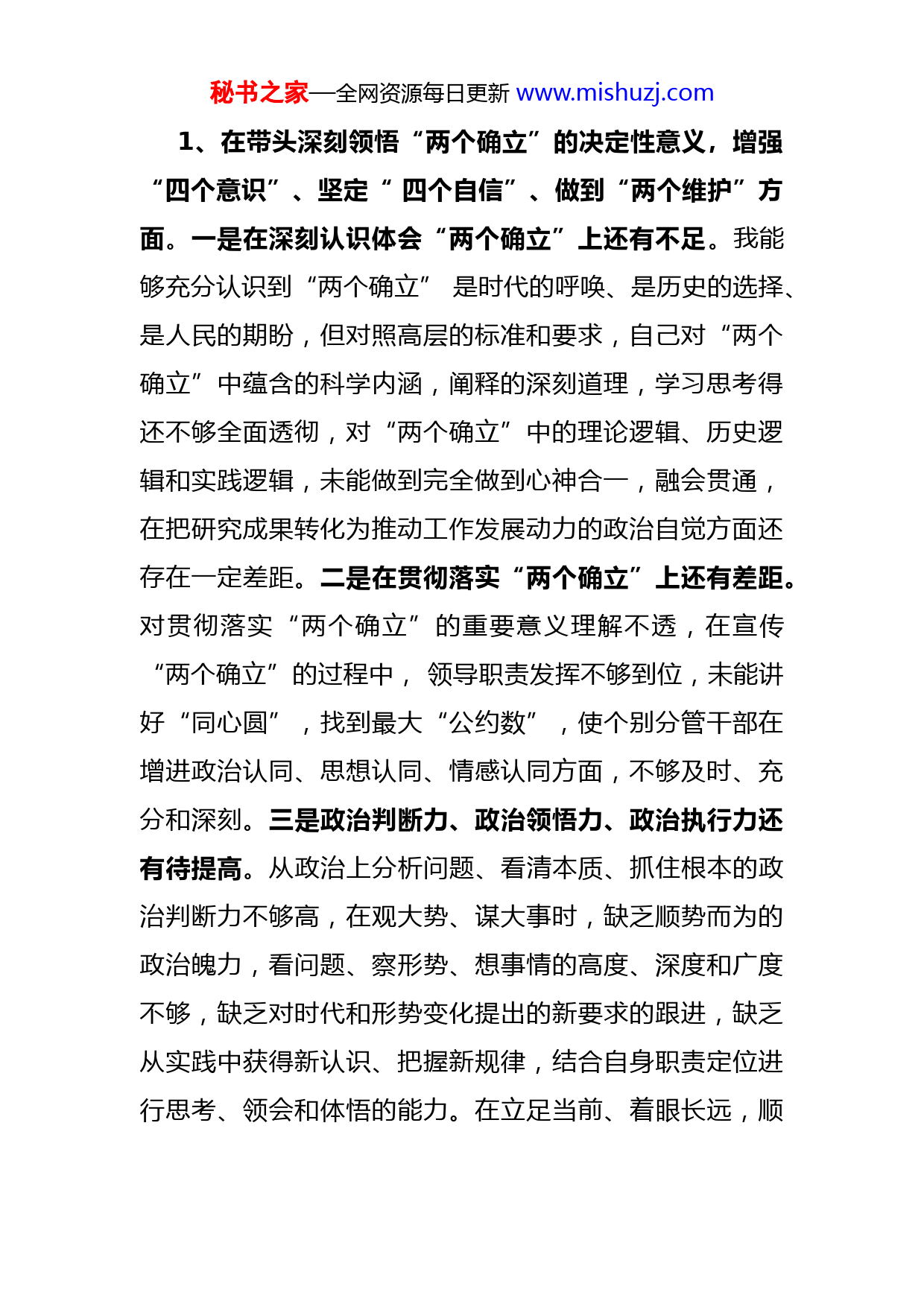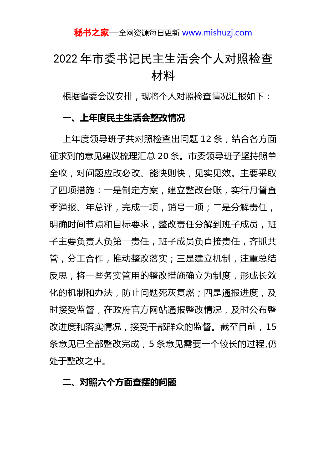 秘书之家—全网资源每日更新www.mishuzj.com2022年市委书记民主生活会个人对照检查材料根据省委会议安排,现将个人对照检查情况汇报如下:一、上年度民主生活会整改情况上年度领导班子共对照检查出问题12条,结合各方面征求到的意见建议梳理汇总20条。市委领导班子坚持照单全收,对问题应改必改、能快则快,见实见效。主要采取了四项措施:一是制定方案,建立整改台账,实行月督查季通报、年总评,完成一项,销号一项;二是分解责任,明确时间节点和目标要求,整改责任分解到班子成员,班子主要负责人负第一责任,班子成员负直接责任,齐抓共管,分工合作,推动整改落实;三是建立机制,注重总结反思,将一些务实管用的整改措施确立为制度,形成长效化的机制和办法,防止问题死灰复燃;四是通报进度,及时接受监督,在政府官方网站通报整改情况,及时公布整改进度和落实情况,接受干部群众的监督。截至目前,15条意见已全部整改完成,5条意见需要一个较长的过程,仍处于整改之中。二、对照六个方面查摆的问题秘书之家—全网资源每日更新www.mishuzj.com1、在带头深刻领悟“两个确立”的决定性意义,增强“四个意识”、坚定“四个自信”、做到“两个维护”方面。一是在深刻认识体会“两个确立”上还有不足。我能够充分认识到“两个确立”是时代的呼唤、是历史的选择、是人民的期盼,但对照高层的标准和要求,自己对“两个确立”中蕴含的科学内涵,阐释的深刻道理,学习思考得还不够全面透彻,对“两个确立”中的理论逻辑、历史逻辑和实践逻辑,未能做到完全做到心神合一,融会贯通,在把研究成果转化为推动工作发展动力的政治自觉方面还存在一定差距。二是在贯彻落实“两个确立”上还有差距。对贯彻落实“两个确立”的重要意义理解不透,在宣传“两个确立”的过程中,领导职责发挥不够到位,未能讲好“同心圆”,找到最大“公约数”,使个别分管干部在增进政治认同、思想认同、情感认同方面,不够及时、充分和深刻。三是政治判断力、政治领悟力、政治执行力还有待提高。从政治上分析问题、看清本质、抓住根本的政治判断力不够高,在观大势、谋大事时,缺乏顺势而为的政治魄力,看问题、察形势、想事情的高度、深度和广度不够,缺乏对时代和形势变化提出的新要求的跟进,缺乏从实践中获得新认识、把握新规律,结合自身职责定位进行思考、领会和体悟的能力。在立足当前、着眼长远,顺秘书之家—全网资源每日更新www.mishuzj.com势而为,主动求变的能力上还有短板,未能做到借力打力相互提升。2、在带头用习近平新时代中国特色社会主义思想凝心铸魂方面,一是对习近平新时代中国特色社会主义思想的理论内涵把握不够精准,对习近平新时代中国特色社会主义思想的核心内容“十个明确”把握不深,在学习、宣传引导的过程中,用力不够均衡,原汁原味地学习中国特色社会主义理论多了一些,学习马克思主义少了一些,导致在理解和掌握中国特色社会主义是历史发展的必然结果、发展中国的必由之路、经过实践检验的科学真理方面,不够全面、系统和深刻。二是对习近平新时代中国特色社会主义思想意义认识不够深刻。对习近平新时代中国特色社会主义思想形成的时代背景和实践基础、产生的社会历史特征等认识不清,在思考如何用习近平新时代中国特色社会主义思想凝心聚力上,统筹谋划得不够全面细致,理论修炼与精神淬炼结合得不够严实。3、在带头坚持和加强党的全面领导方面,一是党建的政治统领作用发挥不充分。存在重形式、轻实效的倾向,党建工作与业务工作的融合不够,缺乏从党的建设方面查找根源、解决问题。存在以行政办公会代替支部会现象,“三会一课”质量不高,“三会一课”活动形式多是照本秘书之家—全网资源每日更新www.mishuzj.com宣科读文件,以文件传达代替组织活动。二是党组织领导核心作用发挥不充分。查摆问题不深刻、不具体,深挖思想根源不够,没有真正把自己摆进去、把职责摆进去、把工作摆进去,谈工作多,谈思想少,以谈工作代替谈思想相互批评不较真,“辣味”不足,没有达到红脸出汗的效果;对会后整改重视不够。对党建建设工作投入精力不足研究不够。(笔杆儿家园www.biganerwang.com)4、在带头坚持以人民为中心的发展思想,推动改革发展稳定方面。一是在满足人民群众的新期待上有差距,对新时代下人民群众的新期待研判得不够及时,掌握得不够全面,未能全面认清和系统把握人民群众对物质文化生活的多样化、个性化的新需求,特别是面对当前人民群众复杂而又具体的利益新要求,以及多元而又具有个性化差异的新目标时,自己在谋划发展、统筹工作的过程中,未能做到科学合理地关照各方、兼顾各类群体。二是推动改革发展稳定成效不显著。面对中华民族伟大复兴的战略全局和世界百年未有之大变局“两个大局”,未能及时运用马克思主义的立场观点方法,找准工作坐标、选准奋斗方位、瞄准责任靶心,没有将自己负责的工作有效凝聚成促进大局全局发展的“活力细胞”,想事情、做作缺少战略性、系统性、前瞻性的研究和谋划。秘书之家—全网资源每日更新www.mishuzj.com5、在带头发扬斗争精神,防范化解风险挑战方面,底线思维能力还有所欠缺。一是斗争策略不够科学。对斗争所需的
