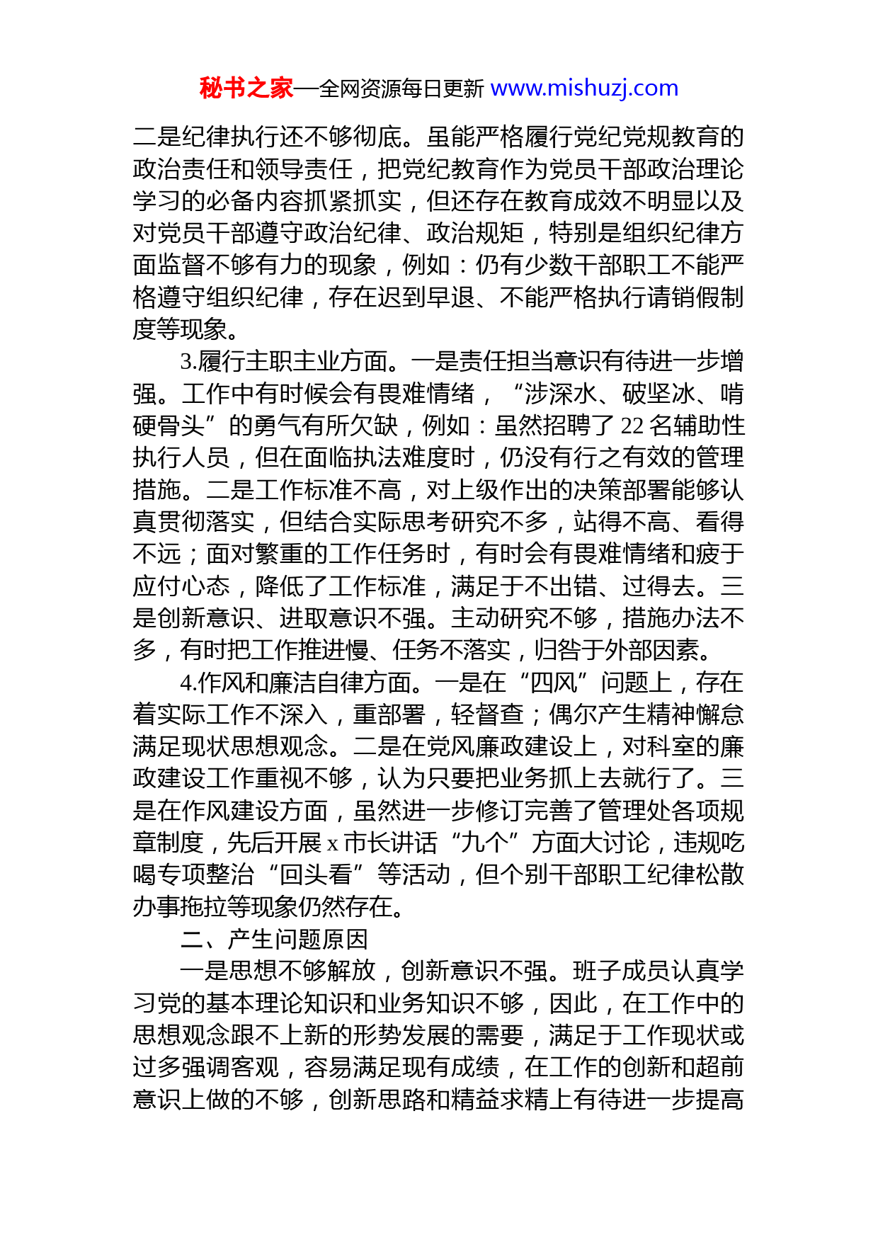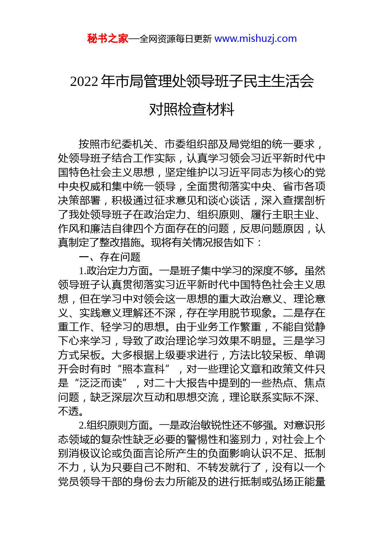 秘书之家—全网资源每日更新www.mishuzj.com2022年市局管理处领导班子民主生活会对照检查材料按照市纪委机关、市委组织部及局党组的统一要求,处领导班子结合工作实际,认真学习领会习近平新时代中国特色社会主义思想,坚定维护以习近平同志为核心的党中央权威和集中统一领导,全面贯彻落实中央、省市各项决策部署,积极通过征求意见和谈心谈话,深入查摆剖析了我处领导班子在政治定力、组织原则、履行主职主业、作风和廉洁自律四个方面存在的问题,反思问题原因,认真制定了整改措施。现将有关情况报告如下:一、存在问题1.政治定力方面。一是班子集中学习的深度不够。虽然领导班子认真贯彻落实习近平新时代中国特色社会主义思想,但在学习中对领会这一思想的重大政治意义、理论意义、实践意义理解还不深,存在学用脱节现象。二是存在重工作、轻学习的思想。由于业务工作繁重,不能自觉静下心来学习,导致了政治理论学习效果不明显。三是学习方式呆板。大多根据上级要求进行,方法比较呆板、单调开会时有时“照本宣科”,对一些理论文章和政策文件只是“泛泛而读”,对二十大报告中提到的一些热点、焦点问题,缺乏深层次互动和思想交流,理论联系实际不深、不透。2.组织原则方面。一是政治敏锐性还不够强。对意识形态领域的复杂性缺乏必要的警惕性和鉴别力,对社会上个别消极议论或负面言论所产生的负面影响认识不足、抵制不力,认为只要自己不附和、不转发就行了,没有以一个党员领导干部的身份去力所能及的进行抵制或弘扬正能量秘书之家—全网资源每日更新www.mishuzj.com二是纪律执行还不够彻底。虽能严格履行党纪党规教育的政治责任和领导责任,把党纪教育作为党员干部政治理论学习的必备内容抓紧抓实,但还存在教育成效不明显以及对党员干部遵守政治纪律、政治规矩,特别是组织纪律方面监督不够有力的现象,例如:仍有少数干部职工不能严格遵守组织纪律,存在迟到早退、不能严格执行请销假制度等现象。3.履行主职主业方面。一是责任担当意识有待进一步增强。工作中有时候会有畏难情绪,“涉深水、破坚冰、啃硬骨头”的勇气有所欠缺,例如:虽然招聘了22名辅助性执行人员,但在面临执法难度时,仍没有行之有效的管理措施。二是工作标准不高,对上级作出的决策部署能够认真贯彻落实,但结合实际思考研究不多,站得不高、看得不远;面对繁重的工作任务时,有时会有畏难情绪和疲于应付心态,降低了工作标准,满足于不出错、过得去。三是创新意识、进取意识不强。主动研究不够,措施办法不多,有时把工作推进慢、任务不落实,归咎于外部因素。4.作风和廉洁自律方面。一是在“四风”问题上,存在着实际工作不深入,重部署,轻督查;偶尔产生精神懈怠满足现状思想观念。二是在党风廉政建设上,对科室的廉政建设工作重视不够,认为只要把业务抓上去就行了。三是在作风建设方面,虽然进一步修订完善了管理处各项规章制度,先后开展x市长讲话“九个”方面大讨论,违规吃喝专项整治“回头看”等活动,但个别干部职工纪律松散办事拖拉等现象仍然存在。二、产生问题原因一是思想不够解放,创新意识不强。班子成员认真学习党的基本理论知识和业务知识不够,因此,在工作中的思想观念跟不上新的形势发展的需要,满足于工作现状或过多强调客观,容易满足现有成绩,在工作的创新和超前意识上做的不够,创新思路和精益求精上有待进一步提高秘书之家—全网资源每日更新www.mishuzj.com二是工作创新不高,协调配合不够。在统筹工作、统揽全局发展思路上还存在差距。存在按部就班、因循守旧的状况。班子成员协同配合还需加强。三是服务意识欠缺,相互批评力度偏软。深入基层次数增多,但了解职工深层次想法的意识还不够。班子成员相互之间缺少批评与自我批评的自觉性,有时即使看到了别人的问题,认为在一起工作,不必要批评别人的缺点,保持“一团和气”。三、整改措施及方向(一)坚持解放思想,进一步端正学风按照市委和局党组的要求,坚持和完善相关学习制度。在坚持党员固定学习日的基础上,合理安排自学时间,认真学习党的二十大精神,认真领会习近平新时代中国特色社会主义思想,不断提高领导班子成员适应新形势、解决新问题的能力。加强领导班子成员思想、作风建设,提高班子的整体素质和工作能力;改进工作作风,强化服务意识,提高服务水平,更好地履行岗位职能。(二)增强服务意识,进一步改进工作作风坚持集体领导,民主决策,正确处理好集体领导与个人分工负责的关系,班子成员间相互协商、沟通,杜绝在工作中出现推诿扯皮的现象;定期走访基层,提高全处干部职工的凝聚力;克服不深入研究解决问题的思想,在工作中知难而进,不完成好工作决不松劲;树立勤工作、求上进的良好氛围,创新工作方法,努力提高驾驭全局的能力,不断总结经验,提高工作本领。(三)充分发扬相互批评,进一步增强“四个意识”牢固树立“四个意识”,坚持好个人服从组织,少数服从多数的原则。在认真做好自己本职工作的同时,互相之间密切配合,共同维护好班子的形象。注重把握和处理好局部与全局的关系,在思想上、政治上、行动上与党中秘书之家—全网资源每日更新www.mishuzj.com央保持高度一致。要正
