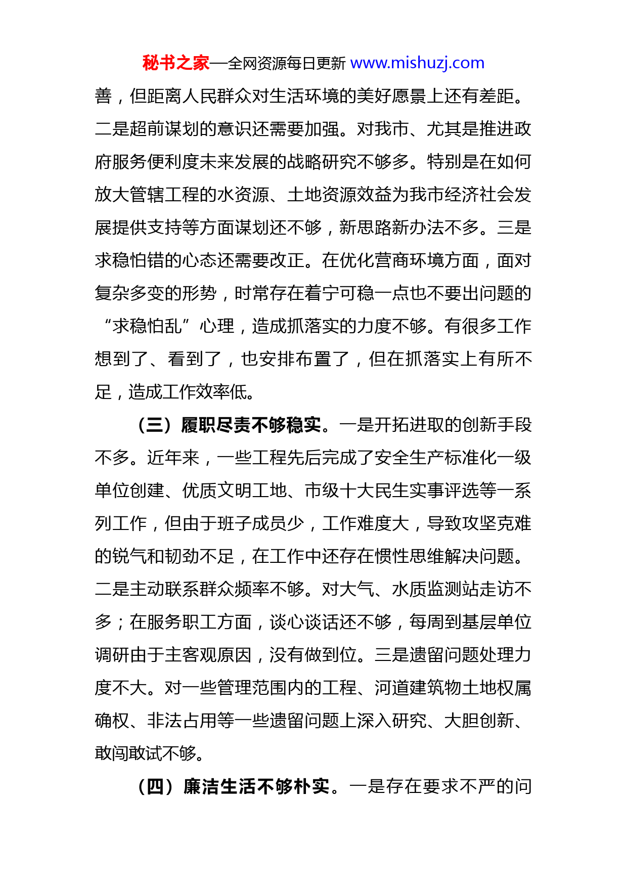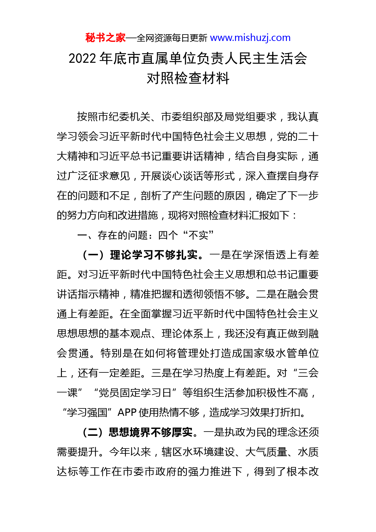秘书之家—全网资源每日更新www.mishuzj.com2022年底市直属单位负责人民主生活会对照检查材料按照市纪委机关、市委组织部及局党组要求,我认真学习领会习近平新时代中国特色社会主义思想,党的二十大精神和习近平总书记重要讲话精神,结合自身实际,通过广泛征求意见,开展谈心谈话等形式,深入查摆自身存在的问题和不足,剖析了产生问题的原因,确定了下一步的努力方向和改进措施,现将对照检查材料汇报如下:一、存在的问题:四个“不实”(一)理论学习不够扎实。一是在学深悟透上有差距。对习近平新时代中国特色社会主义思想和总书记重要讲话指示精神,精准把握和透彻领悟不够。二是在融会贯通上有差距。在全面掌握习近平新时代中国特色社会主义思想思想的基本观点、理论体系上,我还没有真正做到融会贯通。特别是在如何将管理处打造成国家级水管单位上,还有一定差距。三是在学习热度上有差距。对“三会一课”“党员固定学习日”等组织生活参加积极性不高,“学习强国”APP使用热情不够,造成学习效果打折扣。(二)思想境界不够厚实。一是执政为民的理念还须需要提升。今年以来,辖区水环境建设、大气质量、水质达标等工作在市委市政府的强力推进下,得到了根本改秘书之家—全网资源每日更新www.mishuzj.com善,但距离人民群众对生活环境的美好愿景上还有差距。二是超前谋划的意识还需要加强。对我市、尤其是推进政府服务便利度未来发展的战略研究不够多。特别是在如何放大管辖工程的水资源、土地资源效益为我市经济社会发展提供支持等方面谋划还不够,新思路新办法不多。三是求稳怕错的心态还需要改正。在优化营商环境方面,面对复杂多变的形势,时常存在着宁可稳一点也不要出问题的“求稳怕乱”心理,造成抓落实的力度不够。有很多工作想到了、看到了,也安排布置了,但在抓落实上有所不足,造成工作效率低。(三)履职尽责不够稳实。一是开拓进取的创新手段不多。近年来,一些工程先后完成了安全生产标准化一级单位创建、优质文明工地、市级十大民生实事评选等一系列工作,但由于班子成员少,工作难度大,导致攻坚克难的锐气和韧劲不足,在工作中还存在惯性思维解决问题。二是主动联系群众频率不够。对大气、水质监测站走访不多;在服务职工方面,谈心谈话还不够,每周到基层单位调研由于主客观原因,没有做到位。三是遗留问题处理力度不大。对一些管理范围内的工程、河道建筑物土地权属确权、非法占用等一些遗留问题上深入研究、大胆创新、敢闯敢试不够。(四)廉洁生活不够朴实。一是存在要求不严的问秘书之家—全网资源每日更新www.mishuzj.com题。有时会满足于不出失误、不踩红线、不犯错误,从小事入手,从小节做起,防微杜渐、警钟长鸣的自觉性不强。二是存在标准不高的问题。积极利用廉政文化示范点,通过廉政谈话,廉政风险点排查、重点节点教育等方式开展廉政警示教育,但总体上活动开展还不深,党风廉政建设还需加强。三是存在请示报告不实的问题。在请示报告制度执行的不全面,在年度市管干部事项报告中,出去当评审专家的兼职行为未能如实向组织报告。二、深入剖析问题成因:三个“不能一如既往”一是理论武装不能一如既往。但随着年龄的增长,相比以往挤出时间来,静下心来深学细研的精神劲头有所下降,反复学、深入学、带着问题思考学,学用结合、学以致用上做得不够,在学思用的贯通、知信行的统一上还有差距。二是管党治党不能一如既往。通过党建品牌建设,党建与业务融合不断加强。但落实主体责任和党建第一责任人的职责在严管、细抓、深究上做的不到位,传导基层党建工作责任的强度还不够。三是自我约束不能一如既往。随着持续不断的作风整治和纪律建设,自己也不自觉地对面临的形势产生了乐观估计,主观上认为自己能够时刻保持对党的政治纪律、组织纪律、财经纪律的敬畏,思想上有了一定的自满和松懈三、整改措施·三个“持之以恒”秘书之家—全网资源每日更新www.mishuzj.com一是持之以恒讲政治,坚决做到“两个维护”。自觉把严守党的政治纪律和政治规矩作为履职尽责的第一标准、做人做事的第一要求,不断增强“四个意识”、坚定“四个自信”,自觉在思想上政治上行动上同以习近平同志为核心的党中央保持高度一致。二是持之以恒抓学习,持续强化理论武装。认真学习习近平新时代中国特色社会主义思想,对习近平总书记的重要指示、批示、讲话、论述,以及中央和省市委、局党组下发的重要文件、召开的重要会议、作出的重大部署、出台的重要政策,均在第一时间组织传达学习、第一时间抓好宣传贯彻,推动学习不断往深里走、往实里走、往心里走。三是持之以恒转作风,努力推动工作落实。牢固树立以人民为中心的发展思想,不断厚植人民情怀、筑牢群众观点、站稳群众立场,把群众观点、群众路线深深根植于思想中。认真贯彻落实好民主集中制,用好批评和自我批评这个武器,提高个人和班子解决自身问题的能力,巩固团结和谐干事创业的局面。四是持之以恒尽好责,从严落实主体责任。带头参加所在支部的组织生活,带头讲好廉政党课,推动“三会一课”、主题党日等制度落实到位,进一步提升党内政治生活质量。自觉把党章作为