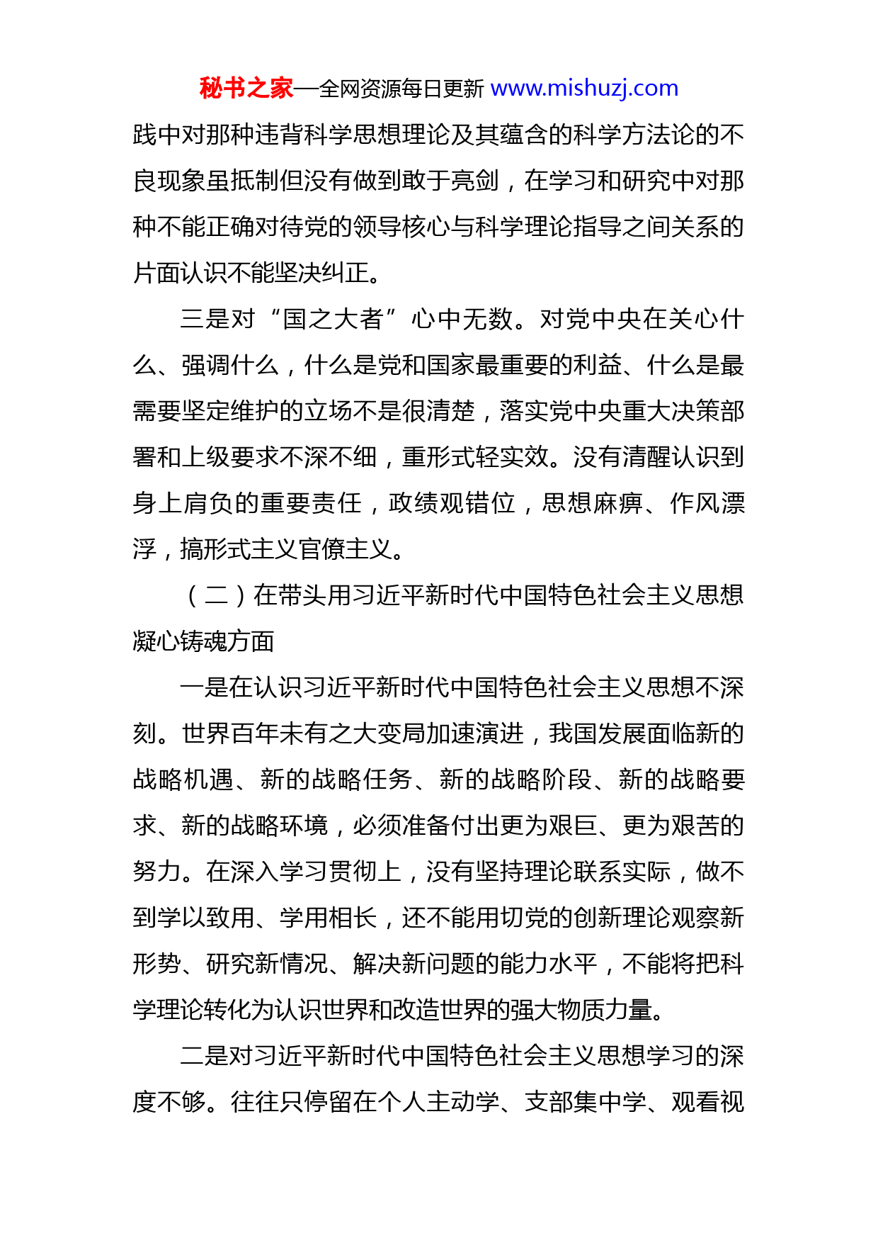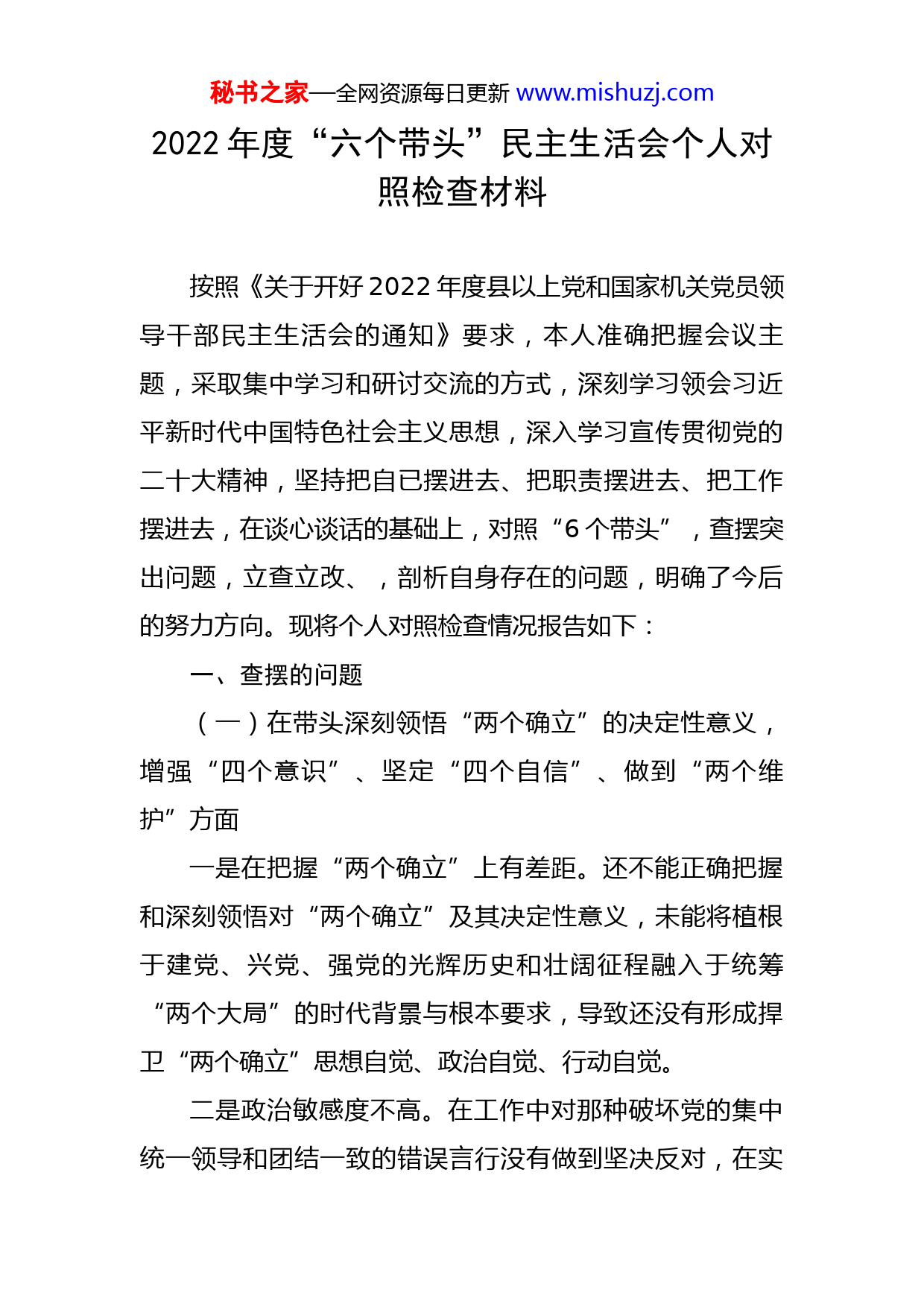 秘书之家—全网资源每日更新www.mishuzj.com2022年度“六个带头”民主生活会个人对照检查材料按照《关于开好2022年度县以上党和国家机关党员领导干部民主生活会的通知》要求,本人准确把握会议主题,采取集中学习和研讨交流的方式,深刻学习领会习近平新时代中国特色社会主义思想,深入学习宣传贯彻党的二十大精神,坚持把自已摆进去、把职责摆进去、把工作摆进去,在谈心谈话的基础上,对照“6个带头”,查摆突出问题,立查立改、,剖析自身存在的问题,明确了今后的努力方向。现将个人对照检查情况报告如下:一、查摆的问题(一)在带头深刻领悟“两个确立”的决定性意义,增强“四个意识”、坚定“四个自信”、做到“两个维护”方面一是在把握“两个确立”上有差距。还不能正确把握和深刻领悟对“两个确立”及其决定性意义,未能将植根于建党、兴党、强党的光辉历史和壮阔征程融入于统筹“两个大局”的时代背景与根本要求,导致还没有形成捍卫“两个确立”思想自觉、政治自觉、行动自觉。二是政治敏感度不高。在工作中对那种破坏党的集中统一领导和团结一致的错误言行没有做到坚决反对,在实秘书之家—全网资源每日更新www.mishuzj.com践中对那种违背科学思想理论及其蕴含的科学方法论的不良现象虽抵制但没有做到敢于亮剑,在学习和研究中对那种不能正确对待党的领导核心与科学理论指导之间关系的片面认识不能坚决纠正。三是对“国之大者”心中无数。对党中央在关心什么、强调什么,什么是党和国家最重要的利益、什么是最需要坚定维护的立场不是很清楚,落实党中央重大决策部署和上级要求不深不细,重形式轻实效。没有清醒认识到身上肩负的重要责任,政绩观错位,思想麻痹、作风漂浮,搞形式主义官僚主义。(二)在带头用习近平新时代中国特色社会主义思想凝心铸魂方面一是在认识习近平新时代中国特色社会主义思想不深刻。世界百年未有之大变局加速演进,我国发展面临新的战略机遇、新的战略任务、新的战略阶段、新的战略要求、新的战略环境,必须准备付出更为艰巨、更为艰苦的努力。在深入学习贯彻上,没有坚持理论联系实际,做不到学以致用、学用相长,还不能用切党的创新理论观察新形势、研究新情况、解决新问题的能力水平,不能将把科学理论转化为认识世界和改造世界的强大物质力量。二是对习近平新时代中国特色社会主义思想学习的深度不够。往往只停留在个人主动学、支部集中学、观看视秘书之家—全网资源每日更新www.mishuzj.com频学三个层面,载体也仅限于“三会一课”和主题党日,缺少专家辅导学、典型引领学、成果交流学等专业性强、冲击力强、促动性强的学习方式,对依托新媒体打造党员喜闻乐见的学习形式方面,统筹不够,谋划不足,导致学习教育的渗透力、感染力、震撼力不够充分。在自学上,没有做到全面系统学、及时跟进学、深入思考学、联系实际学,学习的自觉性和主动性还有待提升三是系统性学习还不足。虽然积极学习习近平新时代中国特色社会主义思想,但是理解的深度和广度仍然不够,对党务以外的内容,学得还不够,思考得更不够,理论水平还有待提高,在“学懂”尤其是“弄通”“做实”上还有不足,在全面推动党的建设高质量方面还有差距。(三)在带头坚持和加强党的全面领导方面一是决策部署主观臆断。与群众和党员干部沟通交流少,问计于民的自觉性、主动性不强,民主集中制贯彻落实不到位。重大决策、年度重点工作任务的确定没有很好的贯彻落实从群众中来、到群众中去的工作原则,与班子成员交流沟通多,征求群众意见不充分,认为自己生在农村、长在农村,在对基层情况比较了解,有一定的工作经验,总想着自己对这份职责有着神圣的使命感,不会不负责任,想问题、做决策有时凭经验,想当然拍板定案,对一些不同意见主动沟通交流分析采纳少秘书之家—全网资源每日更新www.mishuzj.com二是党建工作与业务工作的有机融合效果一般。对党建工作如何融入到业务工作中缺乏探索,党建工作与单位业务工作有机衔接、相互促进的制度建设不健全,党建工作与业务工作“两张皮”的现象仍然存在。比如,政治理论学习、党内组织生活按部就班,与具体业务工作耦合性不强。党建品牌创建工作中,只是简单的对创建工作的大体思路进行了谋划,没有深入细致的对创建的具体措施进行展开与细化,教育党员没有找到有效平台和便捷途径,自选动作特色不鲜明。推动“三会一课”制度规定落实存在重形式、轻内容,主动讲党课开展不力。三是落实组织生活制度有时“悬空”。平时在办公室的时间少,没有尽可能抽出时间参加中心组学习、组织生活会,主观上也反映出自己对工作的不重视。参加组织生活会时,与各位党员也没有进行深入细致的谈心交心,自己没有带头开展自我批评,自觉地以“领导”身份对同志们提要求、作指示。(四)在带头坚持以人民为中心的发展思想,推动改革发展稳定方面一是联系群众不够紧密。缺少“江山就是人民,人民就是江山”的政治自觉和历史自觉,公仆意识和为民情怀不强,对于人民群众急难愁盼问题不上心、不走心、不用心,思考和处理问题简单粗糙,不考虑群众是否能够接秘书之家—全网资源每日更新www.mishuzj.com受,未能真正做到与人