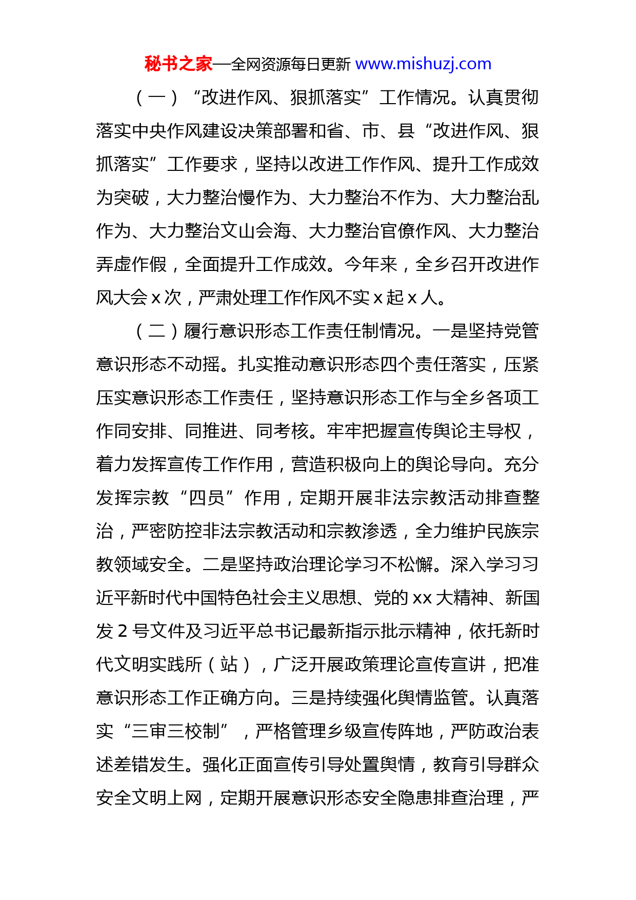 秘书之家—全网资源每日更新www.mishuzj.com2022年度乡党委班子六个带头民主生活会检视剖析材料根据《中共xx县纪委机关中共xx县委组织部关于认真开好2022年度党和国家机关党员领导干部民主生活会的通知》文件要求,xx乡党委第一时间作出了安排部署,及时制定了会议方案。会前,乡党委围绕深入学习领导党的xx大精神,再次进行了专题学习研讨,为开好民主生活会筑牢了思想基础;通过发放征求意见表和座谈会广泛征求党员、干部和群众的意见建议,深入全面查找问题、寻找差距、弥补不足;党委书记带头开展谈心谈话,充分沟通思想、交换意见,消除顾虑、达成一致,形成了广泛共识;领导班子和党员领导干部紧扣会议主题,对照党的xx大精神和党章党规党纪,把自己摆进去、把职责摆进去、把工作摆进去,重点查找在带头深刻感悟“两个确立”的重要意义、带头用习近平新时代中国特色社会主义思想凝心铸魂、带头坚持和加强党的全面领导、带头坚持以人民为中心的发展思想、带头学习运用党在不同历史时期成功应对风险挑战的丰富经验、带头发扬斗争精神、带头落实全面从严治党政治责任等6个方面存在的问题,深入查摆剖析,制定整改措施。现对照检查如下。一、履行有关职责情况秘书之家—全网资源每日更新www.mishuzj.com(一)“改进作风、狠抓落实”工作情况。认真贯彻落实中央作风建设决策部署和省、市、县“改进作风、狠抓落实”工作要求,坚持以改进工作作风、提升工作成效为突破,大力整治慢作为、大力整治不作为、大力整治乱作为、大力整治文山会海、大力整治官僚作风、大力整治弄虚作假,全面提升工作成效。今年来,全乡召开改进作风大会x次,严肃处理工作作风不实x起x人。(二)履行意识形态工作责任制情况。一是坚持党管意识形态不动摇。扎实推动意识形态四个责任落实,压紧压实意识形态工作责任,坚持意识形态工作与全乡各项工作同安排、同推进、同考核。牢牢把握宣传舆论主导权,着力发挥宣传工作作用,营造积极向上的舆论导向。充分发挥宗教“四员”作用,定期开展非法宗教活动排查整治,严密防控非法宗教活动和宗教渗透,全力维护民族宗教领域安全。二是坚持政治理论学习不松懈。深入学习习近平新时代中国特色社会主义思想、党的xx大精神、新国发2号文件及习近平总书记最新指示批示精神,依托新时代文明实践所(站),广泛开展政策理论宣传宣讲,把准意识形态工作正确方向。三是持续强化舆情监管。认真落实“三审三校制”,严格管理乡级宣传阵地,严防政治表述差错发生。强化正面宣传引导处置舆情,教育引导群众安全文明上网,定期开展意识形态安全隐患排查治理,严秘书之家—全网资源每日更新www.mishuzj.com防意识形态领域发生安全问题。四是坚持移风易俗树新风。大力推进群众移风易俗,积极整治群众婚丧嫁娶陋习,积极培育和践行社会主义核心价值观,积极开展“时代楷模”“道德模范”“身边好人”等先进人物的学习宣传活动,教育引导群众树立文明新风。五是深入开展“扫黄打非”专项行动,明确专人负责扫黄打非工作,坚决查缴非法出版物和侵权盗版行为,营造了良好的社会文化环境。(三)巡视巡查整改落实情况。乡党委主动扛起巡视巡察整改责任,持续推动巡察反馈问题整改落实。2022年xx乡未被巡察。(四)履行保密工作情况。乡党委高度重视保密工作,认真落实保密工作责任和措施,有效提升了保密工作成效。一是认真履行保密工作职责。二是严格落实保密工作要求。三是扎实推动保密(五)审计整改情况。乡党委认真落实审计整改责任,坚决做好审计反馈问题整改工作。2022年,上级未对xx乡开展审计工作。二、存在的主要问题(一)在带头深刻领悟“两个确立”的决定性意义,增强“四个意识”、坚定“四个自信”、做到“两个维护”。严明政治纪律和政治规矩,提高政治判断力、政治秘书之家—全网资源每日更新www.mishuzj.com领悟力、政治执行力,始终在政治立场、政治方向、政治原则、政治道路上同以习近平同志为核心的党中央保持高度一致方面。乡党委班子能够准确认识到“两个确立”在推动党和国家事业发展进步的决定性意义,坚持把衷心拥护“两个确立”、忠诚践行“两个维护”作为最大的政治、最大的大局,始终在思想上政治上行动上同以习近平同志为核心的党中央保持高度一致。但经深入查摆,还存在以下问题。一是政治站位不高。从政治上去分析和处理工作问题还有差距,有的领导干部在参与决策常常就事论事,谋划发展也习惯于单纯从业务角度出发思考问题、研究问题,对于各类问题与当前政治形势的内在联系思考不深,对于运用习近平新时代中国特色社会主义思想解决问题方法不多。二是抓具体抓落实不够。在教育引导党员干部群众增强“四个意识”、坚定“四个自学”、做到“两个维护”存在形式单一、效果不明显等问题,基层党员干部理解认识不深刻。(二)在带头用习近平新时代中国特色社会主义思想凝心铸魂。坚持用习近平新时代中国特色社会主义思想统一思想、统一意志、统一行动,做到学思用贯通、知信行统一,坚持好、运用好贯穿其中的立场观点方法,自觉把习近平新时代中国特色社会主义思想转化为坚定理想、锻炼党性和指导实践、推动工作的强大力量
