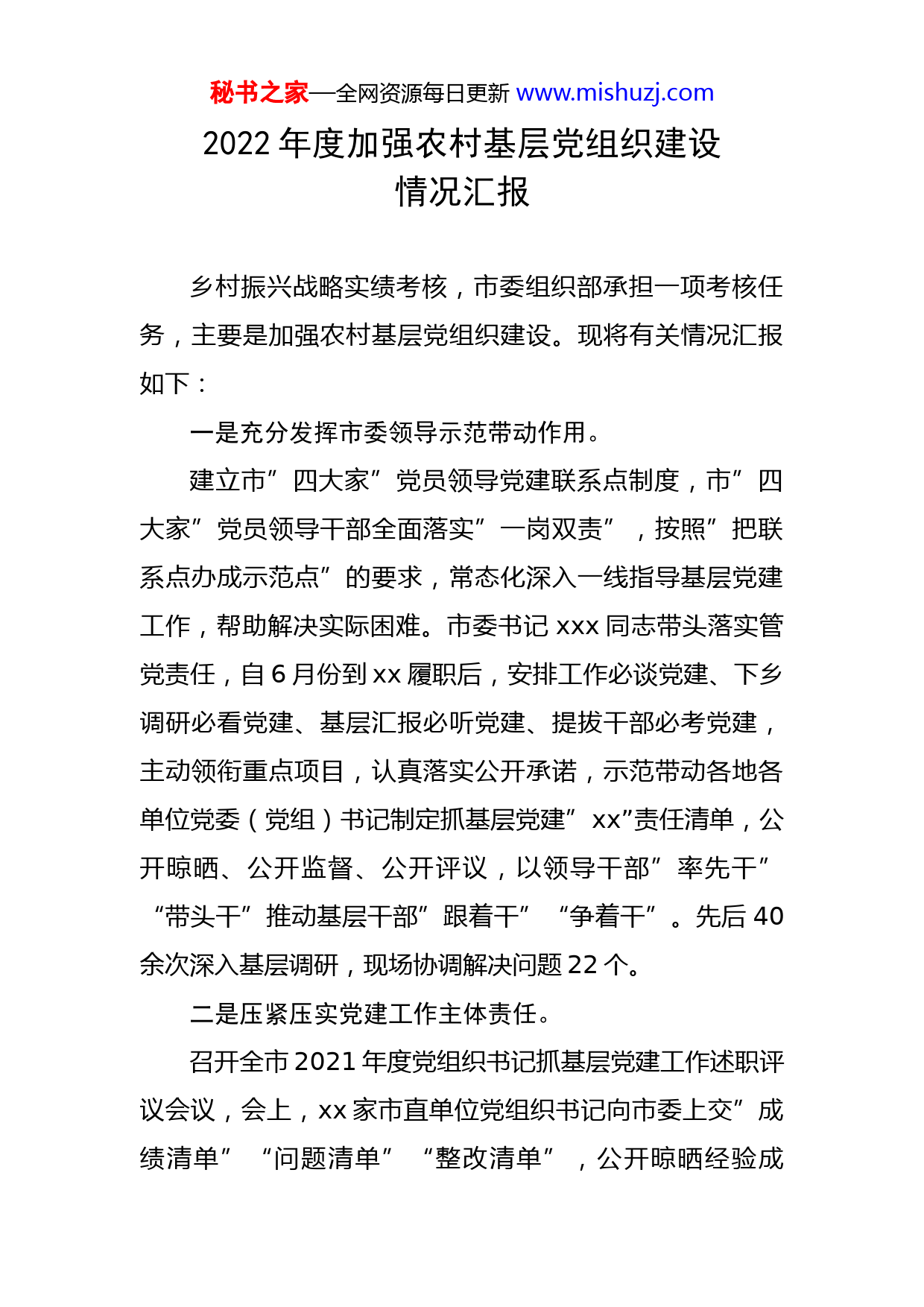 秘书之家—全网资源每日更新www.mishuzj.com2022年度加强农村基层党组织建设情况汇报乡村振兴战略实绩考核,市委组织部承担一项考核任务,主要是加强农村基层党组织建设。现将有关情况汇报如下:一是充分发挥市委领导示范带动作用。建立市”四大家”党员领导党建联系点制度,市”四大家”党员领导干部全面落实”一岗双责”,按照”把联系点办成示范点”的要求,常态化深入一线指导基层党建工作,帮助解决实际困难。市委书记xxx同志带头落实管党责任,自6月份到xx履职后,安排工作必谈党建、下乡调研必看党建、基层汇报必听党建、提拔干部必考党建,主动领衔重点项目,认真落实公开承诺,示范带动各地各单位党委(党组)书记制定抓基层党建”xx”责任清单,公开晾晒、公开监督、公开评议,以领导干部”率先干”“带头干”推动基层干部”跟着干”“争着干”。先后40余次深入基层调研,现场协调解决问题22个。二是压紧压实党建工作主体责任。召开全市2021年度党组织书记抓基层党建工作述职评议会议,会上,xx家市直单位党组织书记向市委上交”成绩清单”“问题清单”“整改清单”,公开晾晒经验成秘书之家—全网资源每日更新www.mishuzj.com效、工作不足、整改措施,接受市委领导班子成员点评和基层代表测评。召开2021年度基层党建考核排名靠后单位党组织书记约谈会议,市委对考核排名靠后的2名县委书记和2名市直单位一把手进行了集中约谈。同时,将考核结果作为考察、识别和选用干部的重要依据,今年以来,先后从巩固拓展脱贫攻坚与乡村振兴有效衔接、党建引领乡村振兴、基层治理工作一线提拔重用干部34人。制定下发《关于开展2022年度党建工作年中自查的通知》,督促各地对照自查细则,查漏补缺,补齐短板。召开市委党建工作巡回督导组部署会议,会后,10个党建工作巡回督导组,集中利用一周时间深入全市县、镇、村、社区、机关事业单位和”两新”组织,深入查找问题,督促举一反三,帮助整改提升,推动全市基层党建工作全面进步、全面过硬。三是持续整顿软弱涣散基层党组织。通过基层自查、乡镇筛查、专班复查等方式,摸排确定xx个软弱涣散党组织。对摸排确定的软弱涣散基层党组织,严格落实”四个一”(市级领导班子成员联村、乡镇领导班子成员包村、第一书记驻村、市以上机关单位结对)整顿措施,推动软弱涣散党组织整顿转化。有针对性地选派xx名政治素质高、责任心强、熟悉党建业务、基层工作经验丰富的干部到软弱涣散基层党组织担任”第一书秘书之家—全网资源每日更新www.mishuzj.com记”。各帮扶单位从班子建设、阵地建设、项目发展、资金支持等方面大力进行帮扶。建立软弱涣散基层党组织整顿定期通报和清单销号管理制度,加强对整顿成效和结对帮扶情况的督办检查,推动问题真改实改、全面彻底改。截至目前,xx个软弱涣散党组织全部整顿完成。四是扎实推进党史学习教育常态化制度化。落实”思想引领、学习在先”机制,不断加强基层党员干部的理想信念教育,坚持不懈锤炼党员干部忠诚干净担当的政治品格。坚持”月重点工作提示”制度,让全市各基层党组织干有方向,确保工作的针对性和实效性。同时,立足基层实际,重新修改编印《党支部工作记录薄》,督促全市各级党组织规范落实”三会一课”、民主生活会、组织生活会、谈心谈话、民主评议党员等基本制度,保证党内政治生活按时开展、人数齐全、效果明显。建立党建督查、意见反馈、查处问责制度,抓实正反典型,以正面典型带动制度落实,以反面典型倒逼制度执行。五是选优配强基层党组织书记。出台《xx市村党组织书记市级备案管理办法》,建立起市委主导、市镇联动、全程把关的市级党委备案管理机制,做实”选育管用”全链条管理。实行村党组织书记履职评估和动态调整机制,及时调整撤换不胜任、不尽职的秘书之家—全网资源每日更新www.mishuzj.com村级党组织书记,让村(社区)党组织书记”上得来”“下得去”“用得好”。以村(社区)”两委”换届为契机,严格把关书记人选质量,新调整村(社区)党组织xx人,调整面达xx%,新调整的村(社区)党组织书记平均年龄xx岁,中专高中以上学历xx人,大专以上学历xx人,换出了新气象、新面貌,在连续5届换届中,村(社区)党组织书记和村(居)委会主任”一肩挑”比例首次实现100%,工作经验先后两次被省级简报刊发推介。择优选派驻村第一书记xx人,举办驻村第一书记和工作队培训班,出台《xx市驻村第一书记和工作队管理办法》,加强日常监督管理,压实驻村帮扶责任,印发《xx市驻村工作队考核办法》,将考核结果作为评先评优、提拔使用、晋升职级、评定职称的重要依据。采取”四不两直”方式,不定期对第一书记和工作队驻村情况进行督查,印发xx期督查通报。同时,严格落实相关待遇和经费保障,加强对驻村人员关心关爱,确保驻村人员沉在村里、安心工作。六是持续加强党员教育管理。每半年开展党员专项检查,全面摸清农村、社区、两新组织、企事业单位、党政机关等各领域入党申请人、入党积极分子、发展对象的构成情况,对发展女党员、少数民族党员、35岁以下青年党员、大专学历以上党员、农民秘书之家—全网资源每日更新www.mishuzj.com工党员等实施精准调控,不断优化发展党员结构、提