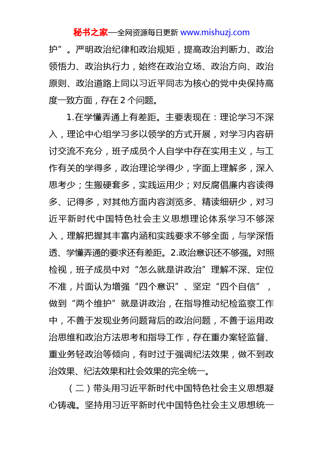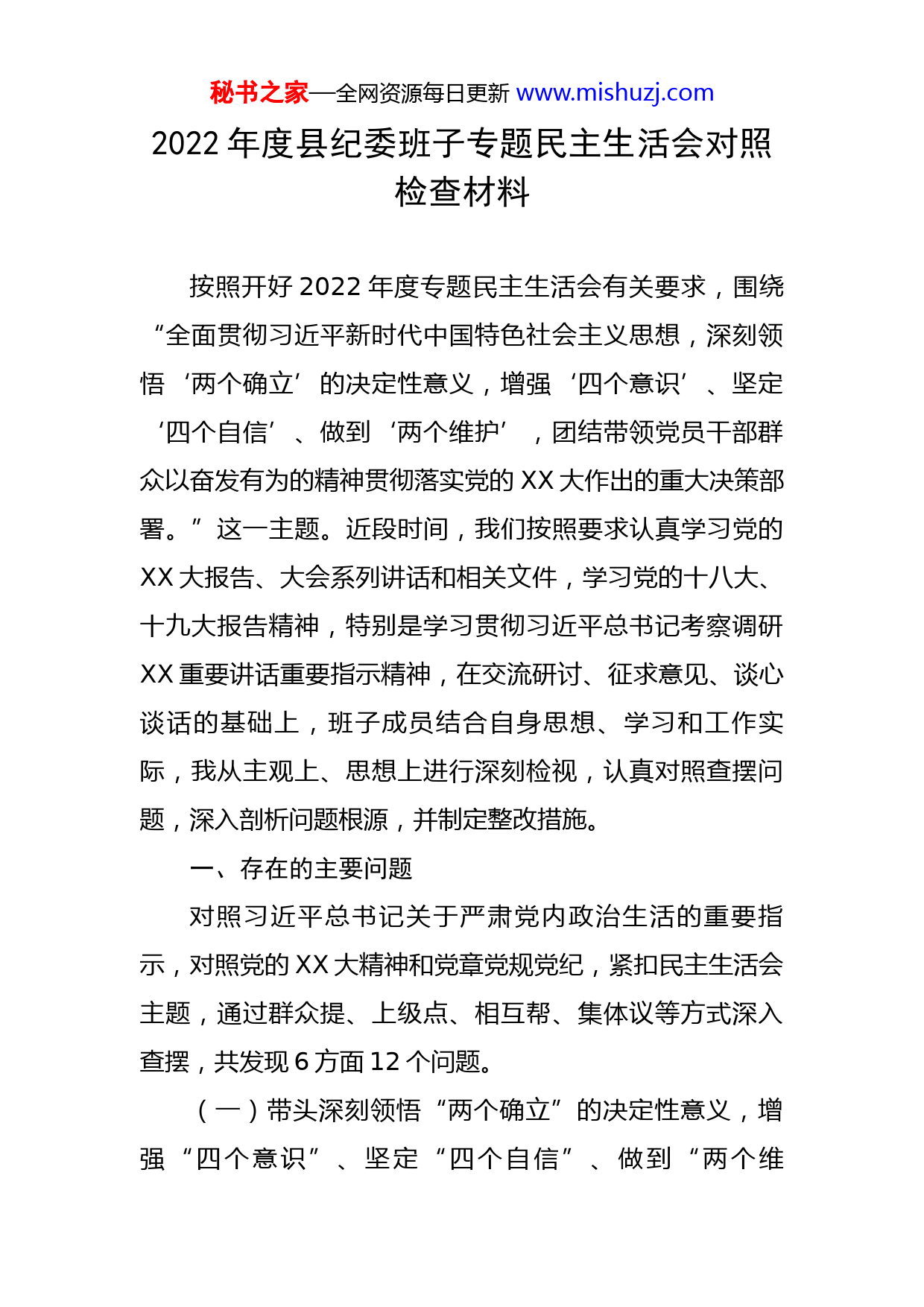 秘书之家—全网资源每日更新www.mishuzj.com2022年度县纪委班子专题民主生活会对照检查材料按照开好2022年度专题民主生活会有关要求,围绕“全面贯彻习近平新时代中国特色社会主义思想,深刻领悟‘两个确立’的决定性意义,增强‘四个意识’、坚定‘四个自信’、做到‘两个维护’,团结带领党员干部群众以奋发有为的精神贯彻落实党的XX大作出的重大决策部署。”这一主题。近段时间,我们按照要求认真学习党的XX大报告、大会系列讲话和相关文件,学习党的十八大、十九大报告精神,特别是学习贯彻习近平总书记考察调研XX重要讲话重要指示精神,在交流研讨、征求意见、谈心谈话的基础上,班子成员结合自身思想、学习和工作实际,我从主观上、思想上进行深刻检视,认真对照查摆问题,深入剖析问题根源,并制定整改措施。一、存在的主要问题对照习近平总书记关于严肃党内政治生活的重要指示,对照党的XX大精神和党章党规党纪,紧扣民主生活会主题,通过群众提、上级点、相互帮、集体议等方式深入查摆,共发现6方面12个问题。(一)带头深刻领悟“两个确立”的决定性意义,增强“四个意识”、坚定“四个自信”、做到“两个维秘书之家—全网资源每日更新www.mishuzj.com护”。严明政治纪律和政治规矩,提高政治判断力、政治领悟力、政治执行力,始终在政治立场、政治方向、政治原则、政治道路上同以习近平同志为核心的党中央保持高度一致方面,存在2个问题。1.在学懂弄通上有差距。主要表现在:理论学习不深入,理论中心组学习多以领学的方式开展,对学习内容研讨交流不充分,班子成员个人自学中存在实用主义,与工作有关的学得多,政治理论学得少,字面上理解多,深入思考少;生搬硬套多,实践运用少;对反腐倡廉内容读得多、记得多,对其他方面内容浏览多、精读细研少,对习近平新时代中国特色社会主义思想理论体系学习不够深入,理解把握其丰富内涵和实践要求不够全面,与学深悟透、学懂弄通的要求还有差距。2.政治意识还不够强。对照检视,班子成员中对“怎么就是讲政治”理解不深、定位不准,片面认为增强“四个意识”、坚定“四个自信”,做到“两个维护”就是讲政治,在指导推动纪检监察工作中,不善于发现业务问题背后的政治问题,不善于运用政治思维和政治方法思考和指导工作,存在重办案轻监督、重业务轻政治等倾向,有时过于强调纪法效果,做不到政治效果、纪法效果和社会效果的完全统一。(二)带头用习近平新时代中国特色社会主义思想凝心铸魂。坚持用习近平新时代中国特色社会主义思想统一秘书之家—全网资源每日更新www.mishuzj.com思想、统一意志、统一行动,做到学思用贯通、知信行统一,坚持好、运用好贯穿其中的立场观点方法,自觉把习近平新时代中国特色社会主义思想转化为坚定理想、锤炼党性和指导实践、推动工作的强大力量方面,存在2个问题。3.在学用结合方面存在差距。班子成员在工作中,能坚决捍卫“两个确立”,坚定不移用习近平新时代中国特色社会主义思想武装头脑、指导实践、推动工作,但对照高标准和新要求,对“两个确立”中蕴含的深刻思想和丰富内涵,还没有完全做到学思用贯通、知信行合一,在把理论成果转化为推动纪检监察工作高质量发展的政治自觉和思想自觉方面还存在一定差距,客观上还存在“温差”“时差”“落差”。比如,在学习贯彻落实党的XX大精神上,班子成员虽然及时通过多种形式进行了学习,但落实到基层纪检监察工作中,把学习成效转化为解决实际问题的有效办法和务实举措还不够深入有效,紧紧围绕新时代纪检监察工作遇到的困境和难题,向党的创新理论问计问策还不够经常主动,导致创新推动各项工作的思路方法不够丰富,效果不够明显。4.在跟进落实上还有差距。县纪委监委能够做到上级有部署纪委快跟进、县委有决策纪委强监督,但跟进的方式和监督的质效还存在一些短板弱项,政治执行力仍然有待提升。比如,对全县各级党组织贯彻秘书之家—全网资源每日更新www.mishuzj.com落实县委重要工作部署上,县纪委监委跟进监督、精准监督的方式方法还较多停留在查精神传达、看责任分解、督任务落实等方面,从思想政治层面去咬耳扯袖、从激发担当层面去保驾护航还不够。又如,虽然一年来在正风肃纪反腐上,坚定做到了稳高压、稳力度、稳预期,但从政治上查摆发现的问题不多,缺少预防和斗争的科学应对,这是政治能力还不够强的表现。(三)带头坚持和加强党的全面领导。认真贯彻民主集中制,创新和改进领导方式,增强党组织政治功能和组织功能,不折不扣把党中央决策部署和习近平总书记关于本地区本部门本单位的重要指示批示精神贯彻落实好,把各领域广大群众组织凝聚好,夯实党执政的根基方面,存在2个问题。5.纪检监察系统内部管党治党责任还不够夯实。内部“一岗双责”履行还不到位,一定程度上还存在抓业务用力多、抓党建用力少的问题,党建、业务“两张皮”现象尚未得到根本扭转。比如,对临时党支部管理还不够严格,巡察期间的个别临时党支部组织生活不够规范,个别专案组临时党支部开展组织生活不够经常,这些都反映出对干部的监督管理还有欠缺。6.政治监督定位不高、抓手不多。政治监督是纪检监察机关的首要任务,对于上级的安排