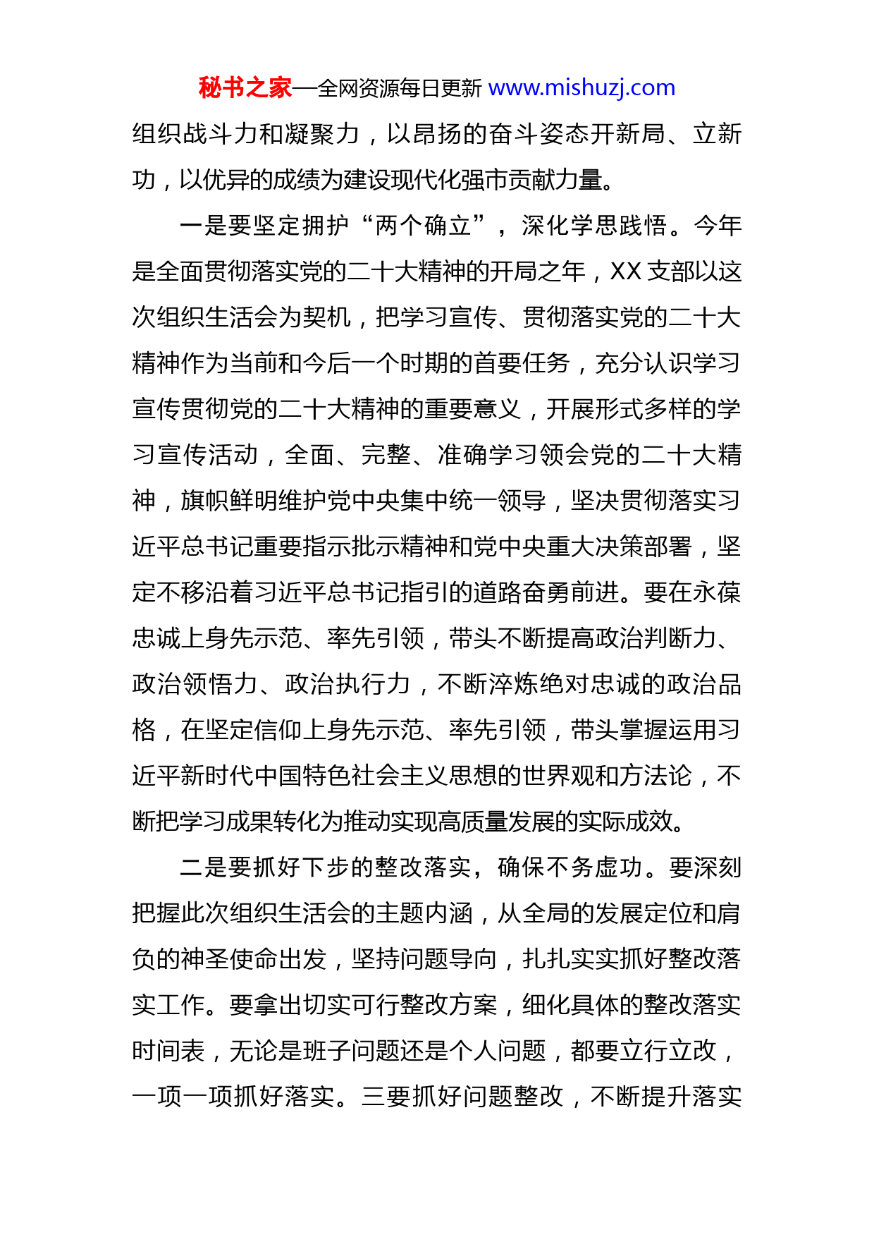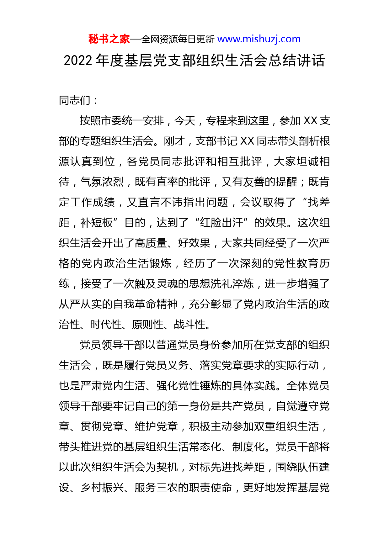 秘书之家—全网资源每日更新www.mishuzj.com2022年度基层党支部组织生活会总结讲话同志们:按照市委统一安排,今天,专程来到这里,参加XX支部的专题组织生活会。刚才,支部书记XX同志带头剖析根源认真到位,各党员同志批评和相互批评,大家坦诚相待,气氛浓烈,既有直率的批评,又有友善的提醒;既肯定工作成绩,又直言不讳指出问题,会议取得了“找差距,补短板”目的,达到了“红脸出汗”的效果。这次组织生活会开出了高质量、好效果,大家共同经受了一次严格的党内政治生活锻炼,经历了一次深刻的党性教育历练,接受了一次触及灵魂的思想洗礼淬炼,进一步增强了从严从实的自我革命精神,充分彰显了党内政治生活的政治性、时代性、原则性、战斗性。党员领导干部以普通党员身份参加所在党支部的组织生活会,既是履行党员义务、落实党章要求的实际行动,也是严肃党内生活、强化党性锤炼的具体实践。全体党员领导干部要牢记自己的第一身份是共产党员,自觉遵守党章、贯彻党章、维护党章,积极主动参加双重组织生活,带头推进党的基层组织生活常态化、制度化。党员干部将以此次组织生活会为契机,对标先进找差距,围绕队伍建设、乡村振兴、服务三农的职责使命,更好地发挥基层党秘书之家—全网资源每日更新www.mishuzj.com组织战斗力和凝聚力,以昂扬的奋斗姿态开新局、立新功,以优异的成绩为建设现代化强市贡献力量。一是要坚定拥护“两个确立”,深化学思践悟。今年是全面贯彻落实党的二十大精神的开局之年,XX支部以这次组织生活会为契机,把学习宣传、贯彻落实党的二十大精神作为当前和今后一个时期的首要任务,充分认识学习宣传贯彻党的二十大精神的重要意义,开展形式多样的学习宣传活动,全面、完整、准确学习领会党的二十大精神,旗帜鲜明维护党中央集中统一领导,坚决贯彻落实习近平总书记重要指示批示精神和党中央重大决策部署,坚定不移沿着习近平总书记指引的道路奋勇前进。要在永葆忠诚上身先示范、率先引领,带头不断提高政治判断力、政治领悟力、政治执行力,不断淬炼绝对忠诚的政治品格,在坚定信仰上身先示范、率先引领,带头掌握运用习近平新时代中国特色社会主义思想的世界观和方法论,不断把学习成果转化为推动实现高质量发展的实际成效。二是要抓好下步的整改落实,确保不务虚功。要深刻把握此次组织生活会的主题内涵,从全局的发展定位和肩负的神圣使命出发,坚持问题导向,扎扎实实抓好整改落实工作。要拿出切实可行整改方案,细化具体的整改落实时间表,无论是班子问题还是个人问题,都要立行立改,一项一项抓好落实。三要抓好问题整改,不断提升落实秘书之家—全网资源每日更新www.mishuzj.com力。坚持“当下改”和“长久立”相结合,对查摆出的“病因”,要进行“开药治病”。党支部、党小组要制定整改方案,梳理出问题清单,明确整改措施、整改责任人,列出整改时限,逐条进行研究,拿出切实可行的办法确保问题得到及时解决,以问题整改的实际成效推动政法工作迈上新台阶。三是要持续深化会议成效,落地高质量发展的生动实践。以此次组织生活会为新起点,把会议统一思想、提神聚气、自我革新、不断完善的成果转化为开拓奋进的自觉行动。在负重担当上身先示范、率先引领,带头胸怀“两个大局”、牢记“国之大者”,增强“时时放心不下”的责任感,提振担当作为的精气神,把干的作风、干的劲头传导下去,不断形成“地方敢闯、企业敢干、群众敢首创”的浓厚氛围;要着眼“五个过硬”,深化支部特色品牌党建,聚焦“强党建、强履职、强基础、强队伍、强作风”,扎实推进落实市场监管所标准化规范化建设。要。在增强本领上身先示范、率先引领,带头准确识变、科学应变、主动求变,不断增强推动高质量发展本领、服务群众本领,始终保持同人民群众的血肉联系,当好良好社会风气的引领者、营造者、维护者。秘书之家—全网资源每日更新www.mishuzj.com