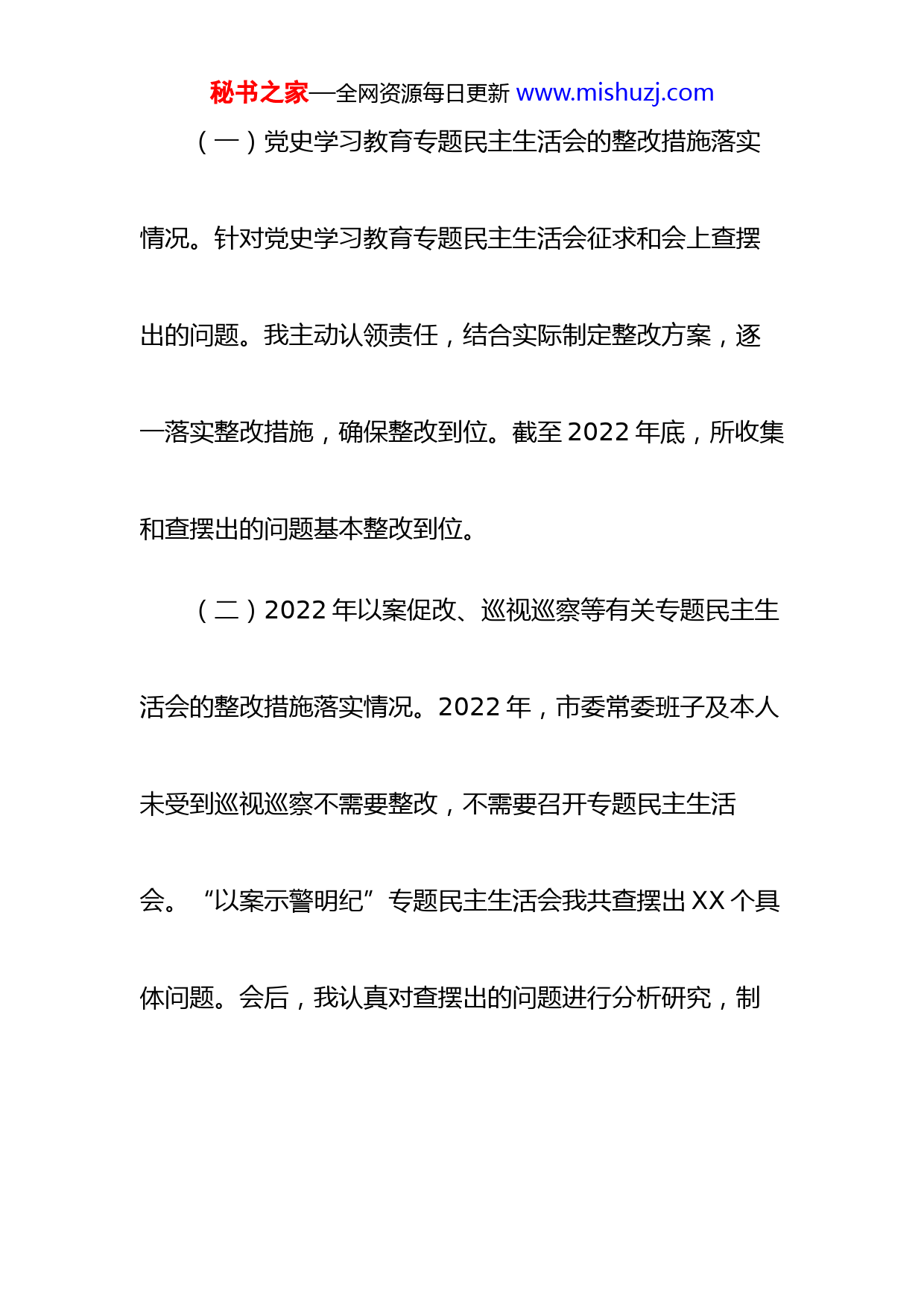 秘书之家—全网资源每日更新www.mishuzj.com2022年度市委常委班子民主生活会个人发言提纲按照本次民主生活会要求,我紧扣本次民主生活会主题,认真做好各项工作,在制定学习计划、开展理论教育、广泛征求意见、谈心谈话的基础上,对照“六个方面”内容,深入开展批评与自我批评,深刻查摆检视,深挖问题根源,明确了今后努力的方向和整改措施。现对照检查如下:一、党史学习教育专题民主生活会和2022年以案促改、巡视巡察等有关专题民主生活的整改措施落实情况秘书之家—全网资源每日更新www.mishuzj.com(一)党史学习教育专题民主生活会的整改措施落实情况。针对党史学习教育专题民主生活会征求和会上查摆出的问题。我主动认领责任,结合实际制定整改方案,逐一落实整改措施,确保整改到位。截至2022年底,所收集和查摆出的问题基本整改到位。(二)2022年以案促改、巡视巡察等有关专题民主生活会的整改措施落实情况。2022年,市委常委班子及本人未受到巡视巡察不需要整改,不需要召开专题民主生活会。“以案示警明纪”专题民主生活会我共查摆出XX个具体问题。会后,我认真对查摆出的问题进行分析研究,制秘书之家—全网资源每日更新www.mishuzj.com定整改措施,明确整改重点,落实整改责任,全力做好整改。目前,所收集和查摆出的问题基本整改到位。(三)本次民主生活会征求意见情况。本次民主生活会我共征集到XX条意见建议,主要包括经济建设、民生改善、思想作风等方面的内容。我将针对存在的问题,及时制定整改方案,并逐条抓好整改落实。二、检视存在的问题(一)在带头深刻领悟“两个确立”的决定性意义,增强“四个意识”、坚定“四个自信”、做到“两个维护”方面。我能够深入学习和把握“两个确立”的丰富内涵和重大意义,不断增强“四个意识”、坚定“四个自秘书之家—全网资源每日更新www.mishuzj.com信”、做到“两个维护”,在思想上政治上行动上同以习近平同志为核心的党中央保持高度一致。但对照更高标准和要求,仍存在一些差距和不足:一是政治判断力还要提升。XXX召开后,我能够第一时间召开常委会传达学习,但在贯彻落实上仍有欠缺,特别是在谋划推动XX高质量发展中,如何把“两个确立”充分体现贯彻出来,思考和站位还不够。比如,在XXX报告中提出要建设现代化产业体系,虽然XX一年来集中力量抓产业,引进了一批企业,建成了一批见效快的项目,但是产业基础薄弱,缺乏支柱产业的现状还没能有效解决。秘书之家—全网资源每日更新www.mishuzj.com二是政治领悟力还要提升。在推动XX发展时,没能更好地将XX的发展放到全区、全国的大局中去思考、谋划,没能做到既为一域争光,更为全局添彩。XX在经济社会发展上仍处于落后不发达地区。三是政治执行力还要提升。我始终树牢“四个意识”,坚定“四个自信”,坚决做到“两个维护”,做到党中央提倡的坚决响应,党中央决定的坚决执行,党中央禁止的坚决杜绝,但在实际执行过程中,有时存在政治敏锐性还不够,维护权威还不够自觉。比如,对全市党员干部的约束和管理还不够严格,对社会上、网络上传播的一些隐蔽性较强的负面信息警惕性不够。秘书之家—全网资源每日更新www.mishuzj.com(二)在带头用习近平新时代中国特色社会主义思想凝心铸魂方面。我坚持把学习贯彻习近平新时代中国特色社会主义思想作为必修课、终身课,深入学习、系统把握,始终保持政治立场不移、政治方向不偏。但认真对照查摆,还存在一些不足。一是全面学习不够系统。在对习近平新时代中国特色社会主义思想的学习不够全面,学习内容单一,有时仅仅满足于业务工作知识的学习,综合学习不够,特别是有时出现工学矛盾时,往往把学习往后推,之后再挤时间补学。秘书之家—全网资源每日更新www.mishuzj.com二是学懂弄通不够深入。在理论学习中更多的是以看材料、看新闻等方式,代替读原著、学经典,满足于一般化的学习理解、快餐式的了解掌握,有时只注重学习内容、学习任务的完成,忽视了学习方法、学习效果。比如,在市委理论中心组学习上,就被XX列席旁听的领导指出XX在学习内容安排上统筹不够好,存在学习内容过多,学得不够透彻等问题。三是知行合一不够紧密。针对工作中出现的新情况、新问题,没有全面掌握、深入分析,缺乏针对性、操作性,存在理论联系实际、学以致用不够的问题。比如,对秘书之家—全网资源每日更新www.mishuzj.com新发展理念理解还不透彻,未能充分以改革创新为引领,推动XX产业更好更快地转型升级。(三)在带头坚持和加强党的全面领导方面。我始终注重坚持和加强党的全面领导,严守党的政治纪律和政治规矩,重大原则问题上立场坚定,大是大非面前头脑清醒、旗帜鲜明。但认真对照查摆,还存在一些不足。一是贯彻民主集中制方面还有差距。工作中,我很重视坚持民主集中制和发挥每个班子成员的积极性,很多工作都想办法与分管同志及时沟通、充分讨论,形成一致意见。但有时研究工作,听取班子成员的意见还是不够充分,在集体决策研究的时候,畅所欲言的局面没有完全打秘书之家—全网资源每日更新www.mishuzj.com开,没能把大家的积极性、主动性充分调动起来。有时对一些时限性强的工作,在征求分管领导、基层群众等多方面意见上做的不彻底、不全面,决策的