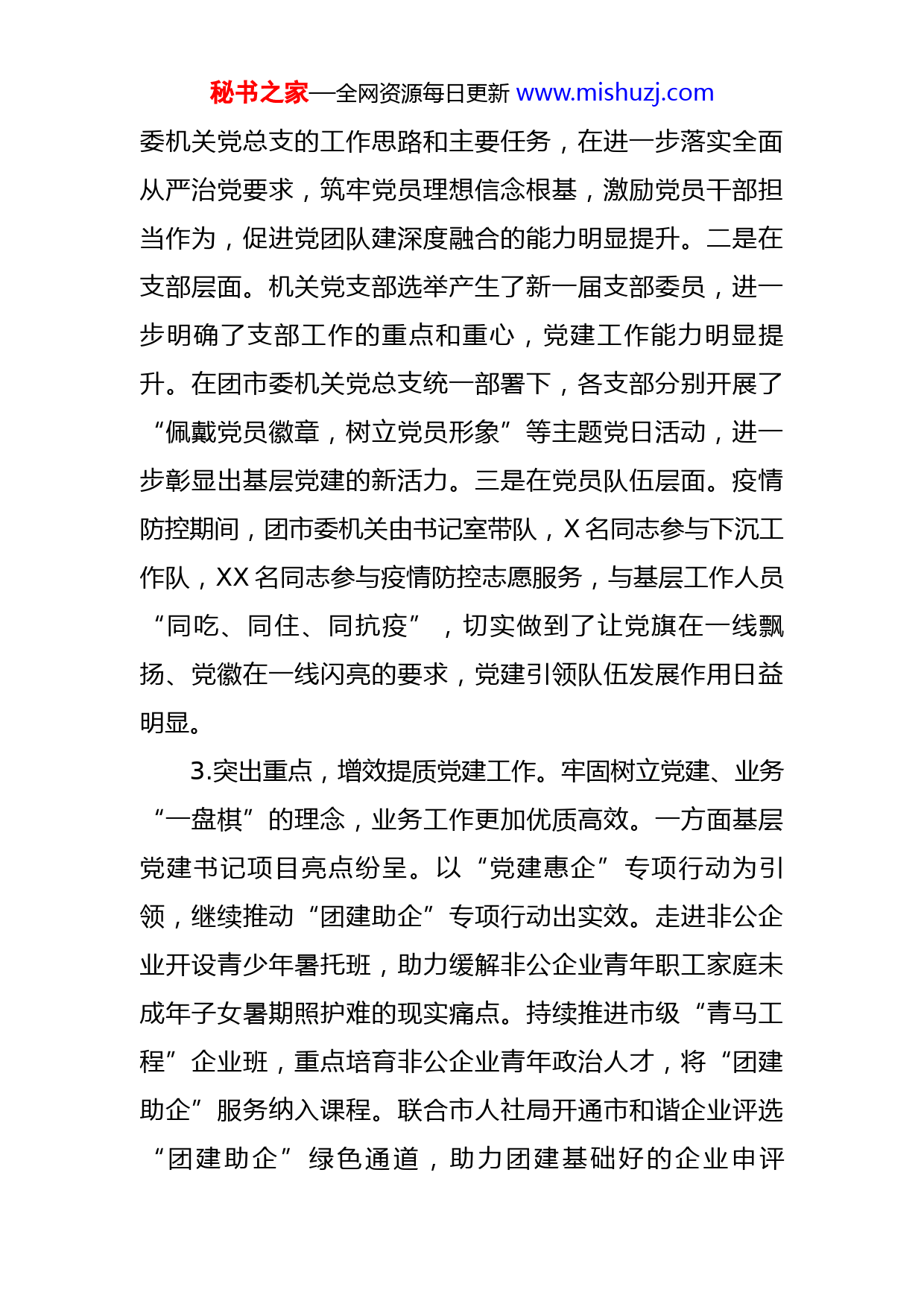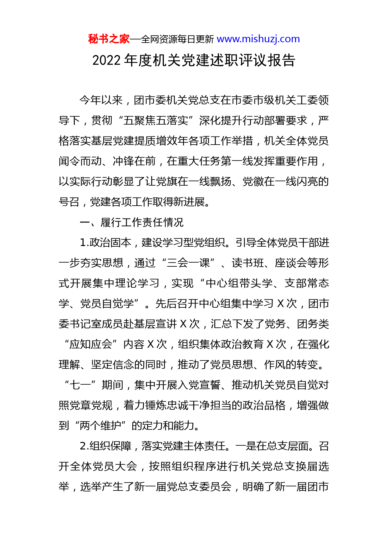 秘书之家—全网资源每日更新www.mishuzj.com2022年度机关党建述职评议报告今年以来,团市委机关党总支在市委市级机关工委领导下,贯彻“五聚焦五落实”深化提升行动部署要求,严格落实基层党建提质增效年各项工作举措,机关全体党员闻令而动、冲锋在前,在重大任务第一线发挥重要作用,以实际行动彰显了让党旗在一线飘扬、党徽在一线闪亮的号召,党建各项工作取得新进展。一、履行工作责任情况1.政治固本,建设学习型党组织。引导全体党员干部进一步夯实思想,通过“三会一课”、读书班、座谈会等形式开展集中理论学习,实现“中心组带头学、支部常态学、党员自觉学”。先后召开中心组集中学习X次,团市委书记室成员赴基层宣讲X次,汇总下发了党务、团务类“应知应会”内容X次,组织集体政治教育X次,在强化理解、坚定信念的同时,推动了党员思想、作风的转变。“七一”期间,集中开展入党宣誓、推动机关党员自觉对照党章党规,着力锤炼忠诚干净担当的政治品格,增强做到“两个维护”的定力和能力。2.组织保障,落实党建主体责任。一是在总支层面。召开全体党员大会,按照组织程序进行机关党总支换届选举,选举产生了新一届党总支委员会,明确了新一届团市秘书之家—全网资源每日更新www.mishuzj.com委机关党总支的工作思路和主要任务,在进一步落实全面从严治党要求,筑牢党员理想信念根基,激励党员干部担当作为,促进党团队建深度融合的能力明显提升。二是在支部层面。机关党支部选举产生了新一届支部委员,进一步明确了支部工作的重点和重心,党建工作能力明显提升。在团市委机关党总支统一部署下,各支部分别开展了“佩戴党员徽章,树立党员形象”等主题党日活动,进一步彰显出基层党建的新活力。三是在党员队伍层面。疫情防控期间,团市委机关由书记室带队,X名同志参与下沉工作队,XX名同志参与疫情防控志愿服务,与基层工作人员“同吃、同住、同抗疫”,切实做到了让党旗在一线飘扬、党徽在一线闪亮的要求,党建引领队伍发展作用日益明显。3.突出重点,增效提质党建工作。牢固树立党建、业务“一盘棋”的理念,业务工作更加优质高效。一方面基层党建书记项目亮点纷呈。以“党建惠企”专项行动为引领,继续推动“团建助企”专项行动出实效。走进非公企业开设青少年暑托班,助力缓解非公企业青年职工家庭未成年子女暑期照护难的现实痛点。持续推进市级“青马工程”企业班,重点培育非公企业青年政治人才,将“团建助企”服务纳入课程。联合市人社局开通市和谐企业评选“团建助企”绿色通道,助力团建基础好的企业申评秘书之家—全网资源每日更新www.mishuzj.com“XXX市和谐企业”。另一方面“惠企助才”党建联盟精益求精。4.清风助力,提升党员党性修养。一是作风建设要求进一步严格。围绕全面加强机关党员干部能力素质的目标任务,通过改进工作作风、提高自律意识、筑牢思想防线,党员干部素质不断提升。改进党员工作作风。落实关于改进工作作风、密切联系群众的有关规定。上半年,根据市委巡察整改专项督查组工作要求,高质量做好团市委关于巡察整改落实情况回头看工作,专题开展“端午、中秋、国庆”等重要节日节点廉政提醒工作,干部职工的思想意识得到了明显提升。半年来,所有干部职工都能按照工作需要深入基层一线开展工作,在融合发展”先锋行动重点项目“团建助企专项行动”开展过程中,组织团组织工作力量深入基层帮助企业开展助企协作服务,在各项工作中无违反作风建设细则的行为发生。二是党员自律意识进一步提升。坚持警示教育常态化,充分利用集体学习、党员大会、以会代学等机会,常态化开展月度“清风课堂”工作,组织党员干部职工开展对《党章》《中国共产党问责条例》等有关知识的学习,不断提高党员干部职工的廉洁意识和增强防腐拒变的能力。上半年,组织开展“清风课堂”X次,向党员干部通报了违纪案件及查出情况。三是党员思想防线进一步筑牢。积极参加机关工委组织的党组书秘书之家—全网资源每日更新www.mishuzj.com记培训班、党务工作者培训班,并适时组织党支部书记与党员进行谈心谈话,在支部班子成员之间开展经常性的谈心谈话,确保党员干部绷紧廉洁自律和作风建设这根弦。二、存在的主要问题1.党建工作第一责任人职责落实还有待加强。虽然能定期研究、开展党建工作并制定工作措落,但在具体工作推进中,备促落实、跟踪问效上力度不够,在更好的指导党建工作开展上还有差距。2.党建特色亮点还不够明显。党支部组织生活的内容和形式比较单一,党员教育培训“走出去学的少”,对党建面临的新问题、新情况研究不够深,对抓党建和促业务的结合点找的还不够准,在探索党建新模式、释放党建新活力上还有待创新。3.党建激励作用需进一步发挥。对干部队伍中的先进典型发现的不够及时,对先进事迹宣传的不等广泛,党建激励作用发挥的还不够充分。对于这些存在的问题,我们将在下步工作中认真加以改进。三、下一步工作打算(一)规范提升机关党建工作1.以思想建设为抓手。把学习贯彻党的十九届六中全会精神与学习贯彻省第XX次党代会精神紧密结合,与全面落实市党代会部署要求紧密结合,与做好2022年度共青团系秘书之家—全