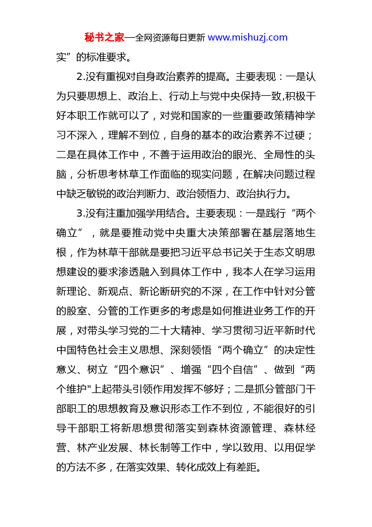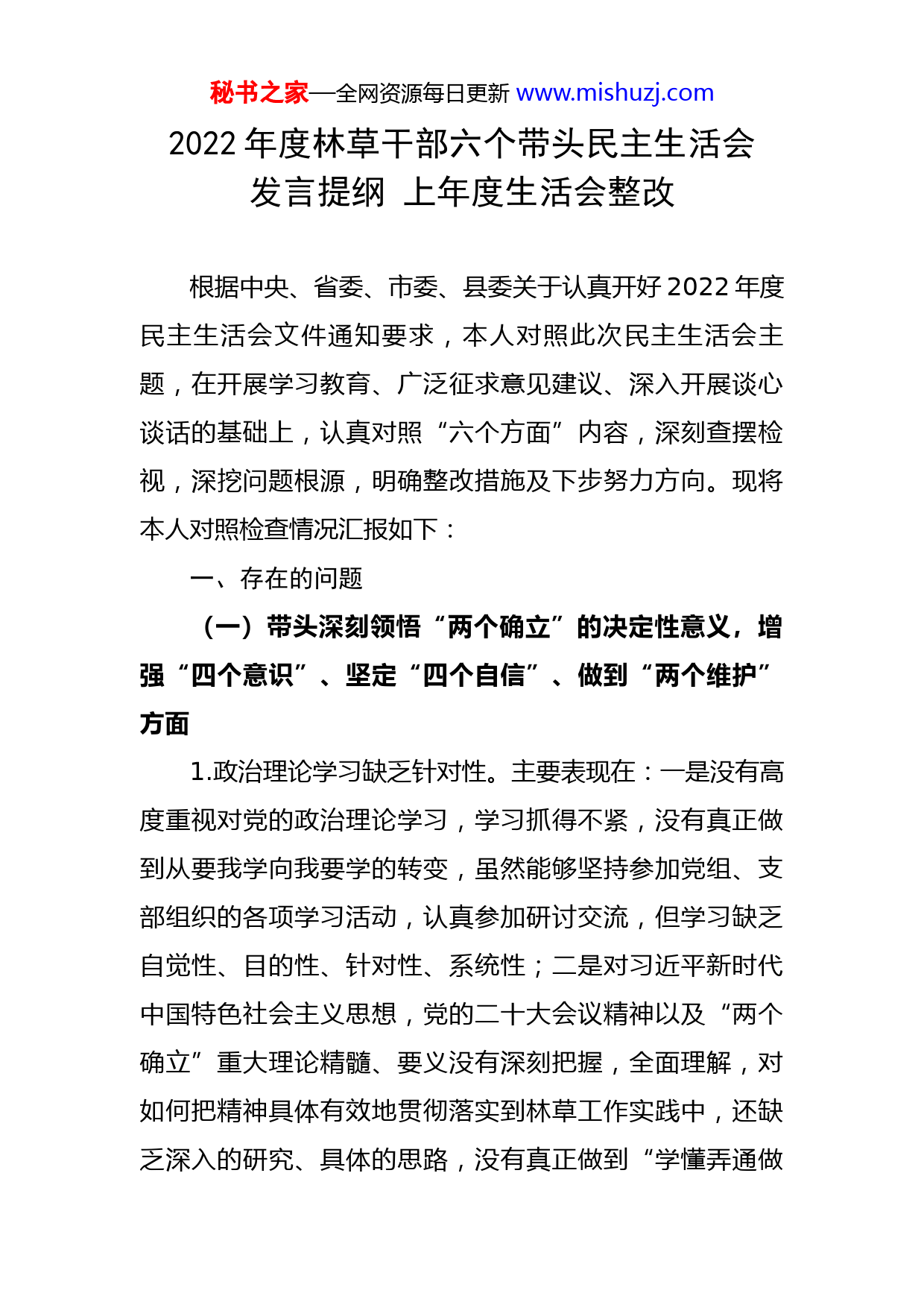 秘书之家—全网资源每日更新www.mishuzj.com2022年度林草干部六个带头民主生活会发言提纲上年度生活会整改根据中央、省委、市委、县委关于认真开好2022年度民主生活会文件通知要求,本人对照此次民主生活会主题,在开展学习教育、广泛征求意见建议、深入开展谈心谈话的基础上,认真对照“六个方面”内容,深刻查摆检视,深挖问题根源,明确整改措施及下步努力方向。现将本人对照检查情况汇报如下:一、存在的问题(一)带头深刻领悟“两个确立”的决定性意义,增强“四个意识”、坚定“四个自信”、做到“两个维护”方面1.政治理论学习缺乏针对性。主要表现在:一是没有高度重视对党的政治理论学习,学习抓得不紧,没有真正做到从要我学向我要学的转变,虽然能够坚持参加党组、支部组织的各项学习活动,认真参加研讨交流,但学习缺乏自觉性、目的性、针对性、系统性;二是对习近平新时代中国特色社会主义思想,党的二十大会议精神以及“两个确立”重大理论精髓、要义没有深刻把握,全面理解,对如何把精神具体有效地贯彻落实到林草工作实践中,还缺乏深入的研究、具体的思路,没有真正做到“学懂弄通做秘书之家—全网资源每日更新www.mishuzj.com实”的标准要求。2.没有重视对自身政治素养的提高。主要表现:一是认为只要思想上、政治上、行动上与党中央保持一致,积极干好本职工作就可以了,对党和国家的一些重要政策精神学习不深入,理解不到位,自身的基本的政治素养不过硬;二是在具体工作中,不善于运用政治的眼光、全局性的头脑,分析思考林草工作面临的现实问题,在解决问题过程中缺乏敏锐的政治判断力、政治领悟力、政治执行力。3.没有注重加强学用结合。主要表现:一是践行“两个确立”,就是要推动党中央重大决策部署在基层落地生根,作为林草干部就是要把习近平总书记关于生态文明思想建设的要求渗透融入到具体工作中,我本人在学习运用新理论、新观点、新论断研究的不深,在工作中针对分管的股室、分管的工作更多的考虑是如何推进业务工作的开展,对带头学习党的二十大精神、学习贯彻习近平新时代中国特色社会主义思想、深刻领悟“两个确立”的决定性意义、树立“四个意识”、增强“四个自信”、做到“两个维护"上起带头引领作用发挥不够好;二是抓分管部门干部职工的思想教育及意识形态工作不到位,不能很好的引导干部职工将新思想贯彻落实到森林资源管理、森林经营、林产业发展、林长制等工作中,学以致用、以用促学的方法不多,在落实效果、转化成效上有差距。秘书之家—全网资源每日更新www.mishuzj.com(二)带头用习近平新时代中国特色社会主义思想凝心铸魂方面1.工作积极性不高。主要表现:一是虽然能够尽心尽责干好本职工作,但随着年龄的增长,工作锐气、劲头有所减弱,出现思想懒惰、精神萎靡的现象,面对图斑核查、木材加工厂整治等一些急难险重任务,思想上有畏难情绪;二是在推进各项工作落实中,有依赖心理,总觉得上有局长掌舵,下有股室的同志具体负责,自己当当“二传手”“传话筒"就行,缺乏攻坚克难的勇气,有矛盾简单上交的现象。2.创新意识不强。主要表现:一是面对森林资源管理过程中存在的各种困难和问题,不敢大胆的进行改革创新,缺乏探索精神,还习惯凭经验考虑问题和办事,习惯用一些老办法、老套路、老思维来想问题,干工作;二是不能结合新时期林草工作的特点,XX林产业发展来思考谋划工作,在抓林木采伐许可权限下放、木材加工企业治理整顿等工作中,思路不清、办法不多、效果不明显。3.贯彻执行不坚决。主要表现:一是有时对中央的重大决策、上级的部署要求,尤其是县委、政府和局党组的要求,站位不高、理解不透,执行不到位的情况,如木材加工企业的治理整顿没有按县委政府的要求完成工作任务;二是工作的主动性不够,在抓资源管理、用地保障等具体秘书之家—全网资源每日更新www.mishuzj.com工作过程中,强调客观条件多,主动想办法解决问题不够积极,办法不多。(三)带头坚持和加强党的全面领导方面1.党建工作没有主动抓。主要表现:一是对党建工作的重要性和紧迫性认识和理解不到位,自觉做好主体责任践行者、引领者和示范者不到位,落实主体责任成效不明显;二是按照“严规矩、转作风、树形象、加强基层干部队伍建设百日行动”的工作要求,自我管理、自我要求不严,对分管部门、联系支部的督促指导不够,落实第一责任人责任仍有差距。2.党建引领作用没有充分发挥。主要表现:一是对发挥基层党组织政治功能思考谋划的不多,对分管部门党员干部经常性教育和监督不到位;二是在抓分管工作过程中,没能充分发挥党组织的战斗堡垒作用,靠行政手段多,靠教育引导少,党组织的战斗力、凝聚力、向心力发挥不明显,抓党建促工作效果不明显。3.没有全面的抓好意识形态工作。主要表现:一是自身对意识形态工作的极端重要性和面临的严峻形势认识不到位,对如何抓好林草领域意识形态工作没有进行主动思考、没有进行认真分析研判,没有有效的办法措施;二是履行“一岗双责”不到位,没能很好的指导帮助分管部门抓好意识形态工作,亲自抓、亲自督办意识形态工作力度秘书之家—全网资源每日更新www.mishuzj.com不够。(四)带头坚持以人民为中心的