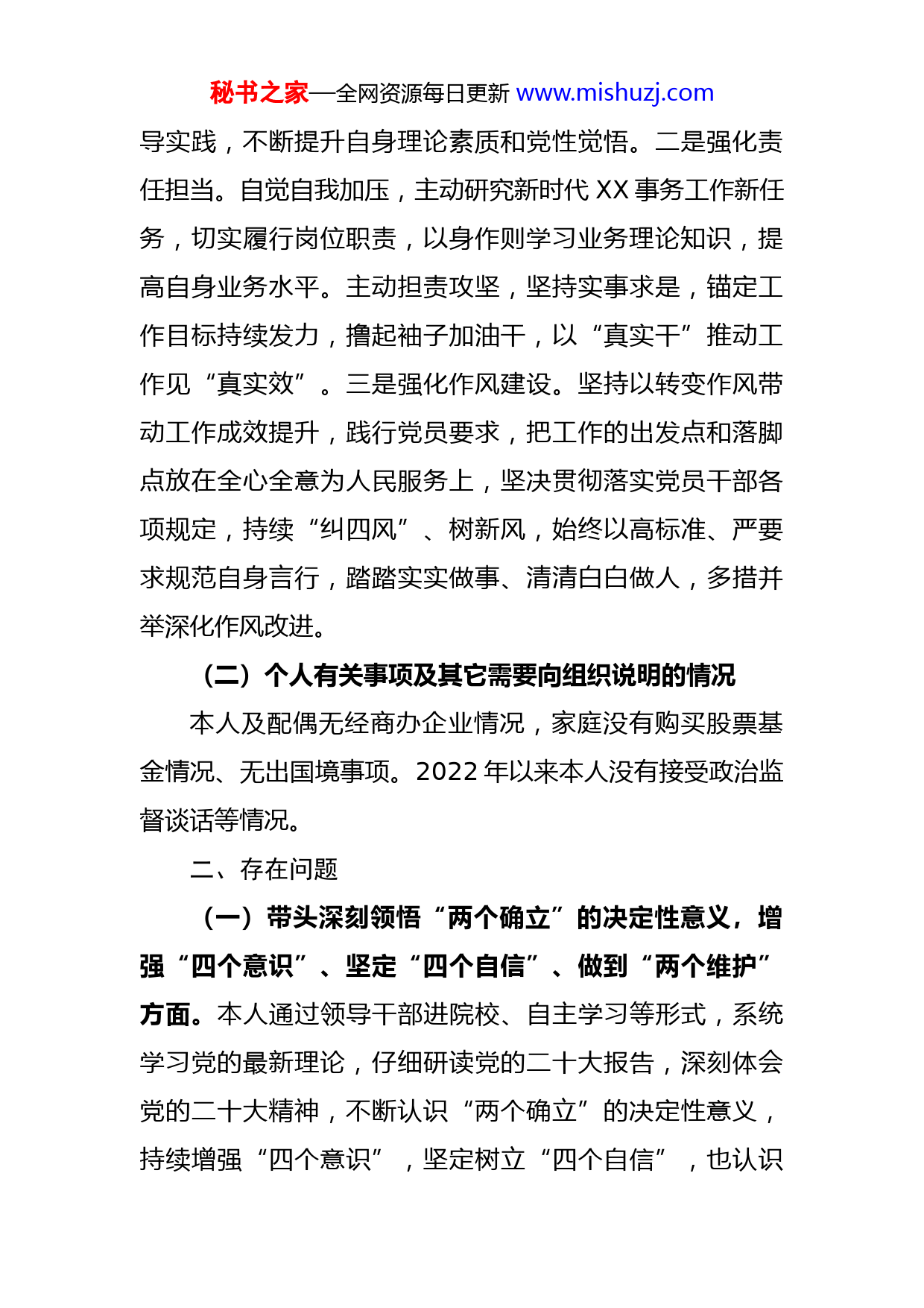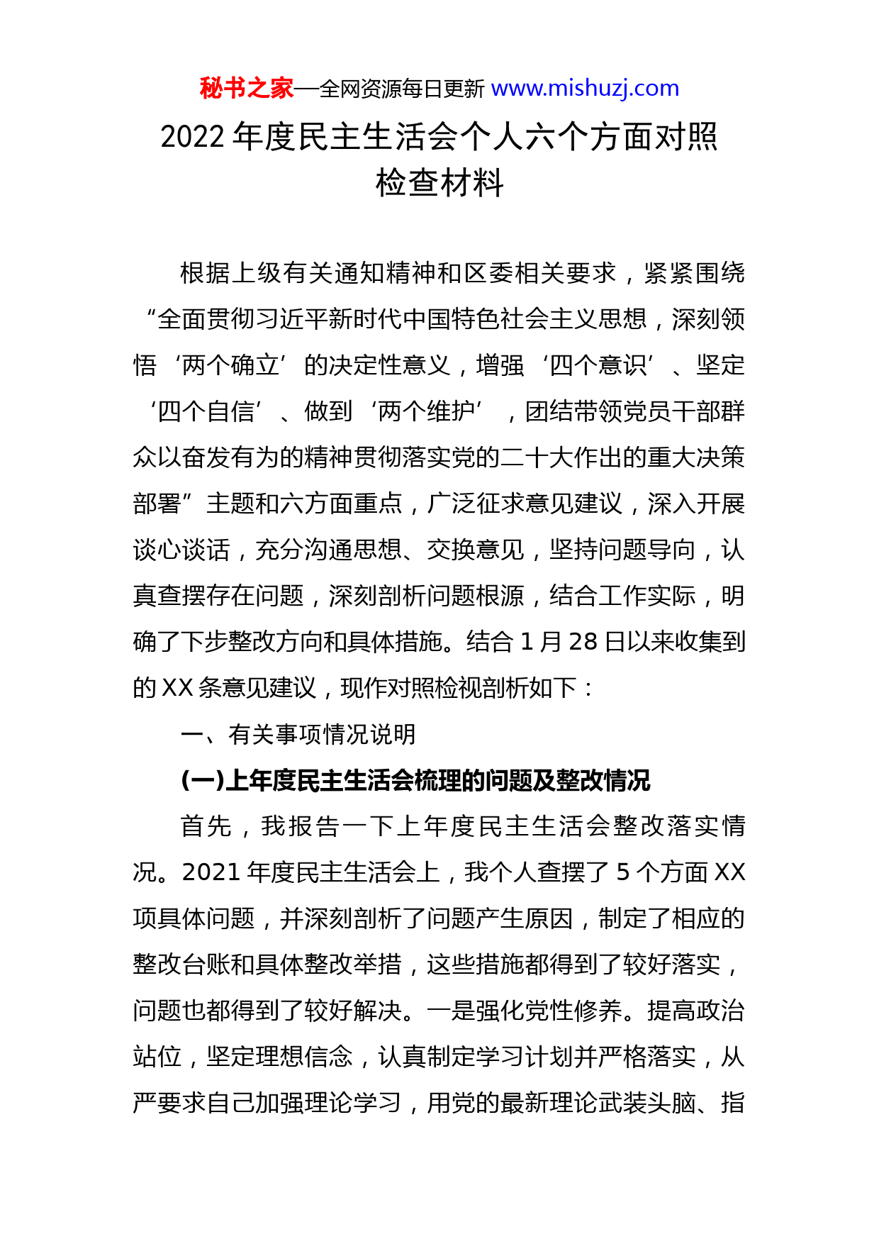 秘书之家—全网资源每日更新www.mishuzj.com2022年度民主生活会个人六个方面对照检查材料根据上级有关通知精神和区委相关要求,紧紧围绕“全面贯彻习近平新时代中国特色社会主义思想,深刻领悟‘两个确立’的决定性意义,增强‘四个意识’、坚定‘四个自信’、做到‘两个维护’,团结带领党员干部群众以奋发有为的精神贯彻落实党的二十大作出的重大决策部署”主题和六方面重点,广泛征求意见建议,深入开展谈心谈话,充分沟通思想、交换意见,坚持问题导向,认真查摆存在问题,深刻剖析问题根源,结合工作实际,明确了下步整改方向和具体措施。结合1月28日以来收集到的XX条意见建议,现作对照检视剖析如下:一、有关事项情况说明(一)上年度民主生活会梳理的问题及整改情况首先,我报告一下上年度民主生活会整改落实情况。2021年度民主生活会上,我个人查摆了5个方面XX项具体问题,并深刻剖析了问题产生原因,制定了相应的整改台账和具体整改举措,这些措施都得到了较好落实,问题也都得到了较好解决。一是强化党性修养。提高政治站位,坚定理想信念,认真制定学习计划并严格落实,从严要求自己加强理论学习,用党的最新理论武装头脑、指秘书之家—全网资源每日更新www.mishuzj.com导实践,不断提升自身理论素质和党性觉悟。二是强化责任担当。自觉自我加压,主动研究新时代XX事务工作新任务,切实履行岗位职责,以身作则学习业务理论知识,提高自身业务水平。主动担责攻坚,坚持实事求是,锚定工作目标持续发力,撸起袖子加油干,以“真实干”推动工作见“真实效”。三是强化作风建设。坚持以转变作风带动工作成效提升,践行党员要求,把工作的出发点和落脚点放在全心全意为人民服务上,坚决贯彻落实党员干部各项规定,持续“纠四风”、树新风,始终以高标准、严要求规范自身言行,踏踏实实做事、清清白白做人,多措并举深化作风改进。(二)个人有关事项及其它需要向组织说明的情况本人及配偶无经商办企业情况,家庭没有购买股票基金情况、无出国境事项。2022年以来本人没有接受政治监督谈话等情况。二、存在问题(一)带头深刻领悟“两个确立”的决定性意义,增强“四个意识”、坚定“四个自信”、做到“两个维护”方面。本人通过领导干部进院校、自主学习等形式,系统学习党的最新理论,仔细研读党的二十大报告,深刻体会党的二十大精神,不断认识“两个确立”的决定性意义,持续增强“四个意识”,坚定树立“四个自信”,也认识秘书之家—全网资源每日更新www.mishuzj.com坚决做到“两个维护”是我们永葆共产党人政治本色的先决条件,必须毫不懈怠加强党的思想建设,持之以恒一以贯之。但这些对标党组织的要求,还存在一定差距。一是理论学习还不够深入。学习党的新理论新思想片面学习得多、系统学习得少,理论了解得多、学懂弄通得少,对特定主题、专题内容学习得较为深入,对马克思主义基本原理和与中国具体实践相结合的理论根源探究得较少,对党章党规等党的实践成果没有逐字逐句的研究摸透,缺乏详细深入透彻的理解,学习认识还没有全部领悟到位。二是领悟认识和工作结合还不够紧密。在日常工作中,没能把增强“四个意识”、坚定“四个自信”、做到“两个维护”同具体工作密切结合,应用到实际工作中还不够彻底,党员干部的核心作用发挥得还不够充分,比如在推动XX工作中,解决历史遗留问题考虑高度还不够,理论认识没有更好得转化为方法行动,党组织的引领作用还不够坚强,在学用结合上还有空间,与群众期望还有差距。(二)带头用习近平新时代中国特色社会主义思想凝心铸魂方面。本人带头学习贯彻习近平新时代中国特色社会主义思想,坚持用党的最新理论成果武装头脑、推动工作。但对照新时代新要求,还存在一些差距。一是思想根基铸得还不够牢。本人在学习贯彻习近平新时代中国特色社会主义思想过程中,对理论的科学内涵领会认识得还不秘书之家—全网资源每日更新www.mishuzj.com够全面深刻,缺乏系统性的理解,在学懂弄通做实上还有差距。在思想理论的学习时效性上还不够与时俱进,在原原本本、原汁原味学习习近平新时代中国特色社会主义思想上用力不足,存在一定的懈怠心理,信仰之基、思想之基夯实得还不够坚实牢固。二是思想引领发挥得还不够好。充分运用习近平新时代中国特色社会主义思想解决新矛盾、推动新发展的主动性不足,学用贯通连接性不强,没能自觉坚持好、运用好习近平新时代中国特色社会主义思想贯穿其中的立场观点方法,知其然未知其所以然,入脑入心程度不深,政治引领作用发挥不够,带动干事创业的积极性还存在欠缺。(三)带头坚持和加强党的全面领导方面。本人坚决贯彻党的各项原则,坚持从严治党,履行“一岗双责”,贯彻执行民主集中制,注意有关纪律和单位各项制度。但同增强党组织政治和组织功能、夯实党的执政根基要求还存在一定差距。一是贯彻党组织作用发挥还不够。没有把习近平总书记对XX事务工作的指示精神与我区XX服务管理保障工作的实际紧密结合起来,运用新思想解决实际问题还有差距,没有较好推动党组织在党员教育管理、先锋模范引领上充分发挥作用。二是夯实党的执政根基主动性还不够。对新时期党的执政基础警惕性还有一定