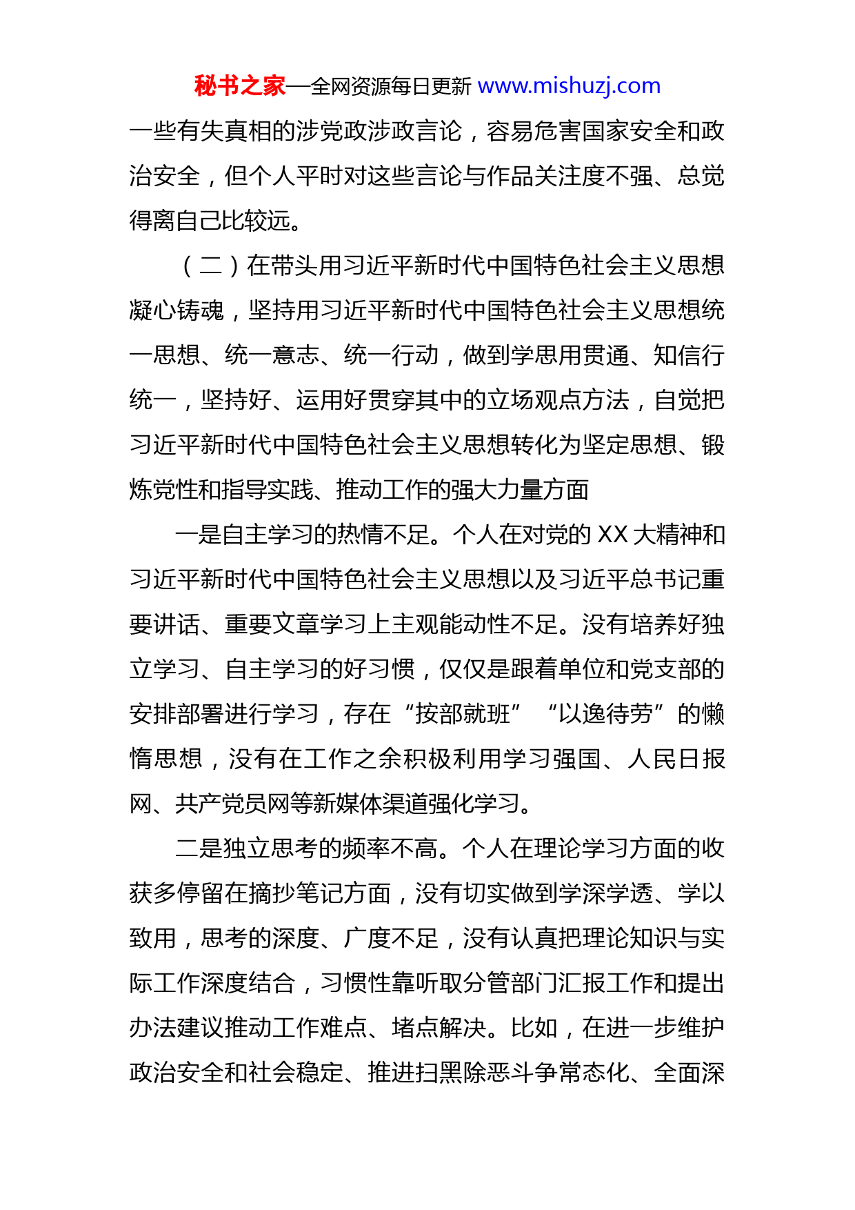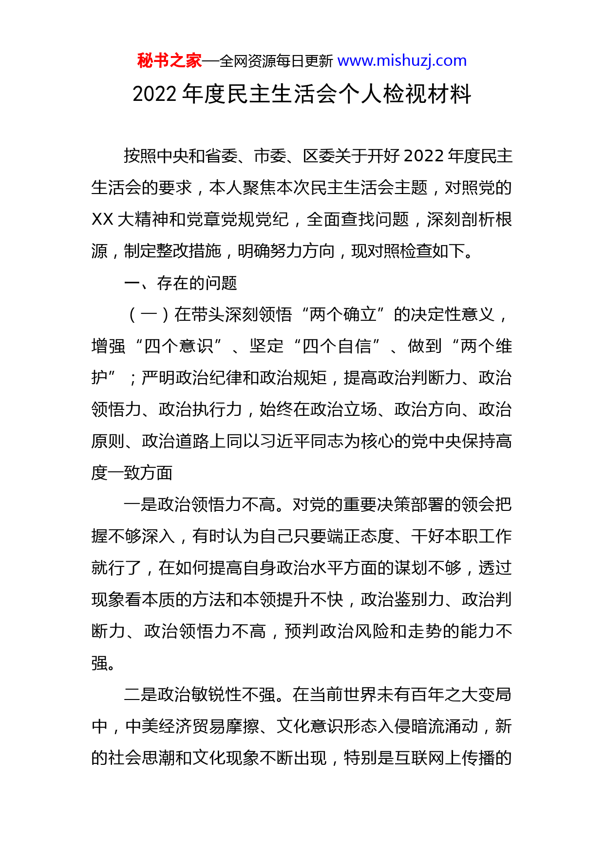 秘书之家—全网资源每日更新www.mishuzj.com2022年度民主生活会个人检视材料按照中央和省委、市委、区委关于开好2022年度民主生活会的要求,本人聚焦本次民主生活会主题,对照党的XX大精神和党章党规党纪,全面查找问题,深刻剖析根源,制定整改措施,明确努力方向,现对照检查如下。一、存在的问题(一)在带头深刻领悟“两个确立”的决定性意义,增强“四个意识”、坚定“四个自信”、做到“两个维护”;严明政治纪律和政治规矩,提高政治判断力、政治领悟力、政治执行力,始终在政治立场、政治方向、政治原则、政治道路上同以习近平同志为核心的党中央保持高度一致方面一是政治领悟力不高。对党的重要决策部署的领会把握不够深入,有时认为自己只要端正态度、干好本职工作就行了,在如何提高自身政治水平方面的谋划不够,透过现象看本质的方法和本领提升不快,政治鉴别力、政治判断力、政治领悟力不高,预判政治风险和走势的能力不强。二是政治敏锐性不强。在当前世界未有百年之大变局中,中美经济贸易摩擦、文化意识形态入侵暗流涌动,新的社会思潮和文化现象不断出现,特别是互联网上传播的秘书之家—全网资源每日更新www.mishuzj.com一些有失真相的涉党政涉政言论,容易危害国家安全和政治安全,但个人平时对这些言论与作品关注度不强、总觉得离自己比较远。(二)在带头用习近平新时代中国特色社会主义思想凝心铸魂,坚持用习近平新时代中国特色社会主义思想统一思想、统一意志、统一行动,做到学思用贯通、知信行统一,坚持好、运用好贯穿其中的立场观点方法,自觉把习近平新时代中国特色社会主义思想转化为坚定思想、锻炼党性和指导实践、推动工作的强大力量方面一是自主学习的热情不足。个人在对党的XX大精神和习近平新时代中国特色社会主义思想以及习近平总书记重要讲话、重要文章学习上主观能动性不足。没有培养好独立学习、自主学习的好习惯,仅仅是跟着单位和党支部的安排部署进行学习,存在“按部就班”“以逸待劳”的懒惰思想,没有在工作之余积极利用学习强国、人民日报网、共产党员网等新媒体渠道强化学习。二是独立思考的频率不高。个人在理论学习方面的收获多停留在摘抄笔记方面,没有切实做到学深学透、学以致用,思考的深度、广度不足,没有认真把理论知识与实际工作深度结合,习惯性靠听取分管部门汇报工作和提出办法建议推动工作难点、堵点解决。比如,在进一步维护政治安全和社会稳定、推进扫黑除恶斗争常态化、全面深秘书之家—全网资源每日更新www.mishuzj.com化政法领域改革、法治保障高质量发展工作上存在思路弱、亮点少的问题。(三)在带头坚持和加强党的全面领导,认真贯彻民主集中制,创新和改进领导方式,增强党组织政治功能和组织功能,不折不扣把党中央决策部署和习近平总书记对贵州工作的重要指示批示精神贯彻落实好,把各领域广大群众组织凝聚好,夯实党执政的根基方面一是创新主动意识不强。虽然能够第一时间落实中央、省、市、区委的决策部署和工作要求。紧跟任务周期,认真安排调度分管部门及时推进,但基本上完成的工作没有亮点特色,在兄弟单位的排名竞争中不靠前。二是参加党组织生活不规范。个人作为班子领导干部,常以会议多、工作任务急为理由,没有完全做到以一名普通党员的身份按时参加党支部的组织活动,即使参加了活动也不自觉以领导干部身份提要求,参加组织生活的自觉性有所弱化。(四)在带头坚持以人民为中心的发展思想,推动改革发展稳定,完整准确全面贯彻新发展理念,统筹推进“五位一体”总体布局、协调推进“四个全面”战略布局,紧紧抓住解决不平衡不充分的发展问题,补短板、强弱项、固底板、扬优势,推动经济社会持续健康发展;在发展中保障和改善民生,聚焦解决人民群众急难愁盼问秘书之家—全网资源每日更新www.mishuzj.com题,让人民群众看到学习贯彻党的XX大精神的实际成效方面密切联系群众还不够。个人主观认为工作生活在XX这片红色的土地上,长期受红色文化、革命精神熏陶,党性强、素质硬,因而缺乏“日三省吾身”的韧劲,党性锻炼的主动性、自觉性不够,工作标准放低,工作要求放松,到基层调研偏少,对于群众内心想法和真实诉求掌握得不深不透不全,“察民情、访民意、解民忧”的方法路径有待进一步完善优化。(五)在带头发扬斗争精神,防范化解风险挑战,增强忧患意识,坚持底线思维,主动识变应变求变,敢于担当、积极作为,知难而进、迎难而上,统筹发展和安全,全力战胜前进道路上各种困难和挑战,依靠顽强斗争打开事业发展新天地方面主要在于自我革新进取的精神有所弱化。随着自己年龄和职务的晋升,思想上求稳,固守传统和囿于经验的时候更多,对自我要求有所松懈,安于现状,不求有功、但求无过,甚至偶尔出现“干累了,歇口气”的想法。过于强调责任分工,认为管好自己的“一亩三分地”就行了,对不属于自己分管的工作思考研究少。(六)在带头落实全面从严治党政治责任,始终绷紧从严从紧这根弦,严于律己、严负其责、严管所辖,坚持秘书之家—全网资源每日更新www.mishuzj.com以严的基调强化正风肃纪,加强新时代廉洁文化建设,锲而不舍落实中央八项规定精神,持续深化纠治“四风”,重点纠