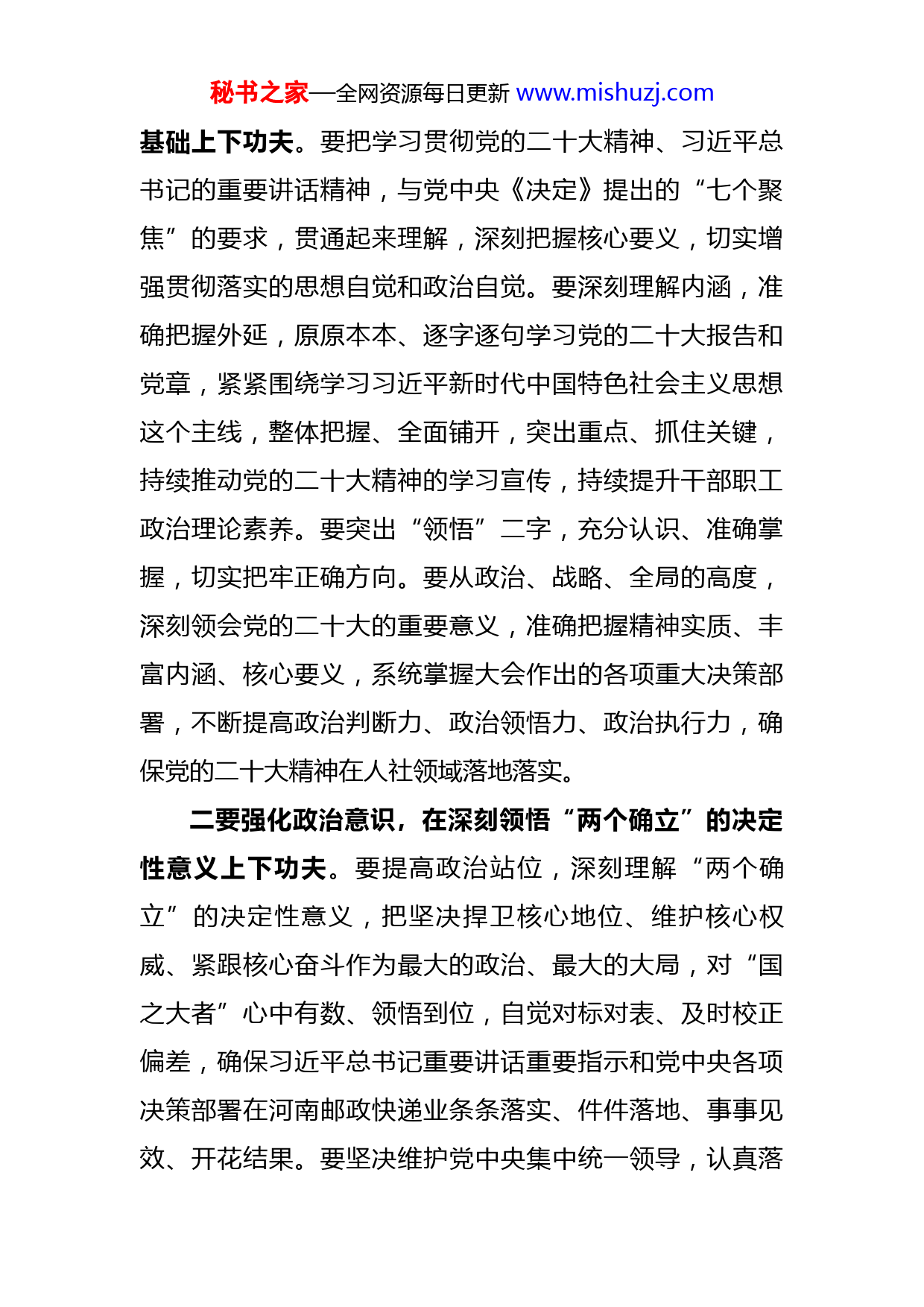 秘书之家—全网资源每日更新www.mishuzj.com2022年度民主生活会会前集中学习研讨发言提纲同志们:按照市委、市纪委关于召开2022年度民主生活相关要求,会前我认真学习了党的二十大报告全文、习近平总书记在党的二十届一中全会上的重要讲话精神、习近平总书记在中央经济工作会议上的重要讲话精神、习近平总书记在中央农村工作会议上的重要讲话精神和习近平主席二○二三年新年贺词、《中国共产党章程(修正案)》《中国共产党党内监督条例》以及党中央关于民主生活会相关精神,坚持把学习与实际工作结合起来,认真领悟党的二十大提出的新思想新论断、作出的新部署新要求,进一步打牢开好民主生活会的思想基础。通过学习,我深刻认识到党员领导干部要深入学习宣传贯彻党的二十大精神,真正将党的二十大精神内化于心、外化于行,始终胸怀“国之大者”,以理论上的清醒确保政治上的坚定,以党性上的纯洁确保行动上的正确,不断提高政治判断力、政治领悟力、政治执行力,始终确保XX事业在习近平总书记的科学指引下乘风破浪、行稳致远。下面,结合实际,谈几点心得体会。一要强化理论武装意识,在筑牢开好民主生活会思想秘书之家—全网资源每日更新www.mishuzj.com基础上下功夫。要把学习贯彻党的二十大精神、习近平总书记的重要讲话精神,与党中央《决定》提出的“七个聚焦”的要求,贯通起来理解,深刻把握核心要义,切实增强贯彻落实的思想自觉和政治自觉。要深刻理解内涵,准确把握外延,原原本本、逐字逐句学习党的二十大报告和党章,紧紧围绕学习习近平新时代中国特色社会主义思想这个主线,整体把握、全面铺开,突出重点、抓住关键,持续推动党的二十大精神的学习宣传,持续提升干部职工政治理论素养。要突出“领悟”二字,充分认识、准确掌握,切实把牢正确方向。要从政治、战略、全局的高度,深刻领会党的二十大的重要意义,准确把握精神实质、丰富内涵、核心要义,系统掌握大会作出的各项重大决策部署,不断提高政治判断力、政治领悟力、政治执行力,确保党的二十大精神在人社领域落地落实。二要强化政治意识,在深刻领悟“两个确立”的决定性意义上下功夫。要提高政治站位,深刻理解“两个确立”的决定性意义,把坚决捍卫核心地位、维护核心权威、紧跟核心奋斗作为最大的政治、最大的大局,对“国之大者”心中有数、领悟到位,自觉对标对表、及时校正偏差,确保习近平总书记重要讲话重要指示和党中央各项决策部署在河南邮政快递业条条落实、件件落地、事事见效、开花结果。要坚决维护党中央集中统一领导,认真落秘书之家—全网资源每日更新www.mishuzj.com实习近平总书记“三个任何时候任何情况下”的重要指示要求,始终把维护党章作为生命线,自觉把党规党纪各项要求铭记于心、付诸行动。要切实担负起“关键少数”职责,深刻领悟“两个确立”的决定性意义,增强“四个意识”、坚定“四个自信”、做到“两个维护”,团结带领广大机关干部以奋发有为的精神贯彻落实党的二十大作出的重大决策部署。三要强化对标找差意识,在认真做好民主生活会会前准备上下功夫。要以中央政治局民主生活会为标杆,突出民主生活会的政治性、时代性、原则性、战斗性,对照六个“带头”,认真制定工作方案,组织党组成员深入学习研讨,广泛征求各方面意见,真诚开展谈心谈话,深入进行对照检查,深刻剖析自身问题,用好批评和自我批评的有力武器,确保高质量开好党史学习教育专题民主生活会不折不扣做好民主生活会会前各项准备工作,确保民主生活会开出高质量、取得好效果。四要强化服务大局意识,在科学谋划全年目标任务上下功夫。要锚定“走在前、开新局”,梳理总结2022年度工作的经验做法,紧扣党的二十战略部署和新时代新征程的中心任务,主动把工作放到全区工作大局中谋划推进,科学制定2023年度工作要点、工作计划,要大力发扬理论联系实际的学风,学而思、学而行、学而用,不断提高发秘书之家—全网资源每日更新www.mishuzj.com现问题、解决问题、推动工作的能力和水平,按照中央省州委的决策部署和要求,坚持外正其行、内修其心,创造性开展工作,圆满完成各项目标任务,不折不扣把党的二十大精神落到实处。五要强化廉洁自律意识,在锻造过硬纪律作风上下功夫。正视问题的自觉和刀刃向内的勇气推进自我革命,实现自我净化、自我完善、自我革新、自我提高,建设持久风清气正的政治生态,更好以党建“第一责任”引领和保障发展“第一要务”。党员领导干部要从思想上固本培元,增强拒腐防变能力,模范遵守党的纪律,始终做到一心为公、一身正气、一尘不染。要扎实推进“纪律作风能力建设年”活动,强化创新思维、掌握科学方法,努力成为工作领域的行家里手,实现纪律大整顿、作风大提升、能力大提高。要锲而不舍纠“四风”,驰而不息扬正气,杜绝官僚主义、形式主义,切实推进“我为群众办实事”实践活动,始终保持勤勉敬业、担当作为、昂扬向上的精神状态,满足人民群众美好生活需求。