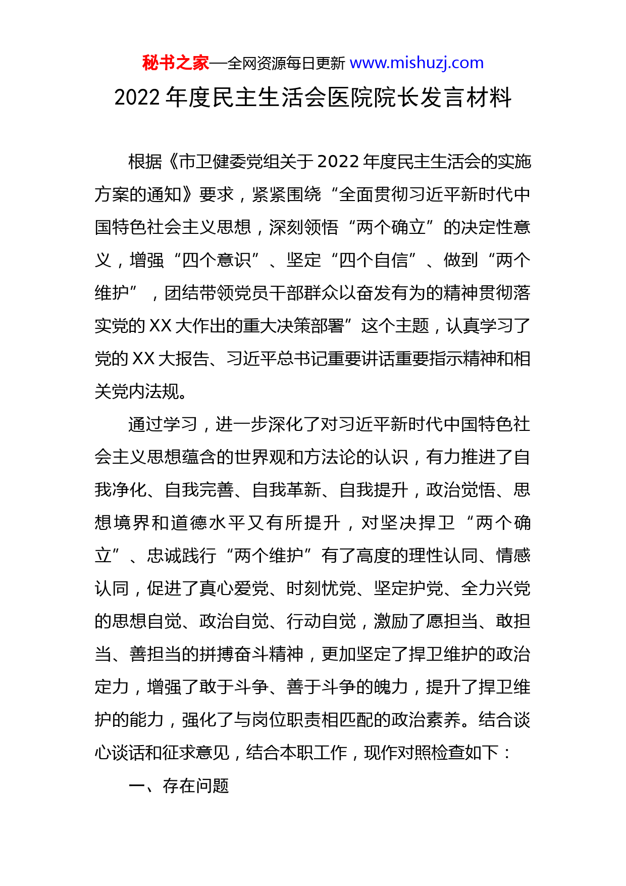 秘书之家—全网资源每日更新www.mishuzj.com2022年度民主生活会医院院长发言材料根据《市卫健委党组关于2022年度民主生活会的实施方案的通知》要求,紧紧围绕“全面贯彻习近平新时代中国特色社会主义思想,深刻领悟“两个确立”的决定性意义,增强“四个意识”、坚定“四个自信”、做到“两个维护”,团结带领党员干部群众以奋发有为的精神贯彻落实党的XX大作出的重大决策部署”这个主题,认真学习了党的XX大报告、习近平总书记重要讲话重要指示精神和相关党内法规。通过学习,进一步深化了对习近平新时代中国特色社会主义思想蕴含的世界观和方法论的认识,有力推进了自我净化、自我完善、自我革新、自我提升,政治觉悟、思想境界和道德水平又有所提升,对坚决捍卫“两个确立”、忠诚践行“两个维护”有了高度的理性认同、情感认同,促进了真心爱党、时刻忧党、坚定护党、全力兴党的思想自觉、政治自觉、行动自觉,激励了愿担当、敢担当、善担当的拼搏奋斗精神,更加坚定了捍卫维护的政治定力,增强了敢于斗争、善于斗争的魄力,提升了捍卫维护的能力,强化了与岗位职责相匹配的政治素养。结合谈心谈话和征求意见,结合本职工作,现作对照检查如下:一、存在问题秘书之家—全网资源每日更新www.mishuzj.com(一)在“带头深刻领悟‘两个确立’的决定性意义,增强‘四个意识’、坚定‘四个自信’、做到‘两个维护’”方面。忠诚拥护“两个确立”是党员干部起码政治要求,是走好新时代赶考路、面对世界未有之大变局、迎接各类风险挑战的定心盘、主心骨。通过学习贯彻党的XX大精神,我能深刻理解“两个确立”的决定性意义,真正把“两个确立”转化为做到“两个维护”的思想自觉、政治自觉和行动自觉,牢固树立“四个意识”,坚定“四个自信”,真诚认同核心、坚决维护核心、时刻紧跟核心,在实际工作中,始终坚持党对国有企业的全面领导,不断培“根”铸“魂”。存在的主要问题与不足:一是理想信念深度不够。通过参加委党组的培训、集中学习以及个人自学,我虽然在理想信念、马克思主义信仰和社会主义信念坚定程度方面有所提高,但在自身实际行动让党员和群众感受到理想信念的强大力量方面做得不够,平时对党员干部和职工群众主动宣讲和传播的少。二是党性修养严度不够。近年来先后参加“两学一做”学习教育、“不忘初心、牢记使命”主题教育、党史学习教育,提升能力作风建设等主题教育活动后,认为自己的党性修养已达到一定层次,忽视了党性修养的进一步锤炼与提升,但党性修养与党的事业要求、人民群众的期盼存在一定差距。(二)在“带头用习近平新时代中国特色社会主义思秘书之家—全网资源每日更新www.mishuzj.com想凝心铸魂”方面。对照“学懂弄通做实”要求,能带头用习近平新时代中国特色社会主义思想指导实践、推动工作,能够以最高政治要求、最大政治责任、最严政治纪律抓自身理论学习,坚持把个人自学与集体研讨结合起来,安排学习和专题研讨,自觉把习近平新时代中国特色社会主义思想作为改造主观世界、加强党性锻炼的锐利思想武器,自觉把新思想、新理念融入工作实践,形成较好的工作思路。存在的主要问题与不足:一是在学懂上抓深化不够。有时不能很好处理工学矛盾,导致主动跟进学习的能动性系统性不够,出现“零打碎敲”、“急学急用”的现象,对自身抓理论学习过程中还存有“实用主义”,学深悟透、融会贯通不够,着眼实践理性思考、指导实际工作不够。二是在弄通上抓消化不够。在学习中有“学到底”的劲头,但有时表现出贪多求全、面面俱到的倾向,还缺少“悟到位”的精神,在深刻把握贯穿其中的马克思主义唯物论、认识论、实践论、矛盾论、辩证法等哲学思想,充分汲取其中饱含的为人民谋幸福、为民族谋复兴的使命情怀力量上还有差距。三是做实上抓转化不够。在真正将学习成果转化成为增强工作本领、破解事业发展难题的“良方妙药”上还有差距,熟练运用贯穿其中的马克思主义立场、观点、方法解决实际问题的能力还不够强,没能及时从习近平新时代中国特色社会主义思想中汲取改革动秘书之家—全网资源每日更新www.mishuzj.com力、发展助力、创新能力,理论指导实践还不充分。(三)在“带头坚持和加强党的全面领导”方面。在党的XX大报告中深刻阐述了前进道路上必须牢牢把握的五条重大原则,其中第一条原则就是“坚持和加强党的全面领导”。在实际工作中,我始终把加强党的全面领导放在首位,着力加强党员自身建设,认真发挥示范带头作用,在密切联系群众、发挥党组织的功能作用、认真贯彻民主集中制、落实党中央决策部署和习近平总书记关于XX大的重要指示批示精神方面有所改进。存在的主要问题与不足:一是服务临床科室意识相对不足。如没有经常在内心深处和临床科室进行换位思考,面对科室讲原则的时候多,设身处地的时候少。二是对干部职工教育培养还不够到位。对党员干部及职工群众的系统培养的较少。同时对干部职工的谈心谈话不够深入,对干部职工关怀关爱缓解压力等方面做的不够。在实际工作中,发现个别干部职工存在的消极思想和言论,出于保护干部群众干事创业信心和激情的考虑,没有及时批评教育。三是贯彻落