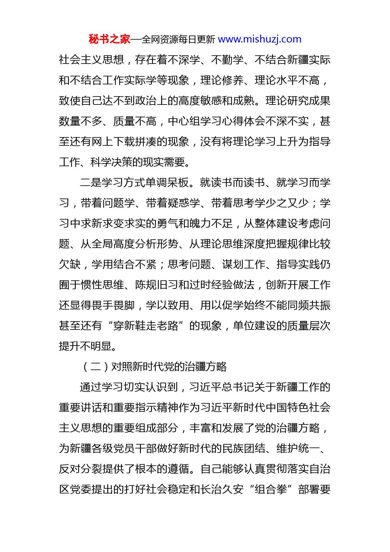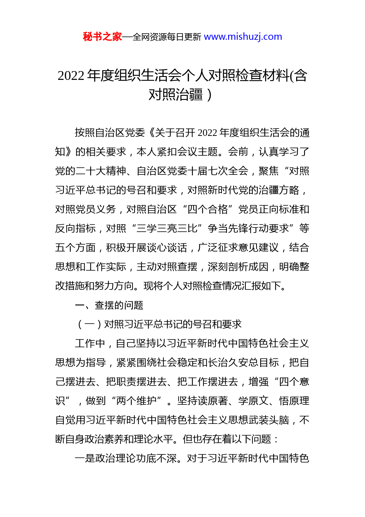 秘书之家—全网资源每日更新www.mishuzj.com2022年度组织生活会个人对照检查材料(含对照治疆)按照自治区党委《关于召开2022年度组织生活会的通知》的相关要求,本人紧扣会议主题。会前,认真学习了党的二十大精神、自治区党委十届七次全会,聚焦“对照习近平总书记的号召和要求,对照新时代党的治疆方略,对照党员义务,对照自治区“四个合格”党员正向标准和反向指标,对照“三学三亮三比”争当先锋行动要求”等五个方面,积极开展谈心谈话,广泛征求意见建议,结合思想和工作实际,主动对照查摆,深刻剖析成因,明确整改措施和努力方向。现将个人对照检查情况汇报如下。一、查摆的问题(一)对照习近平总书记的号召和要求工作中,自己坚持以习近平新时代中国特色社会主义思想为指导,紧紧围绕社会稳定和长治久安总目标,把自己摆进去、把职责摆进去、把工作摆进去,增强“四个意识”,做到“两个维护”。坚持读原著、学原文、悟原理自觉用习近平新时代中国特色社会主义思想武装头脑,不断自身政治素养和理论水平。但也存在着以下问题:一是政治理论功底不深。对于习近平新时代中国特色秘书之家—全网资源每日更新www.mishuzj.com社会主义思想,存在着不深学、不勤学、不结合新疆实际和不结合工作实际学等现象,理论修养、理论水平不高,致使自己达不到政治上的高度敏感和成熟。理论研究成果数量不多、质量不高,中心组学习心得体会不深不实,甚至还有网上下载拼凑的现象,没有将理论学习上升为指导工作、科学决策的现实需要。二是学习方式单调呆板。就读书而读书、就学习而学习,带着问题学、带着疑惑学、带着思考学少之又少;学习中求新求变求实的勇气和魄力不足,从整体建设考虑问题、从全局高度分析形势、从理论思维深度把握规律比较欠缺,学用结合不紧;思考问题、谋划工作、指导实践仍囿于惯性思维、陈规旧习和过时经验做法,创新开展工作还显得畏手畏脚,学以致用、用以促学始终不能同频共振甚至还有“穿新鞋走老路”的现象,单位建设的质量层次提升不明显。(二)对照新时代党的治疆方略通过学习切实认识到,习近平总书记关于新疆工作的重要讲话和重要指示精神作为习近平新时代中国特色社会主义思想的重要组成部分,丰富和发展了党的治疆方略,为新疆各级党员干部做好新时代的民族团结、维护统一、反对分裂提供了根本的遵循。自己能够认真贯彻落实自治区党委提出的打好社会稳定和长治久安“组合拳”部署要秘书之家—全网资源每日更新www.mishuzj.com求,切实增强政治警惕性和敏感性,严防“三股势力”进行迫害,为守好这片净土贡献自己的力量。但还存在以下问题:一是对党的治疆方略的学习认识不足。由于平时工作任务繁重,产生了“学不学不是很重要,做到工作才重要”的以干代学的思想,没有把学习党的治疆方略摆到重要的位置,缺乏持之以恒的研究精神,学习的知识缺乏理论上的深度和广度,对思想和灵魂的触动不够,学习停留在表面上。二是底线思维不强。对影响新疆社会稳定和长治久安的警觉性不高,对改进工作作风、密切党同人民群众的血肉联系是一个重大政治问题的认识不深刻,对脱离群众的极端危险性和“四风”问题的现实危害性理解不深刻。对“没有与维稳无关的部门,也没有与稳定无关的干部”理解片面,认为抓好分管部门工作是中心,其它工作包括反分裂、反极端、反渗透都是“副业”;有时认为抓住单位业务工作看得见、摸得着,短时间内容易出成绩,抓反分裂、反极端、反渗透不显山、不露水,一时难以看出效果。(三)对照党员义务不断增强“四个意识”,坚定“四个自信”,做到“两个维护”,正确行使党员权利和义务,自觉在行动上与党组织保持一致。但还存在以下问题:秘书之家—全网资源每日更新www.mishuzj.com一是对党员义务认识不清。没有认识到履行党员义务是共产党员的天职,没有把履行党员义务当作向党组织做出的庄严承诺。虽然能够熟记党员八项义务的内容,但对其内涵却没有进行深入研究,比如,对于第四条义务“自觉遵守党的纪律”,没有深刻理解党的纪律的内容、遵守党的纪律对于党的事业的极端重要性、违反党的纪律该受到何种处理。二是履行党员义务不到位。党员的先锋模范作用发挥不足,在个别事情上只注重自己应享有的权利,而忽视了自己应履行的义务,甚至把自己混同于一般职工,模范带头作用没有真正发挥出来。另外,有时因为业务繁忙而忘记及时缴纳党费,等到党小组组长催缴时才想起。(四)对照自治区“四个合格”党员正向标准和反向指标自己自觉践行“爱国爱疆、团结奉献、勤劳互助、开放进取”的新疆精神,立足本职工作,层层示范引导,始终保持昂扬向上、奋发有为的工作精神,但在实际工作中还存在一些突出问题:一是安于现状、不思进取。随着自身职务的提升、生活条件的改善,久而久之产生了“松一松、歇一歇”的思想,缺少较真碰硬,遇山开路、遇水架桥的勇气和决心,过去下农村,吃住在维族同胞家里,现在下乡大车小辆讲秘书之家—全网资源每日更新www.mishuzj.com排场,吃穿住行与当地的生活习惯格格不入,缺少了艰苦奋斗的精神,安于现状、享乐主义有所抬头,没有同维族同胞建立起深厚的感情。二是公仆意识有待加强。主动深