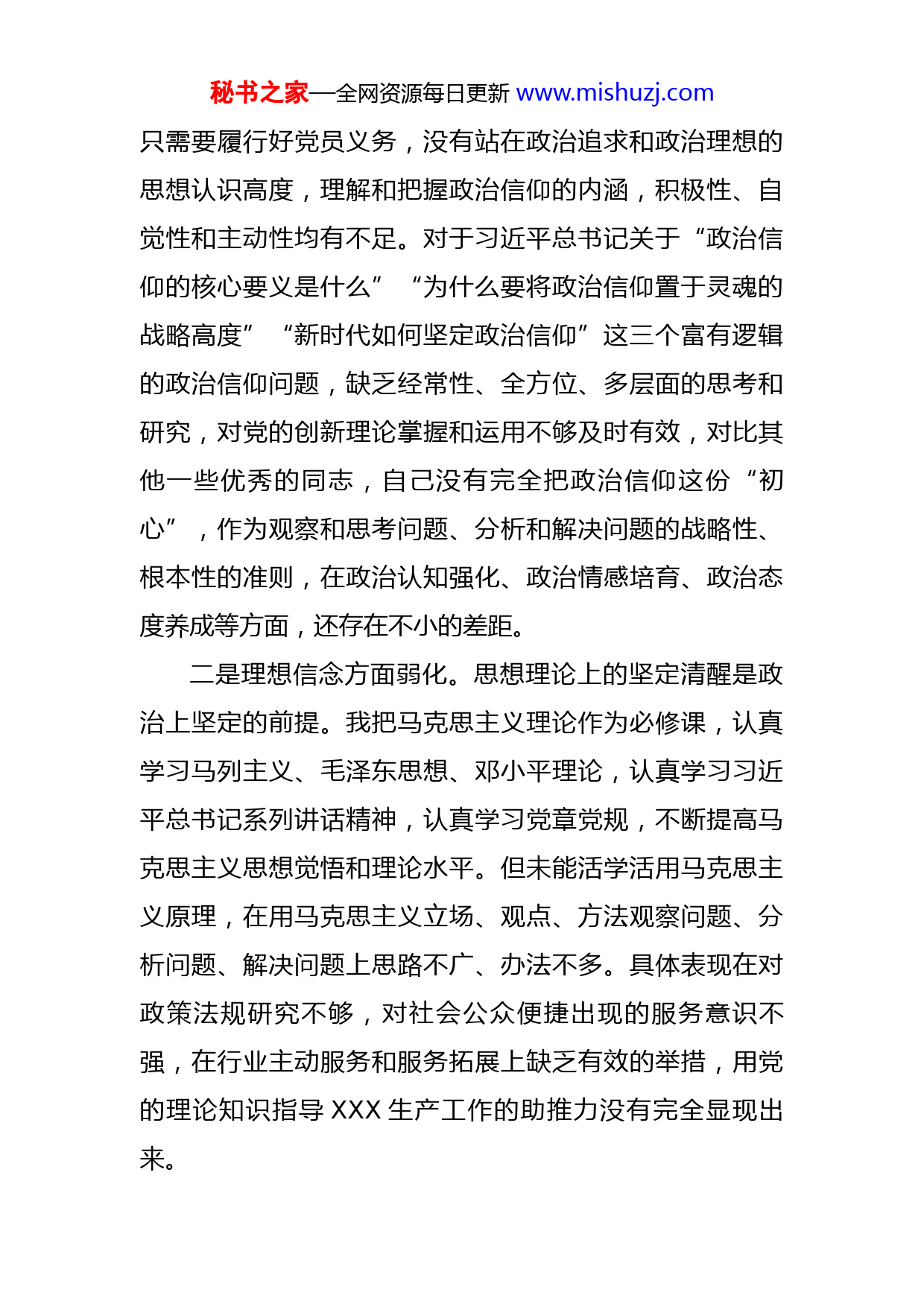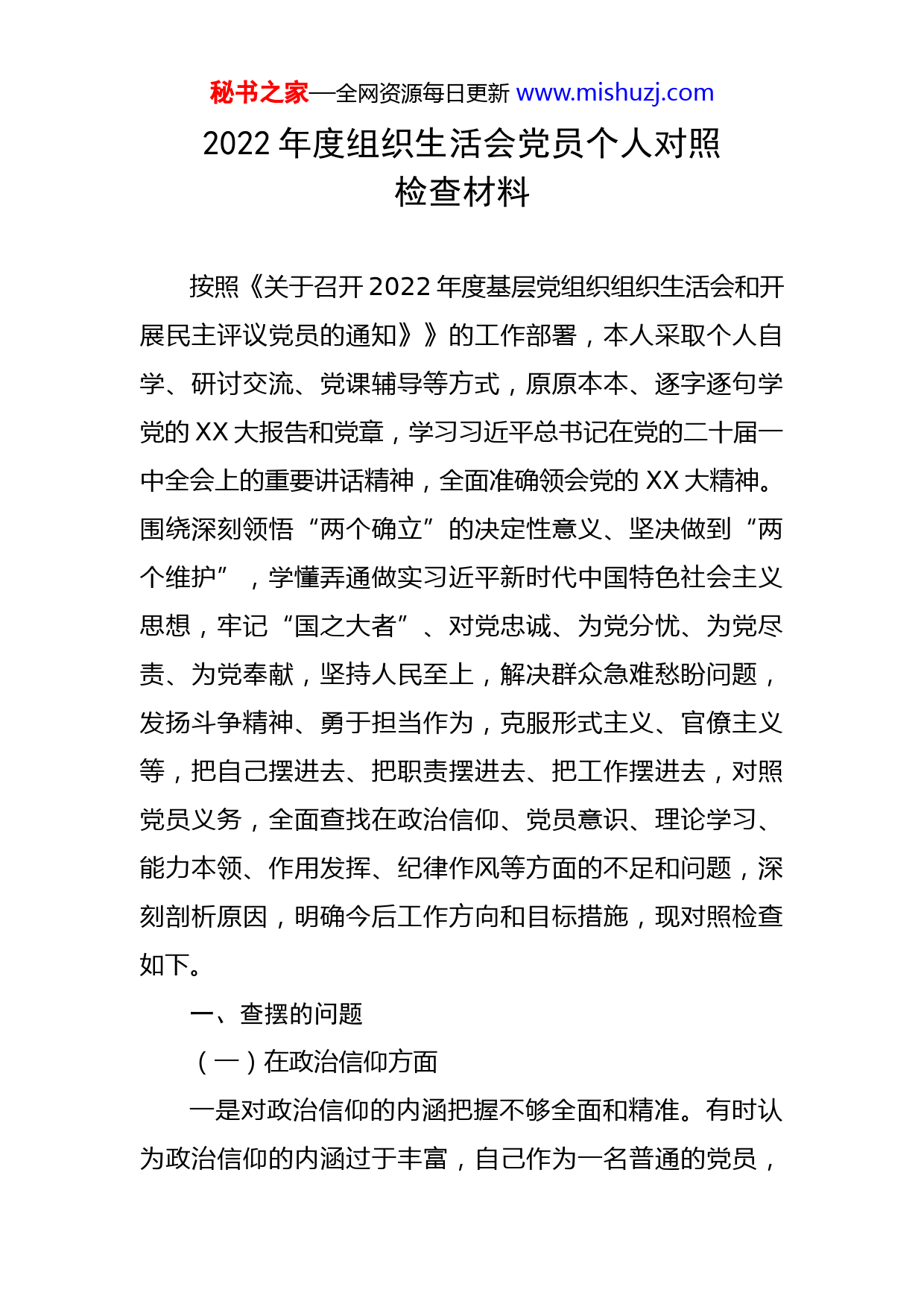 秘书之家—全网资源每日更新www.mishuzj.com2022年度组织生活会党员个人对照检查材料按照《关于召开2022年度基层党组织组织生活会和开展民主评议党员的通知》》的工作部署,本人采取个人自学、研讨交流、党课辅导等方式,原原本本、逐字逐句学党的XX大报告和党章,学习习近平总书记在党的二十届一中全会上的重要讲话精神,全面准确领会党的XX大精神。围绕深刻领悟“两个确立”的决定性意义、坚决做到“两个维护”,学懂弄通做实习近平新时代中国特色社会主义思想,牢记“国之大者”、对党忠诚、为党分忧、为党尽责、为党奉献,坚持人民至上,解决群众急难愁盼问题,发扬斗争精神、勇于担当作为,克服形式主义、官僚主义等,把自己摆进去、把职责摆进去、把工作摆进去,对照党员义务,全面查找在政治信仰、党员意识、理论学习、能力本领、作用发挥、纪律作风等方面的不足和问题,深刻剖析原因,明确今后工作方向和目标措施,现对照检查如下。一、查摆的问题(一)在政治信仰方面一是对政治信仰的内涵把握不够全面和精准。有时认为政治信仰的内涵过于丰富,自己作为一名普通的党员,秘书之家—全网资源每日更新www.mishuzj.com只需要履行好党员义务,没有站在政治追求和政治理想的思想认识高度,理解和把握政治信仰的内涵,积极性、自觉性和主动性均有不足。对于习近平总书记关于“政治信仰的核心要义是什么”“为什么要将政治信仰置于灵魂的战略高度”“新时代如何坚定政治信仰”这三个富有逻辑的政治信仰问题,缺乏经常性、全方位、多层面的思考和研究,对党的创新理论掌握和运用不够及时有效,对比其他一些优秀的同志,自己没有完全把政治信仰这份“初心”,作为观察和思考问题、分析和解决问题的战略性、根本性的准则,在政治认知强化、政治情感培育、政治态度养成等方面,还存在不小的差距。二是理想信念方面弱化。思想理论上的坚定清醒是政治上坚定的前提。我把马克思主义理论作为必修课,认真学习马列主义、毛泽东思想、邓小平理论,认真学习习近平总书记系列讲话精神,认真学习党章党规,不断提高马克思主义思想觉悟和理论水平。但未能活学活用马克思主义原理,在用马克思主义立场、观点、方法观察问题、分析问题、解决问题上思路不广、办法不多。具体表现在对政策法规研究不够,对社会公众便捷出现的服务意识不强,在行业主动服务和服务拓展上缺乏有效的举措,用党的理论知识指导XXX生产工作的助推力没有完全显现出来。秘书之家—全网资源每日更新www.mishuzj.com三是树立政治意识有欠缺。面对新形势、新矛盾和新问题,只有坚持不懈用新时代中国特色社会主义思想凝心铸魂,学思用贯通、知信行统一,这样才能形成巨大的政治勇气和过硬的政治本领,才能敢于突进深水区,敢于啃硬骨头,敢于涉险滩,敢于面对新矛盾新挑战,冲破思想观念束缚,突破利益固化藩篱。反观自己,一直有着“把领导交办的任务干好就行了”的思想误区,放松了对党的理论的学习,没有时刻拧紧自己世界观、人生观和价值观的“总开关”,没有充分认识新时代思想政治建设的作用,才使自身的思想觉悟、精神境界、能力水平有所弱化。(二)在党员意识方面一是党员意识不够强。未能深刻认识到党员的一言一行都不是孤立的个人行为,党员意识关系着党在群众中的整体形象塑造,使自己在服务群众的过程中,特别在打通服务群众“最后一公里”方面,自身的思想、言论和行动,有时距离全心全意为人民服务的根本宗旨的要求,还存在差距。党性修养锤炼不够及时,对待个人与组织、个人职业与党的事业、尽岗位职责与尽党员义务的关系时,第一身份是共产党员,第一职责是为党工作的党员意识树得还不够牢,没能正确处理好其中的关系,党员意识有时缺位、错位,在政治立场、思想观念、道德情操、精神境秘书之家—全网资源每日更新www.mishuzj.com界和言论行动上未能真正贴好“党员标签”。二是业务工作与党的中心工作混淆。党员要“参加党的一个组织并在其中积极工作”。党员必须将自身的党员身份与社会成员身份区分开来。党员在从事具体的业务工作的同时,必须注意其所从事的各项工作是为了更好地服务和服从党的中心工作和中心任务,必须首先承担党员的责任和履行党员的义务。但在现实中,不能够严格要求自己,党员意识模糊,更有甚者以普通群众的标准要求自己,认为只需要做好业务工作就可以,甚至认为业务工作生活等同于党内政治生活,缺乏必要的理论学习或理论学习流于表面形式,党性修养锻炼难以加强,势必导致党内政治生活的庸俗化。三是党员意识弱化。不注重提高自己的政治修养,不积极主动学习党的科学理论,对中国特色社会主义道路、理论、制度、文化不理解、不自信,缺乏应有的政治定力,容易受到其它思想的影响,更有人习惯人云亦云,其关于党的路线方针政策执行力度和落实情况的言论严重不符合具体实际,最终导致党员意识弱化甚至缺失,自己与马克思主义信仰渐行渐远甚至背道而驰。(三)在理论学习方面一是方式守旧造成学习兴趣降低。传统学习方式中,大多采用灌输式和领读式的方法,仅仅机械停留在学习内秘书之家—全网资源每日更新www.mishuzj.com容“一发了之”“一阅了之”状态,简单宣读