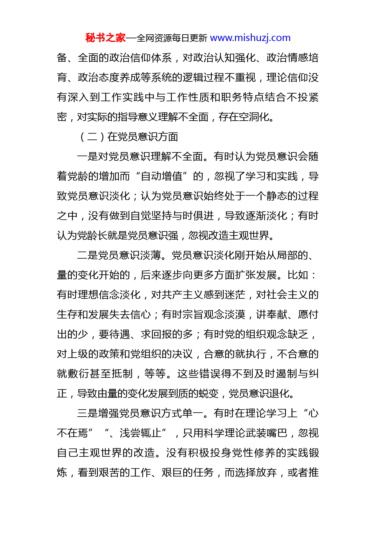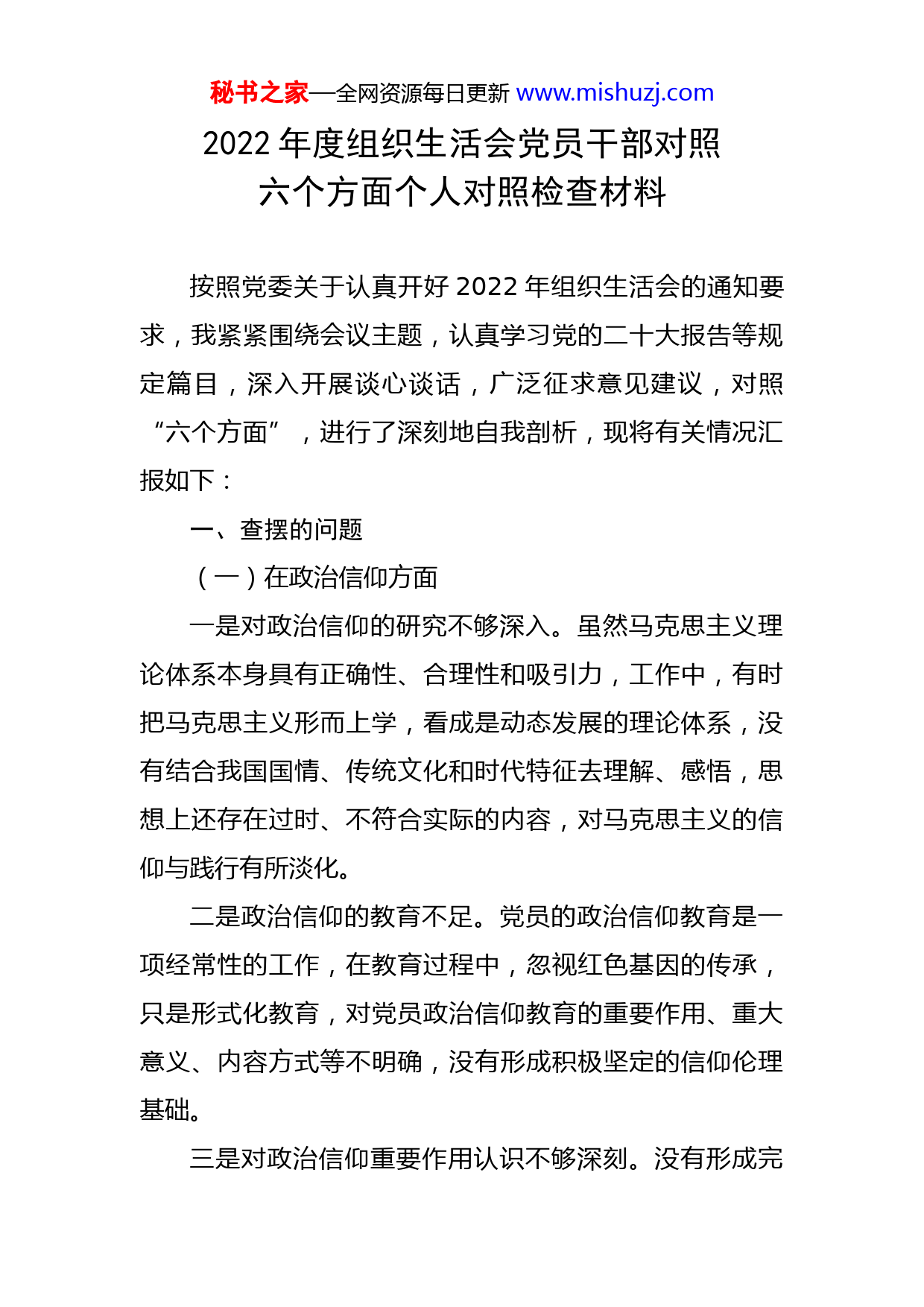 秘书之家—全网资源每日更新www.mishuzj.com2022年度组织生活会党员干部对照六个方面个人对照检查材料按照党委关于认真开好2022年组织生活会的通知要求,我紧紧围绕会议主题,认真学习党的二十大报告等规定篇目,深入开展谈心谈话,广泛征求意见建议,对照“六个方面”,进行了深刻地自我剖析,现将有关情况汇报如下:一、查摆的问题(一)在政治信仰方面一是对政治信仰的研究不够深入。虽然马克思主义理论体系本身具有正确性、合理性和吸引力,工作中,有时把马克思主义形而上学,看成是动态发展的理论体系,没有结合我国国情、传统文化和时代特征去理解、感悟,思想上还存在过时、不符合实际的内容,对马克思主义的信仰与践行有所淡化。二是政治信仰的教育不足。党员的政治信仰教育是一项经常性的工作,在教育过程中,忽视红色基因的传承,只是形式化教育,对党员政治信仰教育的重要作用、重大意义、内容方式等不明确,没有形成积极坚定的信仰伦理基础。三是对政治信仰重要作用认识不够深刻。没有形成完秘书之家—全网资源每日更新www.mishuzj.com备、全面的政治信仰体系,对政治认知强化、政治情感培育、政治态度养成等系统的逻辑过程不重视,理论信仰没有深入到工作实践中与工作性质和职务特点结合不投紧密,对实际的指导意义理解不全面,存在空洞化。(二)在党员意识方面一是对党员意识理解不全面。有时认为党员意识会随着党龄的增加而“自动增值”的,忽视了学习和实践,导致党员意识淡化;认为党员意识始终处于一个静态的过程之中,没有做到自觉坚持与时俱进,导致逐渐淡化;有时认为党龄长就是党员意识强,忽视改造主观世界。二是党员意识淡薄。党员意识淡化刚开始从局部的、量的变化开始的,后来逐步向更多方面扩张发展。比如:有时理想信念淡化,对共产主义感到迷茫,对社会主义的生存和发展失去信心;有时宗旨观念淡漠,讲奉献、愿付出的少,要待遇、求回报的多;有时党的组织观念缺乏,对上级的政策和党组织的决议,合意的就执行,不合意的就敷衍甚至抵制,等等。这些错误得不到及时遏制与纠正,导致由量的变化发展到质的蜕变,党员意识退化。三是增强党员意识方式单一。有时在理论学习上“心不在焉”“、浅尝辄止”,只用科学理论武装嘴巴,忽视自己主观世界的改造。没有积极投身党性修养的实践锻炼,看到艰苦的工作、艰巨的任务,而选择放弃,或者推秘书之家—全网资源每日更新www.mishuzj.com动工作缓慢。在急难险重任务面前畏首畏尾甚至讨价还价,不能主动自觉地改造主观世界。(三)在理论学习方面一是学习教育方式僵化。习惯以集体学习、讲座报告、知识竞赛等传统方式开展,拘泥于“我说你听”的填鸭式灌输、施压式沟通,热衷于宣传造势,看似形式多样、热热闹闹,实则缺乏新意,缺少说服力、公信力,导致学习实际效果不佳。二是对理论学习重视不够。制定的学习安排比较密、抓得也比较紧,但对个人自学抓得还不够,多数时候是上级要求学什么就组织学什么,平时组织学习的计划性不强,存在应付思想,满足于已有的理论知识和工作水平,对于新思想、新理论、新观点研究得还不够深入,以业务学习代替思想交流,以工作研究代替理论研讨的倾向比较明显。三是在学以致用上还存在差距。工作中更多注重领导讲话、政策文件和业务知识的学习,多是用于传达贯彻,结合各自分管领域,利用重要理论指导解决一些战略性、专业性问题不够,没有很好地发挥理论对实践的指导作用,没能更好地通过理论武装来坚定理想信念、加强党性修养、提高领导水平。(四)在能力本领方面秘书之家—全网资源每日更新www.mishuzj.com一是下基层少,不接地气。下基层一般性考察多,作深入系统的专题调研较少。如:全年一般只有两次下基层检查指导工作,平时都忙于自身的事务性工作,坐在办公室看材料、听汇报,对基层情况不明、数字不准、底数不清,即便有事,也是电话联系、电话指导、电话落实;即使是下基层,大多数也是浮光掠影地看看,针对基层提出的实际困难和问题,轻描淡写地做要求,做表面文章多,解决实际问题少。抓工作落实有时搞“上下一般粗”,不能结合基层实际情况开展工作。如:在抓一些专项工作落实上,不考虑各团场实际现状和各基层所的具体情况,工作要求都是“一个标准”、“一刀切”,导致基层工作任务难落实、难完成、干部怨言多。二是决策不科学、简单粗暴的问题。主要表现为部分工作决策前缺乏调查研究,不切合地方实际和群众意愿,存在搞形象工程、政绩工程的问题。如在工作上照搬照抄的较多,创新的较少,拘泥于以前的条条框框,不敢放开手脚。年度目标责任考核,习惯于模板化,缺少地方特色,针对性不强。三是宗旨意识不强。接待群众缺乏耐心和热情,对群众合理诉求解决不够及时。接待群众来访怕麻烦,有推事出门、被动应付的现象。处理问题停留在简单的回复和上报上,对群众普遍关心的问题,没有从制度机制上下功夫秘书之家—全网资源每日更新www.mishuzj.com研究解决;对群众不合理的诉求耐心解释疏导不够,有时也有脸难看、腔很大的现象。(五)在作用发挥方面一是党性修养放松,标准定位不高。满足于现有功劳薄,喜欢与社会上的不良现象对比,总认为自身要求是严格的,工作也是多少